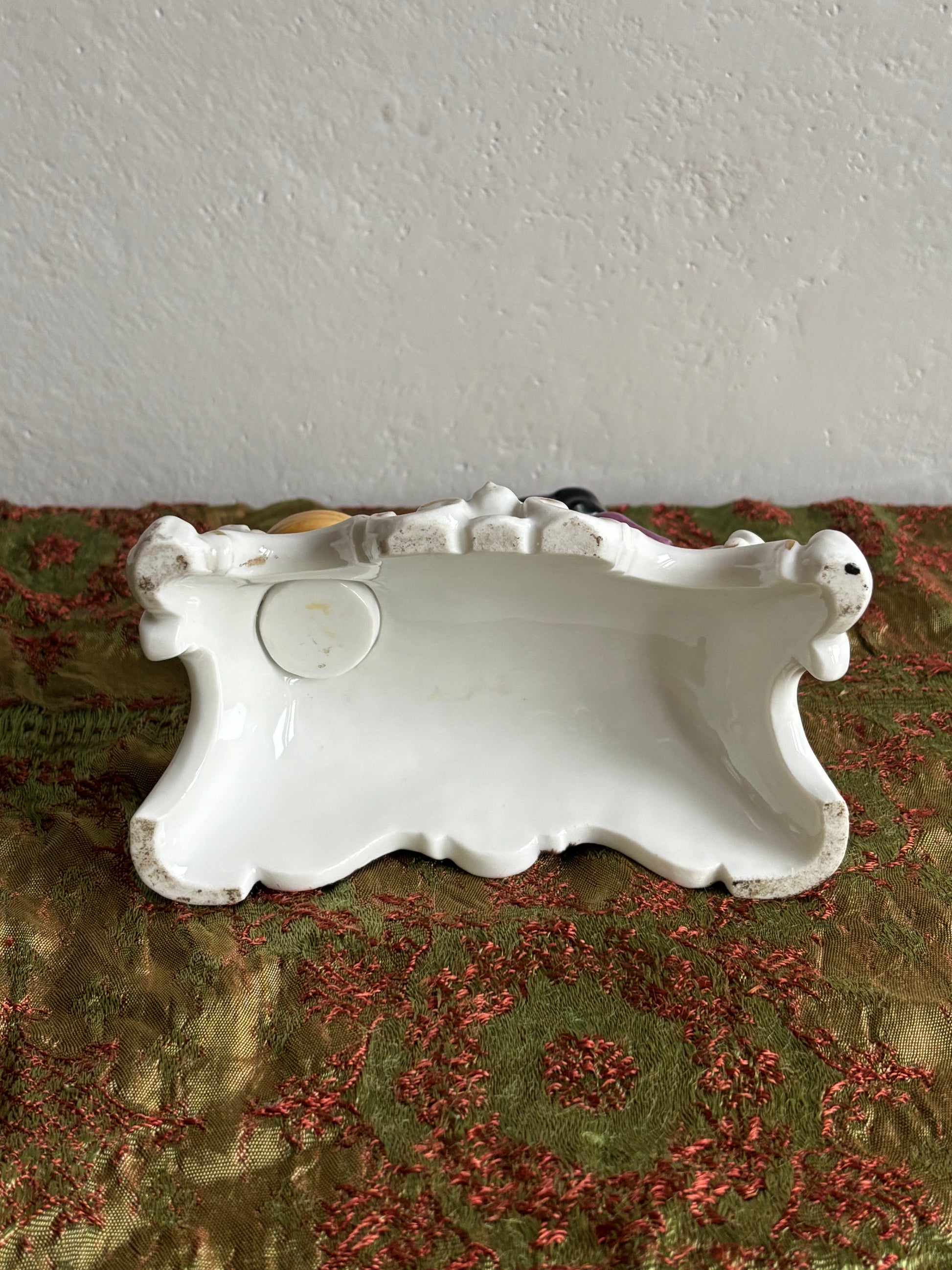 Neben den Figuren befindet sich ein kleines, fassförmiges Gefäß, das auf eine ursprüngliche Verwendung als Porzellan-Tintenfass hindeutet, obwohl es nur ein Fach für Tinte besitzt. Dieses Detail macht das Objekt besonders interessant für Sammler und Liebhaber historischer Schreibtischaccessoires und eignet sich zugleich als elegantes Vintage-Dekorationsstück im romantischen Stil.