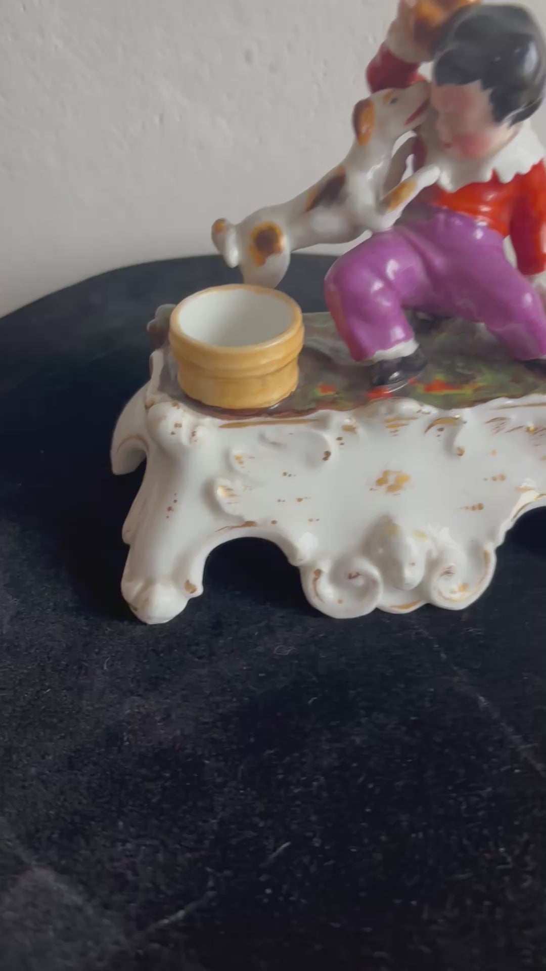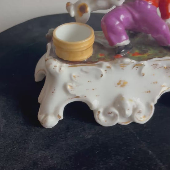 Porzellanfiguren-Gruppe mit Kind und Hund – mögliches antikes Tintenfass