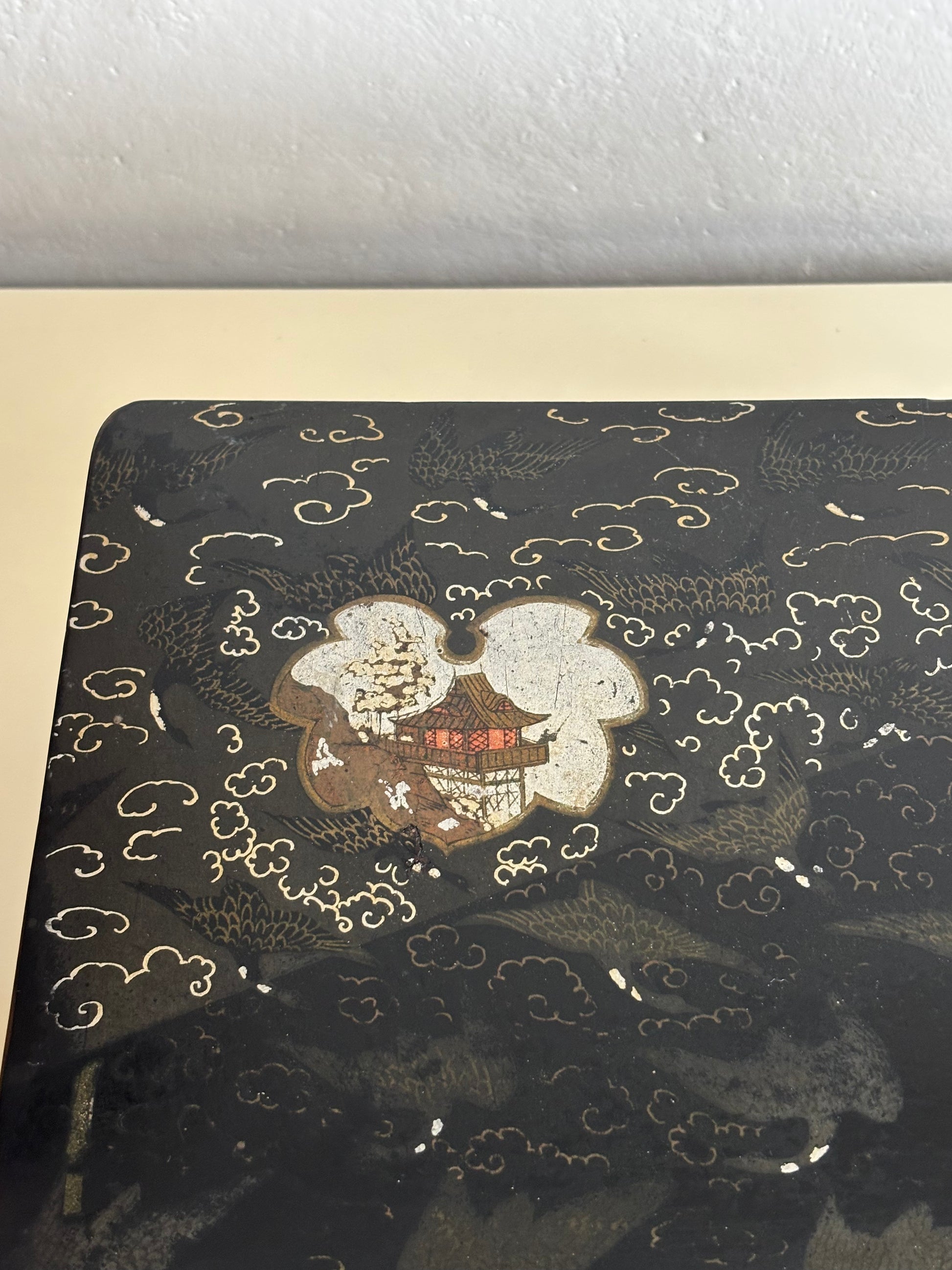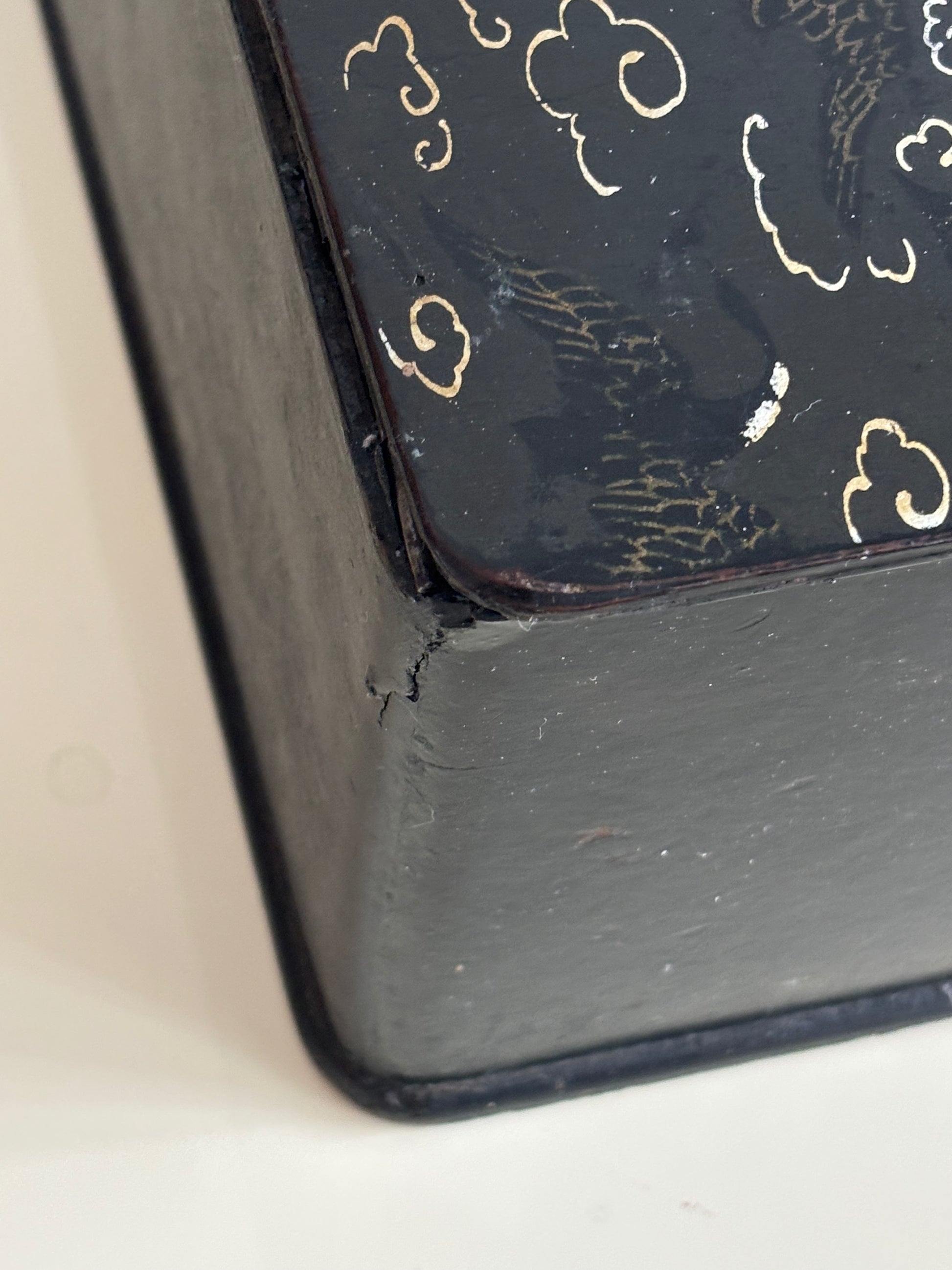 Raffinierte Dokumentenbox im japanischen Stil aus der Napoleon‑III‑Zeit, gefertigt aus schwarz lackiertem Pappmaché und verziert mit orientalischen Motiven, die für die vom Japonismus beeinflusste Produktion des 19. Jahrhunderts typisch sind. Die Oberfläche ist mit eleganten goldfarbenen Dekorationen geschmückt, die symbolische Elemente und ornamentale Motive aus dem Fernen Osten darstellen und sich zart vom dunklen Hintergrund abheben, wodurch ein zurückhaltender und anspruchsvoller visueller Effekt entsteht.