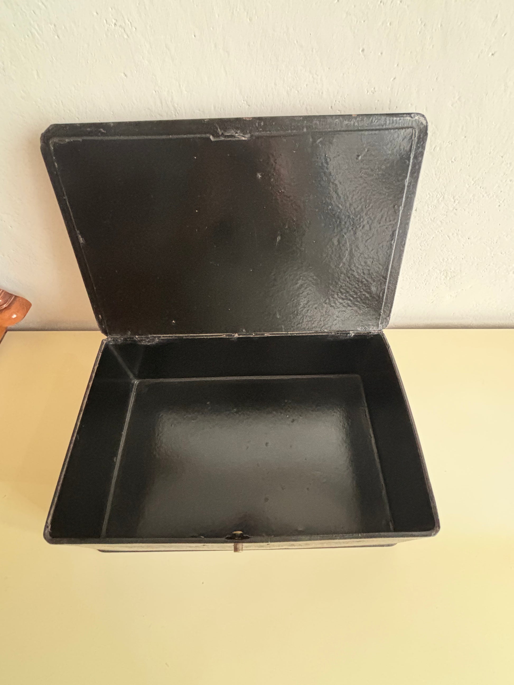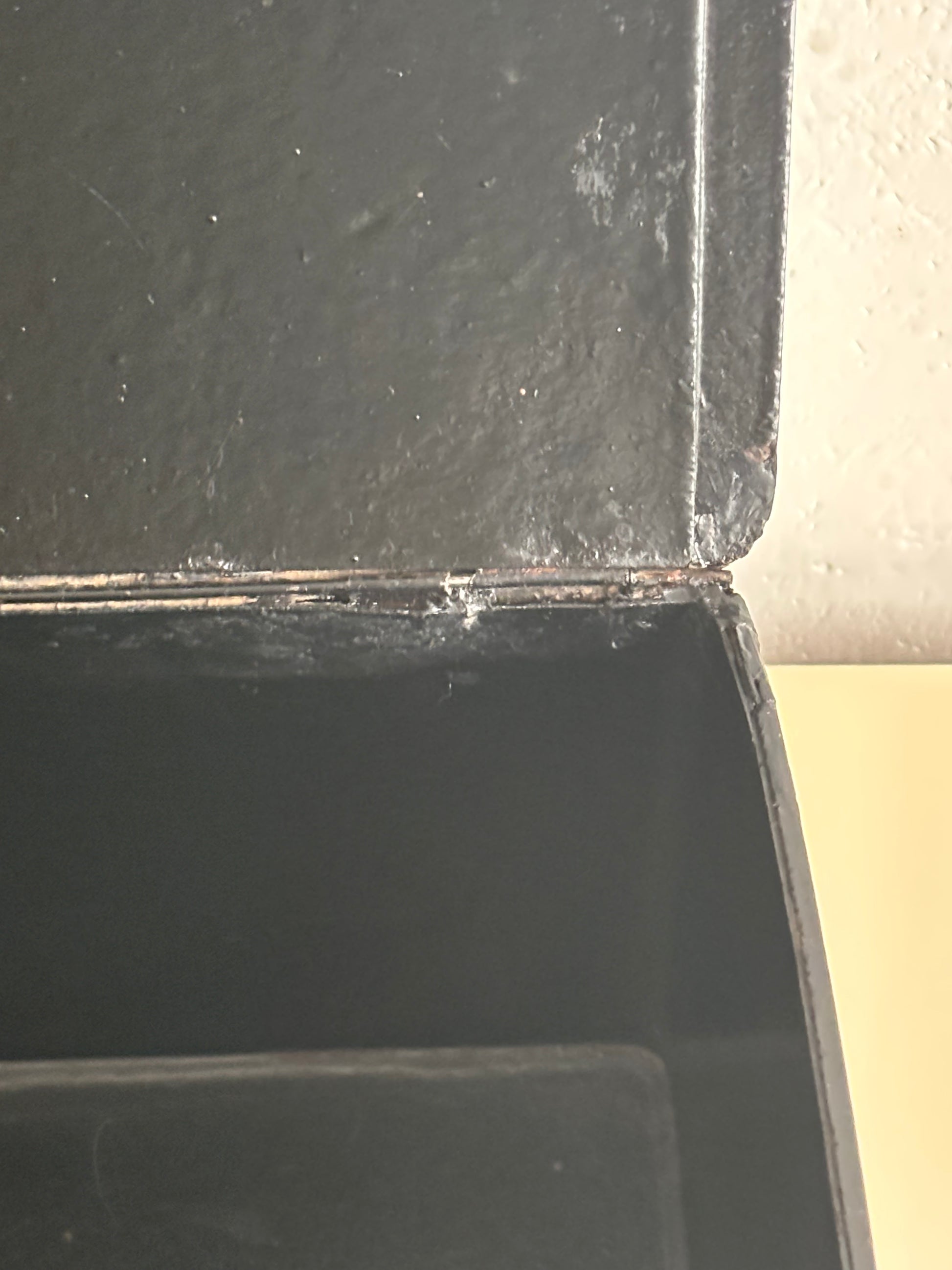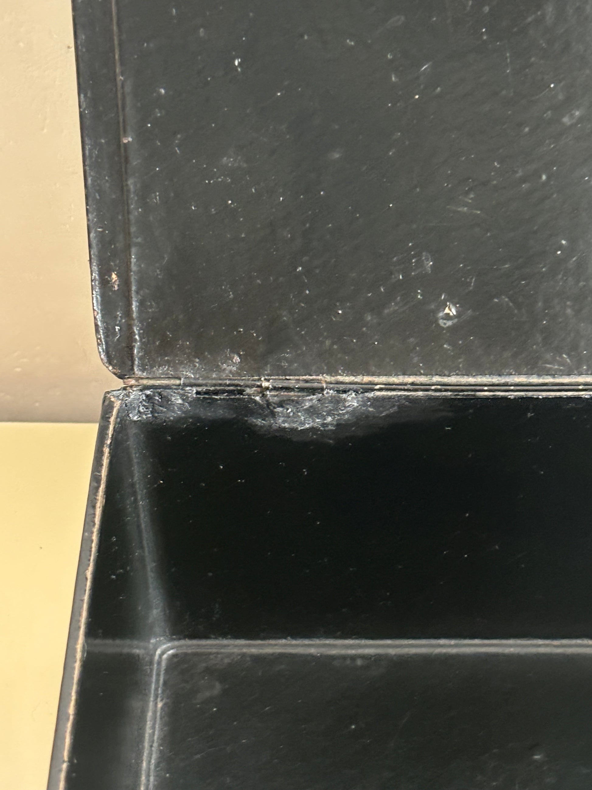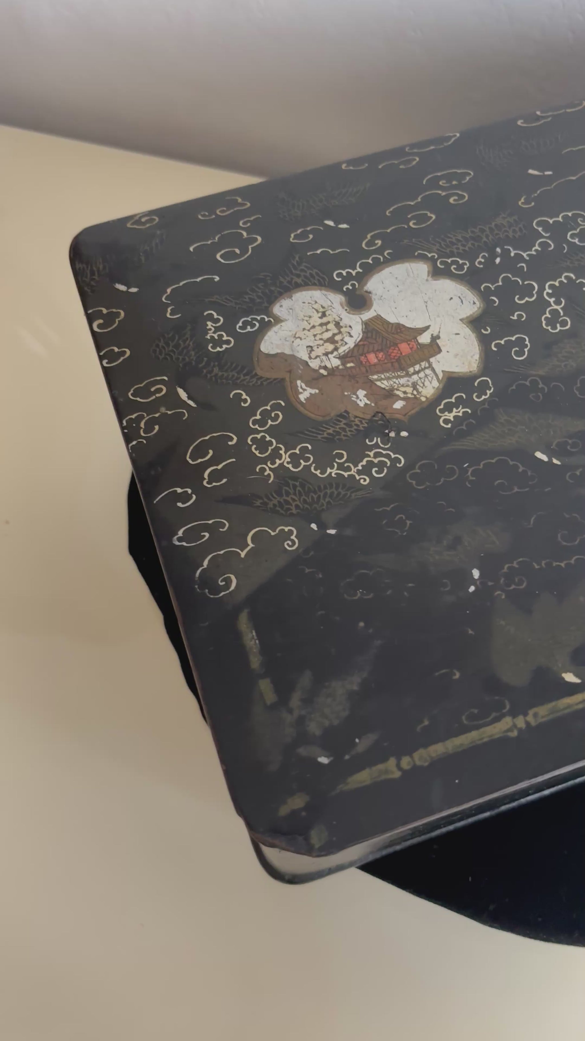 Die Form macht sie besonders geeignet zur Aufbewahrung von Dokumenten, Korrespondenz oder Schreibtischpapieren und verbindet praktische Funktion mit dekorativem Wert. Das Objekt befindet sich in einem guten allgemeinen Erhaltungszustand, mit Ausbleichungen der Lackdekorationen aufgrund von Alter und Gebrauch, Gebrauchsspuren an den Kanten sowie einer Restaurierung der Scharniere – ein Eingriff, der die Funktionalität bewahrt hat, ohne die Gesamtästhetik zu verändern. Diese Merkmale entsprechen der Herstellungszeit und bestätigen seine historische Authentizität.
