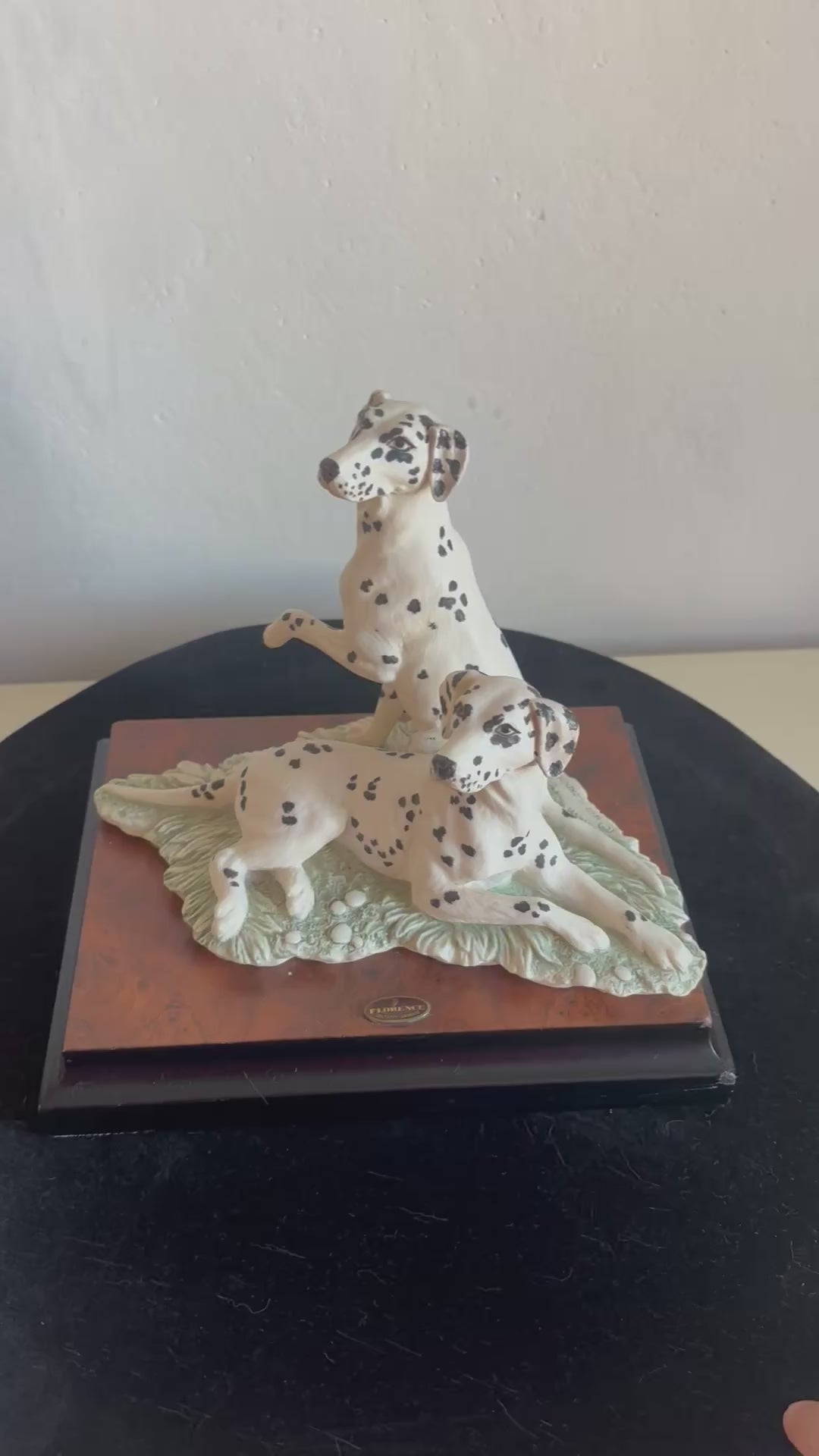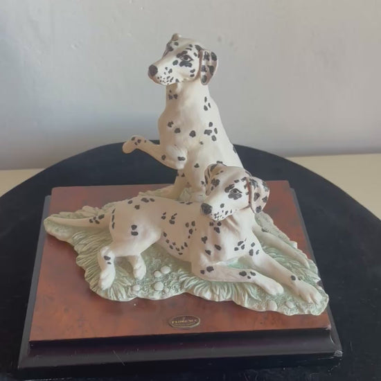 Elegante, von Giuseppe Armani signierte Porzellanfigur, die ein Dalmatinerpaar auf einem dekorativen Sockel mit dunkler Oberfläche und Rasenstruktur darstellt. Dieses hochwertige Sammlerstück überzeugt durch feine handwerkliche Ausführung und große Liebe zum Detail und bringt die Eleganz und Lebendigkeit der Dalmatiner-Rasse mit ihren typischen schwarzen Flecken und natürlichen, ausdrucksstarken Haltungen zum Ausdruck.