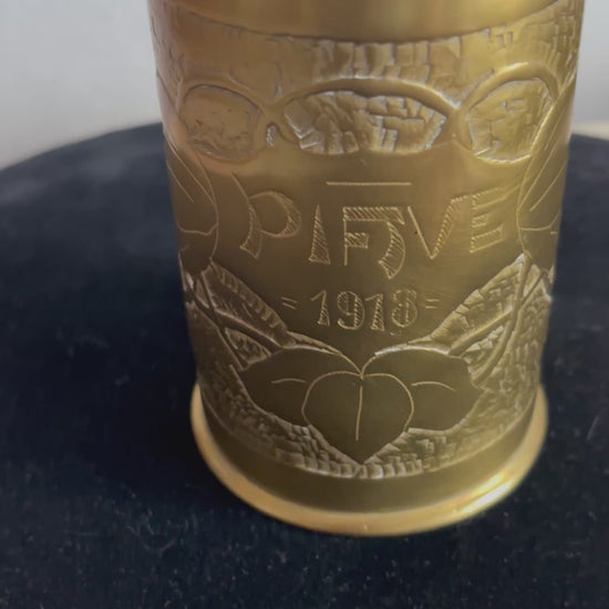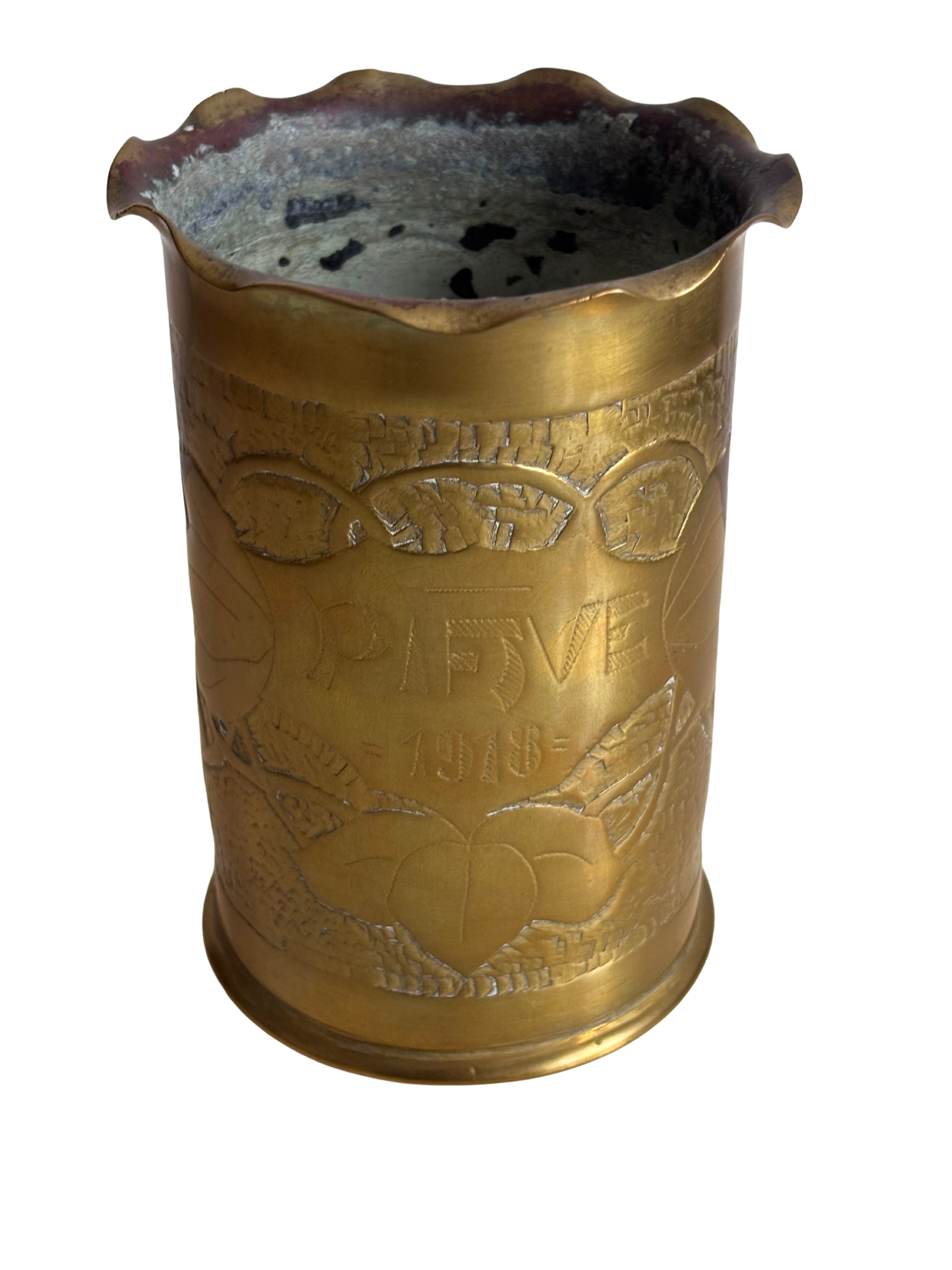 The base retains the original German headstamps with the 1915 date, caliber, and manufacturer’s marks, confirming its wartime origin and its later conversion into a functional and personal remembrance object. This type of artifact is a quintessential example of trench art, created by soldiers who, during or after the conflict, transformed war materials into decorative objects, souvenirs, or symbols of survival.