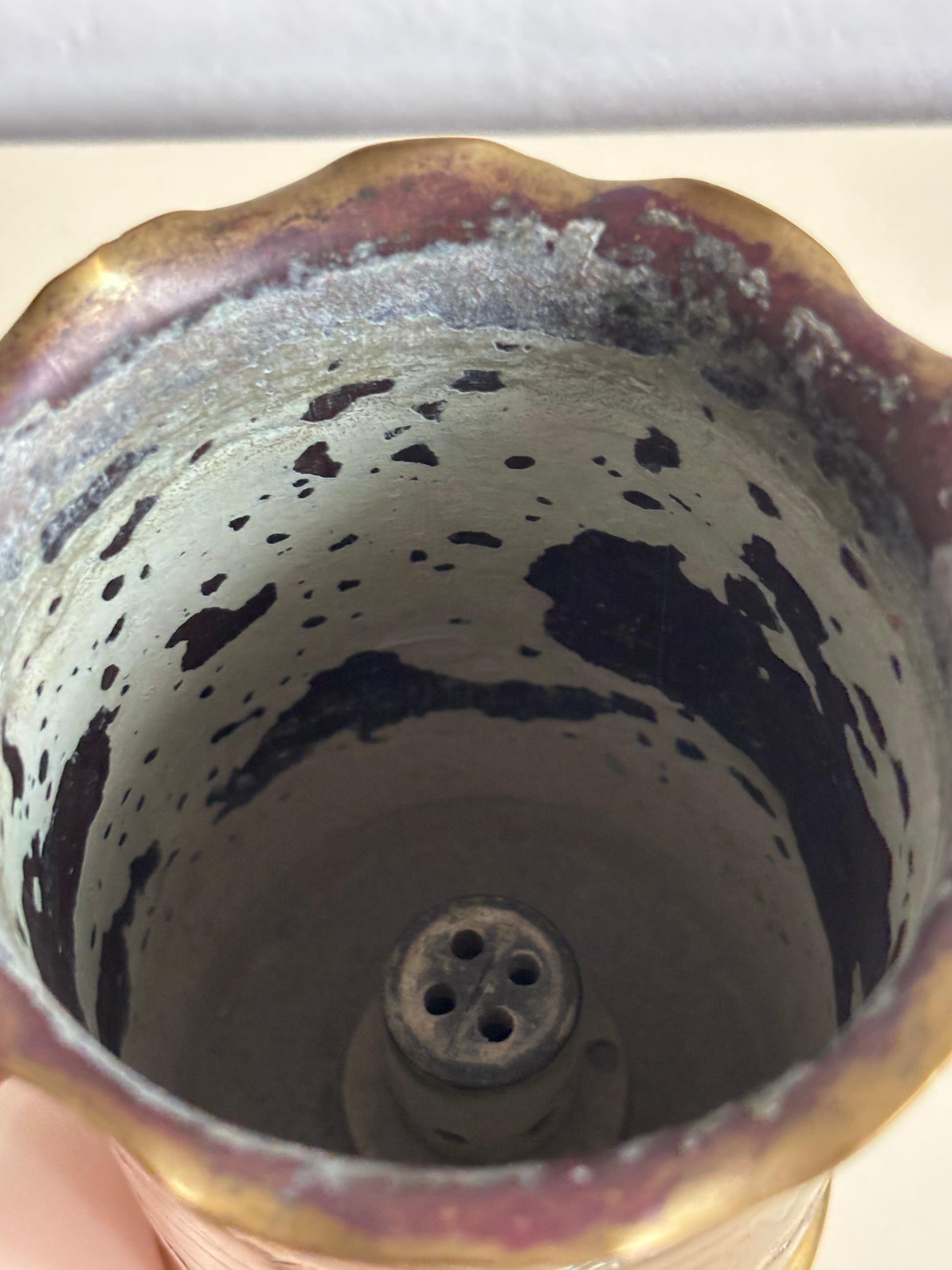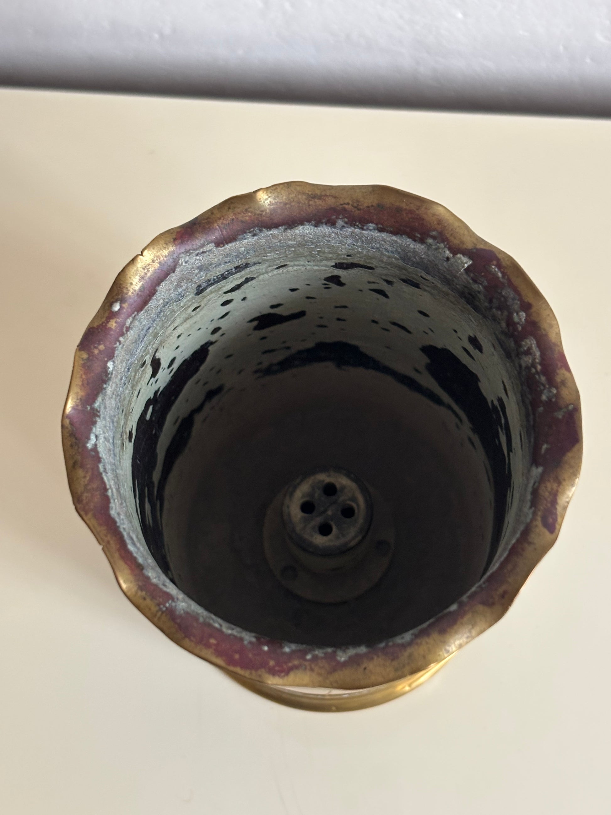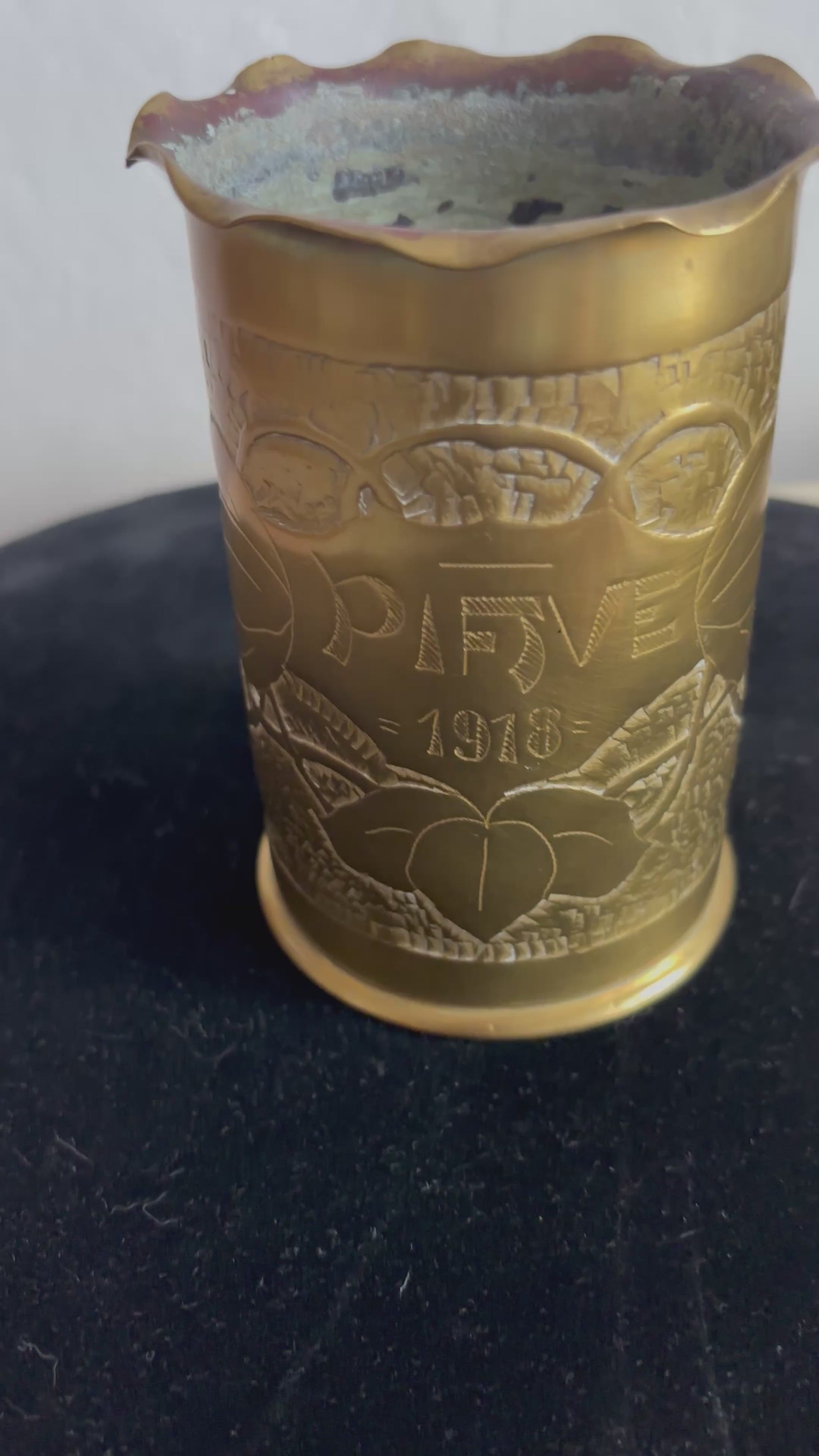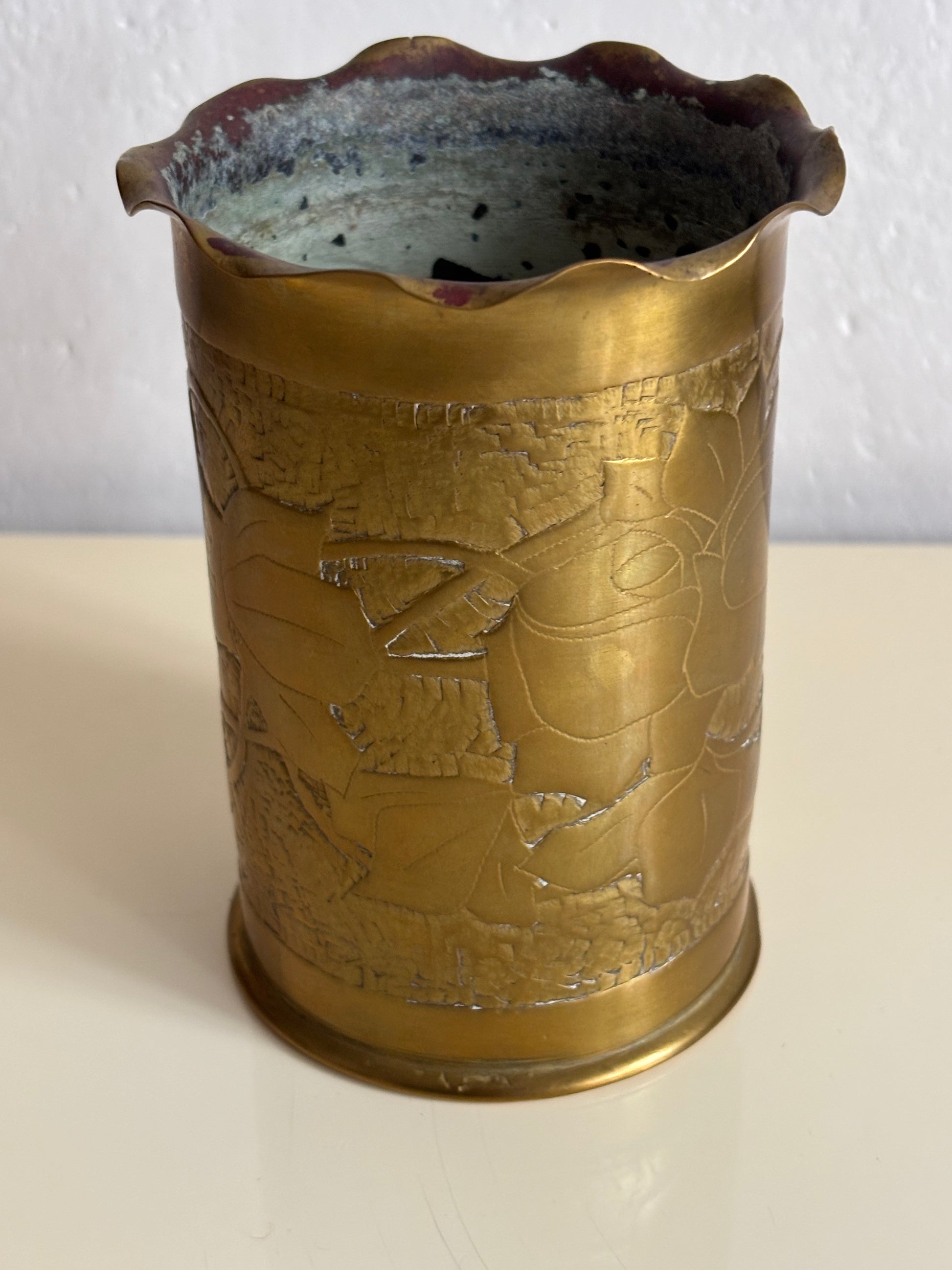 Authentic German shell case from 1915, transformed into a vase by an Italian soldier—a significant example of World War I trench art. The piece is made from a brass shell case that was later manually worked and engraved, featuring a scalloped, wavy‑profile rim and raised decorations with symbolic and commemorative motifs. The body bears the inscription “Piave 1918,” a clear reference to the Italian front and the victory on the Piave River, giving the piece strong historical and memorial value.