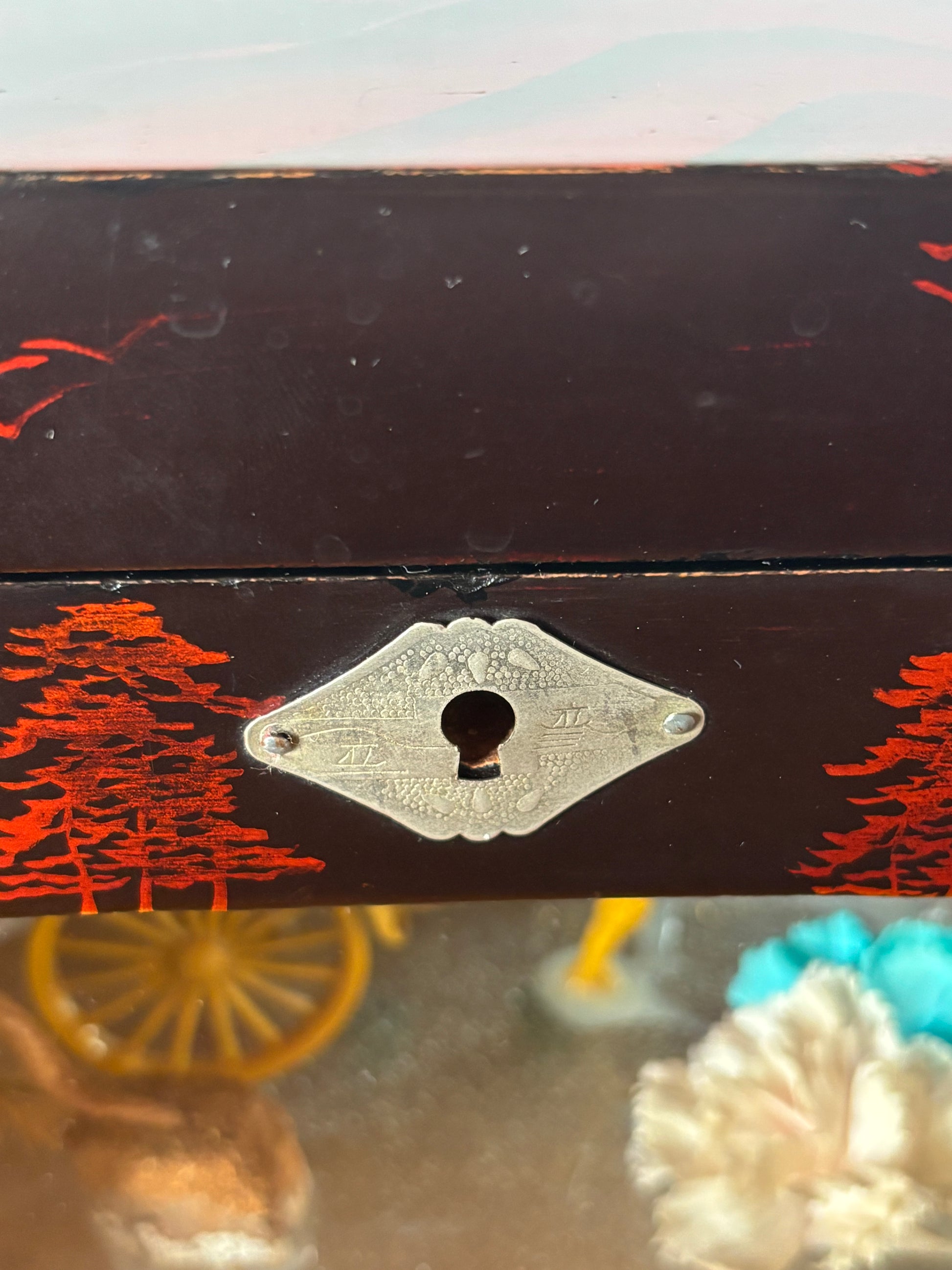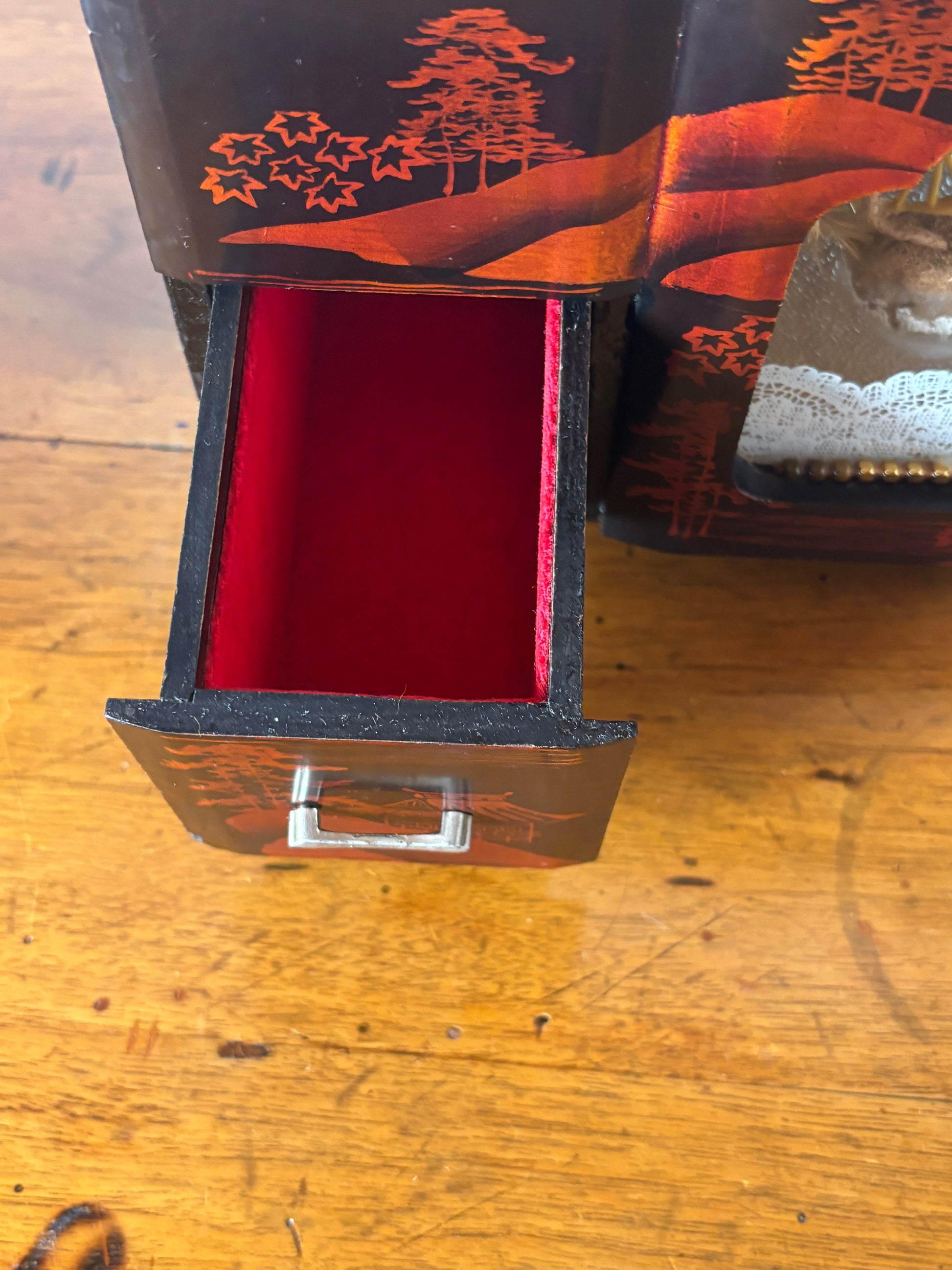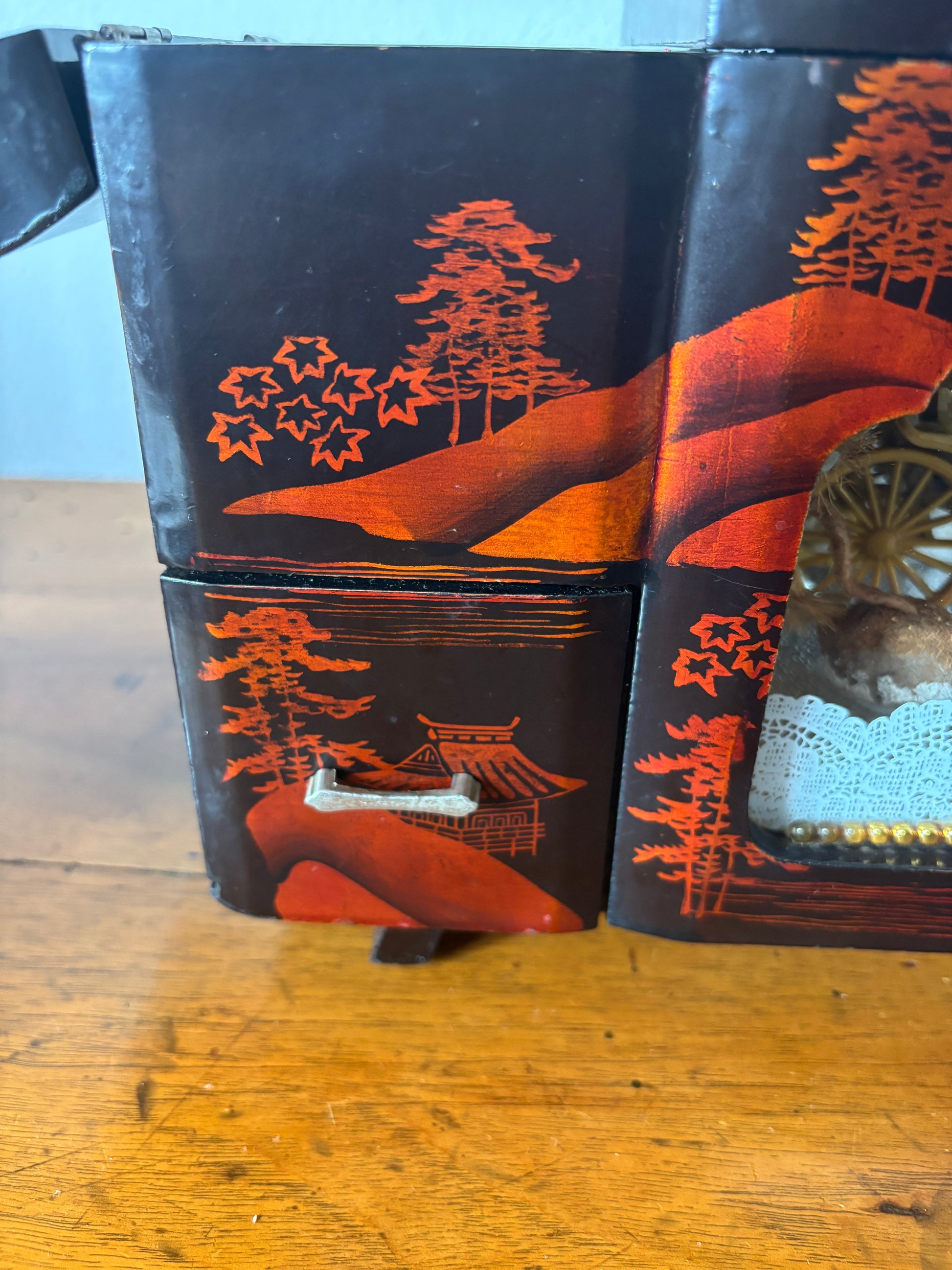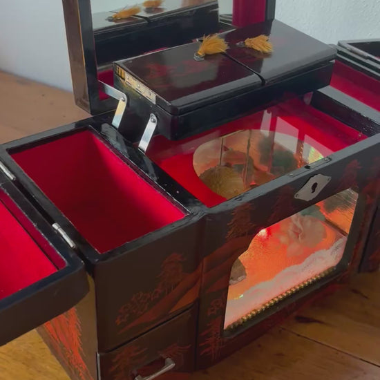This charming vintage Japanese jewelry box combines traditional aesthetics with theatrical mechanical elements, making it an ideal piece for collectors and lovers of Japanese vintage items. The surface is enriched with elegant red decorations that give the box a distinctive and highly decorative character.