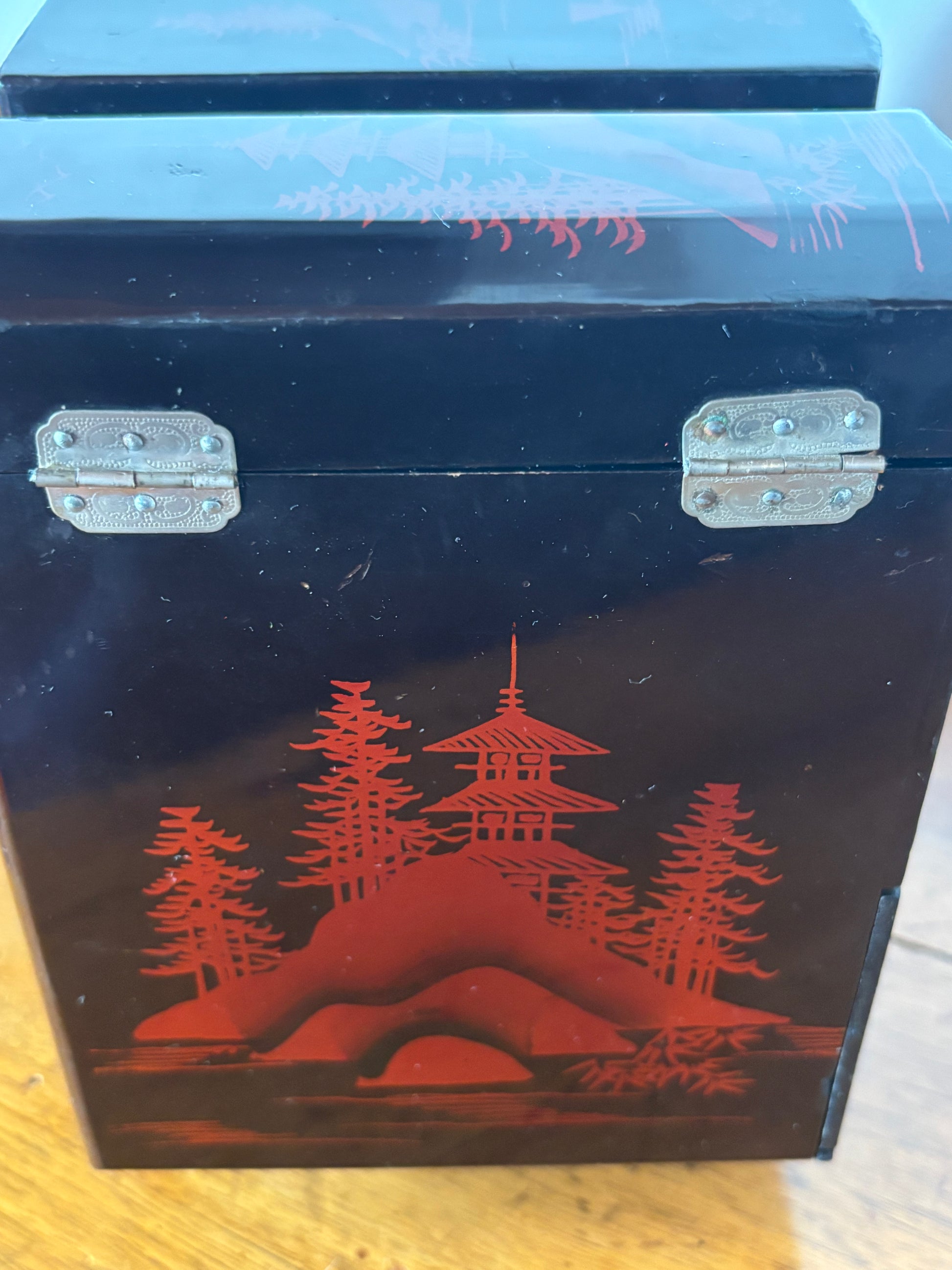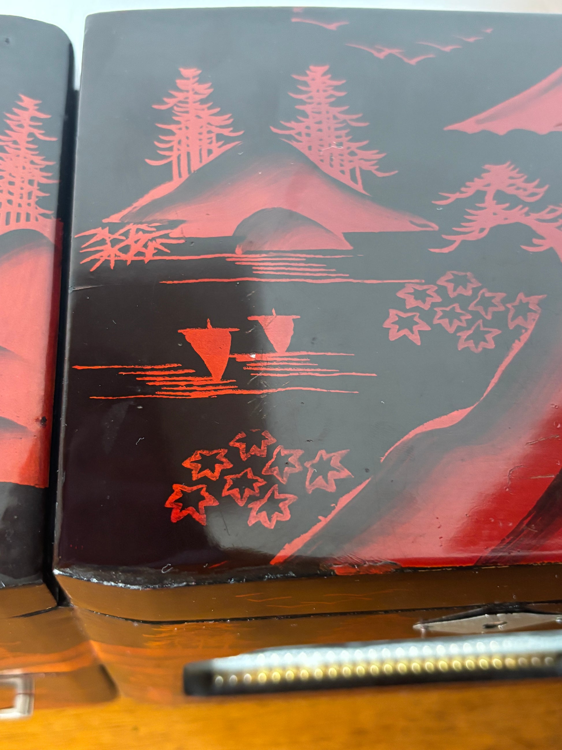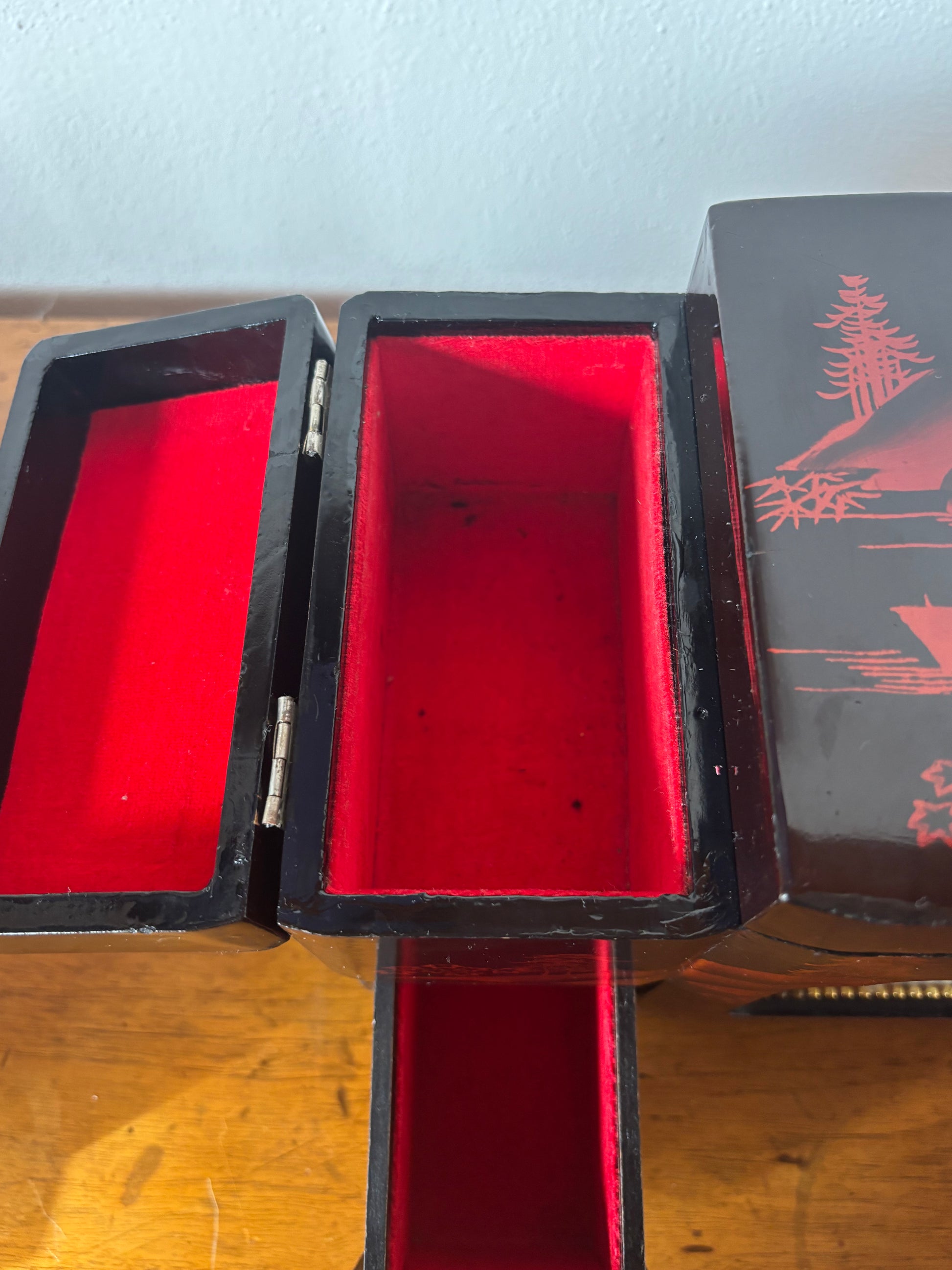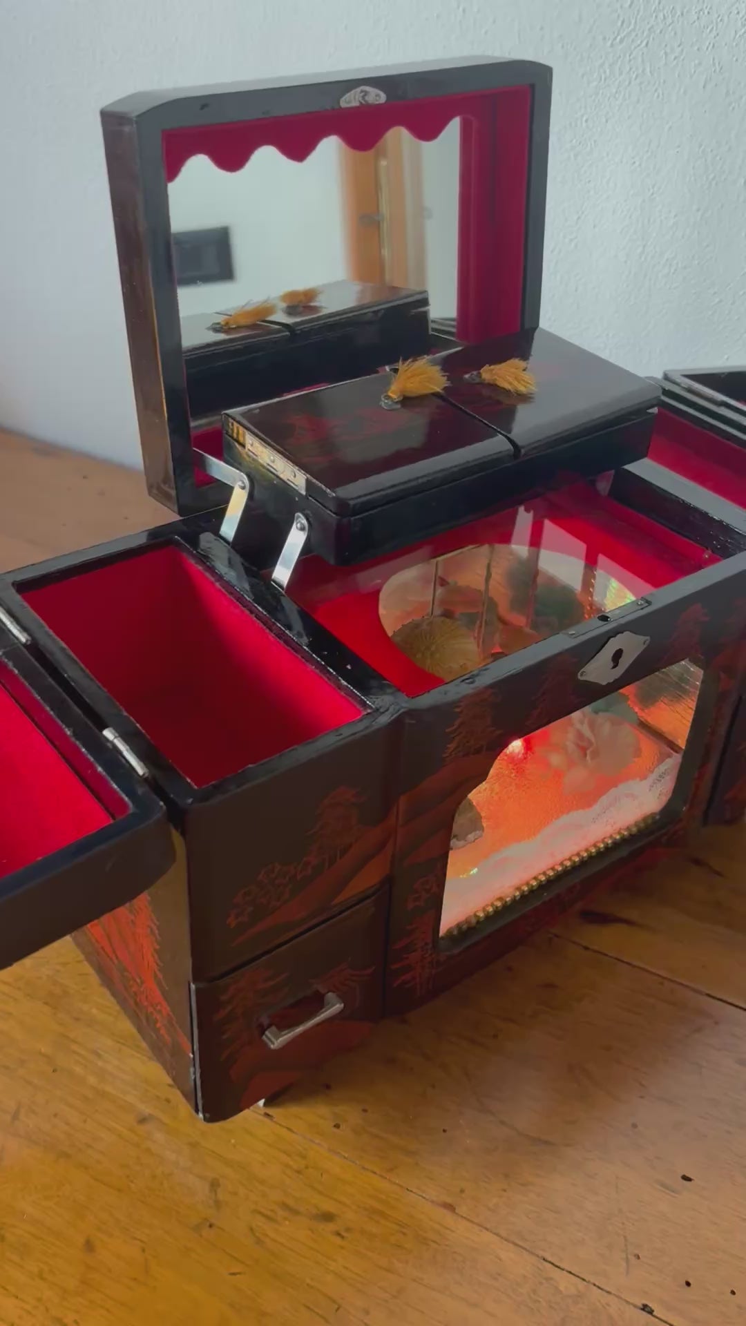 This charming vintage Japanese jewelry box combines traditional aesthetics with theatrical mechanical elements, making it an ideal piece for collectors and lovers of Japanese vintage items. The surface is enriched with elegant red decorations that give the box a distinctive and highly decorative character.