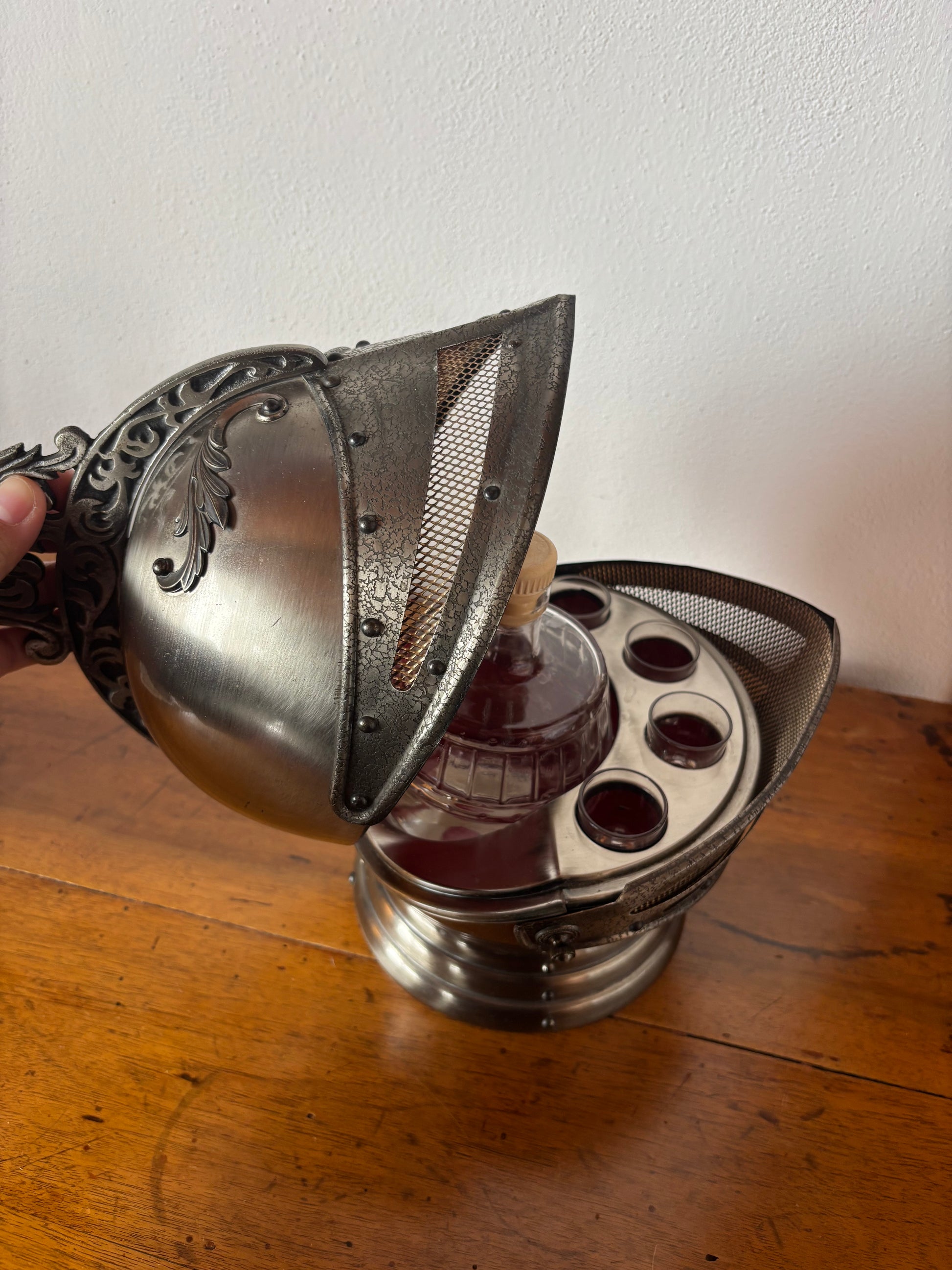 When the bottle is lifted, the internal music box activates automatically, accompanying the gesture with a melody that adds a theatrical and surprising touch to the experience. The bottle and glasses have been replaced with compatible elements, while the helmet and the musical mechanism are in excellent condition, preserving the original charm of the piece.