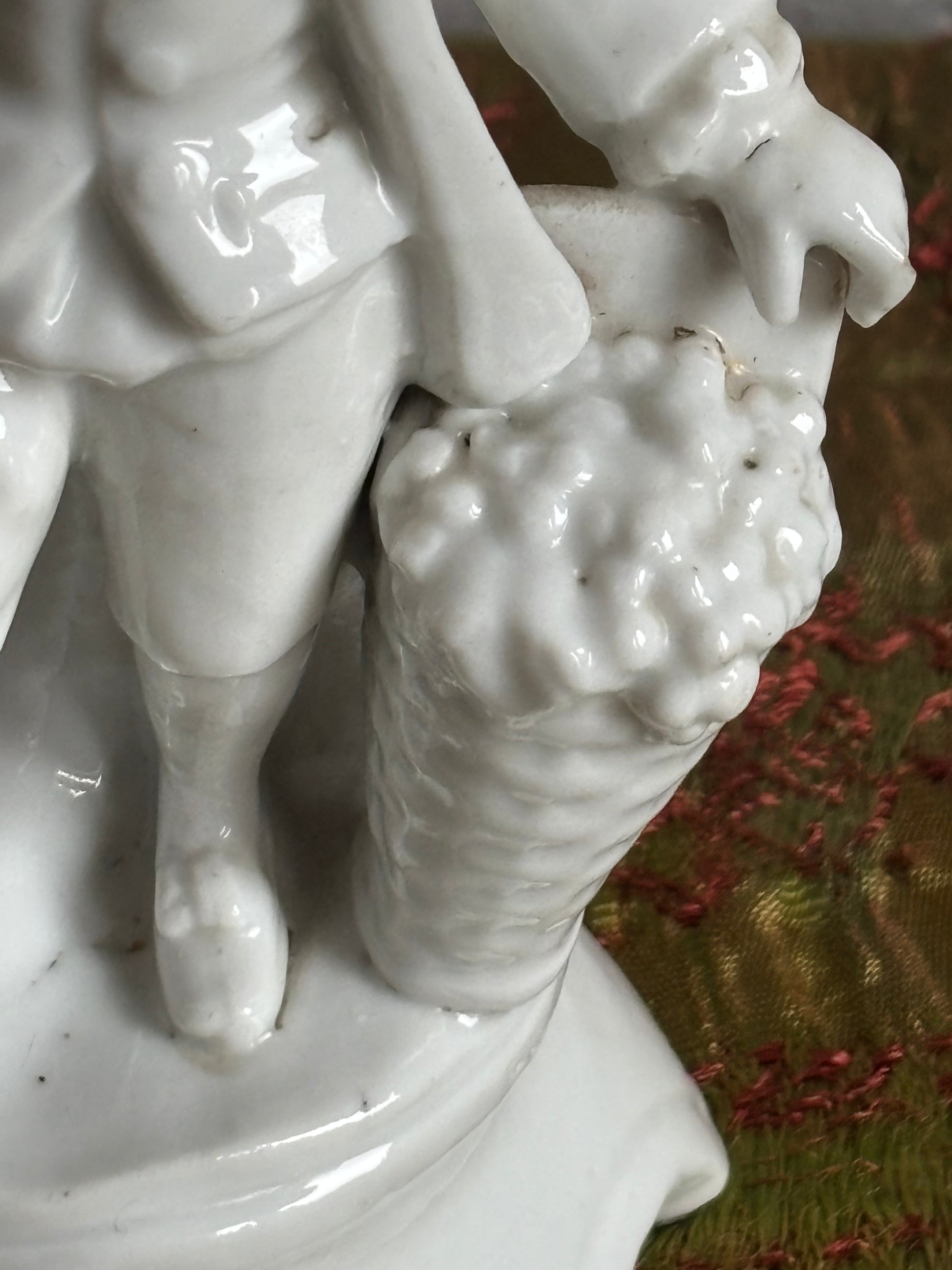 The shaped base, with no visible marks, features undulating edges and retains traces of original gilding in some areas, now partially worn. The monochrome finish and the quality of the porcelain are consistent with various European manufacturers active in the 19th century, including French, Italian, or German origins. On the back of the figure, a small opening is present, likely intended to hold a quill, suggesting a possible original function as a desk pen holder.