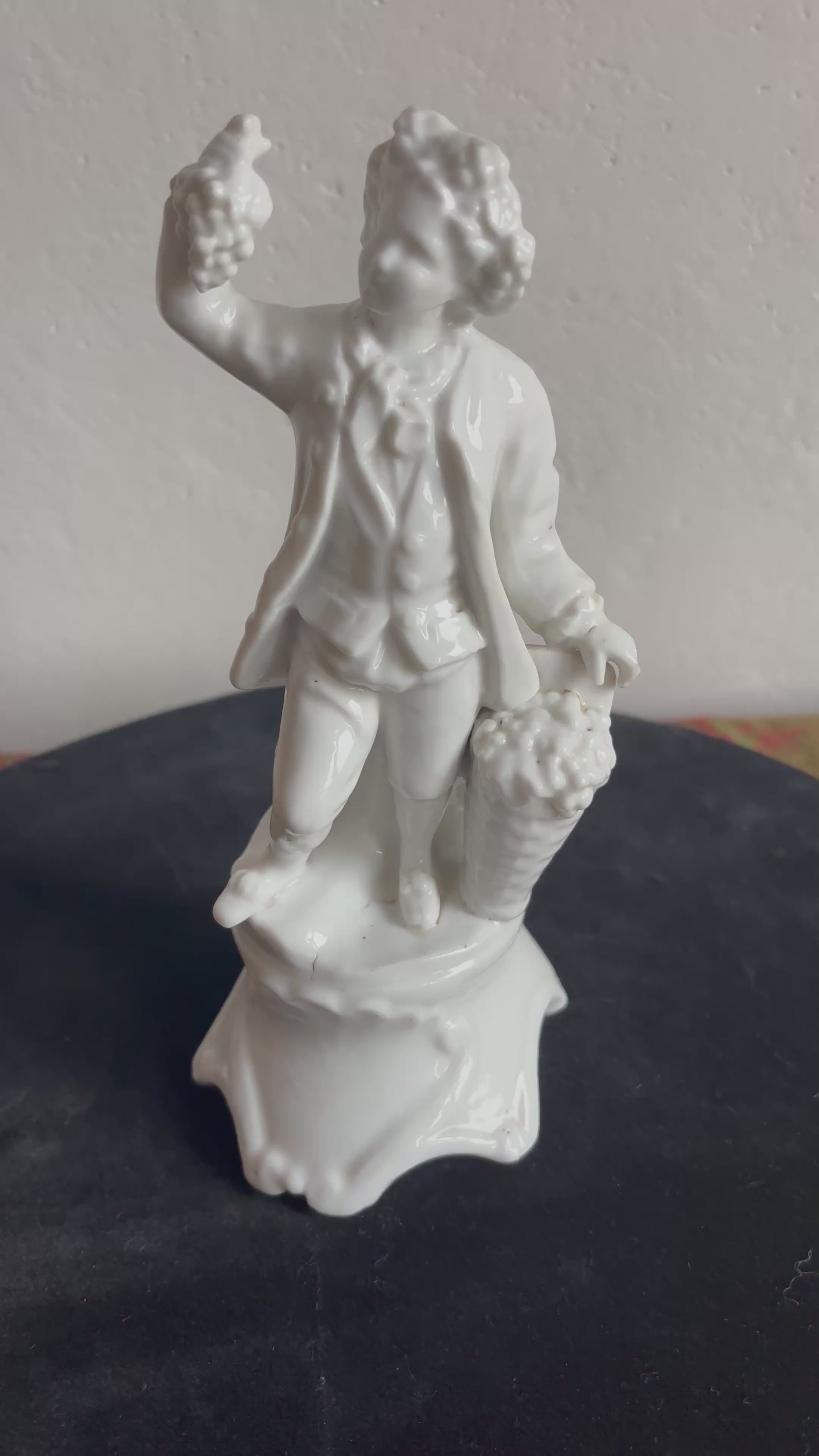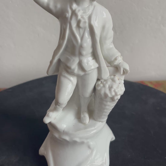 Glossy white porcelain figurine depicting a male figure in period attire, holding bunches of grapes and standing beside a full basket. The sculpting is detailed in the folds of the clothing and the fruit, evoking allegorical themes of harvest and abundance common in European decorative arts of the 19th century.