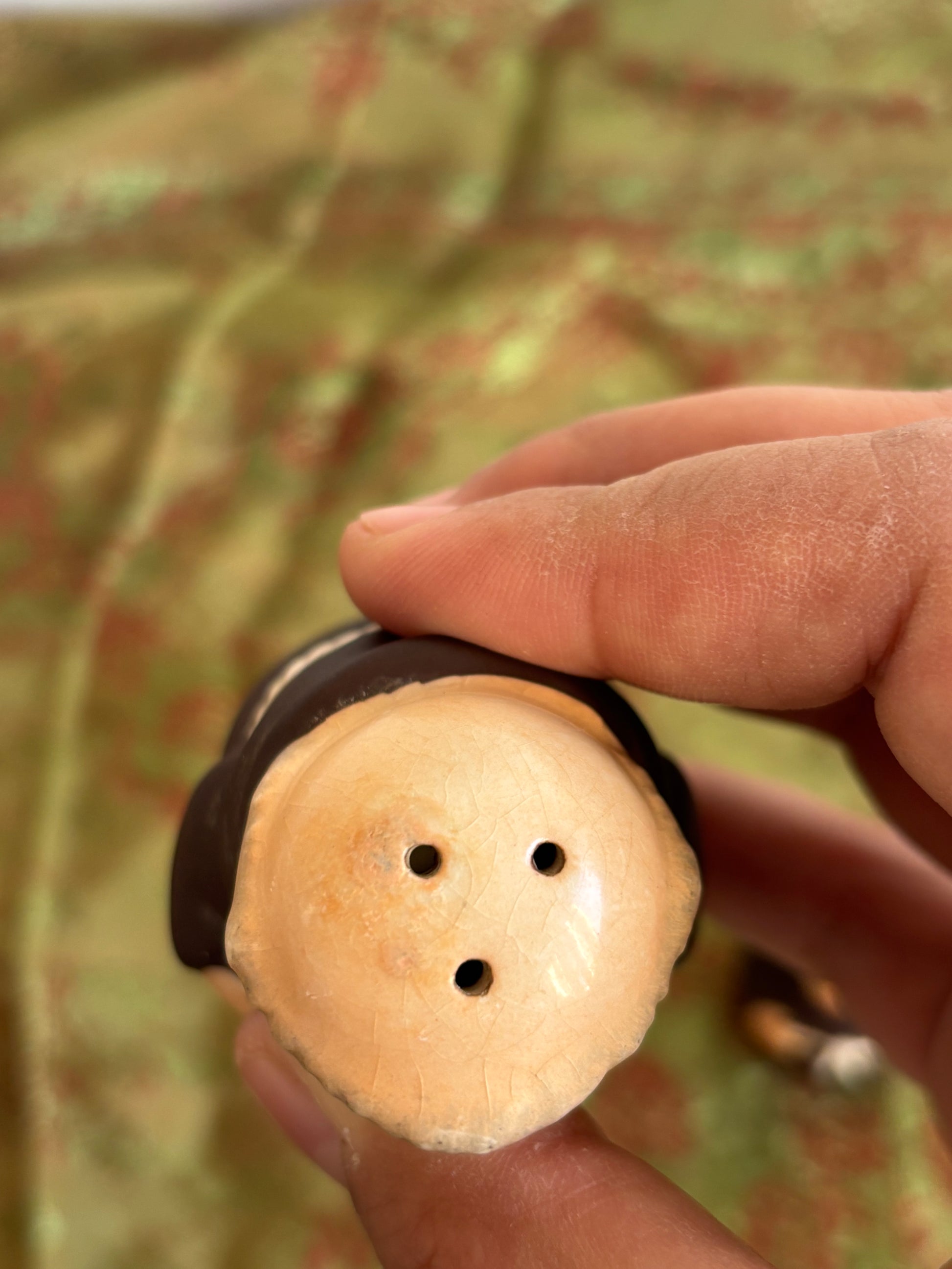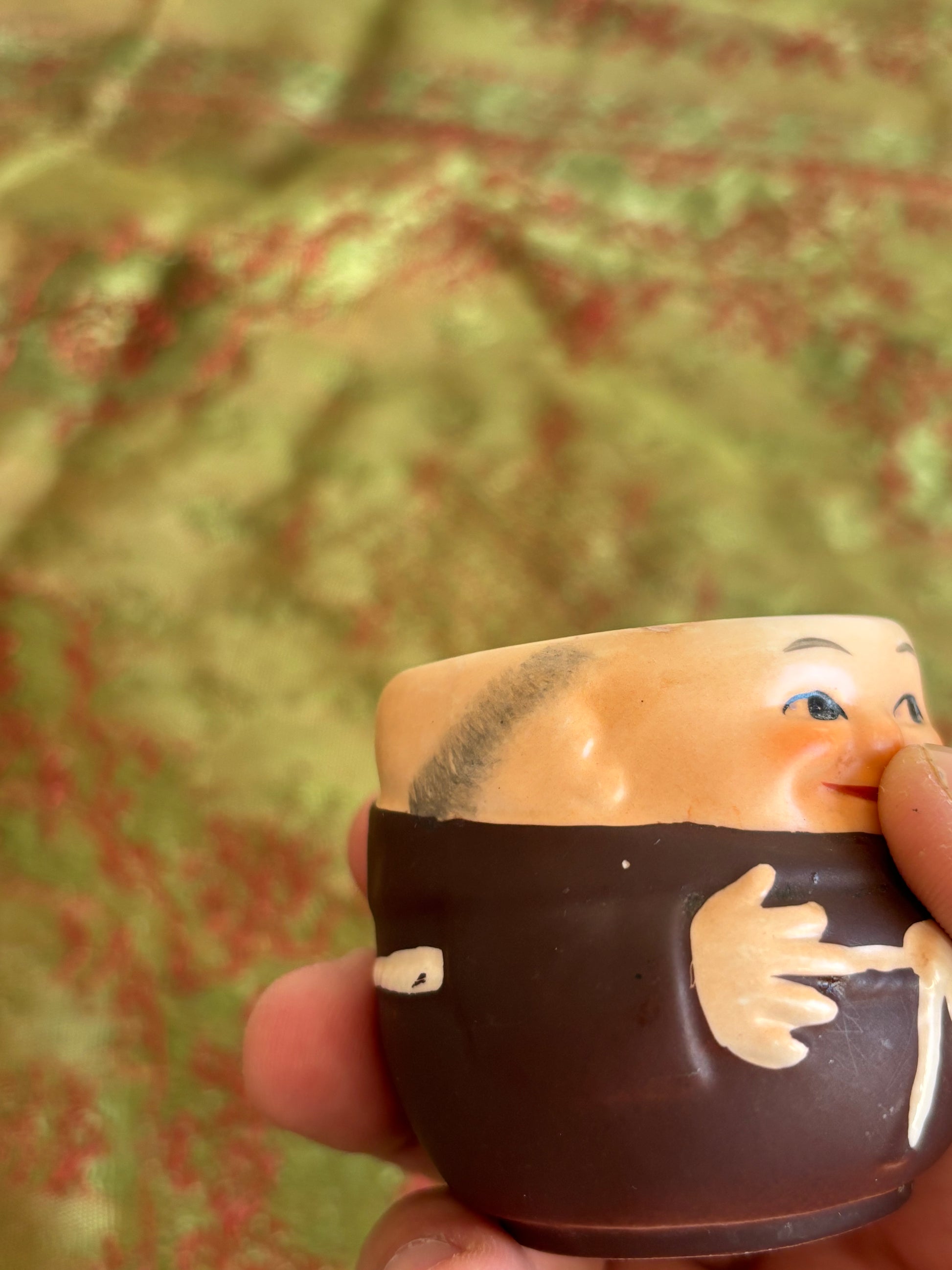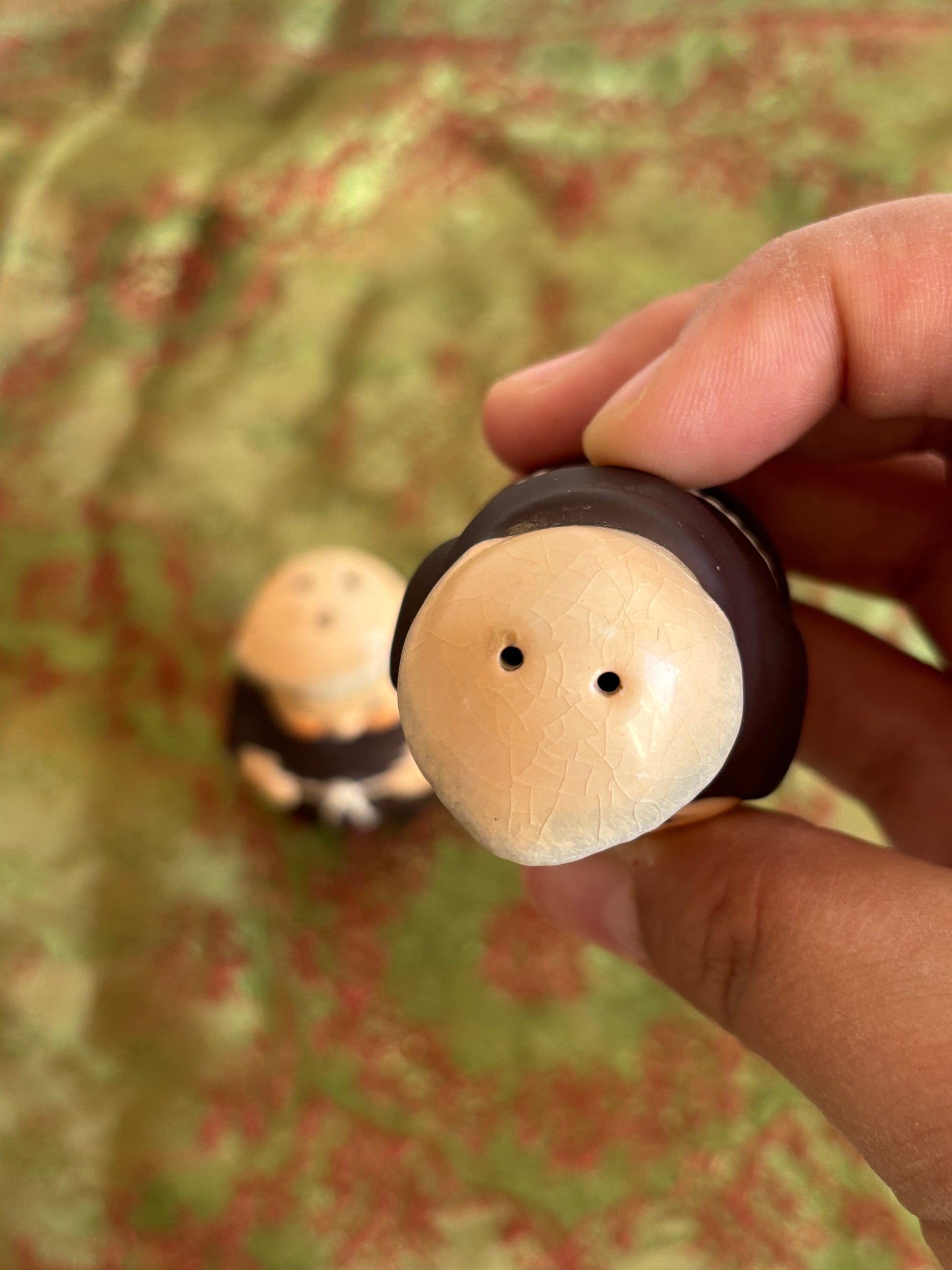 Charming vintage condiment set produced by West Goebel, the renowned West German manufacturer celebrated for its figurative ceramics. The set consists of three containers shaped as smiling friars, crafted in ceramic with brown robes, accompanied by a small tray that completes the composition. It includes a salt shaker, a pepper shaker, and an egg holder, each with lively expressions and carefully executed details that reflect the playful style typical of Goebel’s 1950s creations.