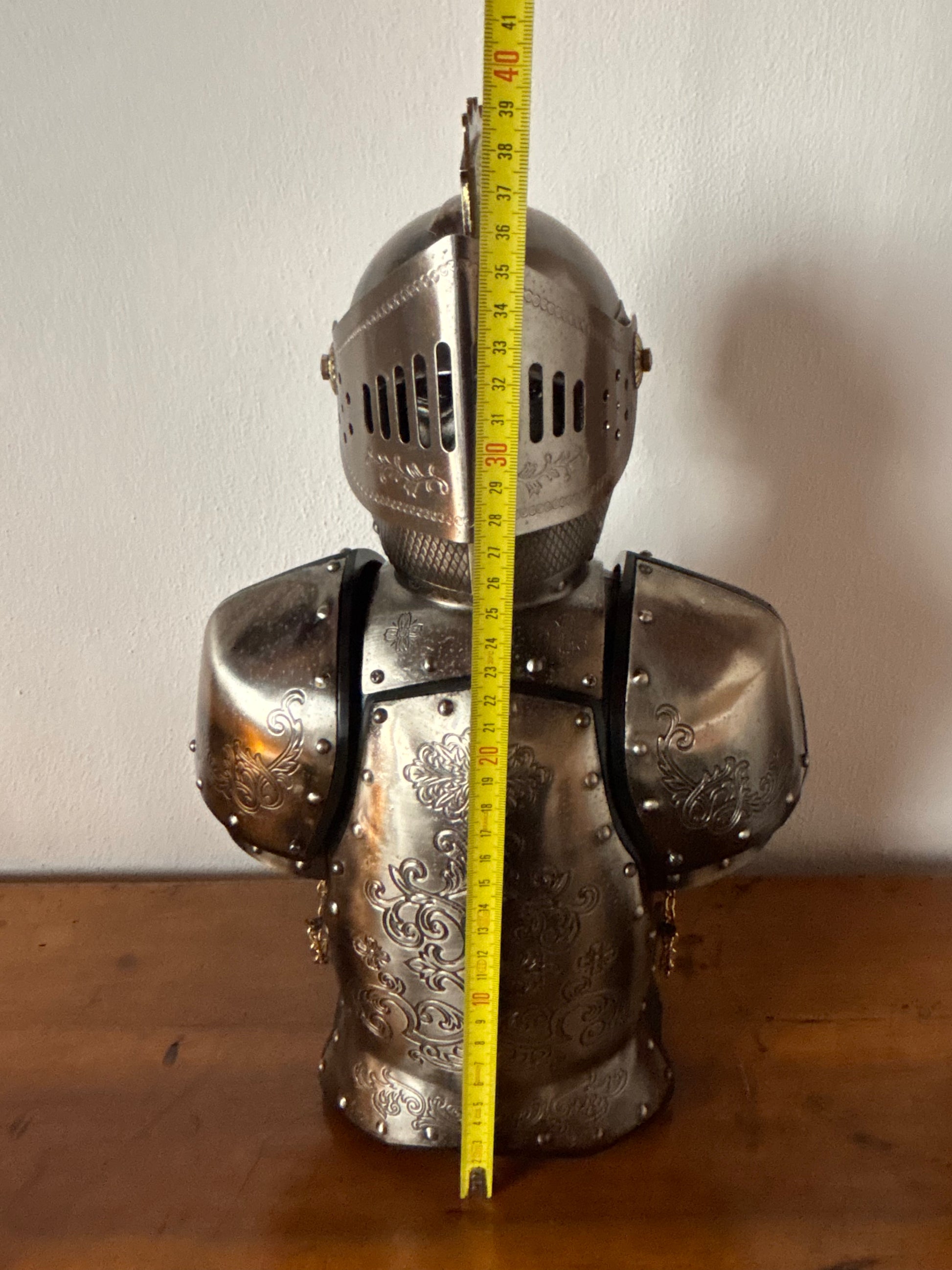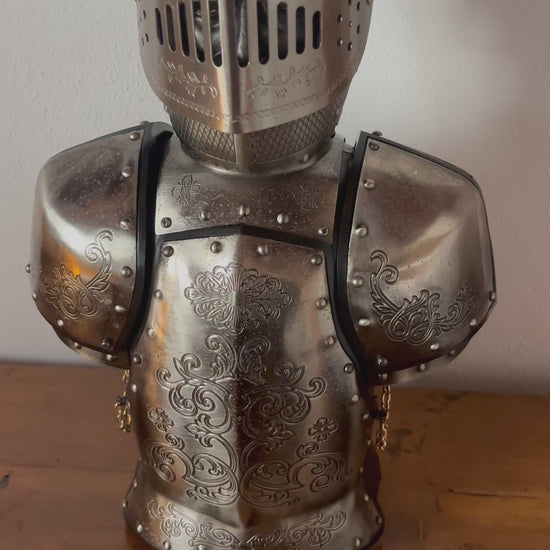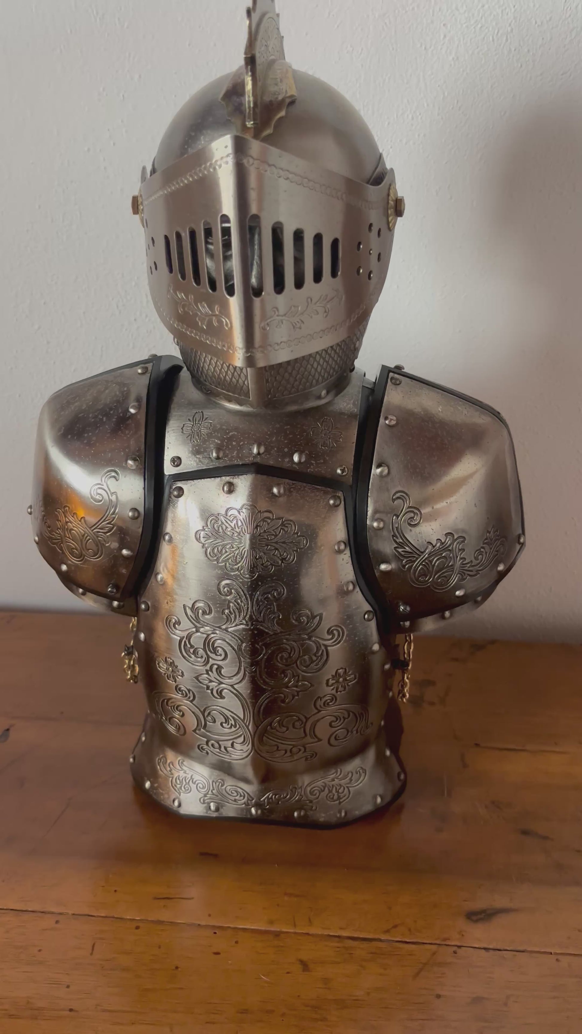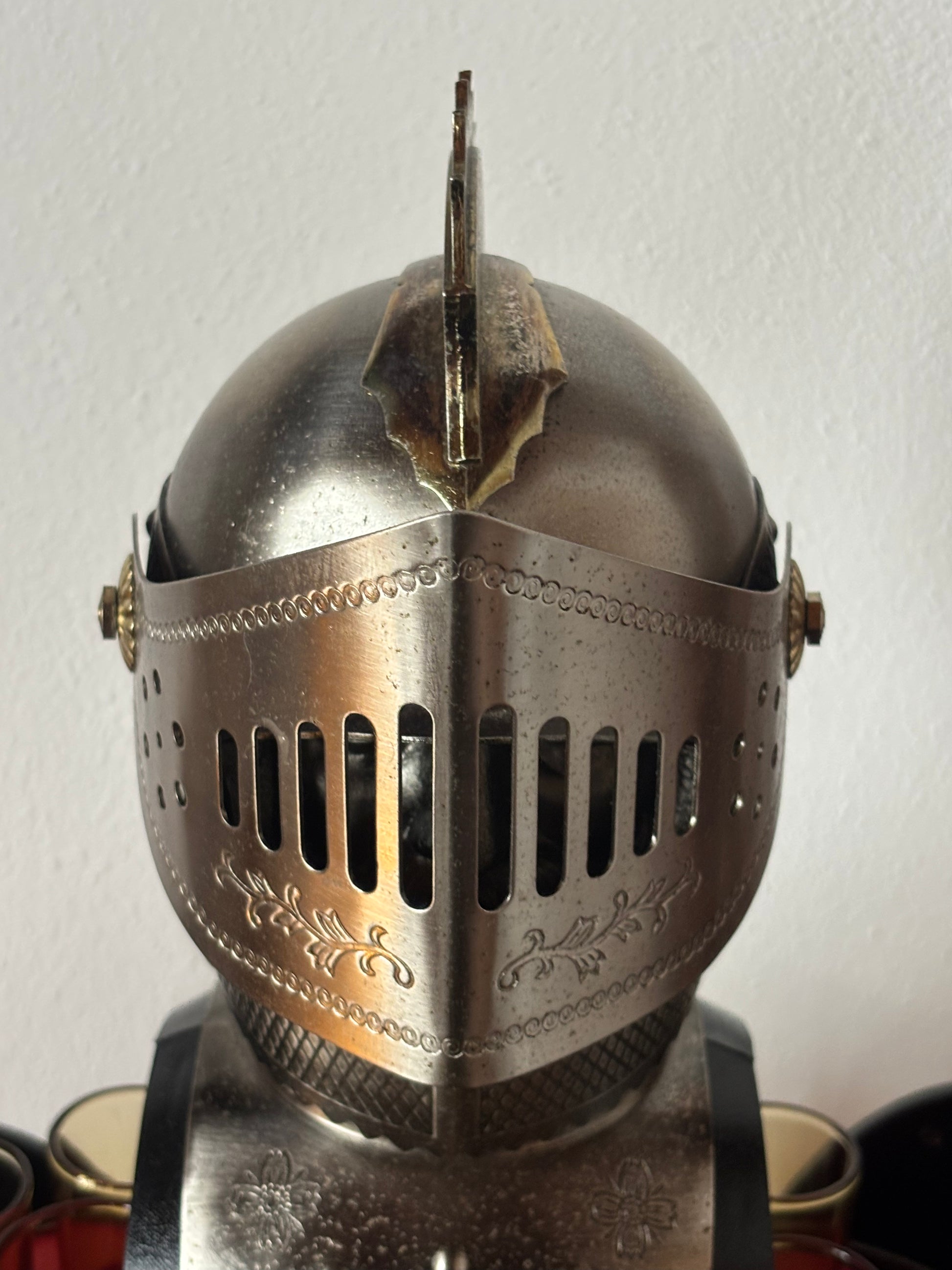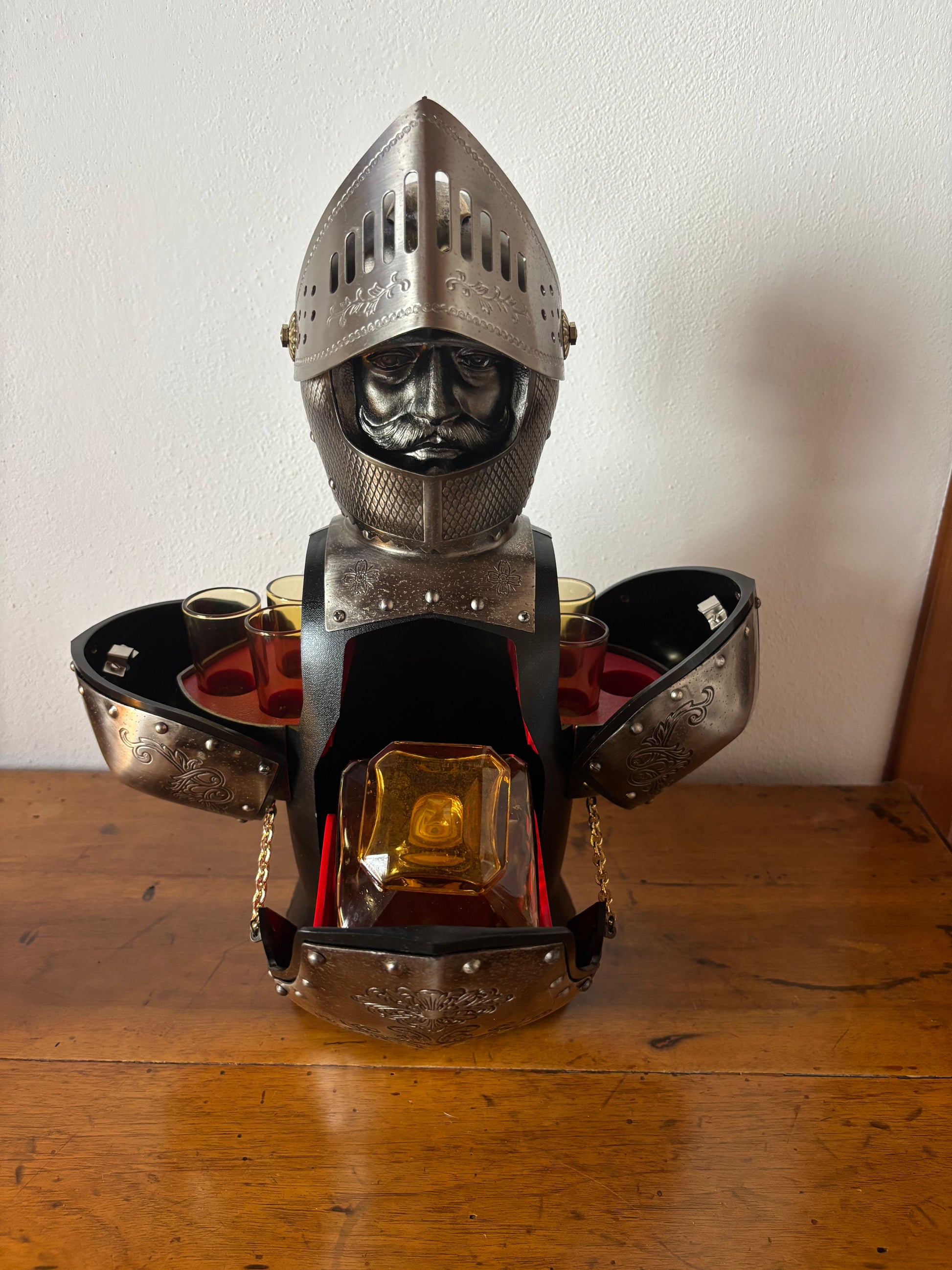 This charming vintage armor‑style bar is a striking decorative piece, ideal for collectors, enthusiasts of medieval‑themed objects, and anyone looking to enrich their home bar with a unique and theatrical item. The structure, finely crafted with engraved details and antique‑style metallic surfaces, reproduces the bust of a knight, transforming into an elegant and functional liquor holder.