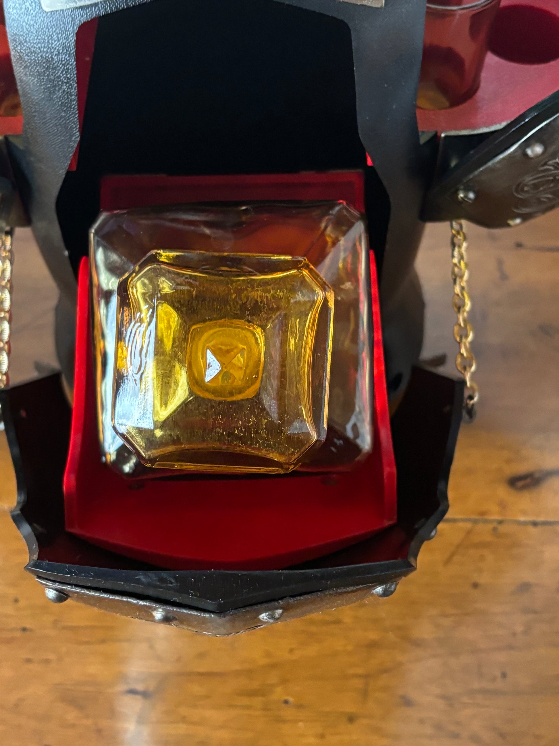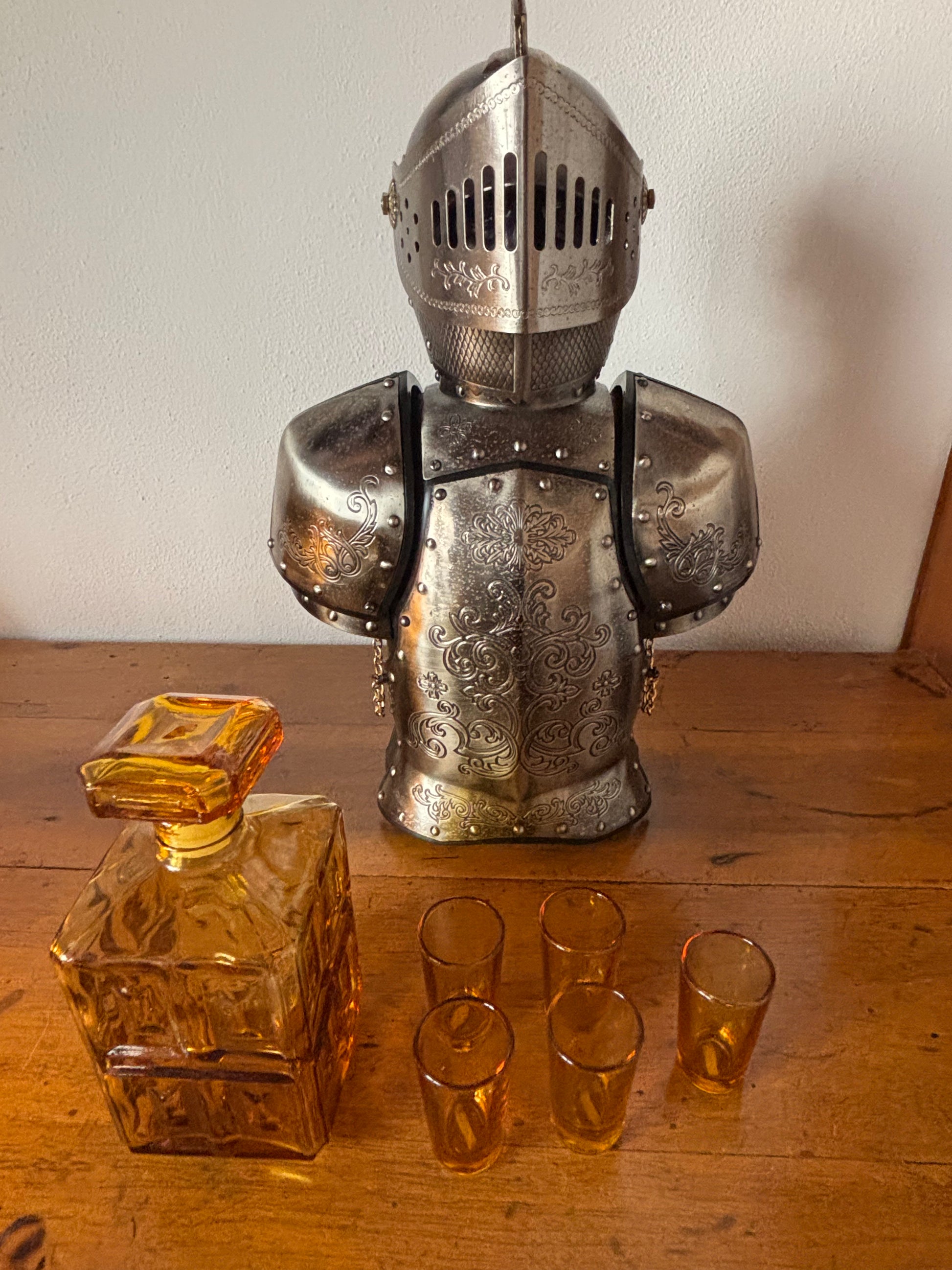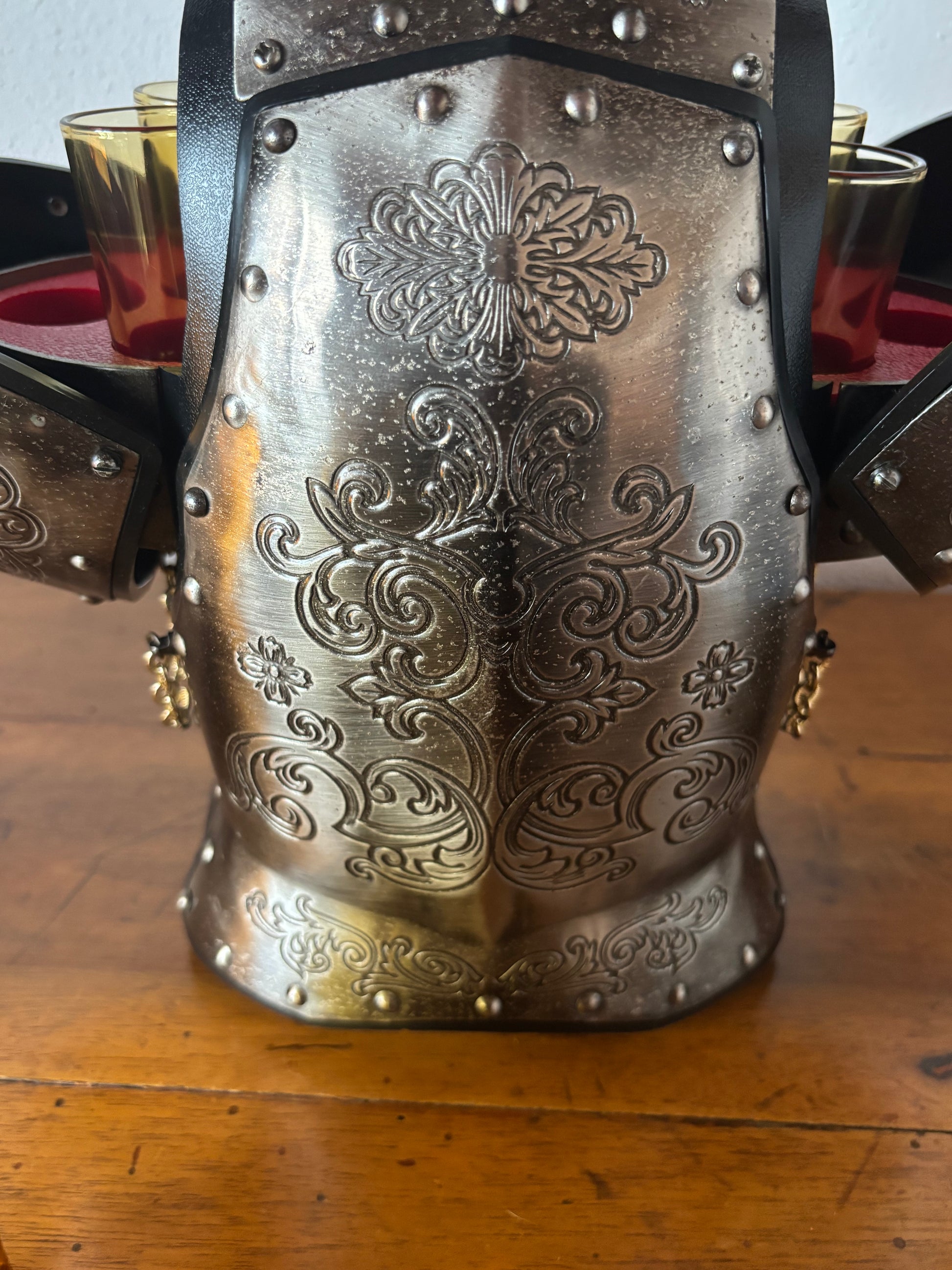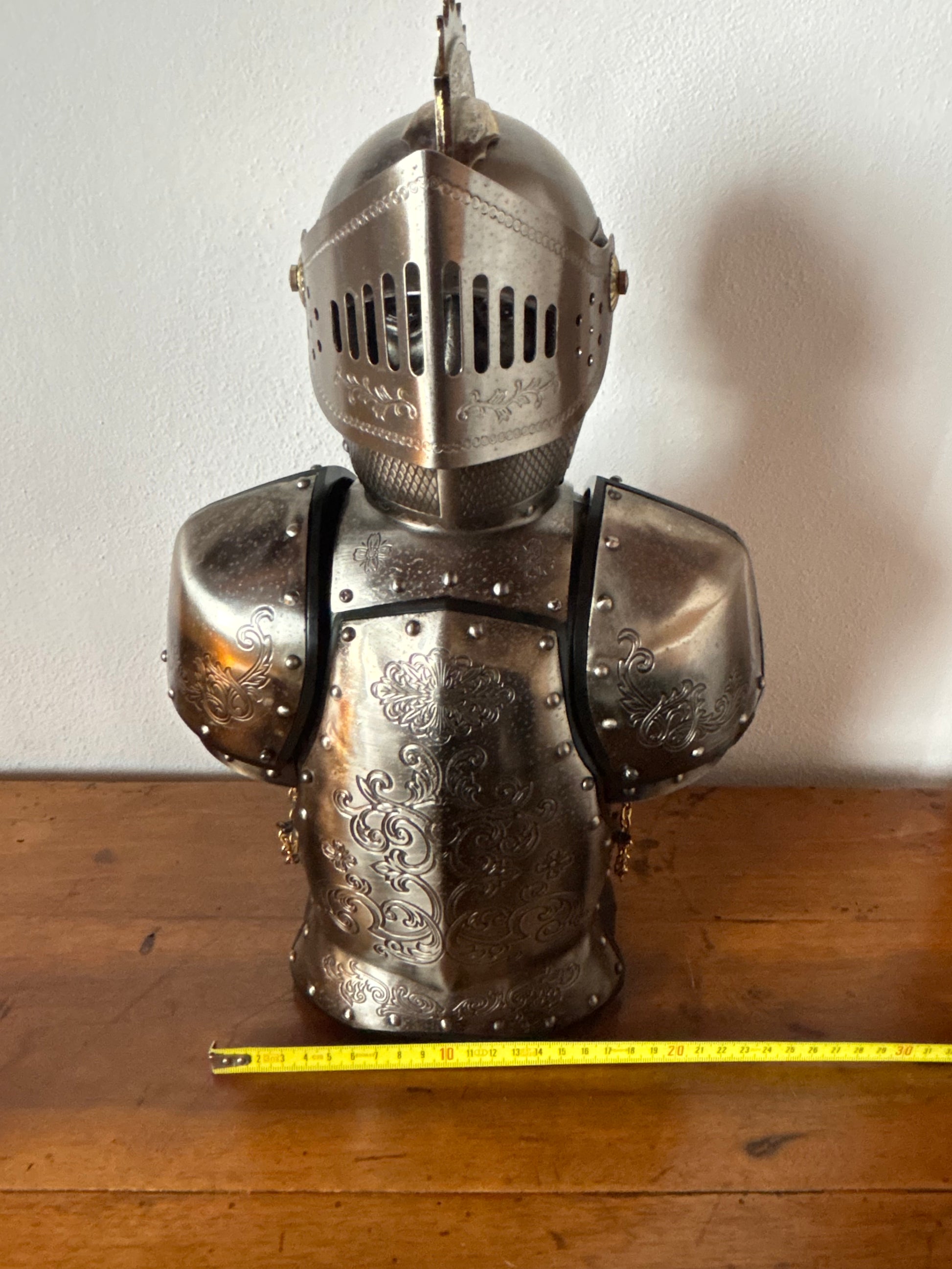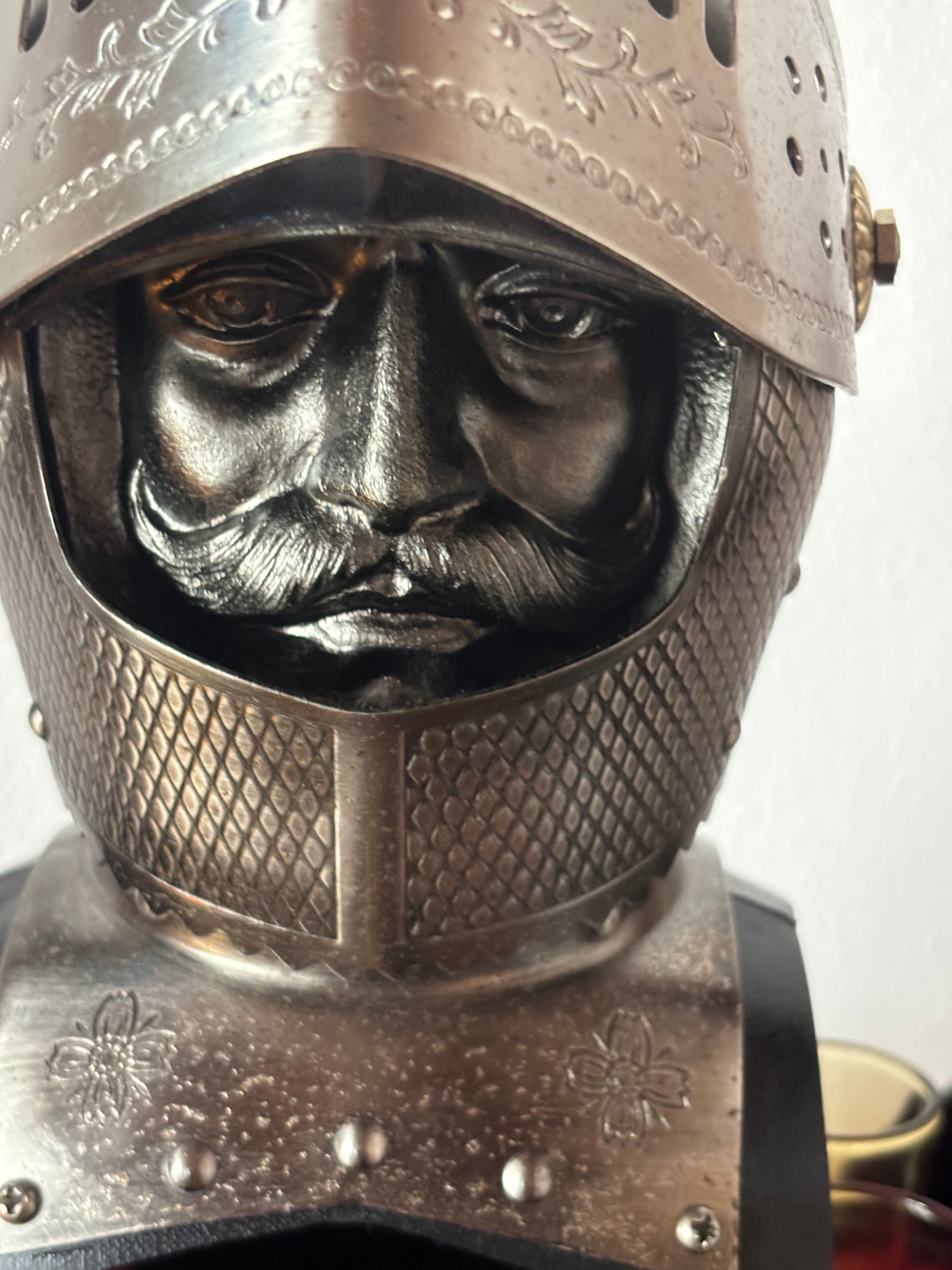 This charming vintage armor‑style bar is a striking decorative piece, ideal for collectors, enthusiasts of medieval‑themed objects, and anyone looking to enrich their home bar with a unique and theatrical item. The structure, finely crafted with engraved details and antique‑style metallic surfaces, reproduces the bust of a knight, transforming into an elegant and functional liquor holder.