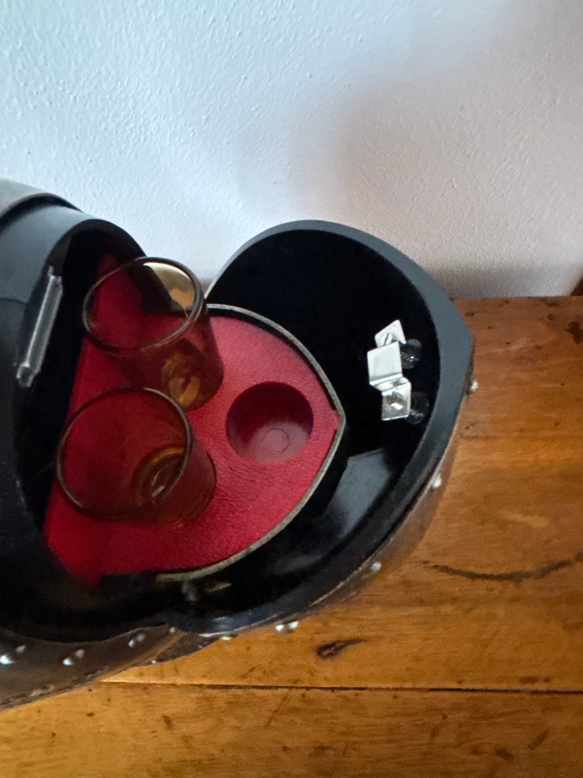 Opening the front section reveals the liquor set, consisting of a glass decanter and coordinated glasses. The armor is in excellent overall condition, with well‑preserved surfaces and solid opening mechanisms. One of the original glasses is missing, but the piece retains strong aesthetic and collectible value thanks to the quality of the craftsmanship and the presence of the perfectly matching decanter.