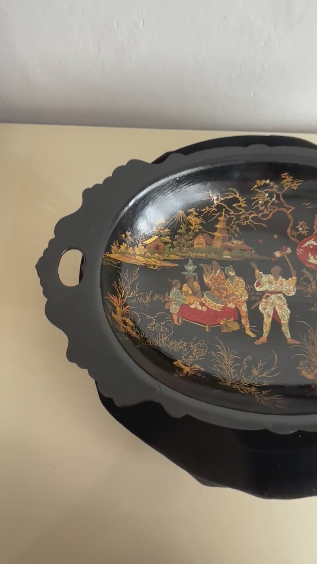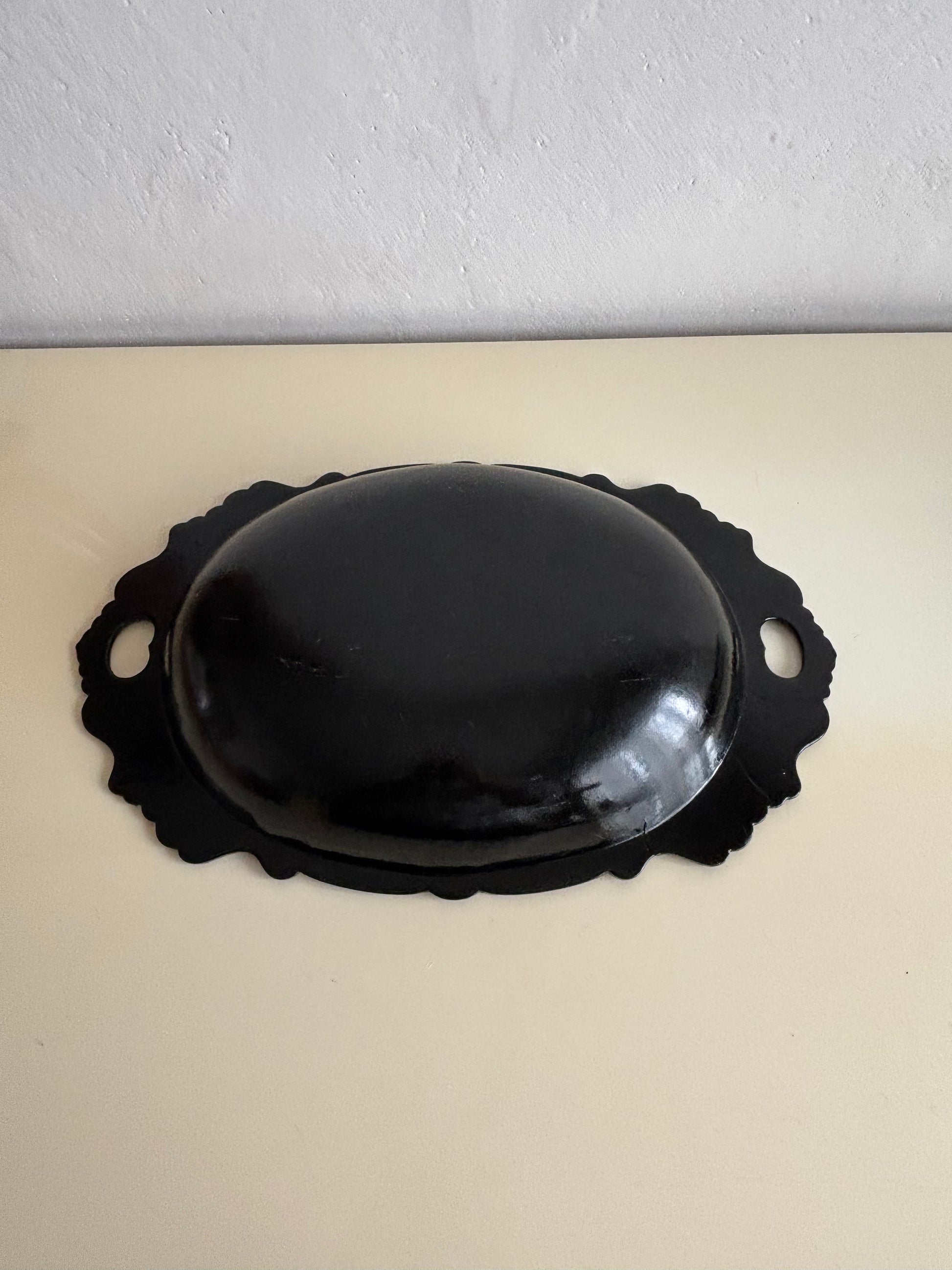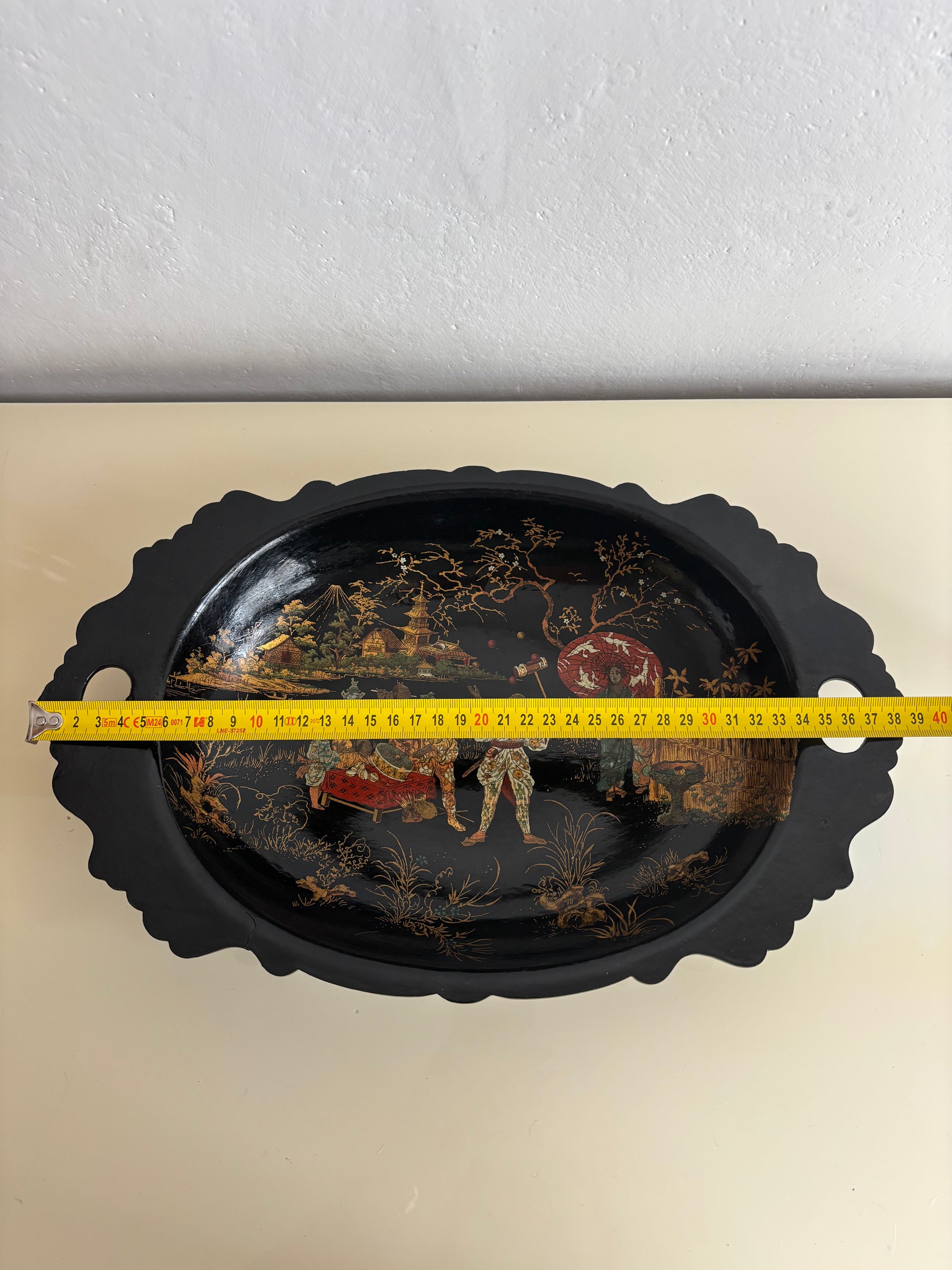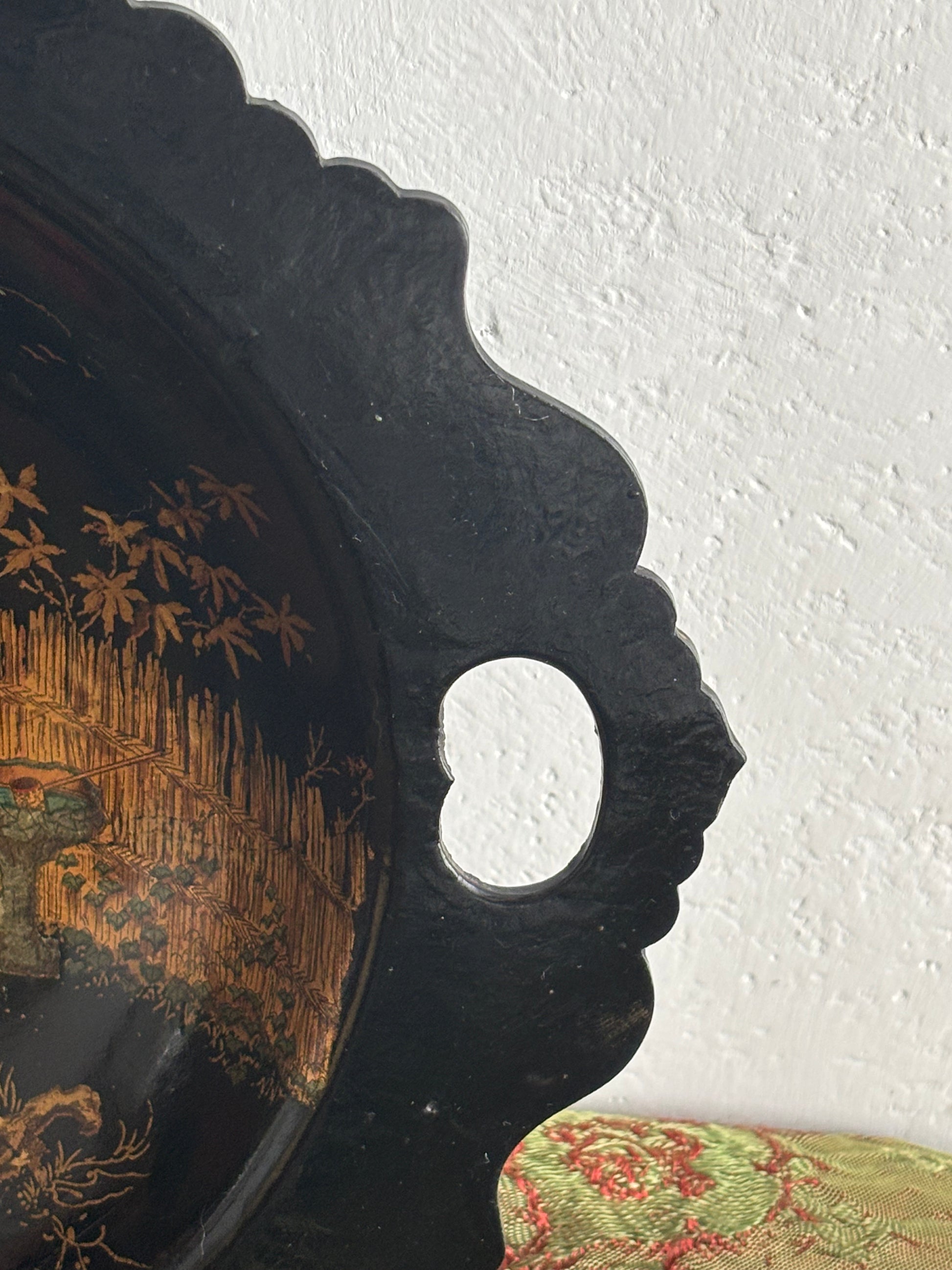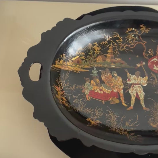 The oval shape with scalloped edges and side handles highlights its original function as a decorative and serving tray, while today it stands as a fine display piece, ideal as a period home décor accent or collectible item. The lacquer retains good shine, and the central scene remains clear and well‑defined, enhancing the overall visual impact.