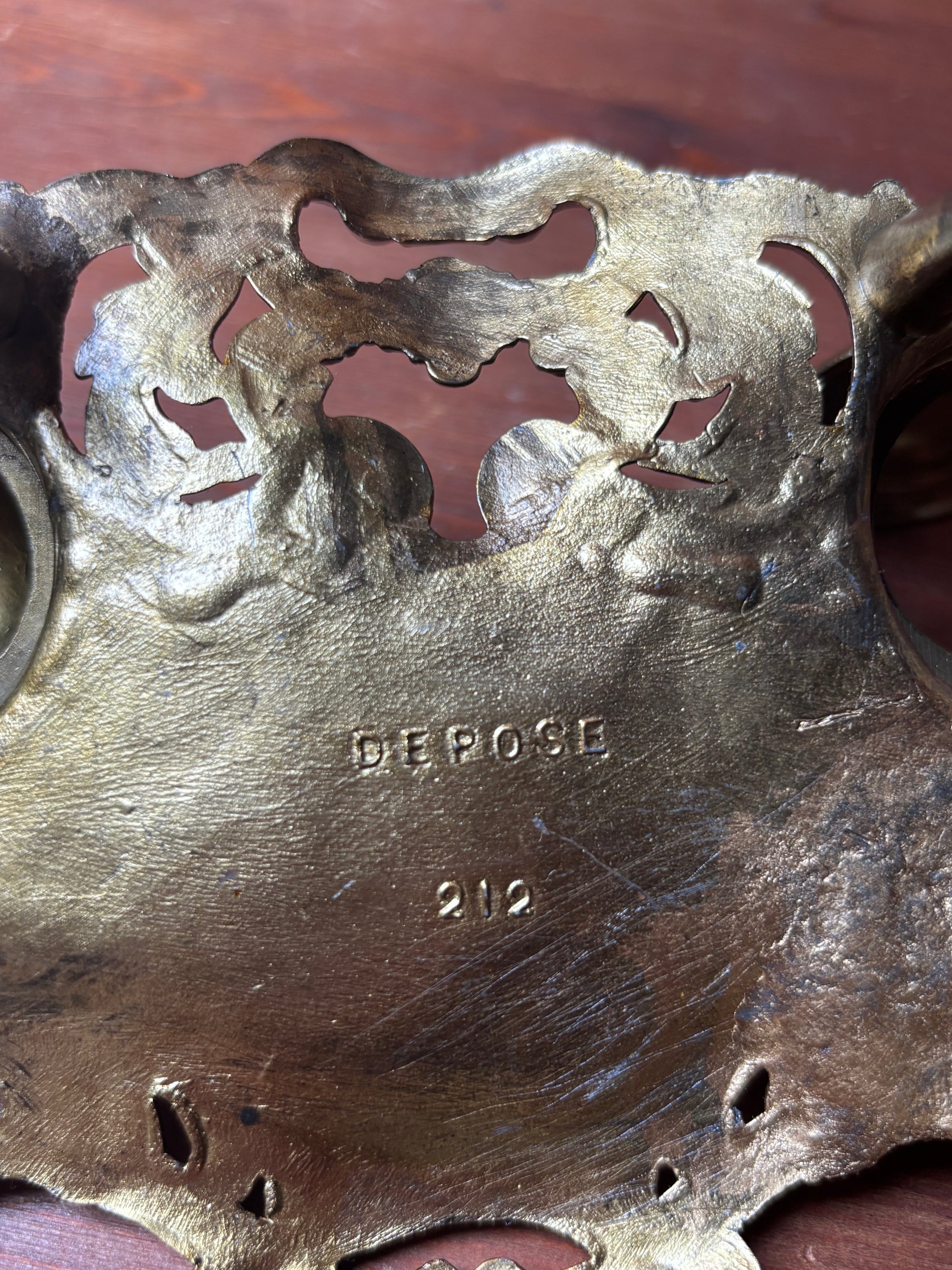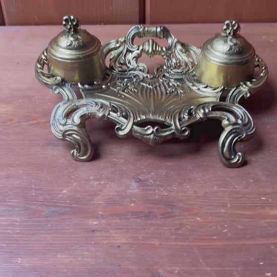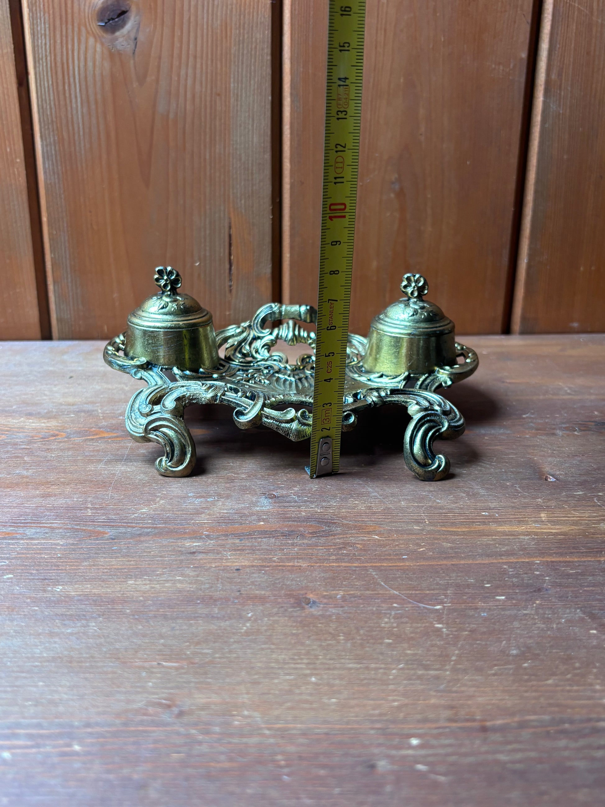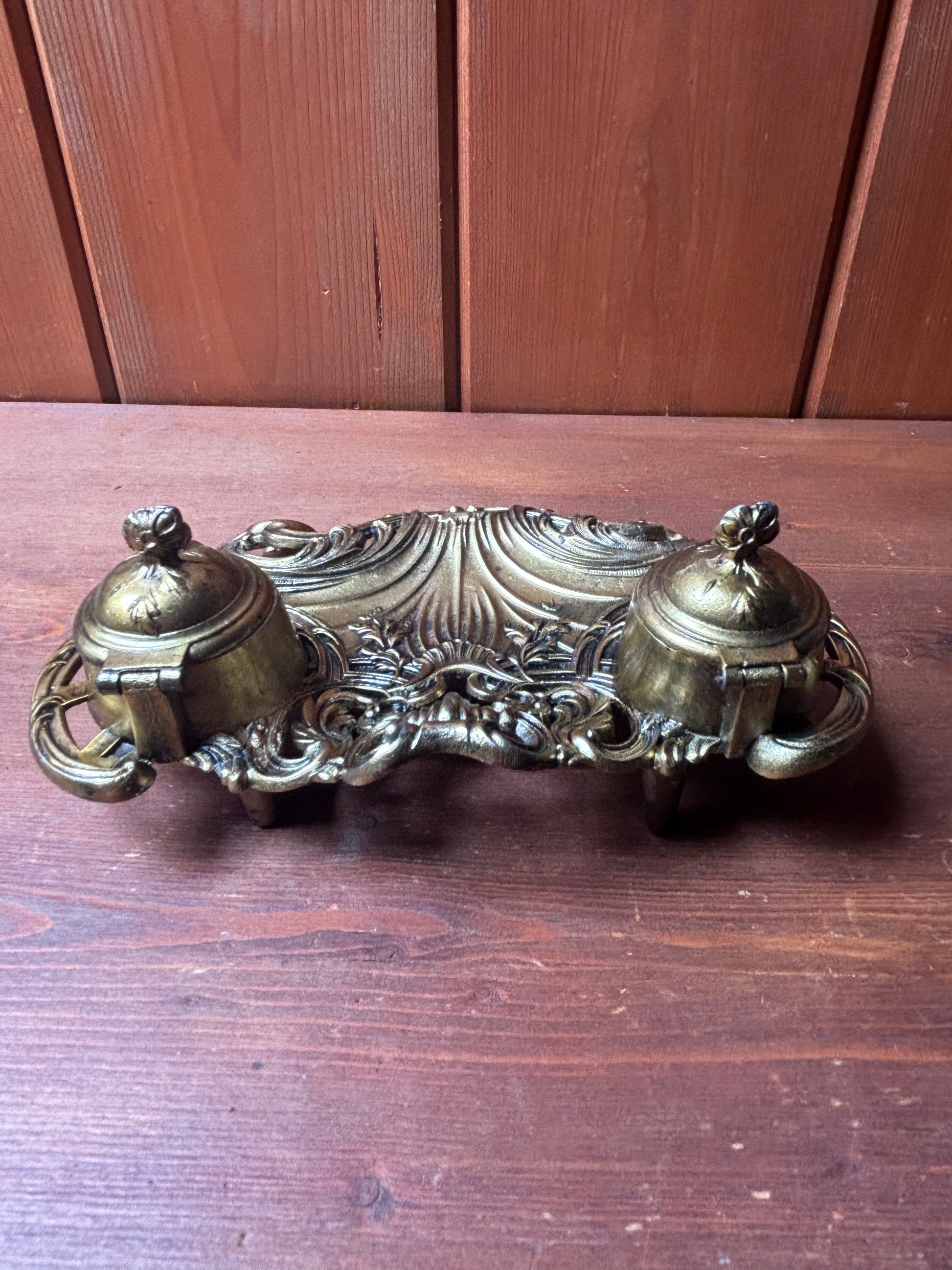 Questo elegante calamaio in metallo dorato con doppia vaschetta in ceramica è un raffinato esempio di oggettistica da scrivania d’epoca, ideale per collezionisti e appassionati di strumenti di scrittura antichi.