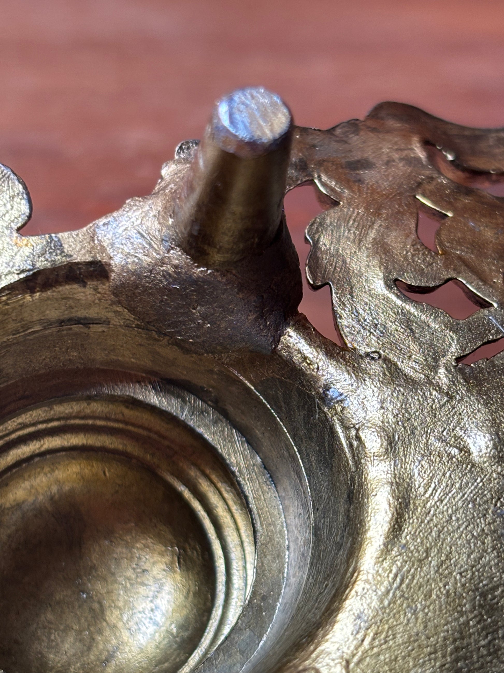 La struttura presenta una patina coerente con l’età e conserva entrambe le vaschette interne in ceramica bianca. Come visibile dalle foto, la parte frontale e uno dei piedini posteriori, originariamente rotti, sono stati riattaccati, un intervento conservativo che mantiene l’integrità estetica del pezzo senza comprometterne la stabilità o il valore decorativo.