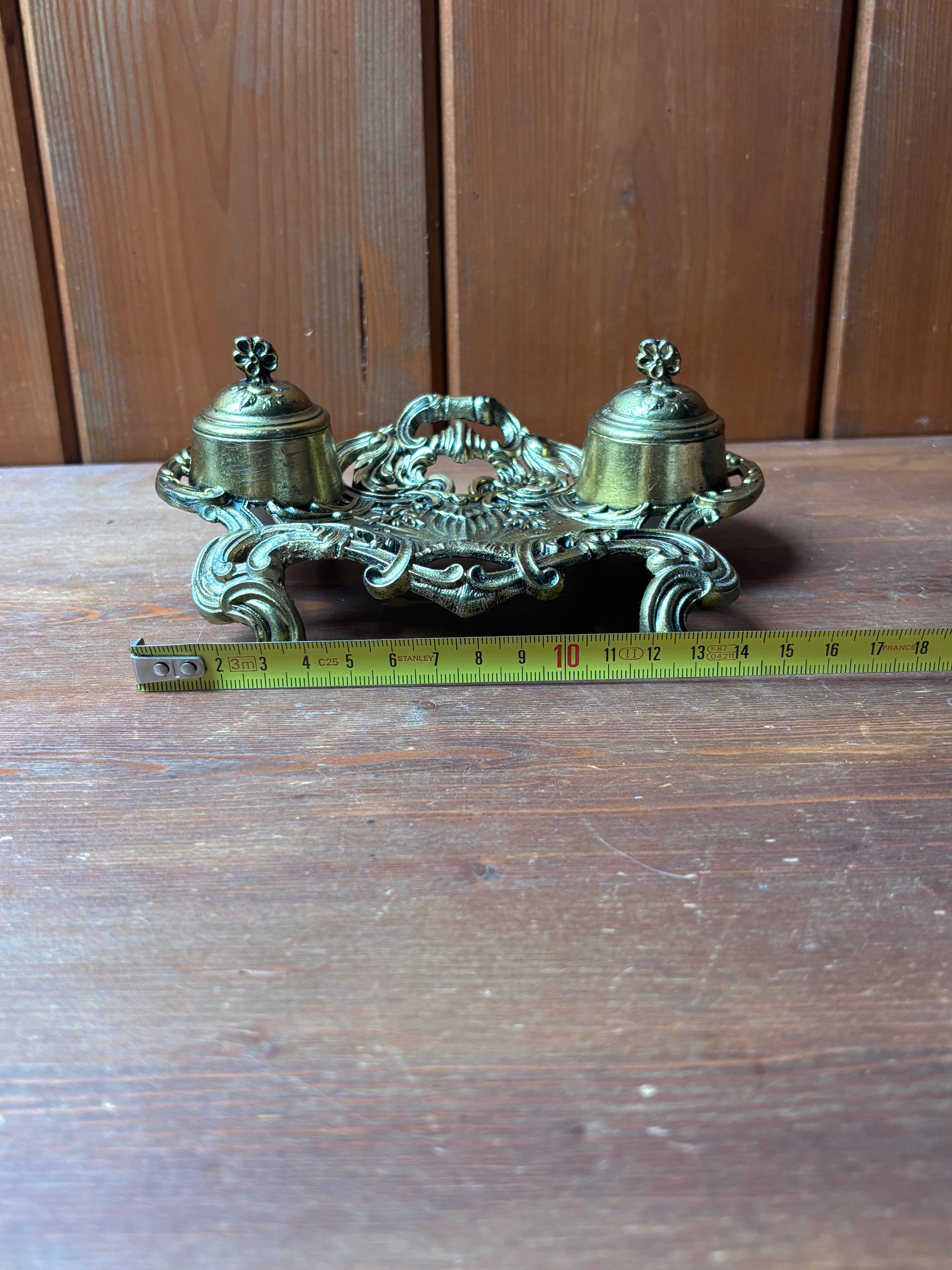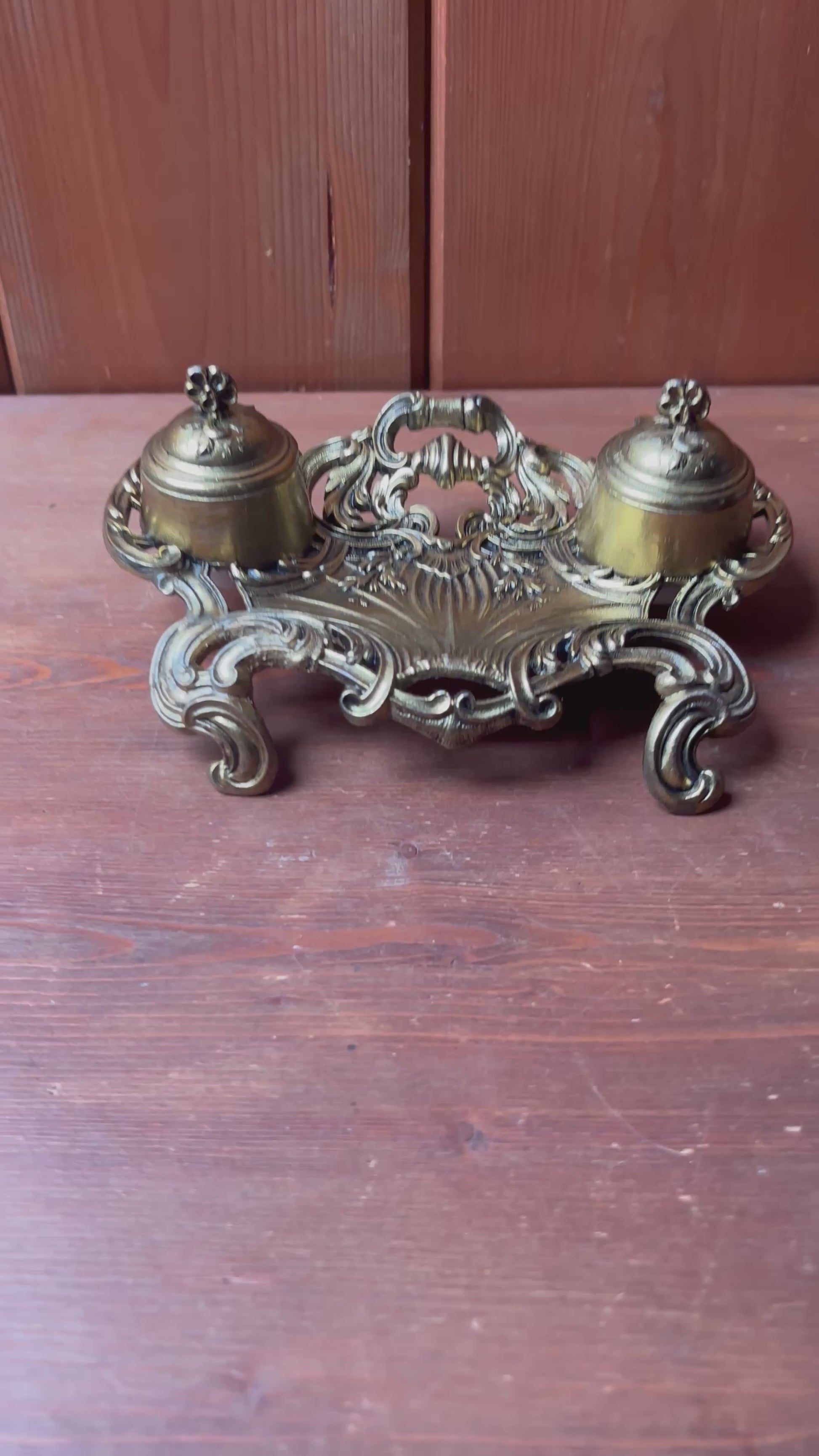 Questo calamaio è ideale per chi cerca desk décor vintage, accessori da scrittura antichi, oggetti in metallo dorato d’epoca o un elemento scenografico capace di aggiungere carattere e storia a qualsiasi ambiente.
