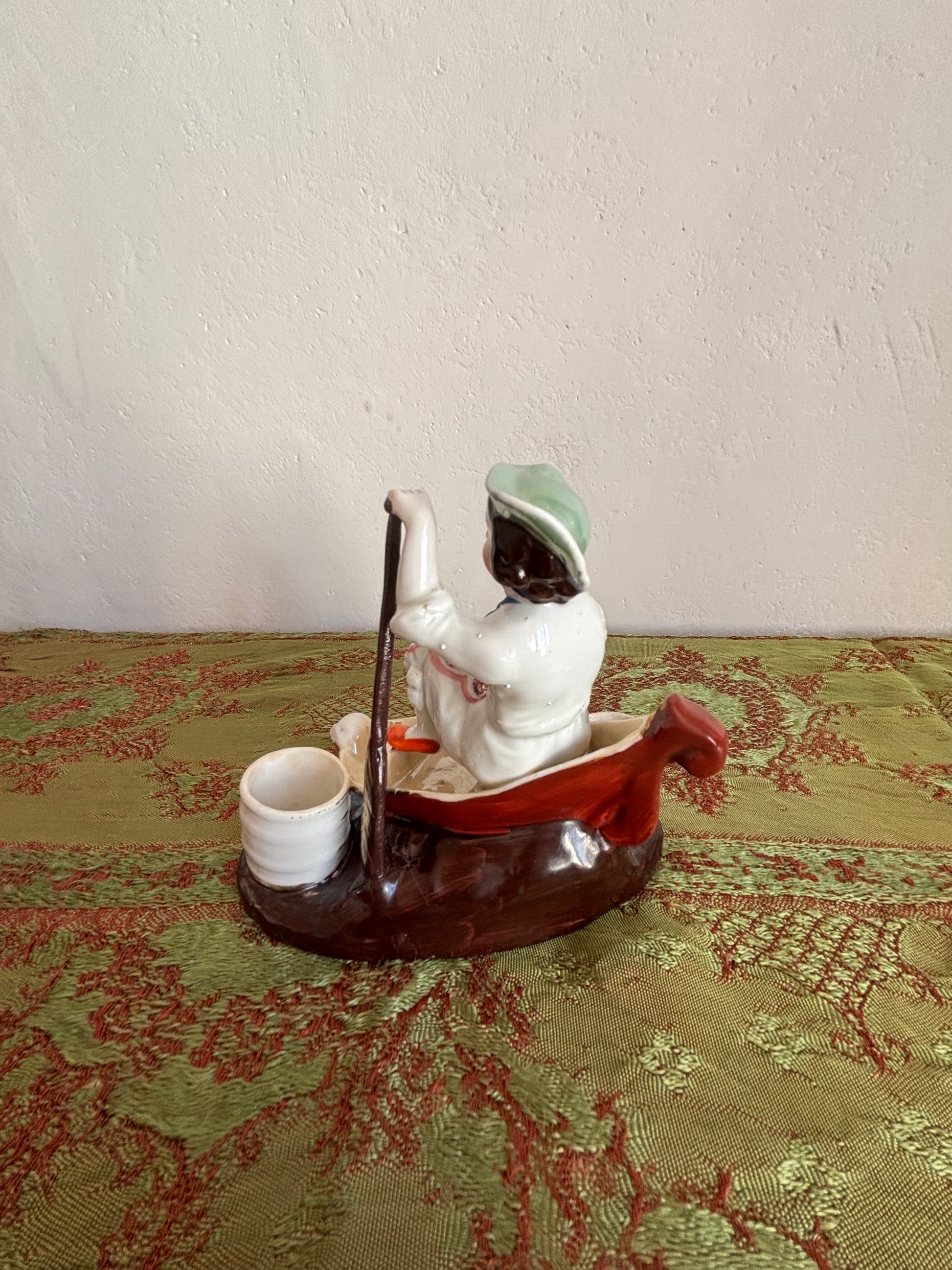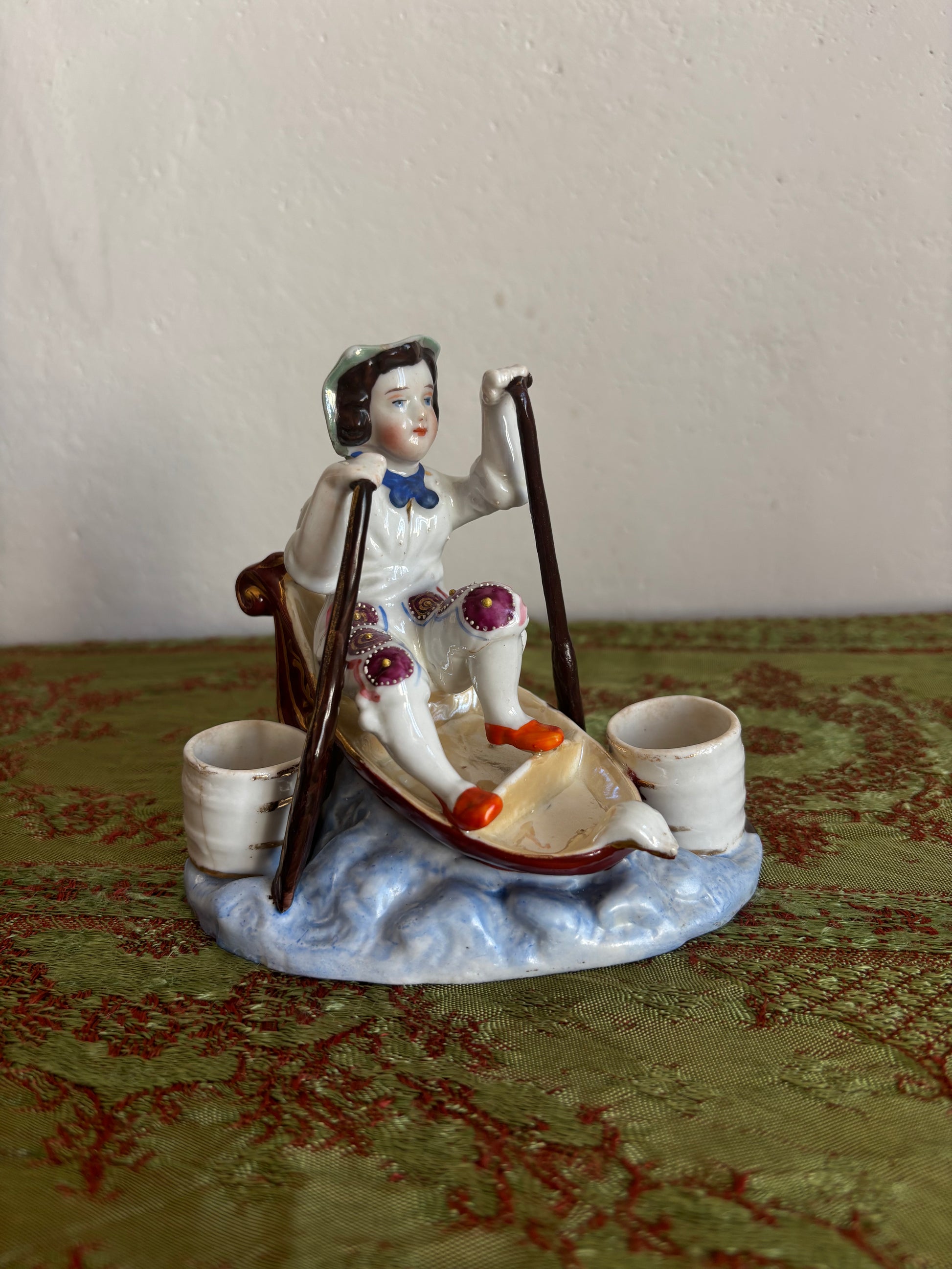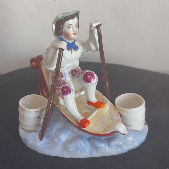 Affascinante calamaio in ceramica, probabilmente risalente alla fine del XIX secolo, realizzato nello stile Vecchia Parigi. Il pezzo raffigura una scena particolare e ricca di fascino: un bambino seduto in una piccola barca mentre rema tra le onde, con ai lati due contenitori circolari destinati all’inchiostro, che un tempo erano dotati di coperchi ormai mancanti.