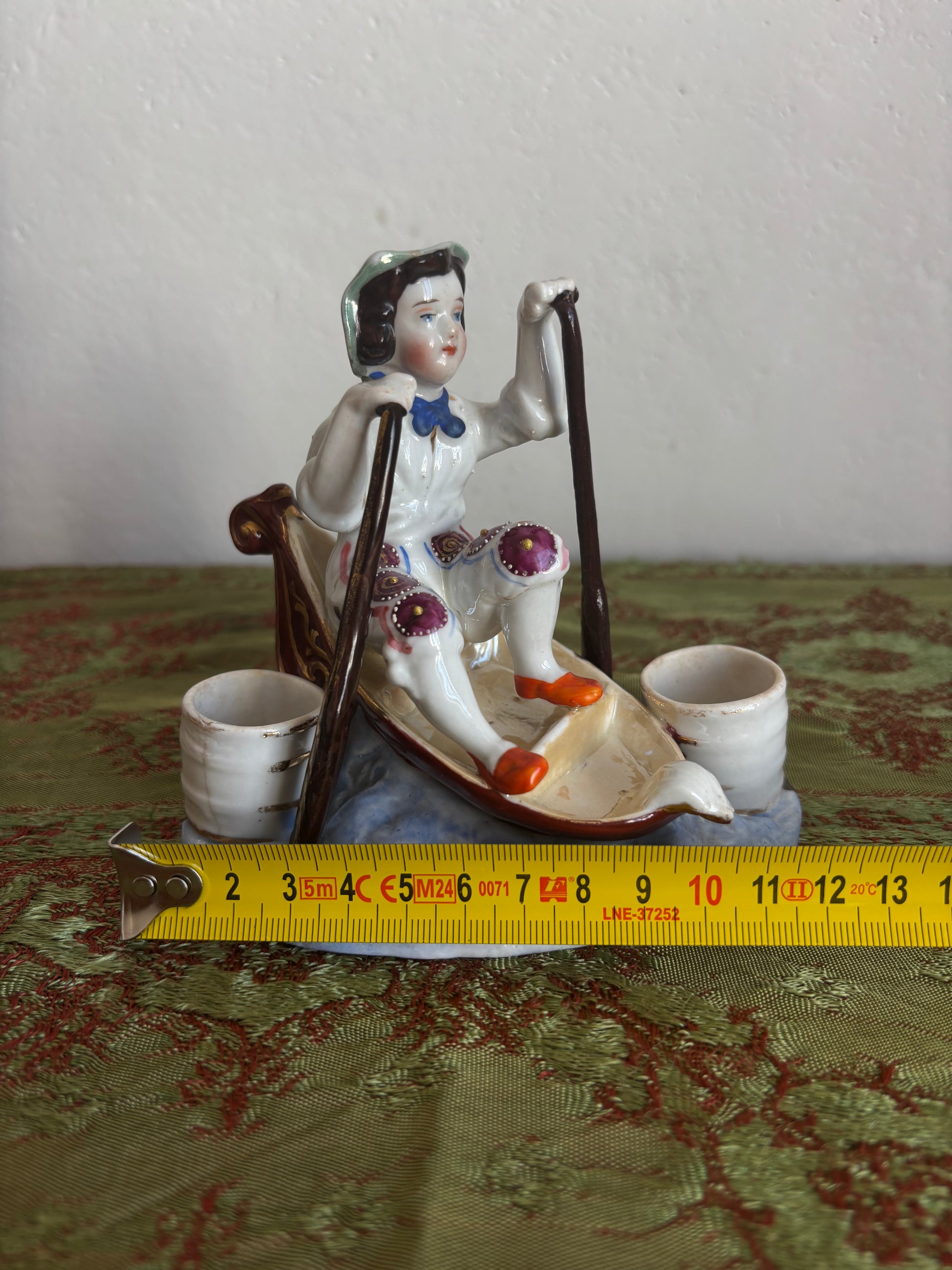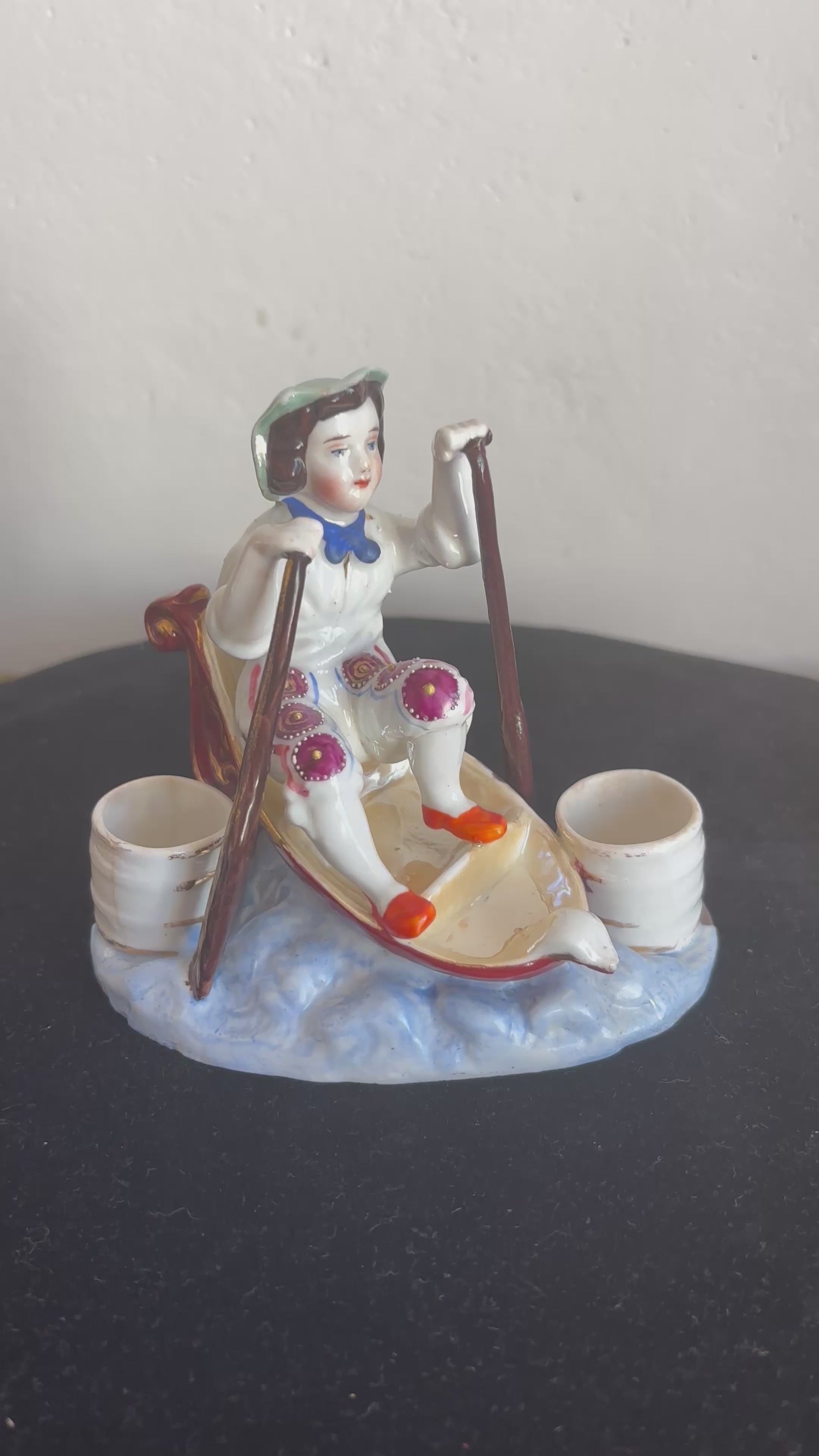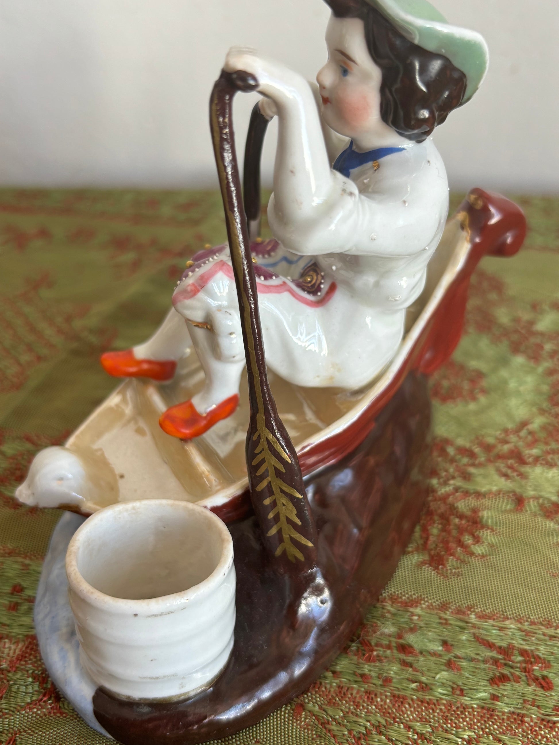 Affascinante calamaio in ceramica, probabilmente risalente alla fine del XIX secolo, realizzato nello stile Vecchia Parigi. Il pezzo raffigura una scena particolare e ricca di fascino: un bambino seduto in una piccola barca mentre rema tra le onde, con ai lati due contenitori circolari destinati all’inchiostro, che un tempo erano dotati di coperchi ormai mancanti.