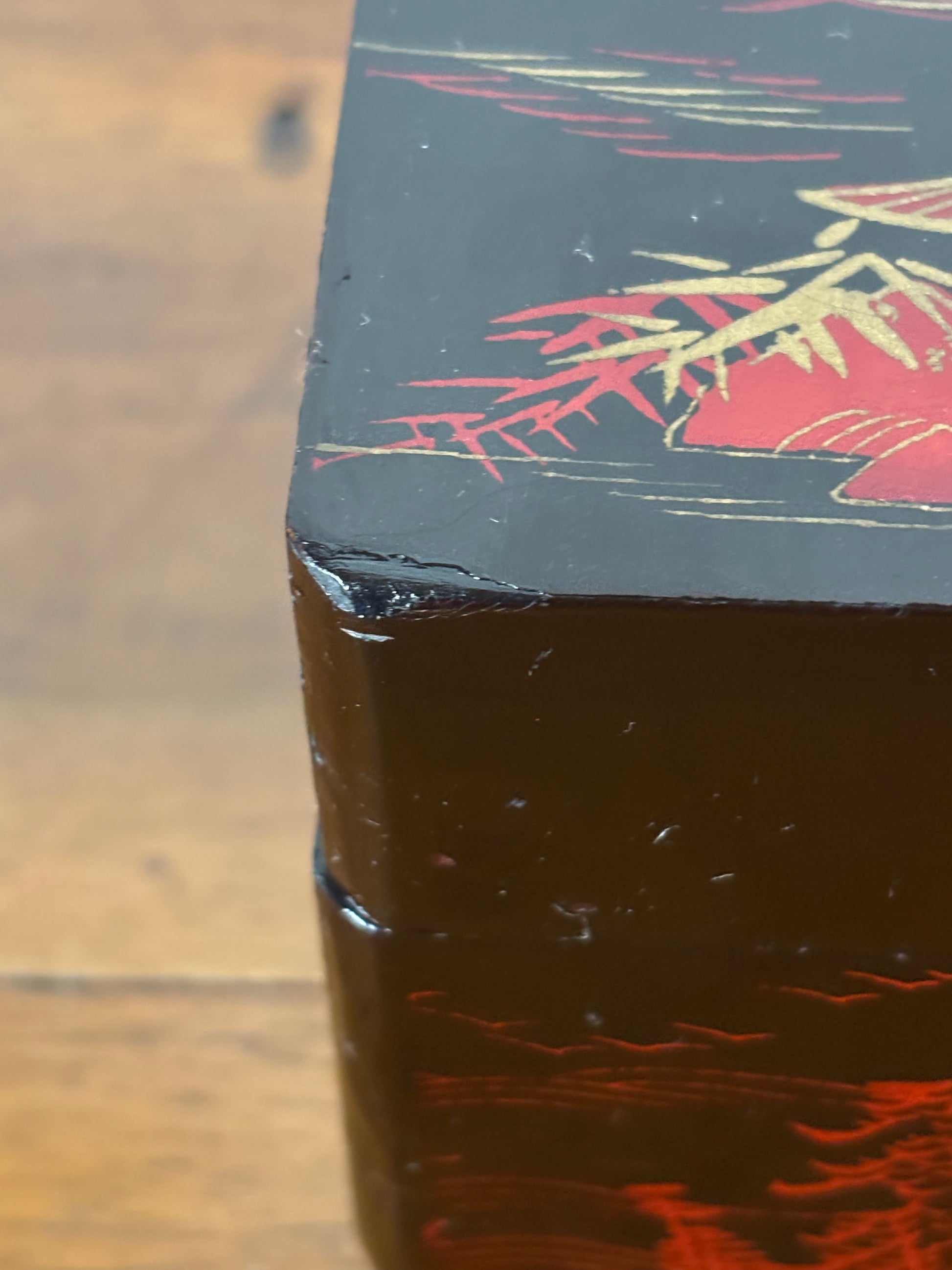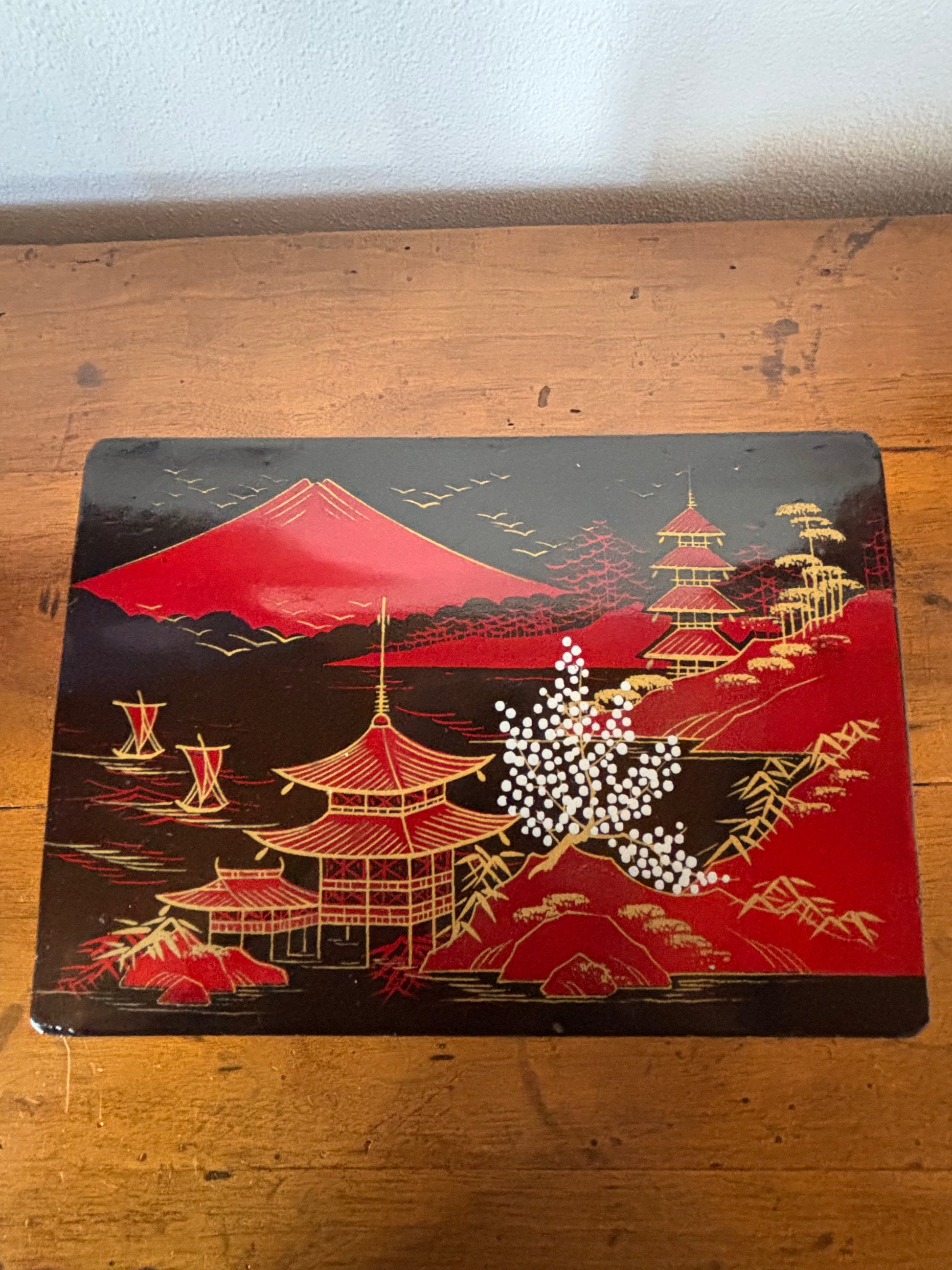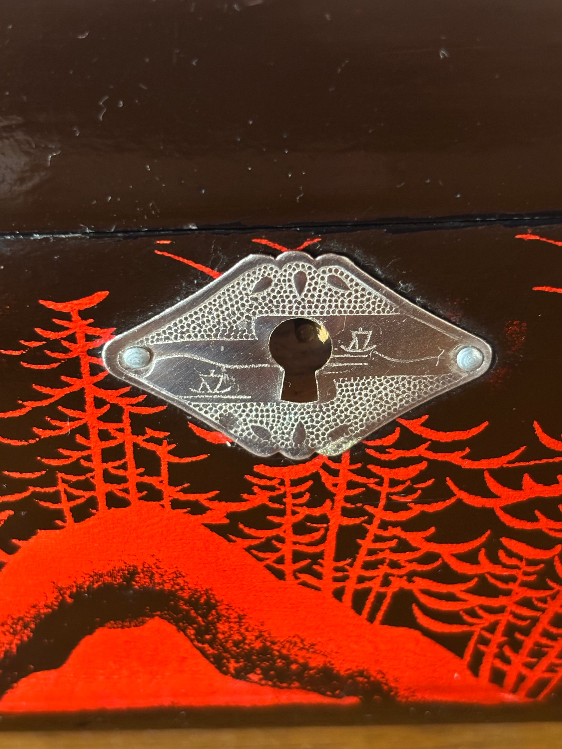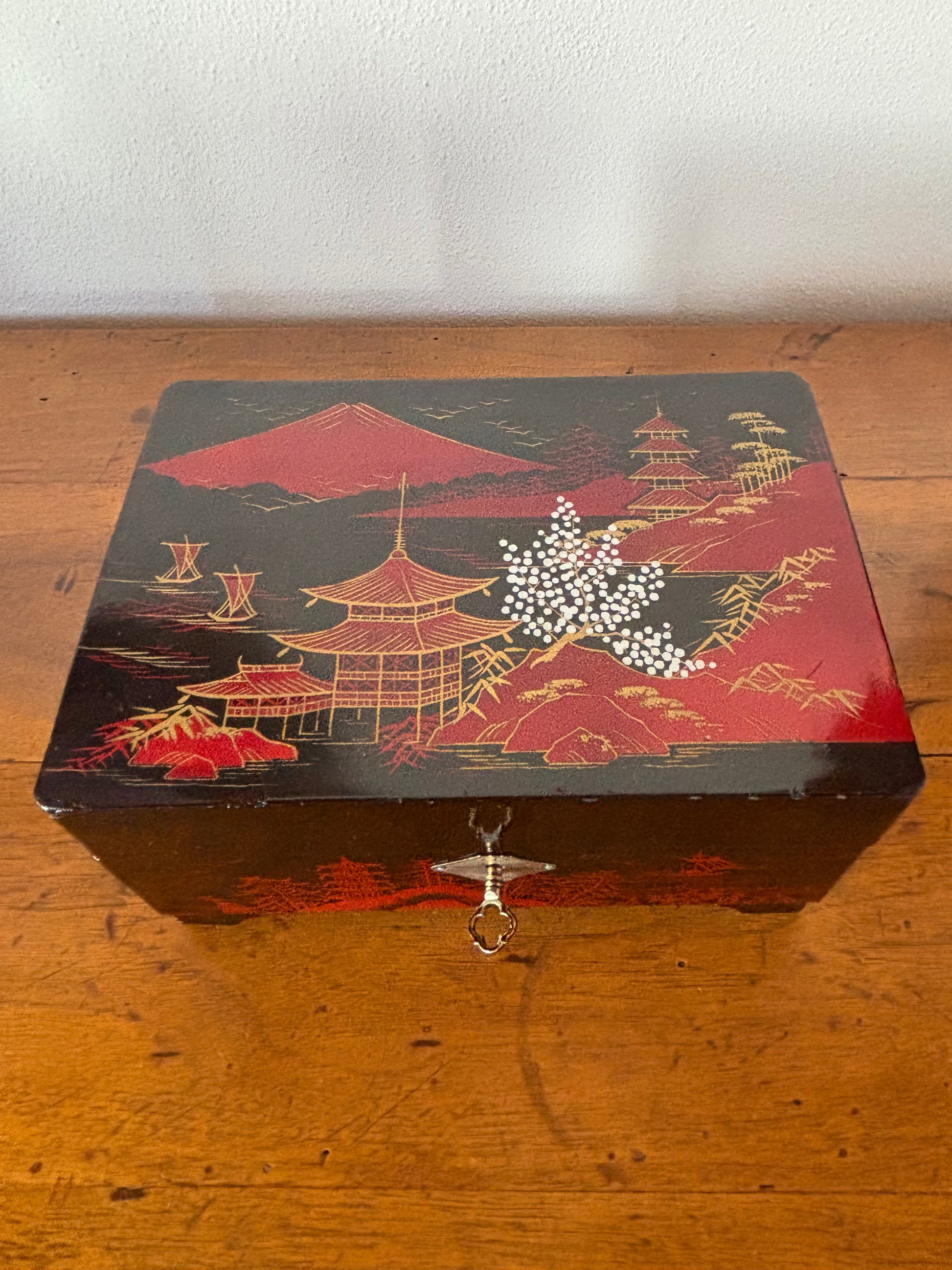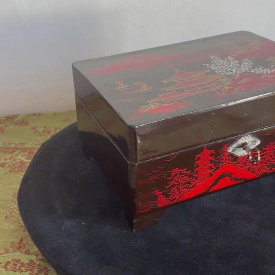 Elegante carillon vintage in legno laccato, impreziosito da delicate decorazioni orientali a tema paesaggistico. Il fondo nero lucido è arricchito da motivi dorati e rossi che raffigurano pagode, ponti e barche immersi in un suggestivo paesaggio montano, mentre dettagli floreali in rilievo donano profondità e un tocco poetico alla scena. Sul coperchio spicca un raffinato grappolo di piccole perle bianche, evocando la delicatezza dei fiori di ciliegio.