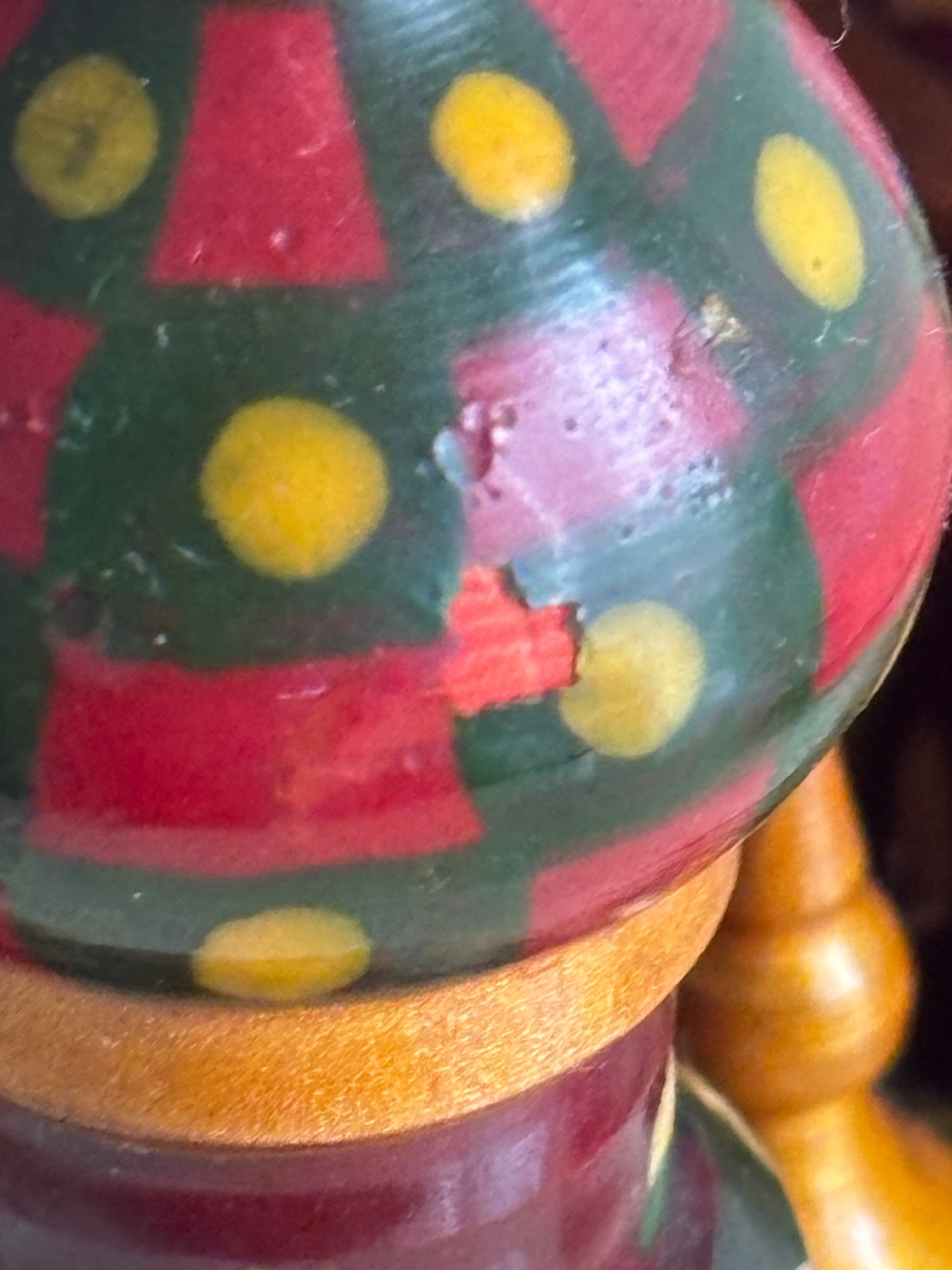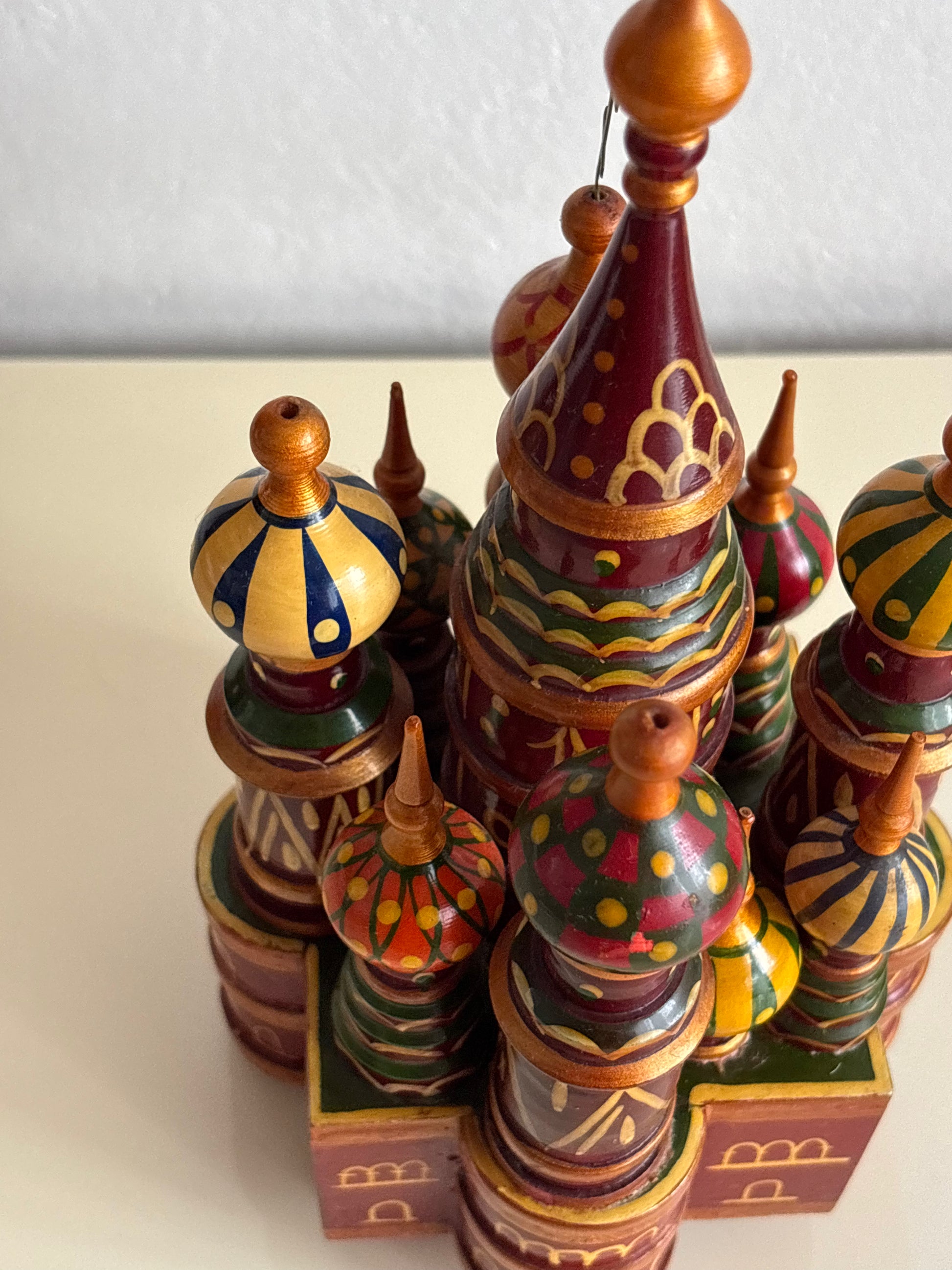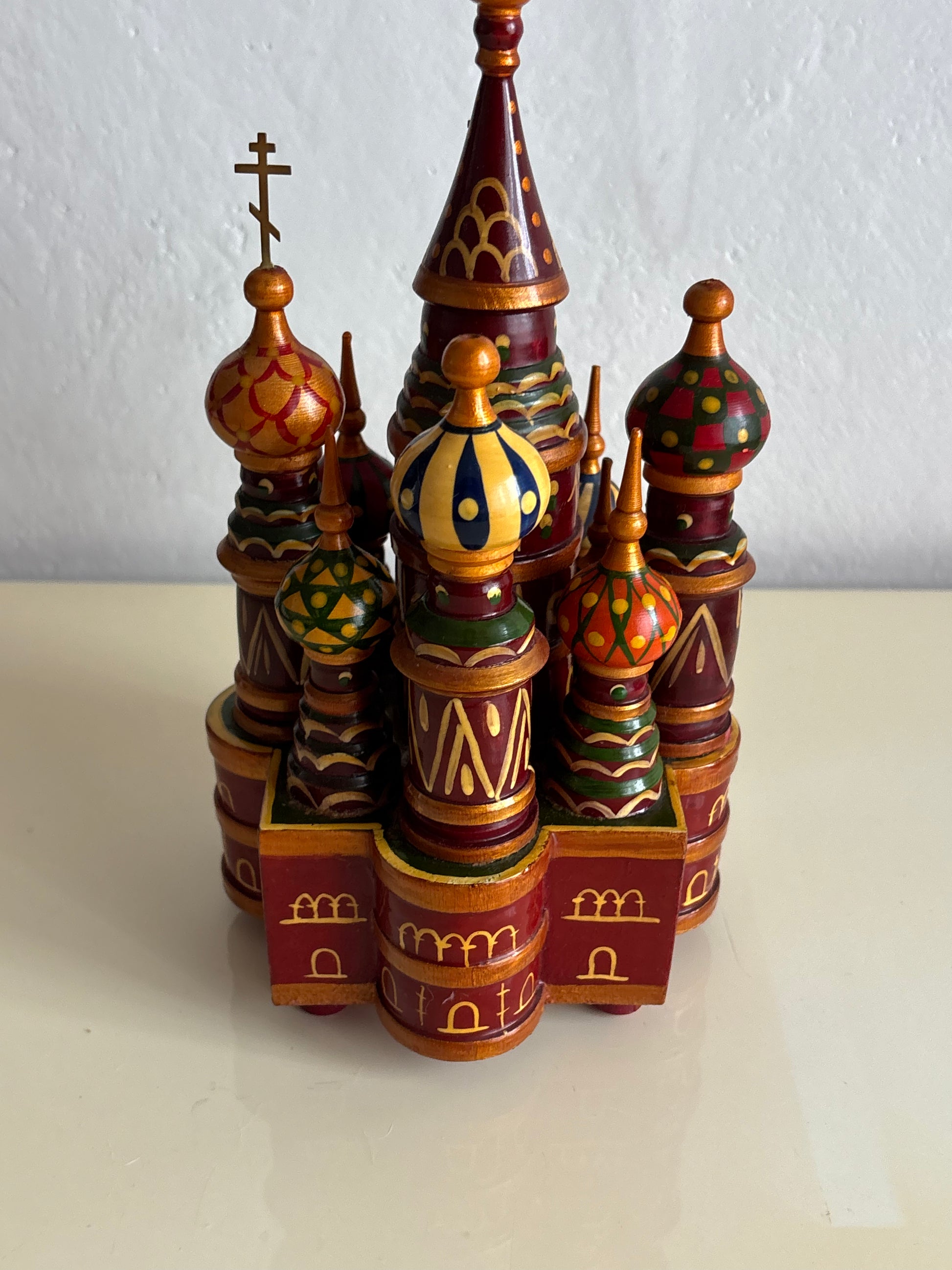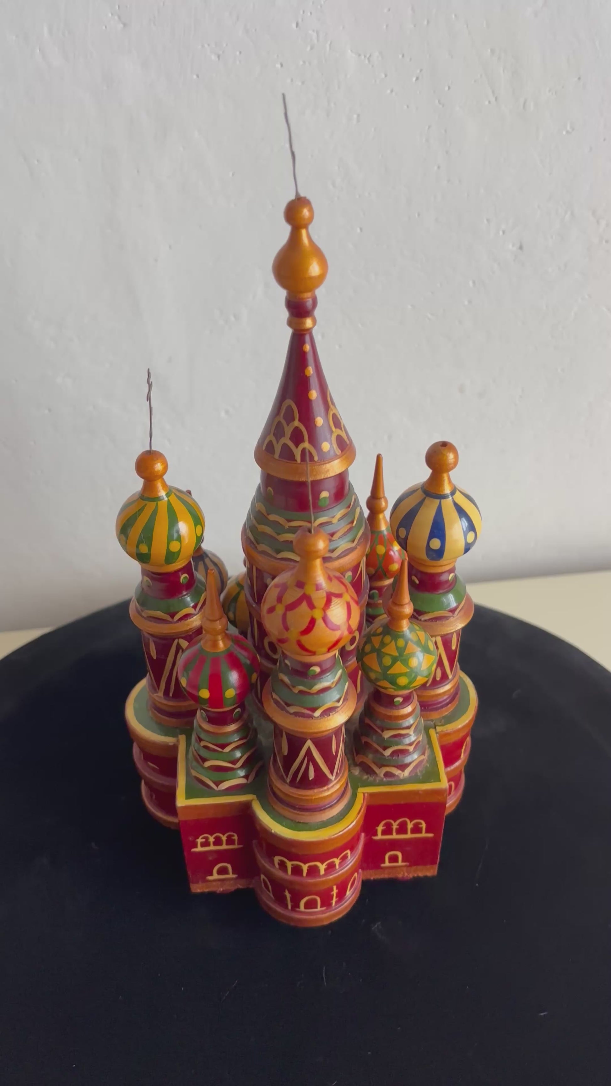 Il carillon è in buone condizioni generali e mantiene un’ottima resa estetica grazie alla brillantezza delle vernici e alla cura dei dettagli. Mancano due croci sulle sommità di altrettante cupole, una mancanza che non compromette la stabilità né il funzionamento dell’oggetto. Su un piccolo punto la pittura si è leggermente scrostata, come visibile in foto, ma si tratta di un dettaglio minimo che non incide sull’impatto estetico complessivo.