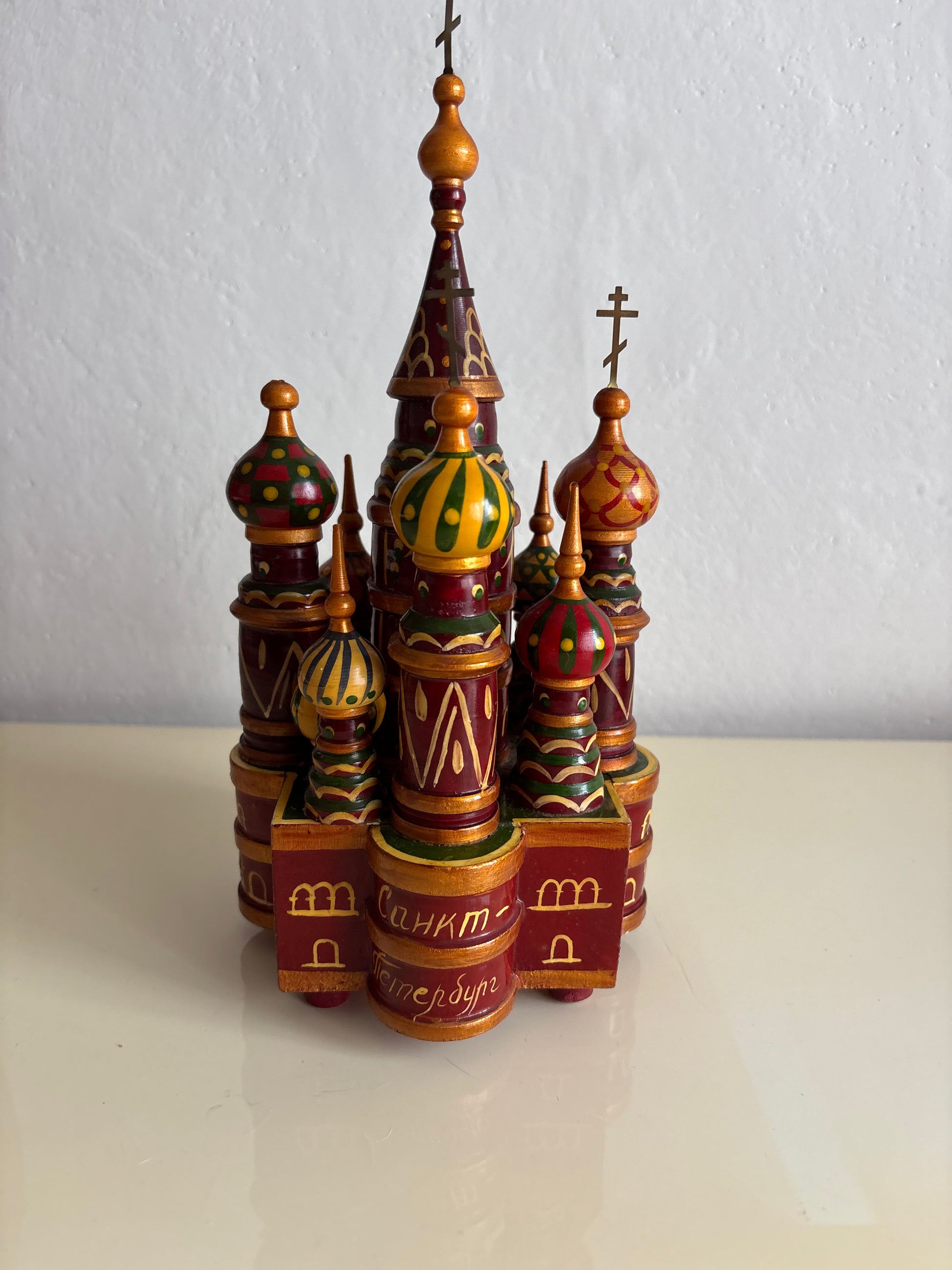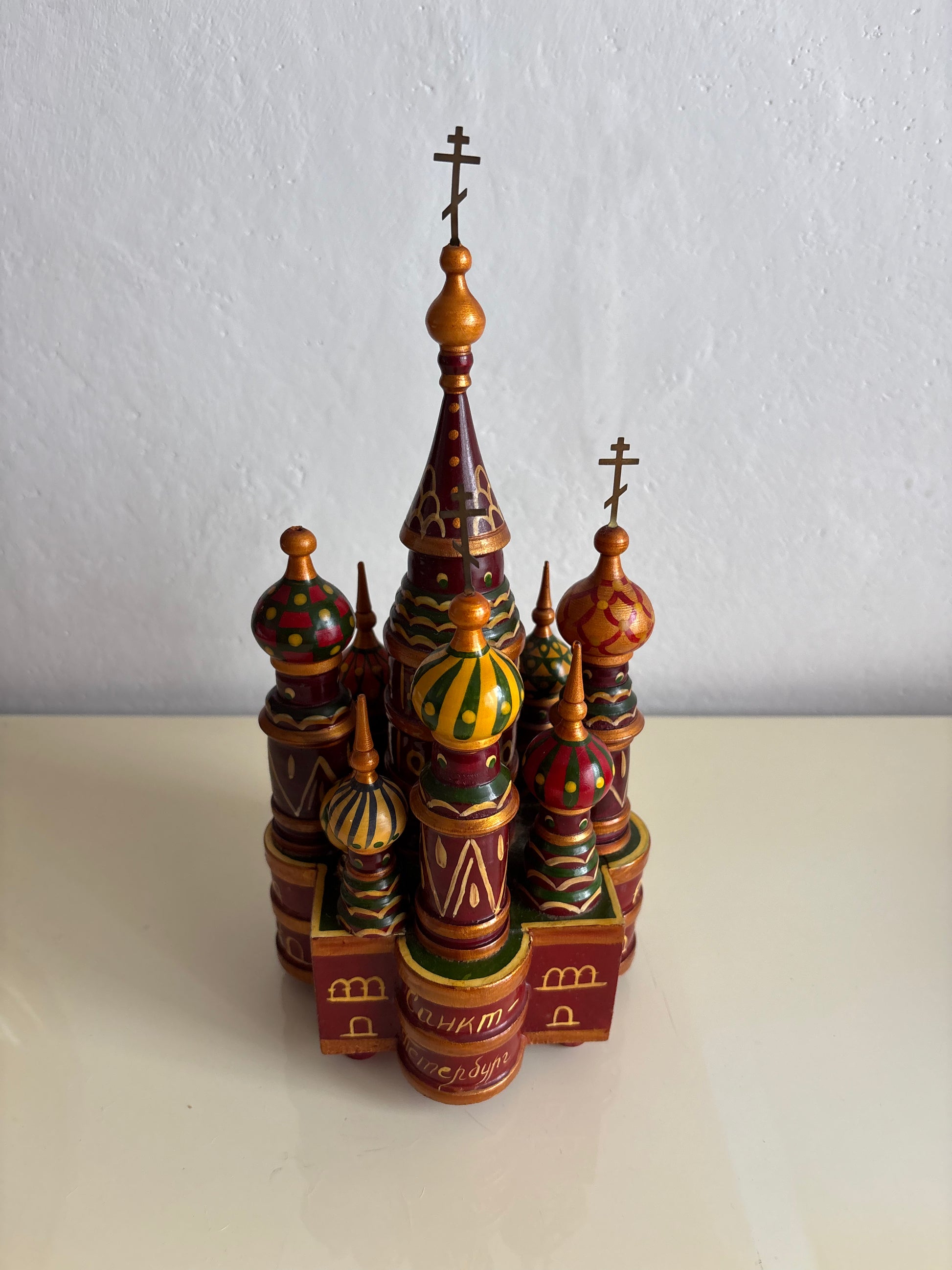 Questo carillon souvenir di San Pietroburgo è un raffinato oggetto decorativo in legno e caratterizzato da colori vivaci, cupole ornamentali e dettagli pittorici che richiamano l’architettura iconica della città. La base riporta la scritta in cirillico “Санкт-Петербург”, elemento che ne conferma l’origine come souvenir tradizionale.