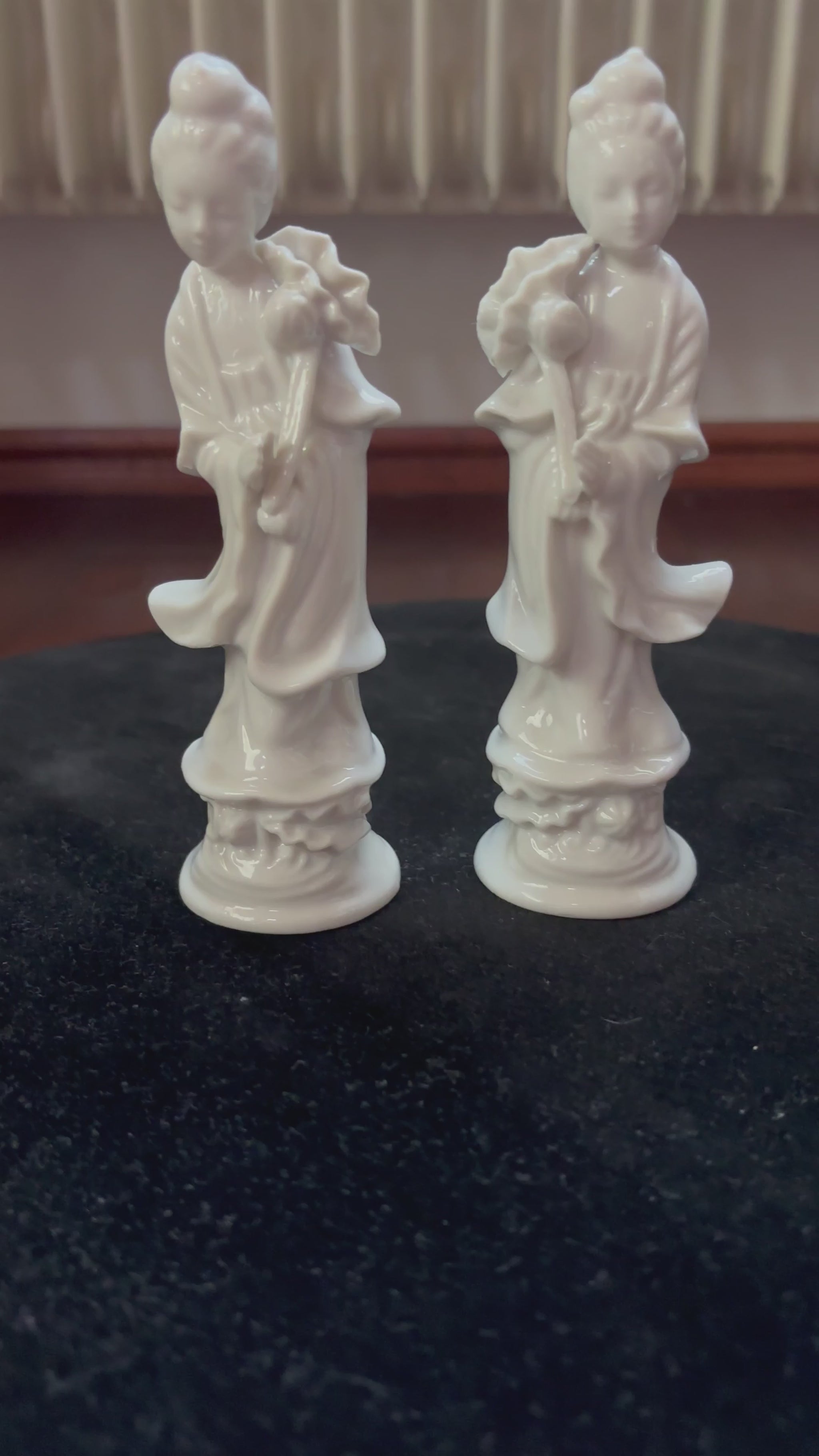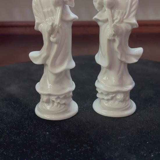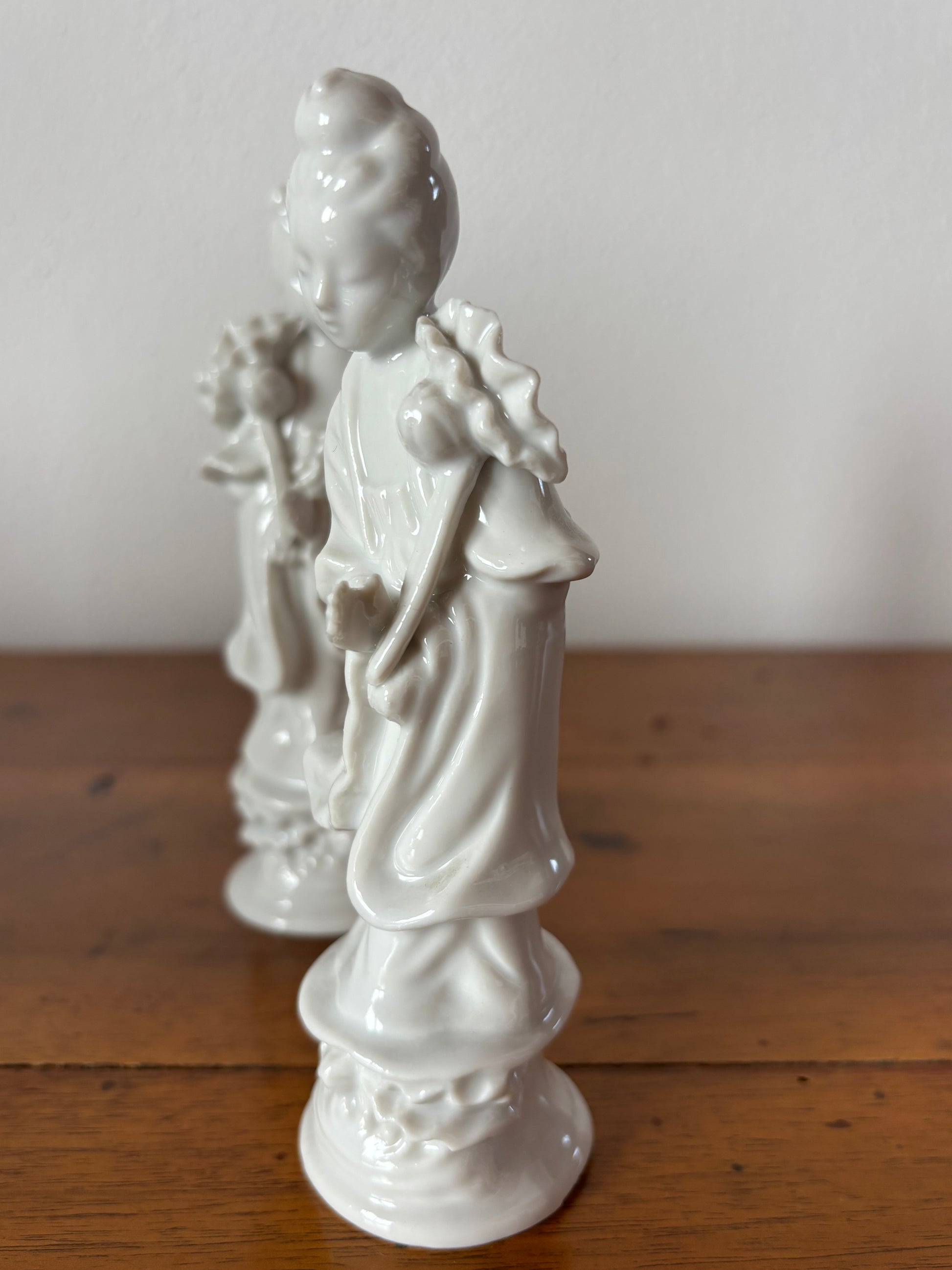 Coppia di Statuette in Porcellana Bianca – Dea Quan Yin con Fiore di Loto