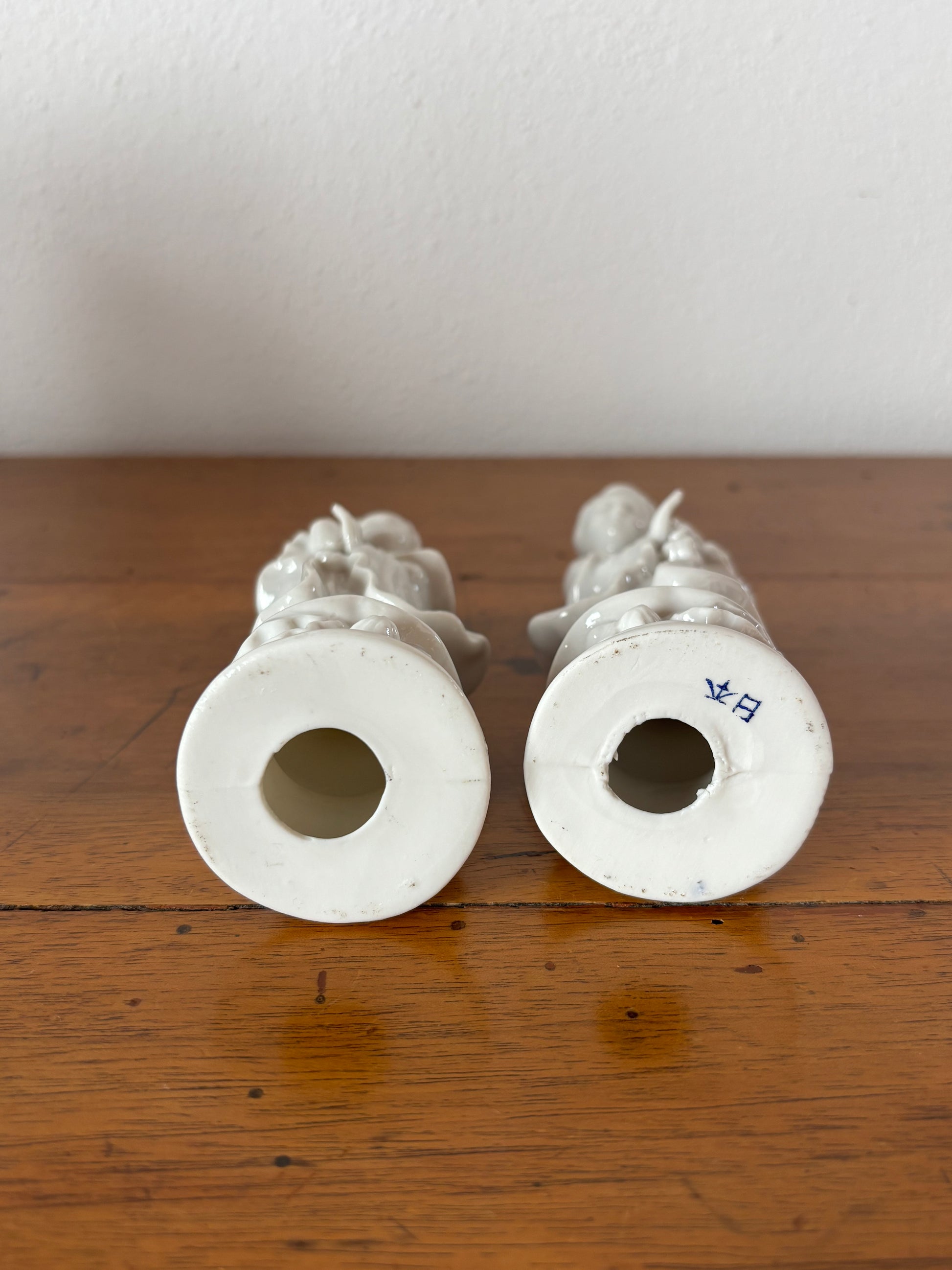 La finitura lucida valorizza ogni dettaglio, dalle pieghe fluide delle vesti alle espressioni pacate, conferendo al pezzo un’eleganza senza tempo. Le basi ornate richiamano il movimento dell’acqua, amplificando il senso di quiete e spiritualità che la figura incarna. Le statuette sono perfettamente conservate, prive di restauri o imperfezioni, e si presentano come un raffinato complemento d’arredo o come prezioso elemento da collezione per chi ama l’arte orientale e la porcellana di pregio. La loro simmetria e la qualità della lavorazione le rendono particolarmente adatte a spazi meditativi o ambienti dal gusto classico e contemplativo.