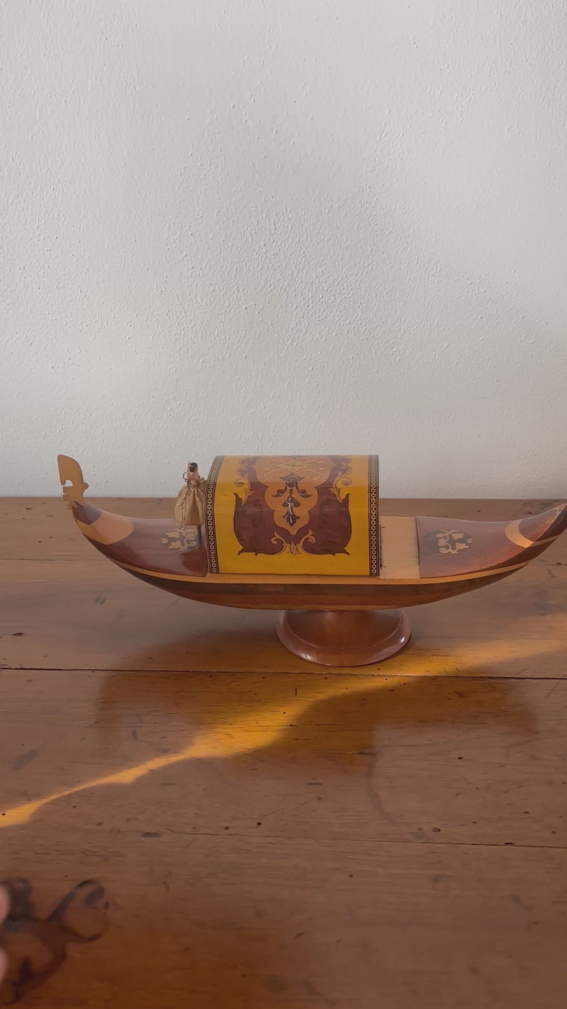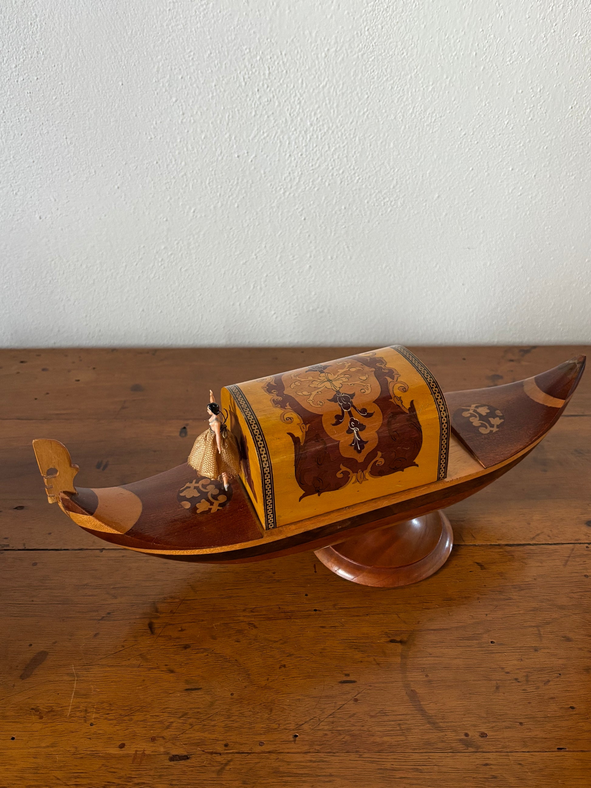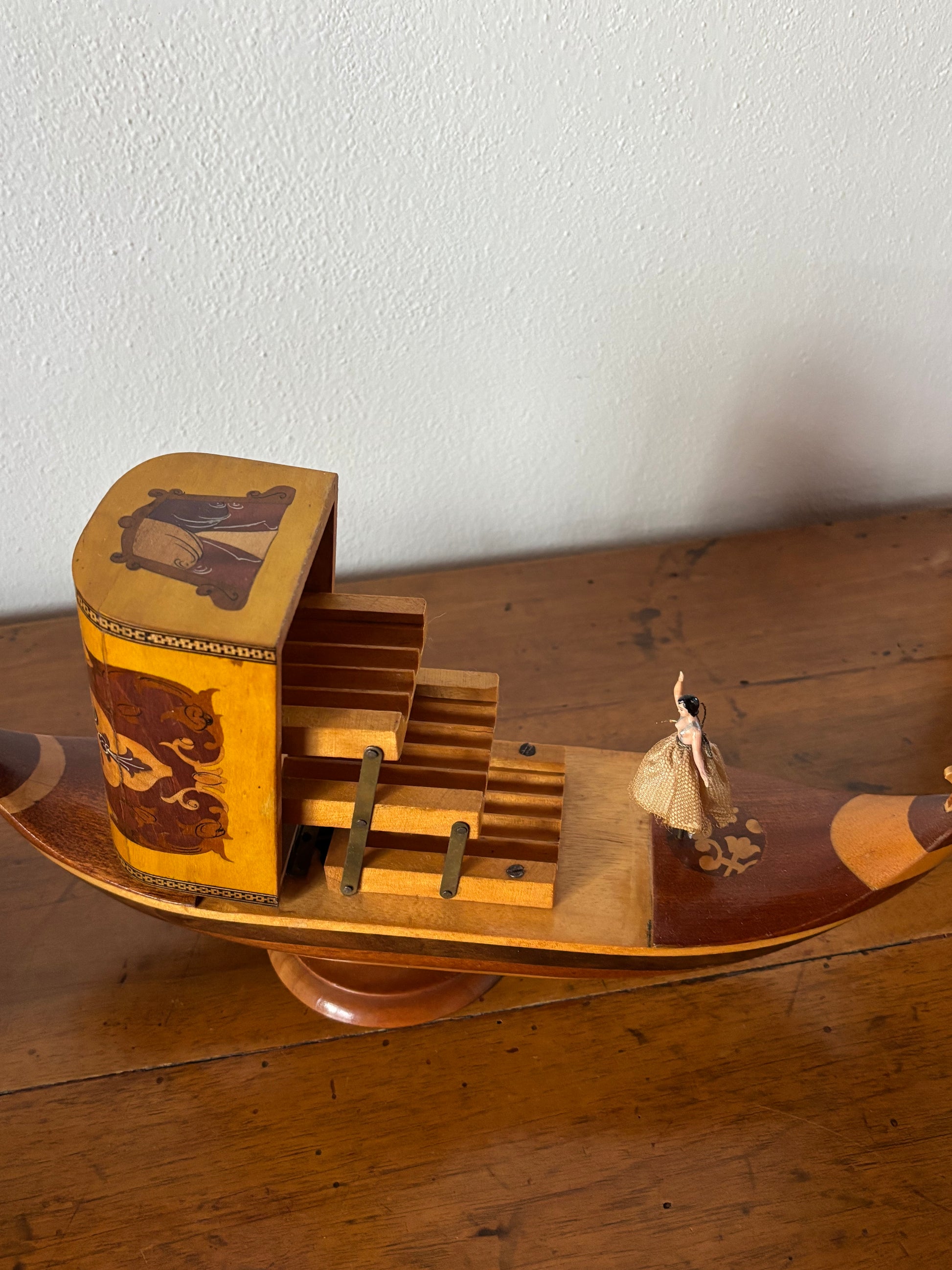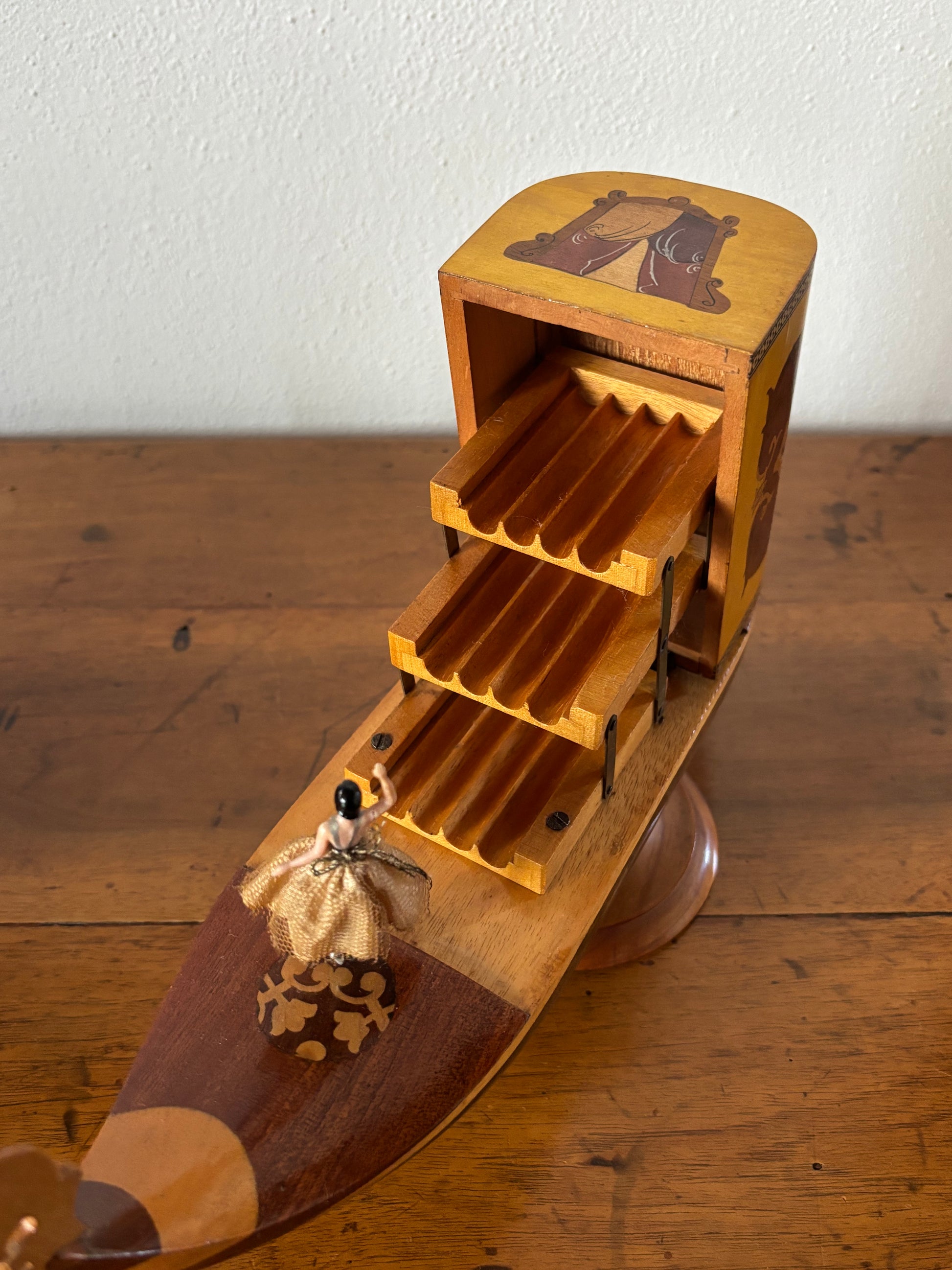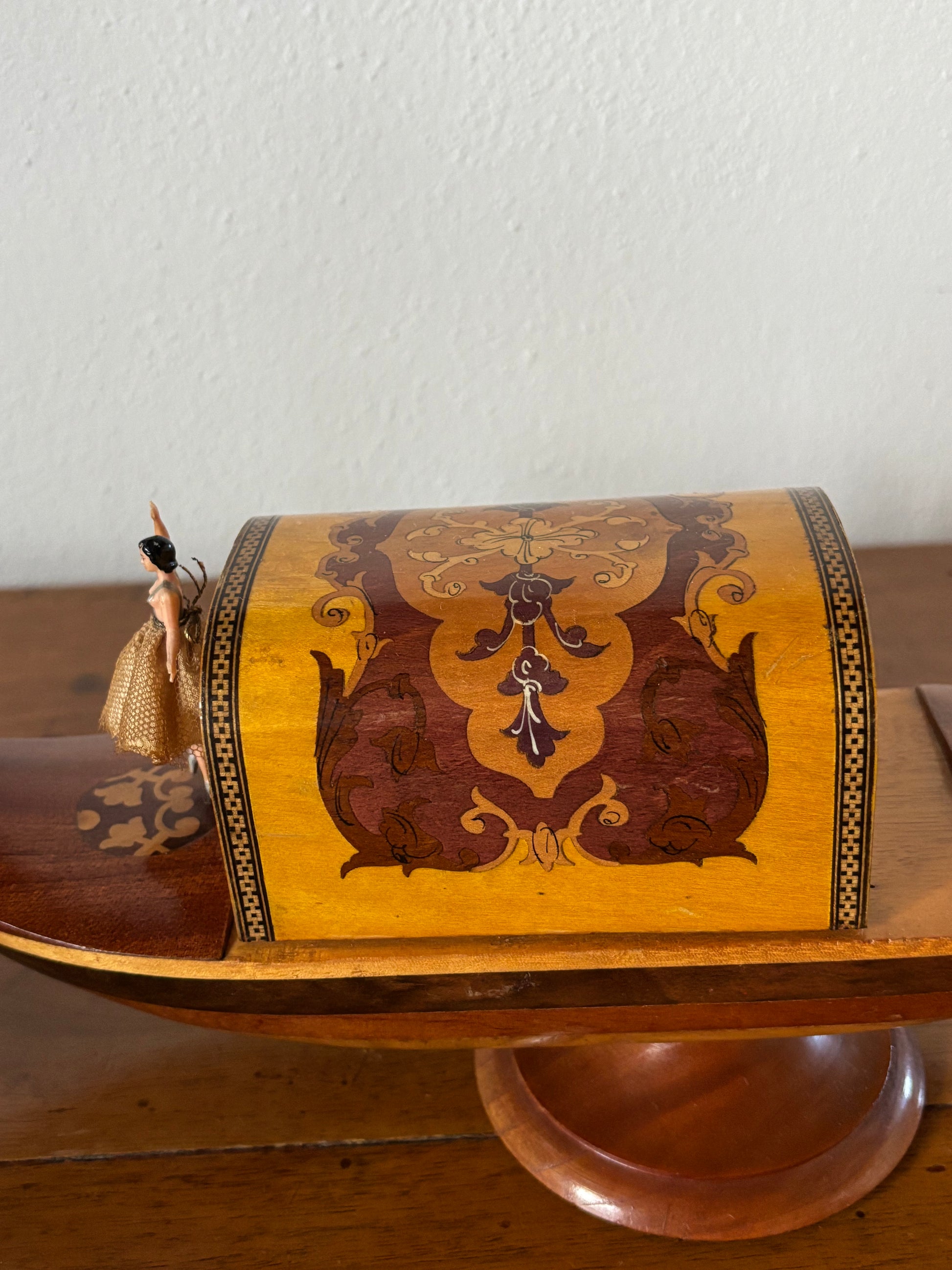 Raffinata gondola portasigarette in legno, dotata di carillon musicale e ballerina danzante, perfetta come oggetto da collezione o elemento decorativo per ambienti classici e nostalgici.
