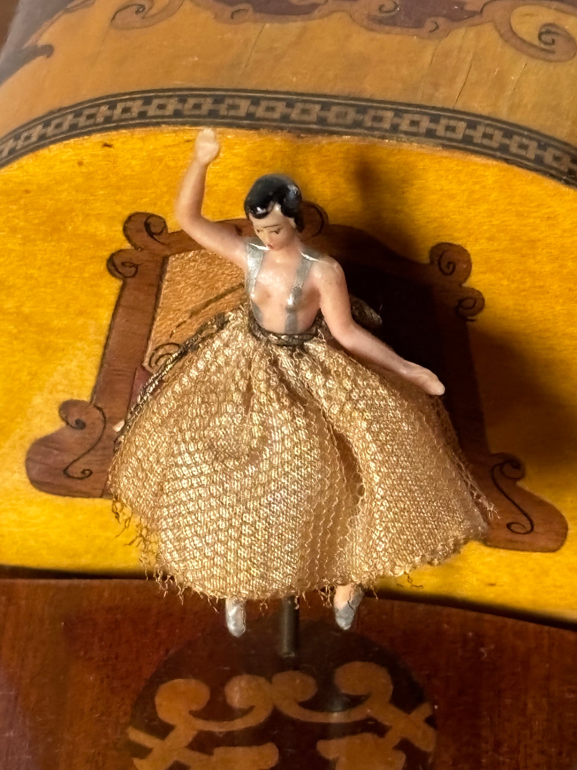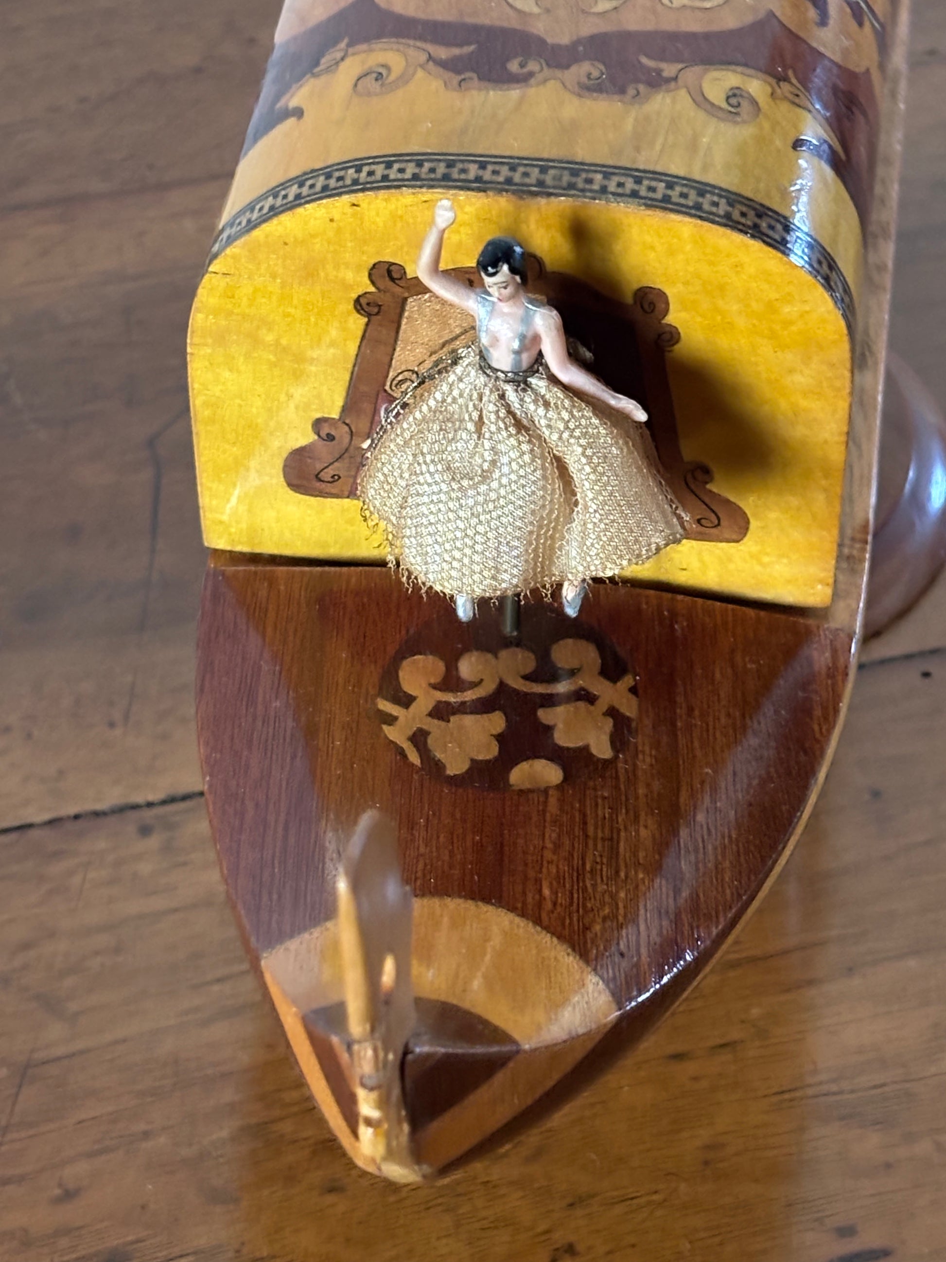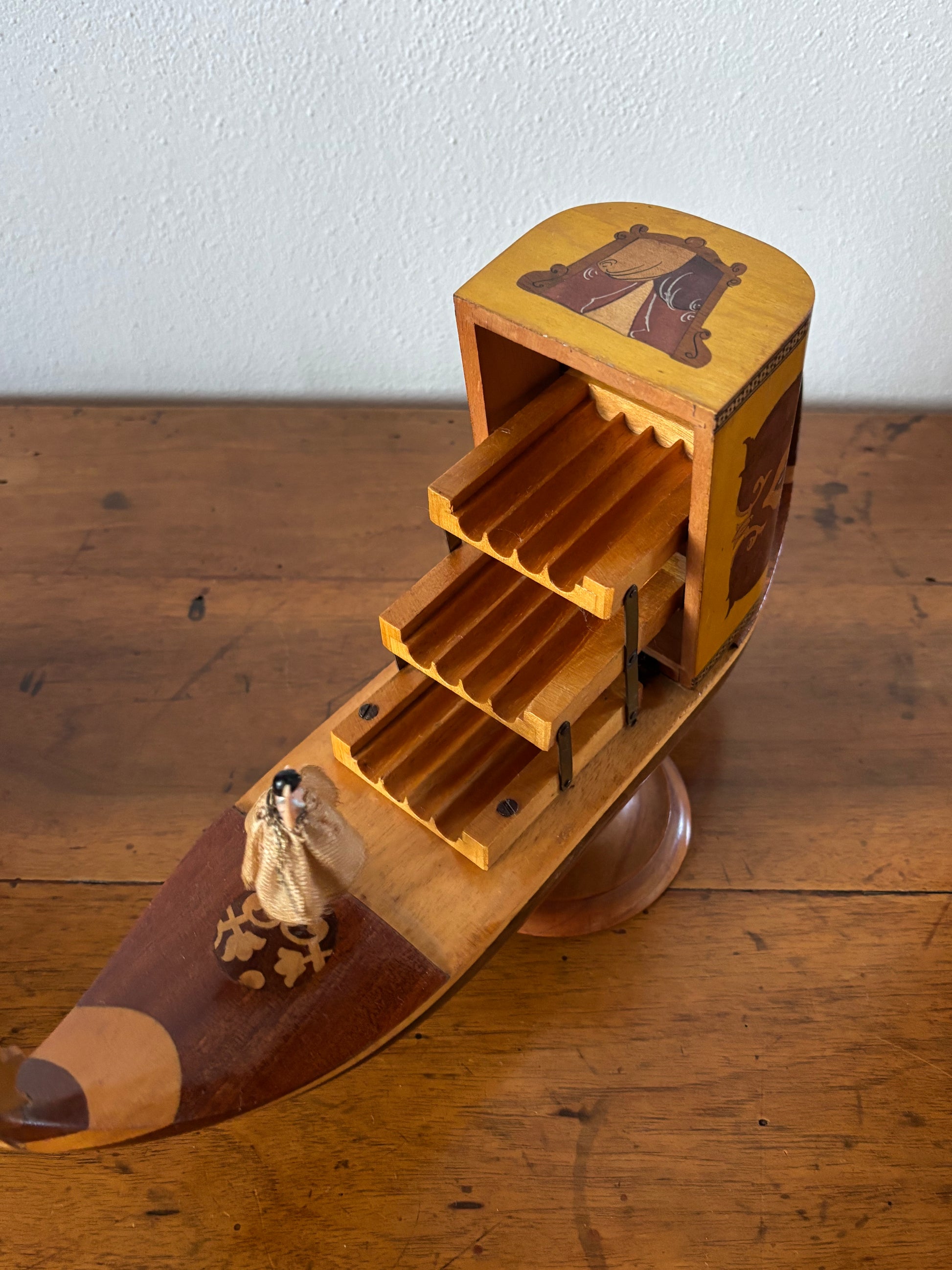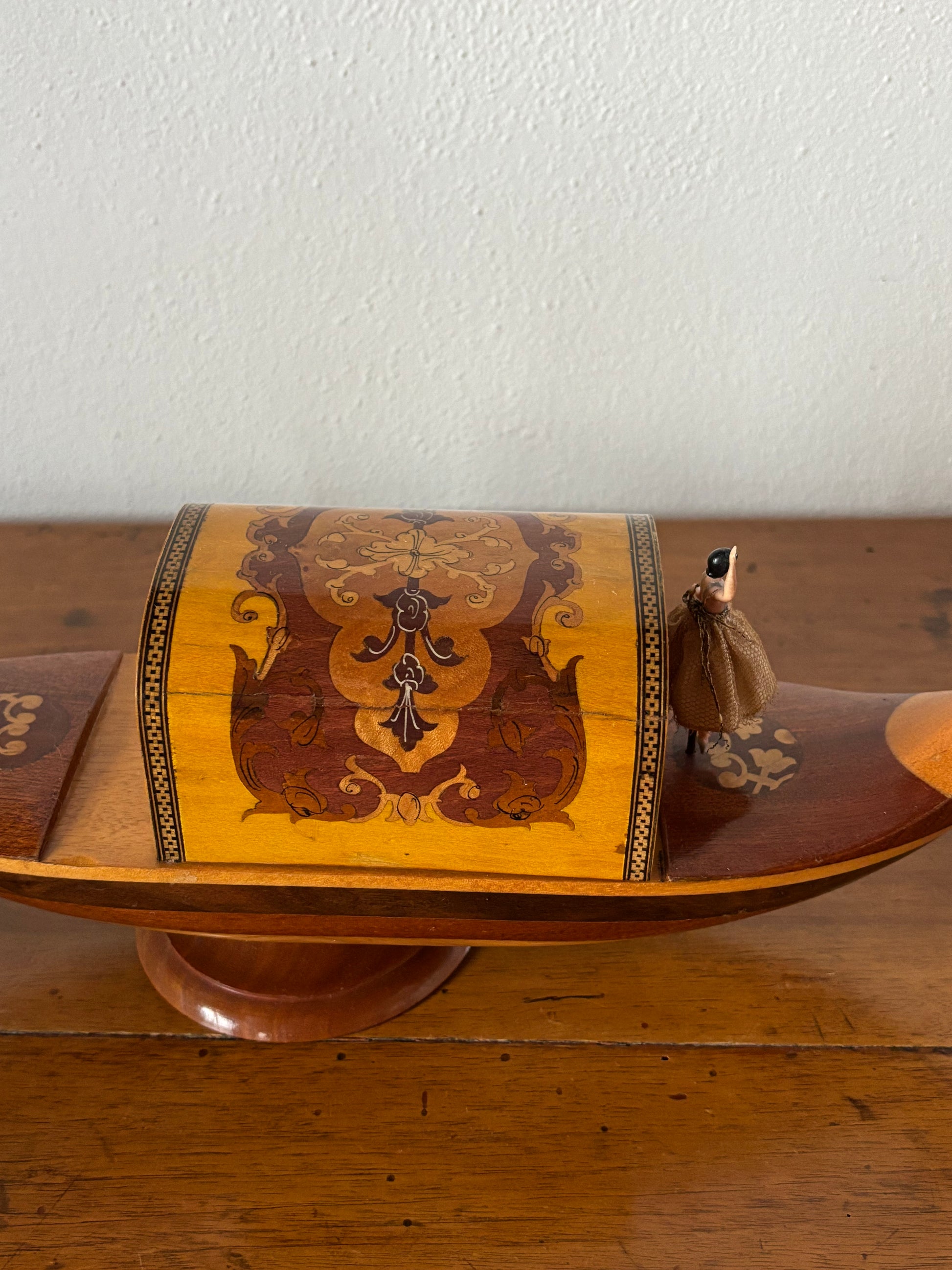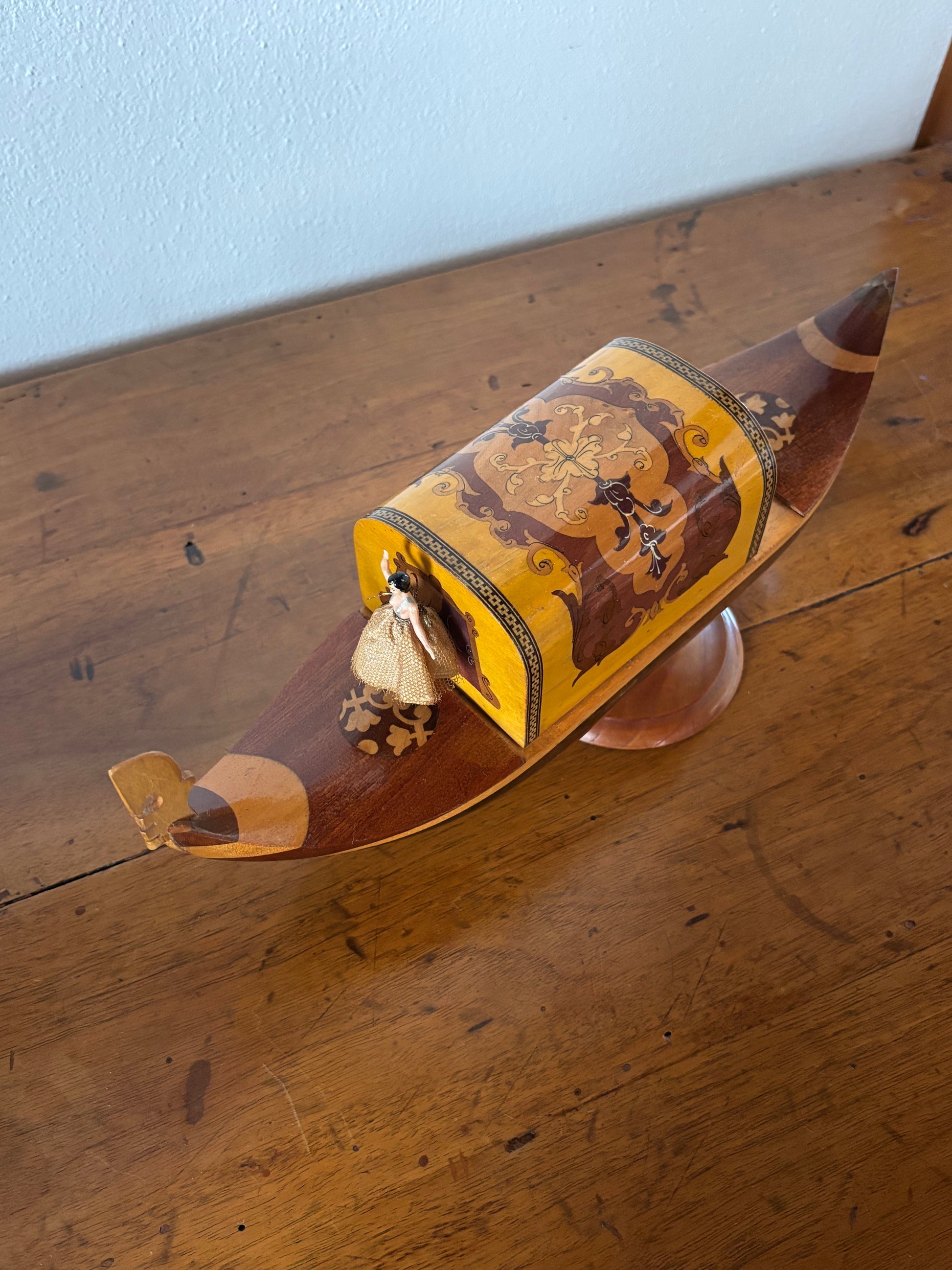 Raffinata gondola portasigarette in legno, dotata di carillon musicale e ballerina danzante, perfetta come oggetto da collezione o elemento decorativo per ambienti classici e nostalgici.