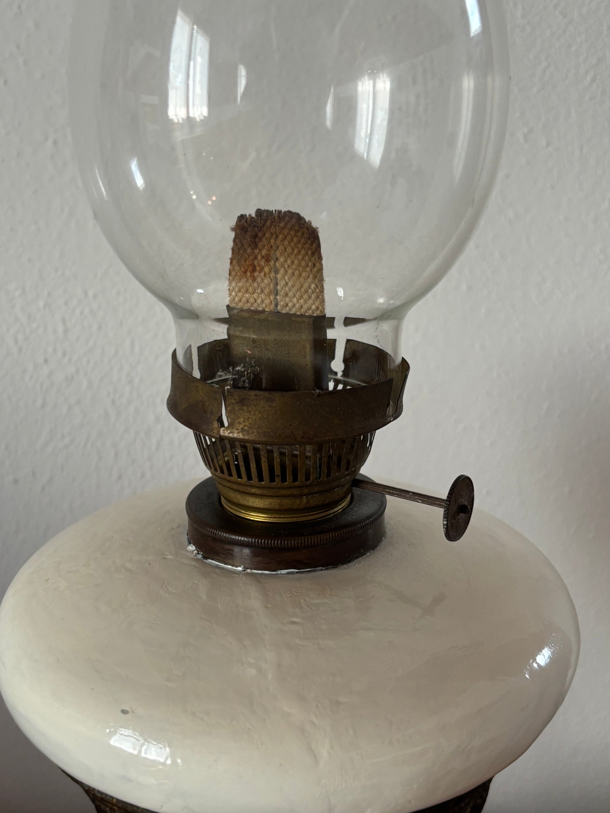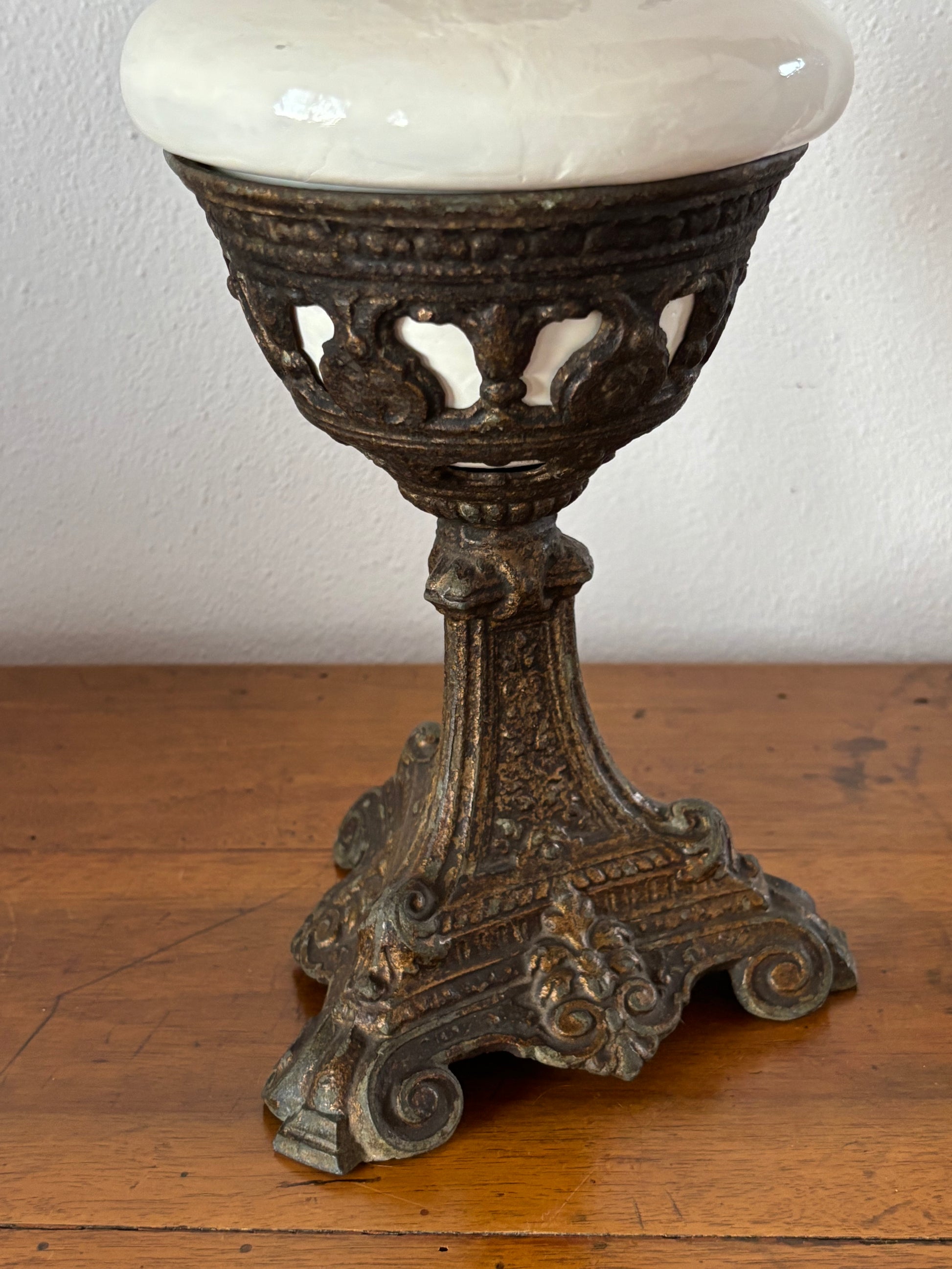 Lampada a olio antica con base in metallo e serbatoio in ceramica – restaurata