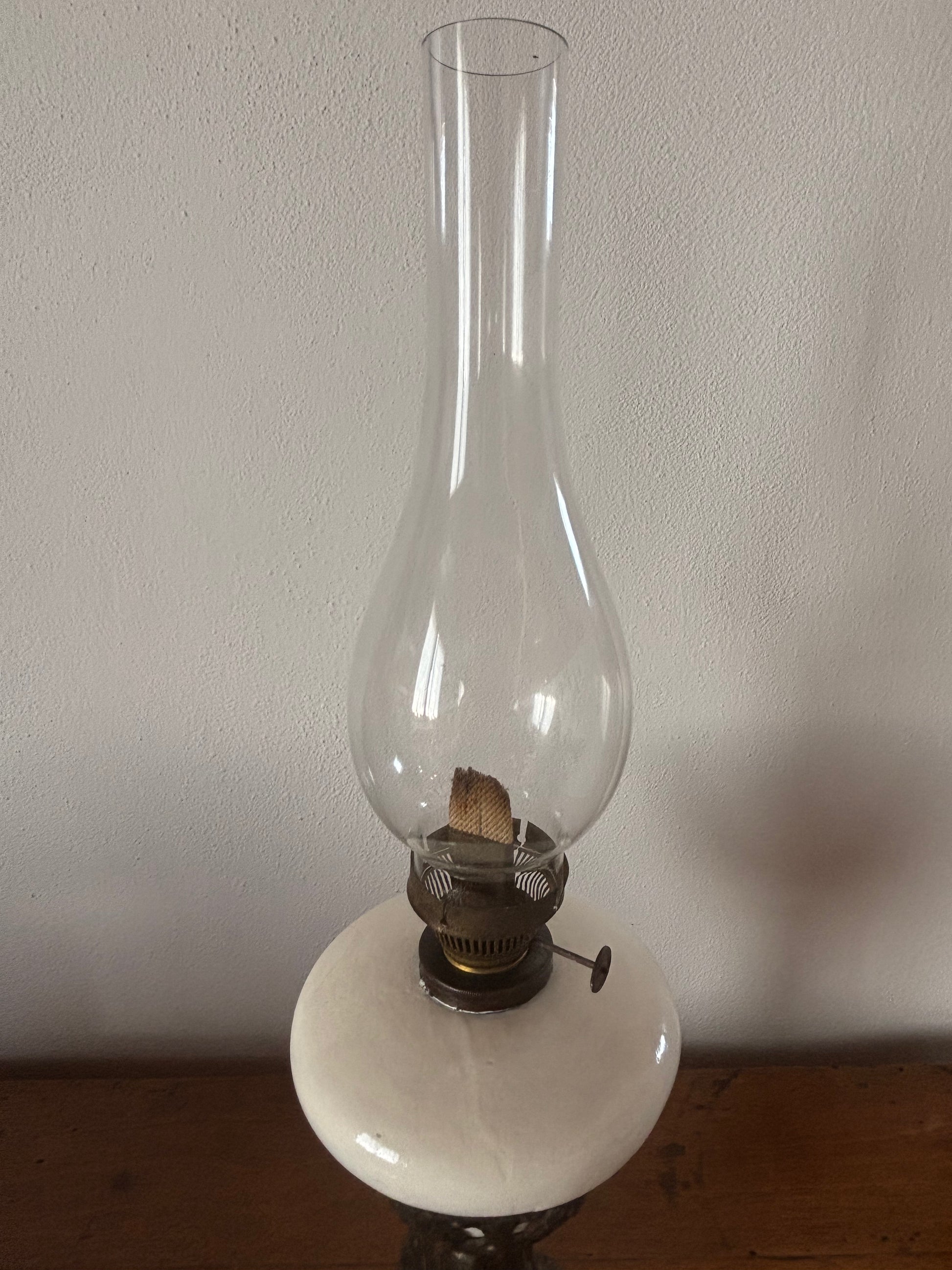 Il serbatoio in ceramica bianca è stato restaurato: presenta un precedente punto di rottura che è stato ricomposto e reincollato, come visibile nelle fotografie. Il vetro del camino è originale o coevo, con piccole imperfezioni compatibili con l’età dell’oggetto, ma ancora integro e stabile.