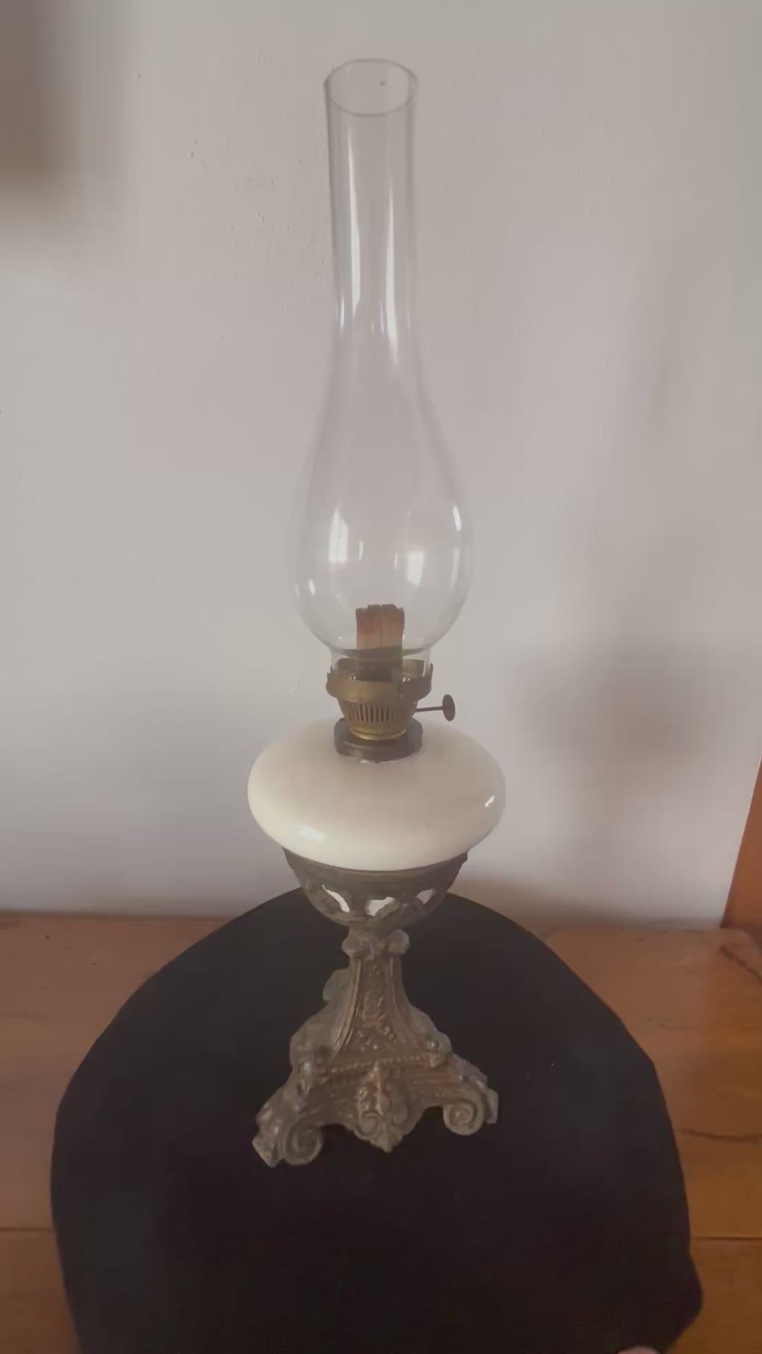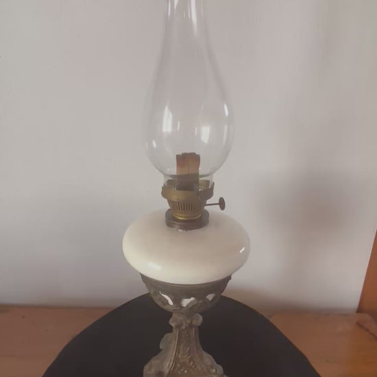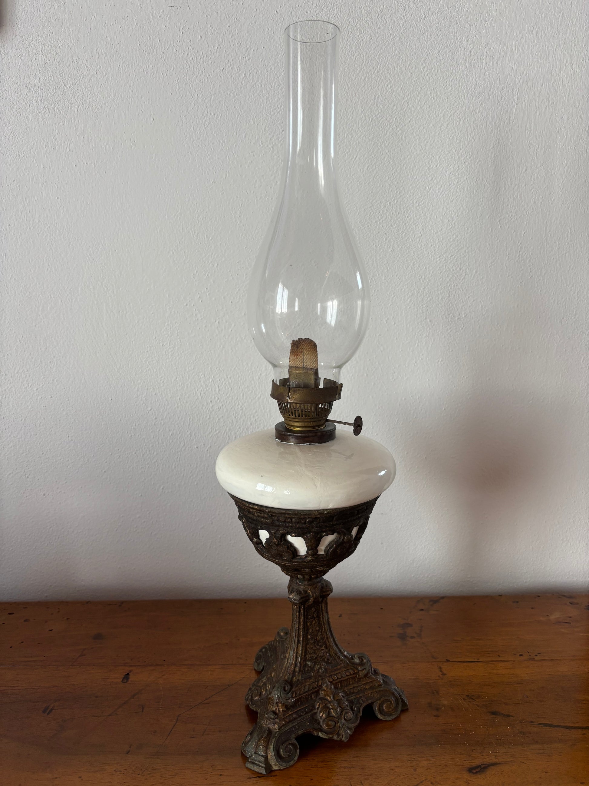 Affascinante lampada a olio d’epoca, ideale per collezionisti o per arredare ambienti in stile vintage, rustico o shabby chic. Questa elegante lampada si distingue per la base decorata in metallo lavorato con motivi floreali e piedini ricurvi, tipici dell'artigianato di fine Ottocento/inizio Novecento.