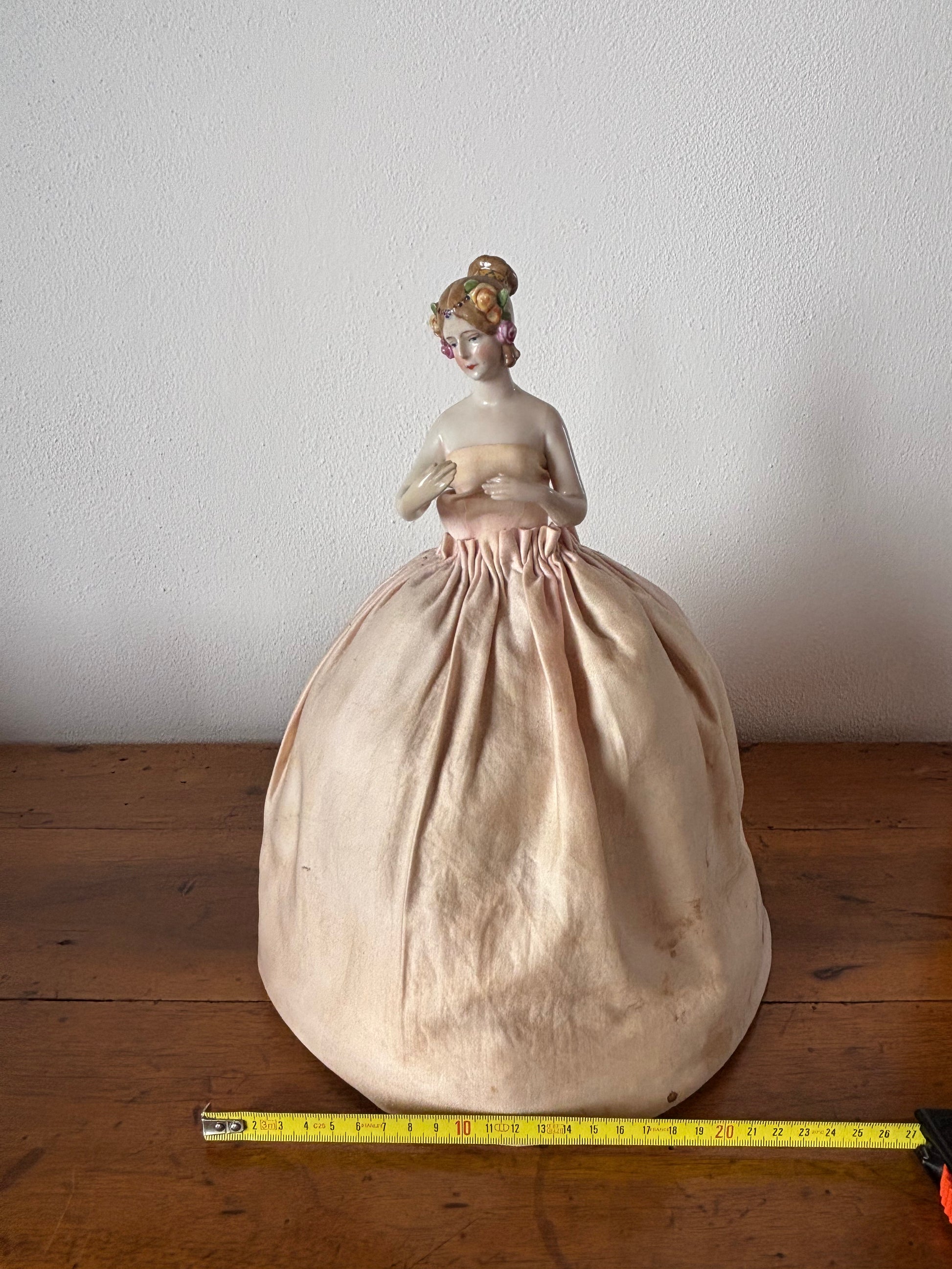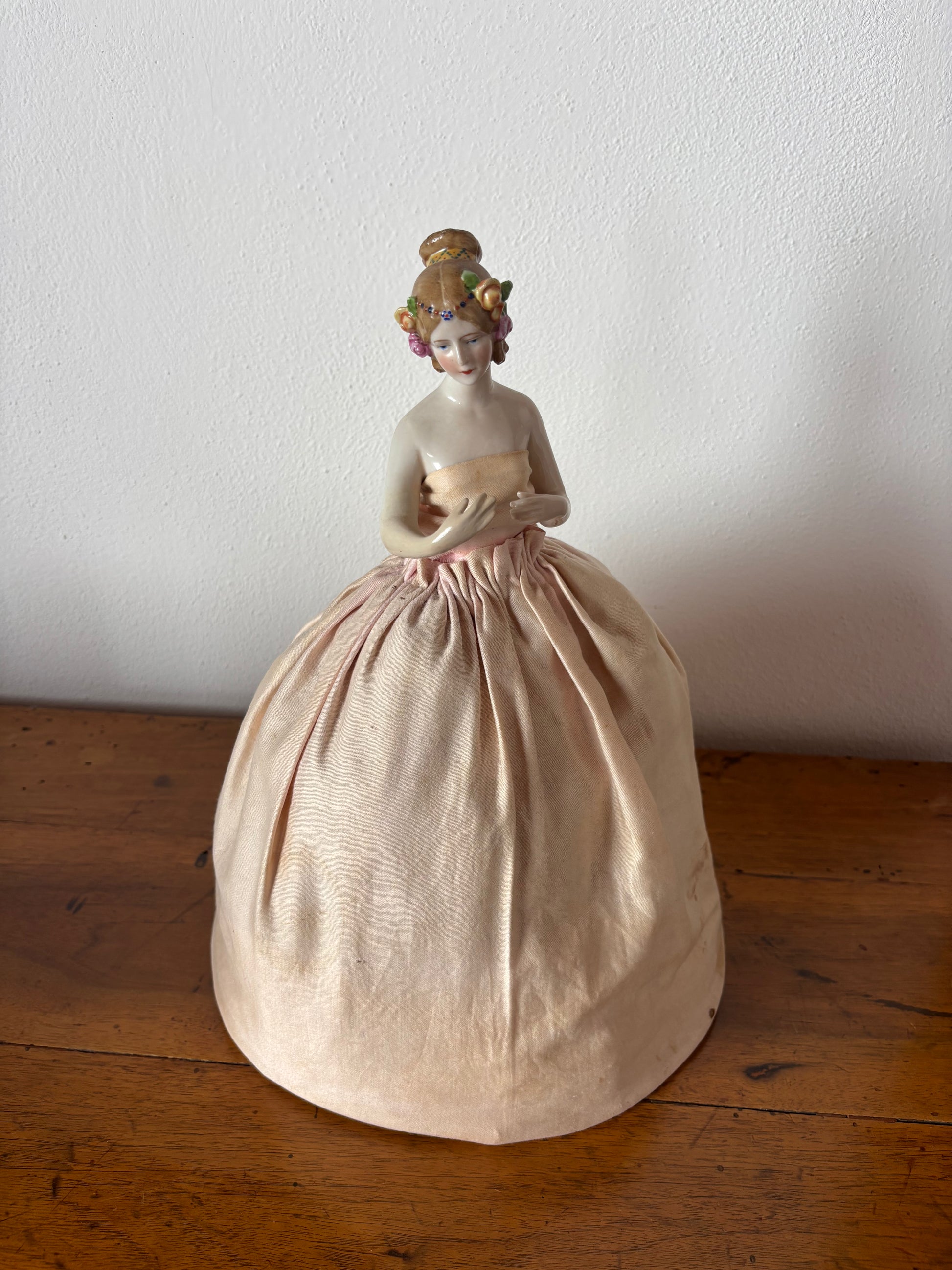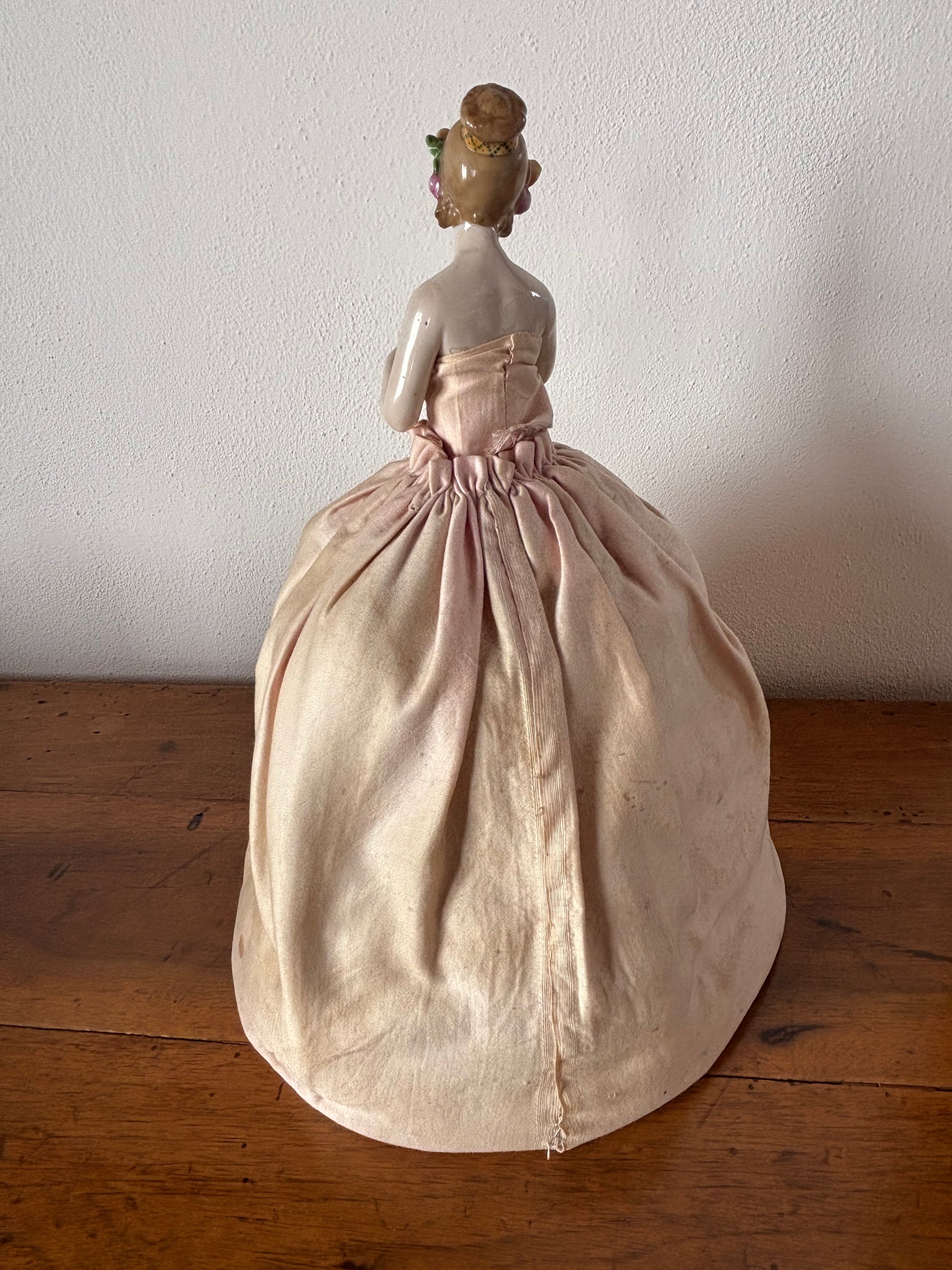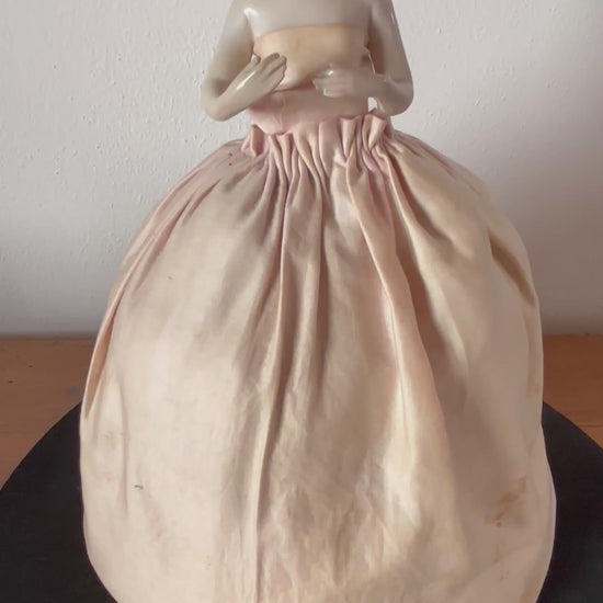 Mezza bambola in porcellana con gonna imbottita vintage