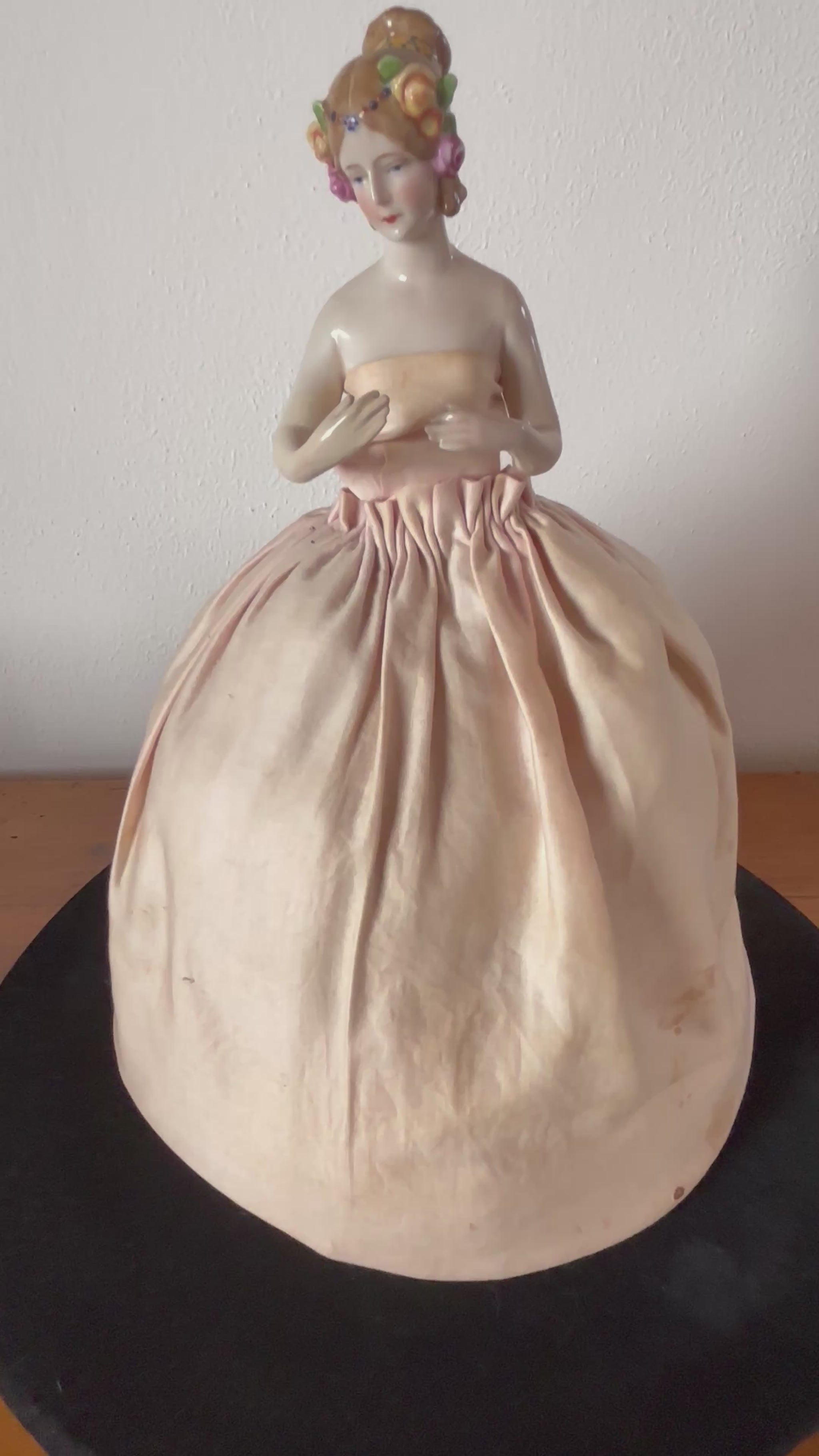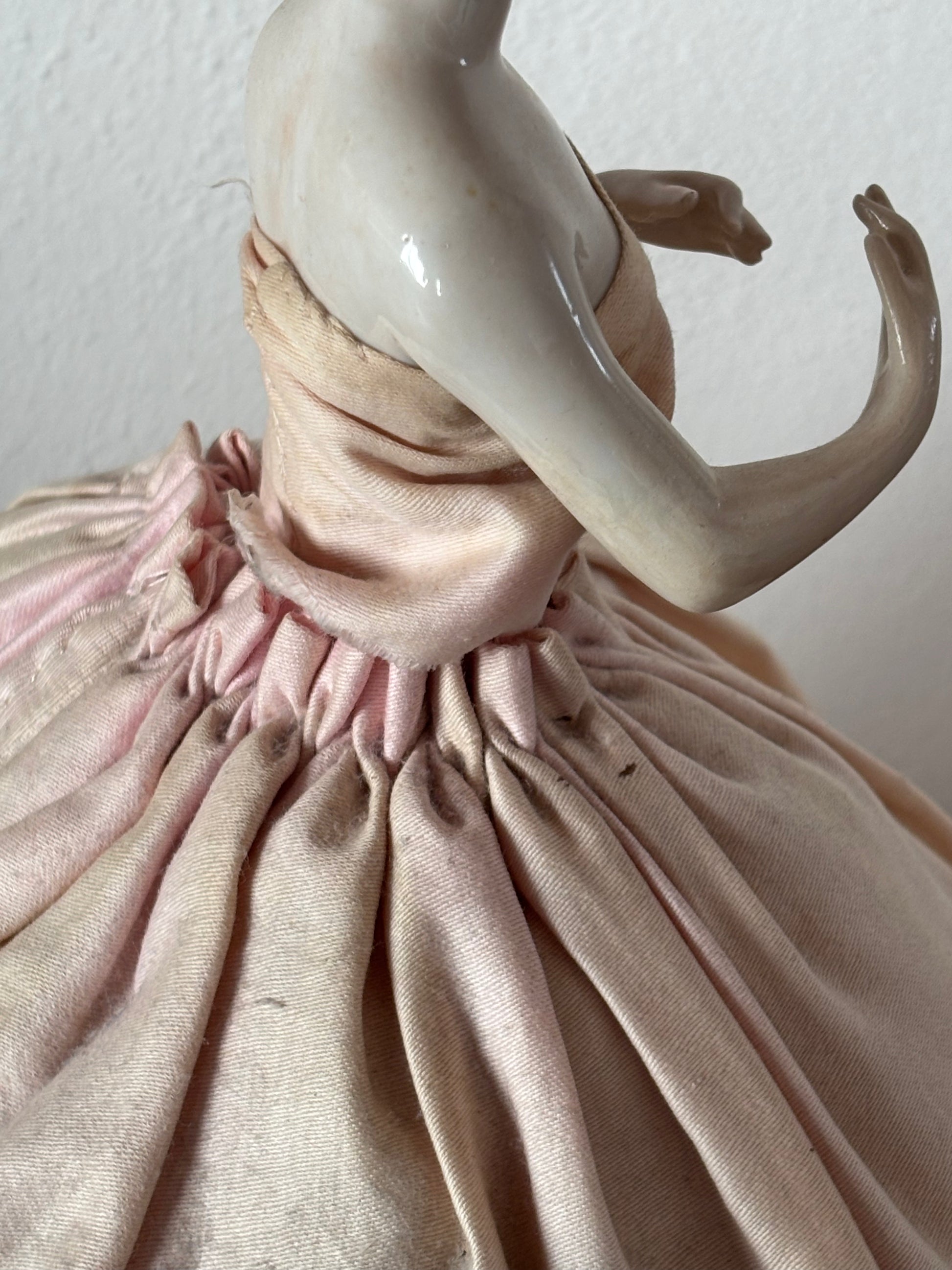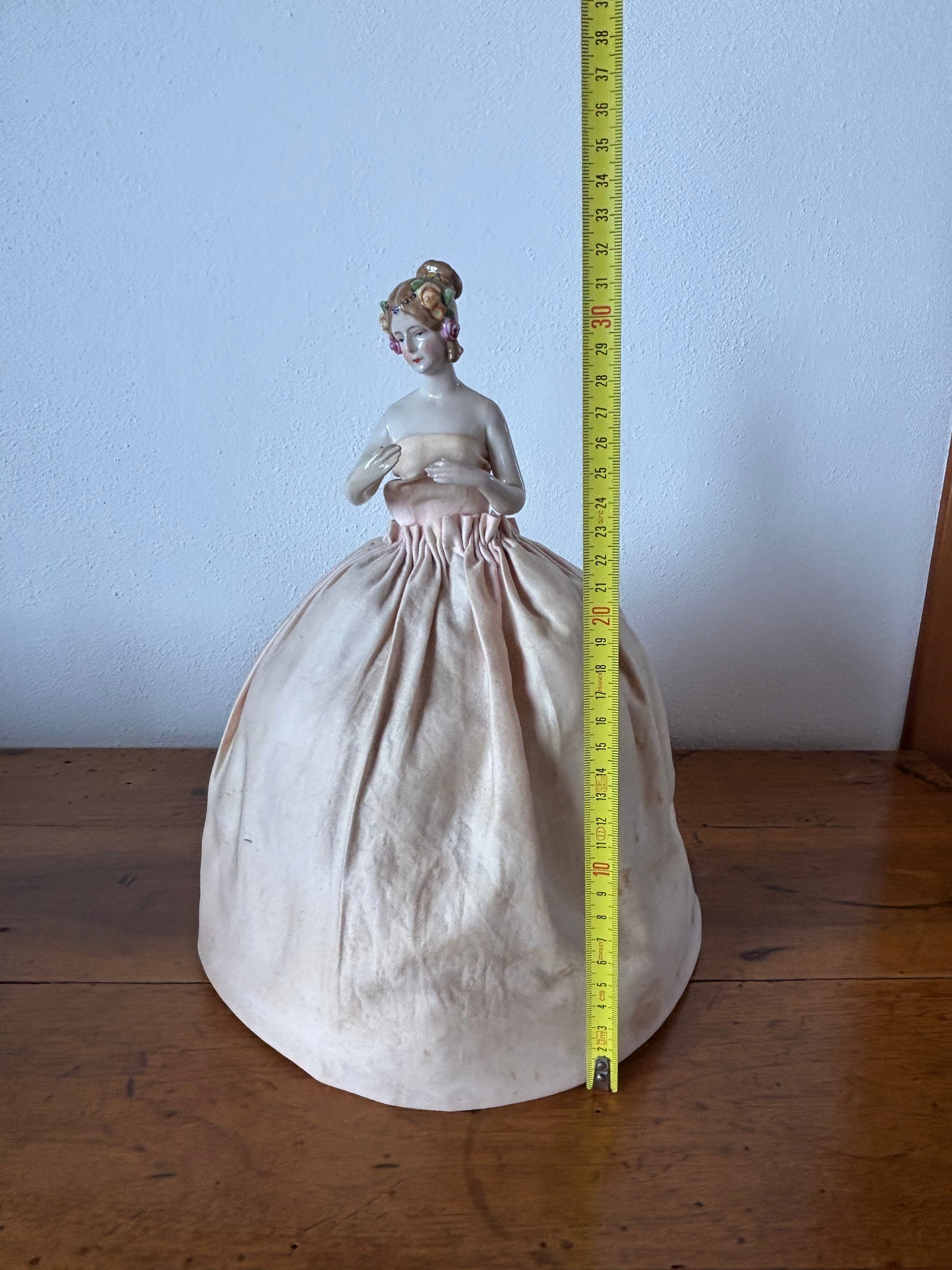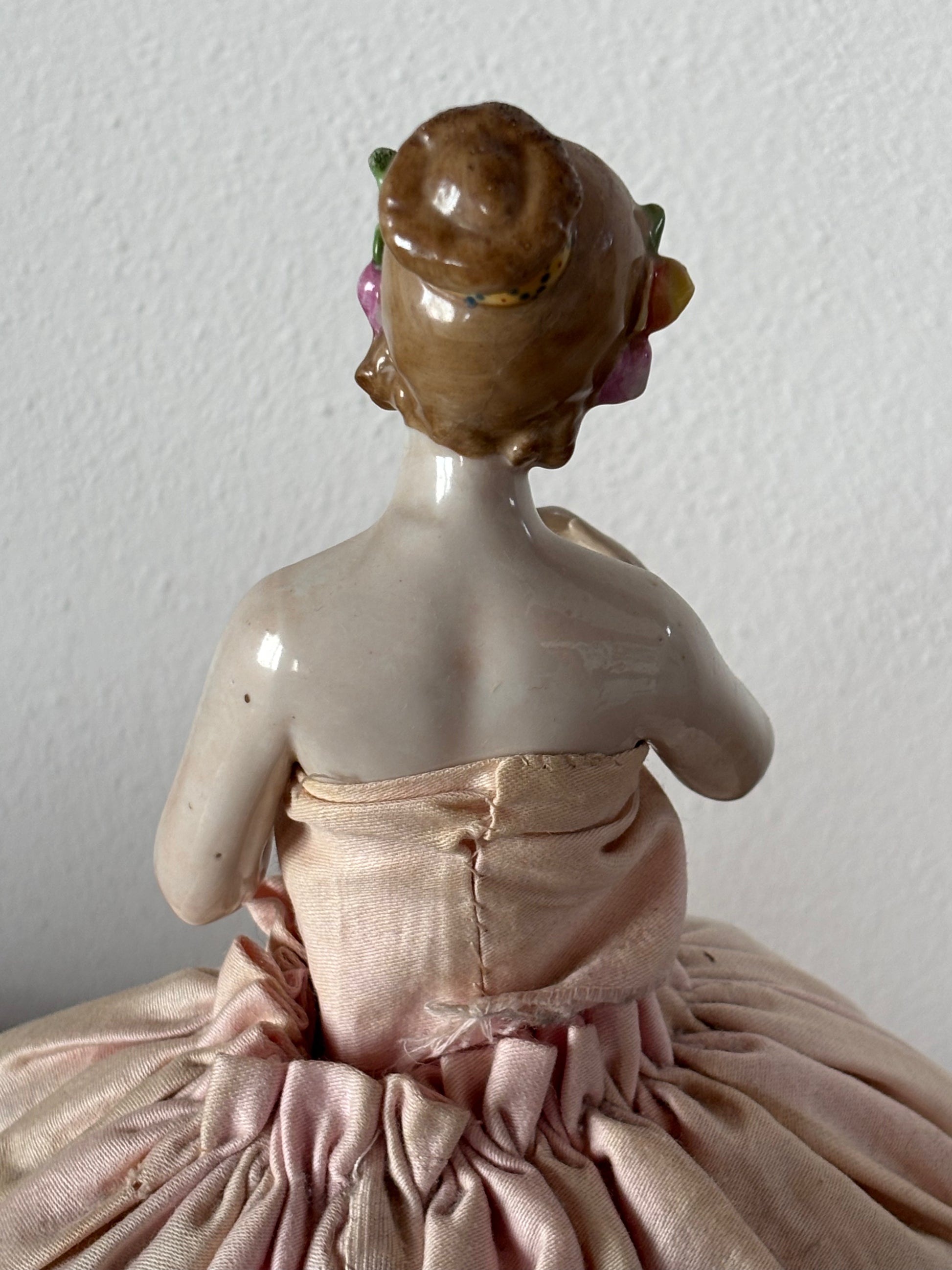 Mezza bambola in porcellana con gonna imbottita vintage
