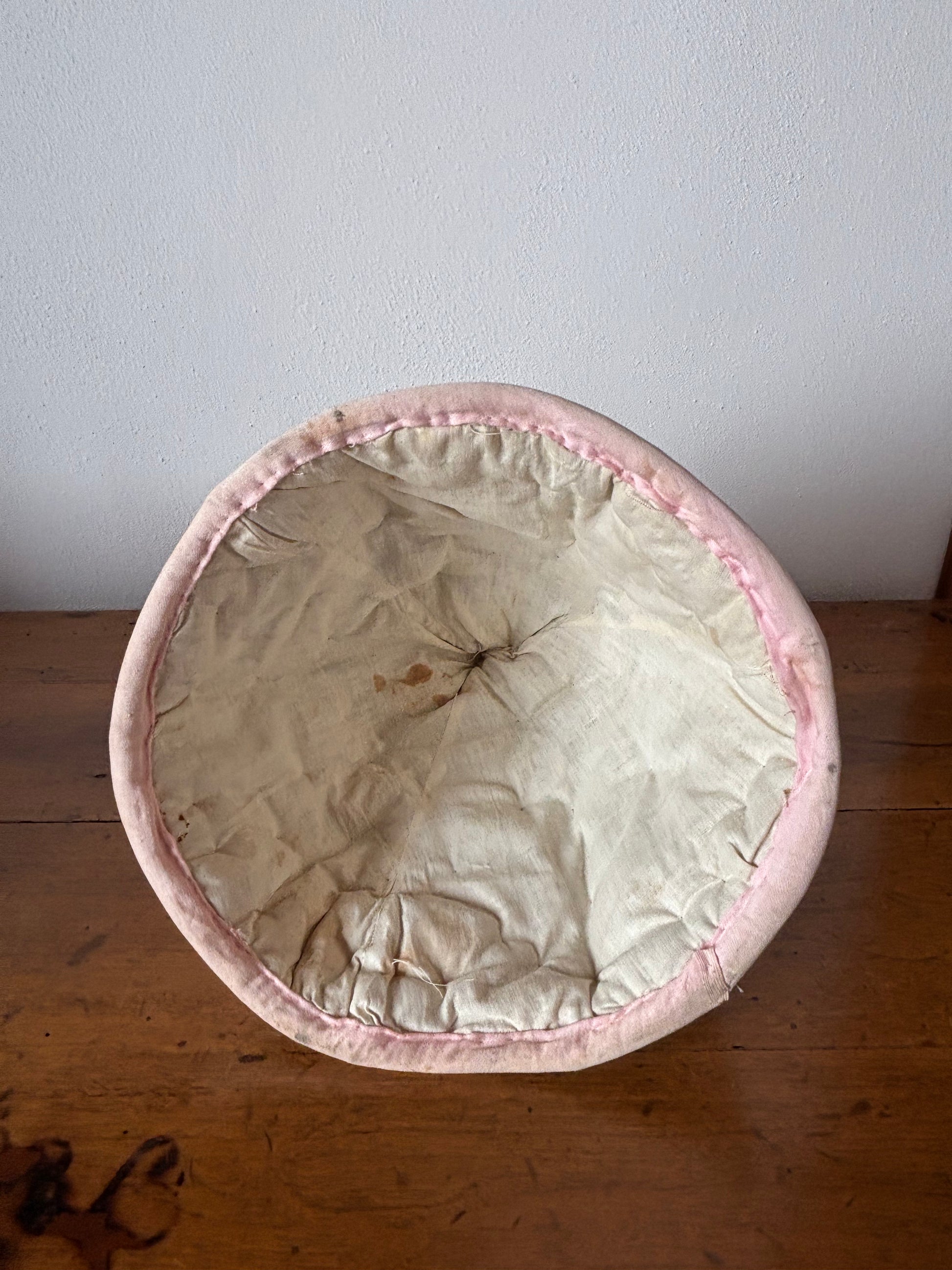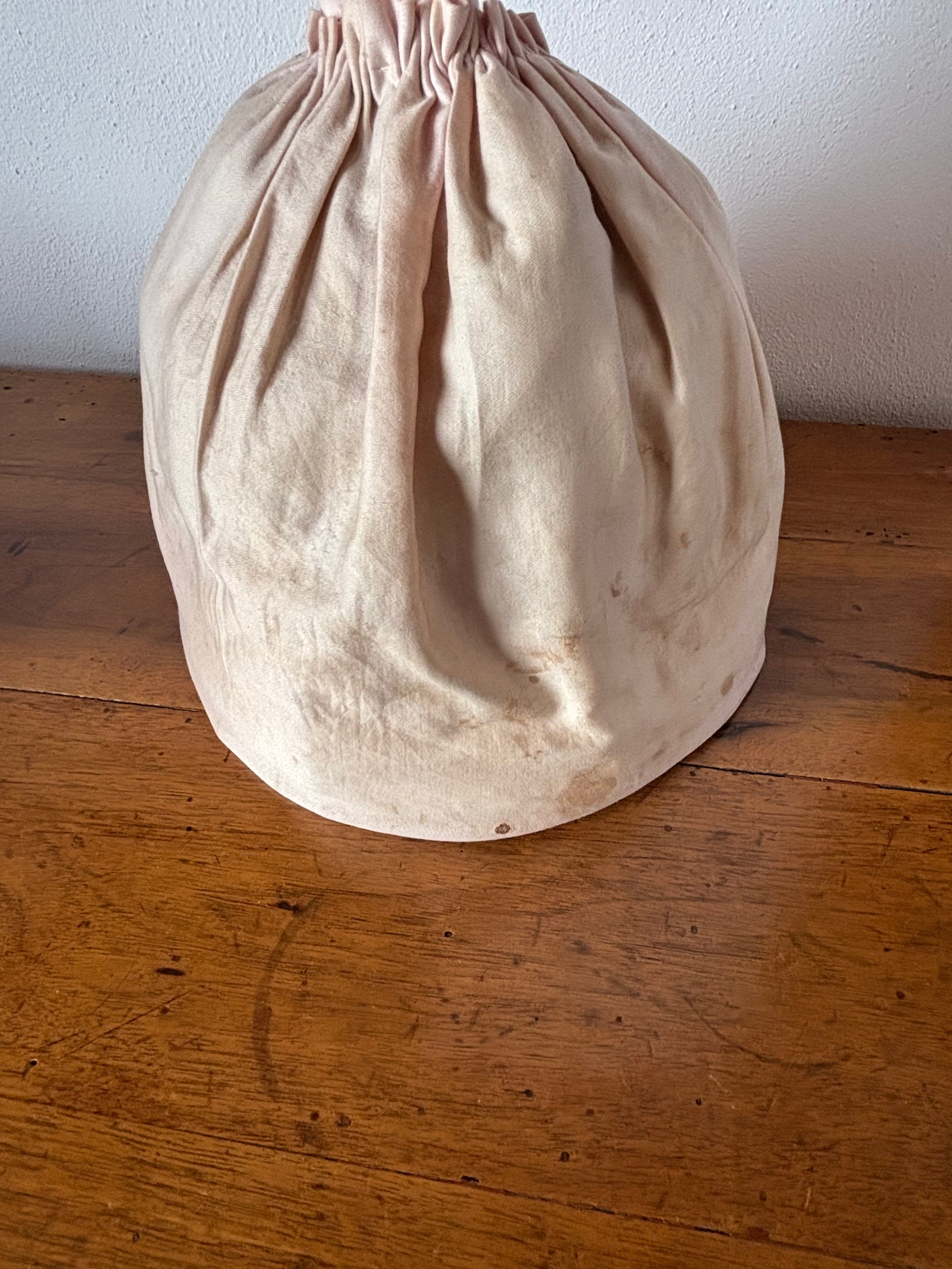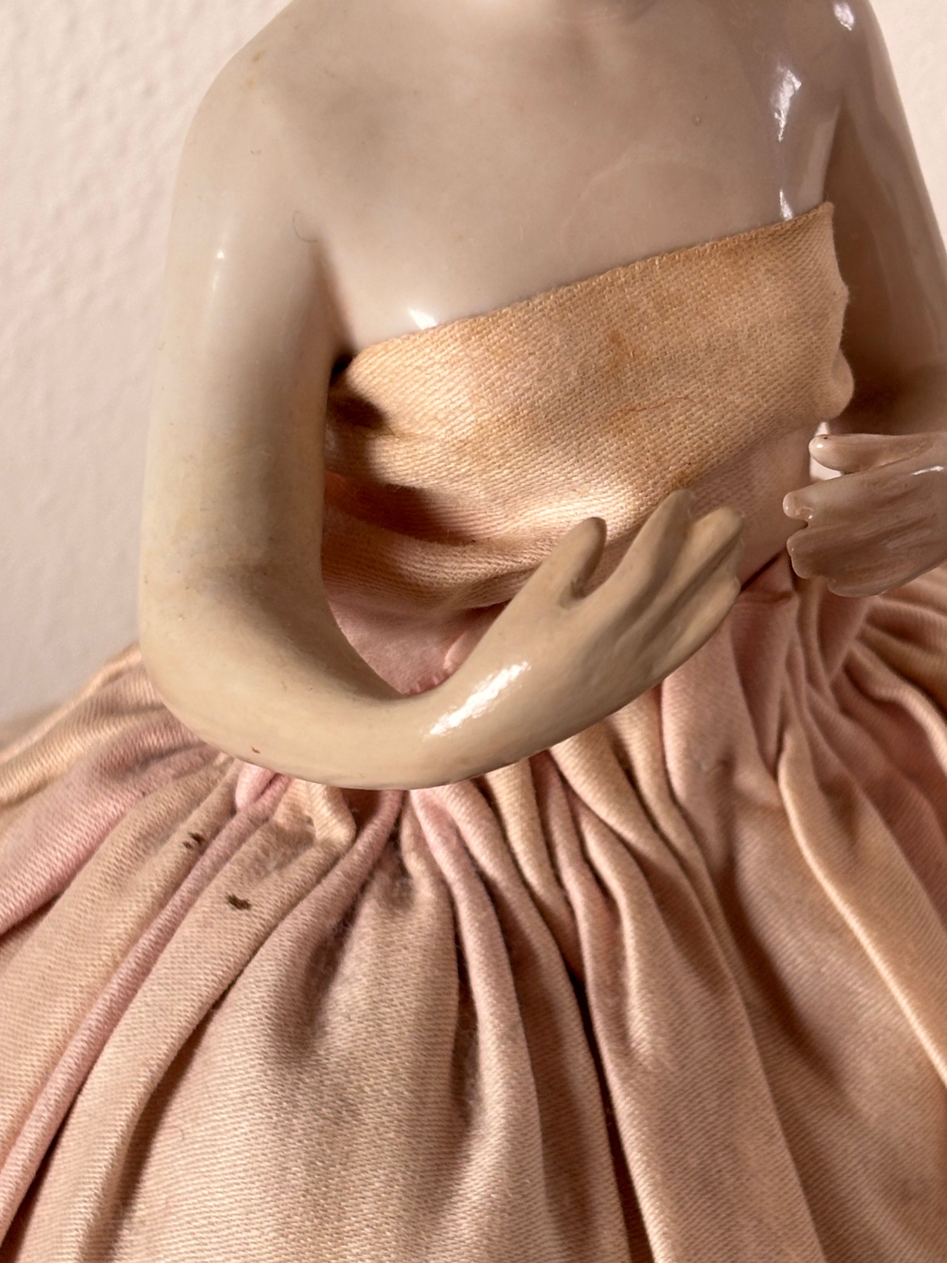 La testa è stata parzialmente riattaccata con attenzione e una delle braccia è stato ricostruito artigianalmente, interventi che mantengono intatto il suo fascino d’antiquariato. La veste in tessuto presenta alcune macchie visibili, segni autentici del tempo che ne raccontano la storia e l’autenticità. L’insieme conserva un aspetto armonioso e gradevole, ideale per vetrine, ambienti shabby chic, oggetti decorativi d’epoca.
