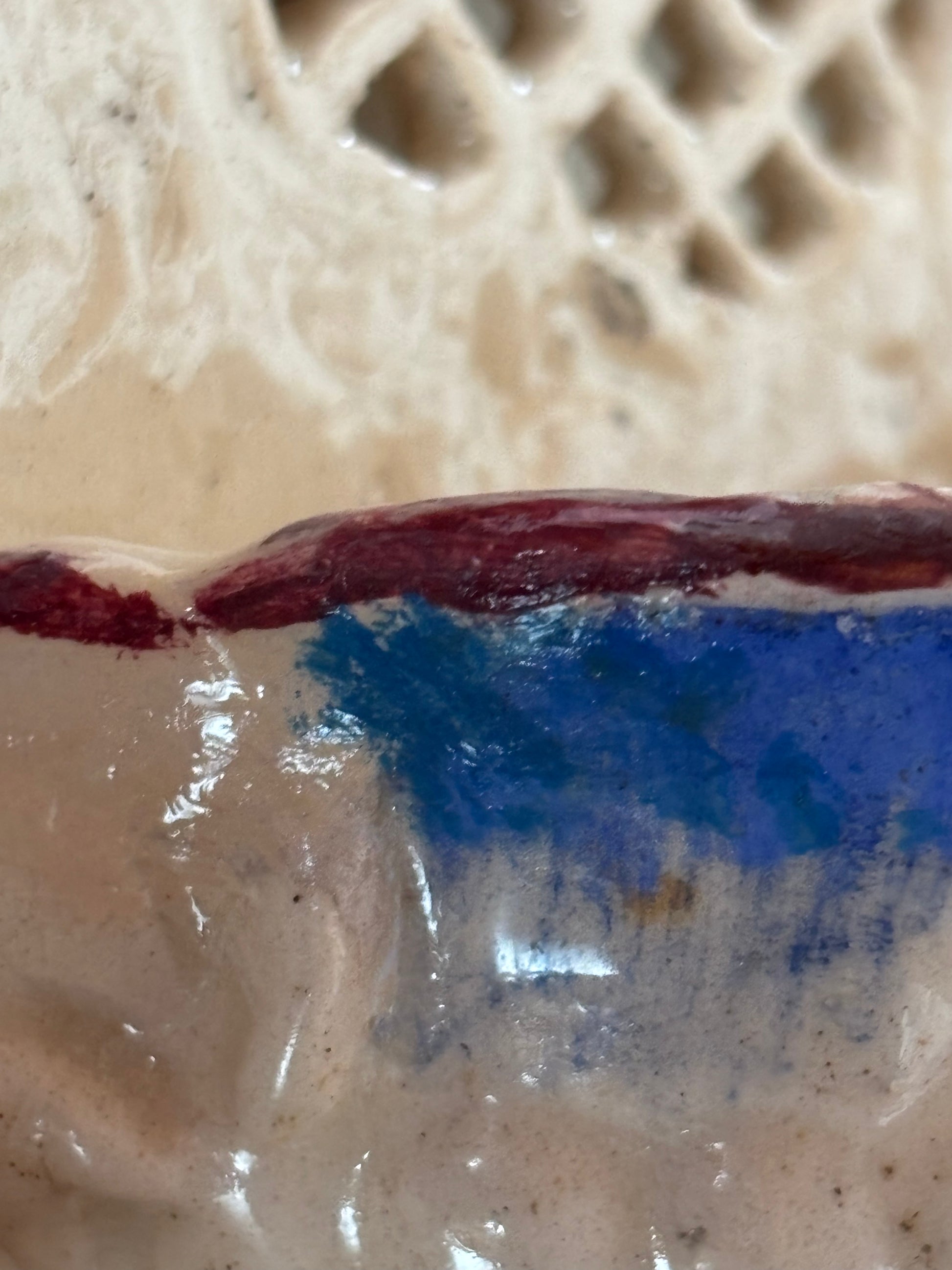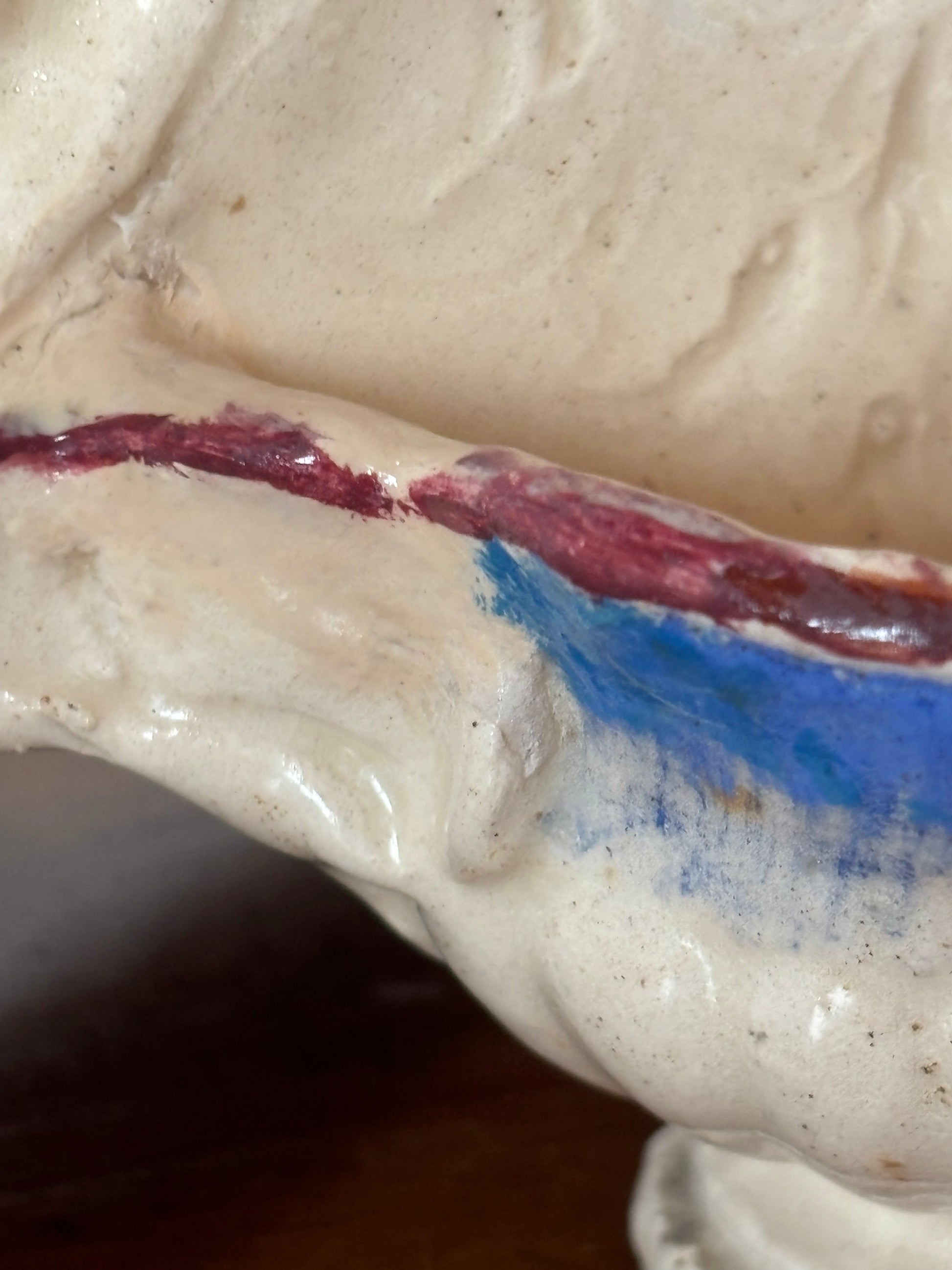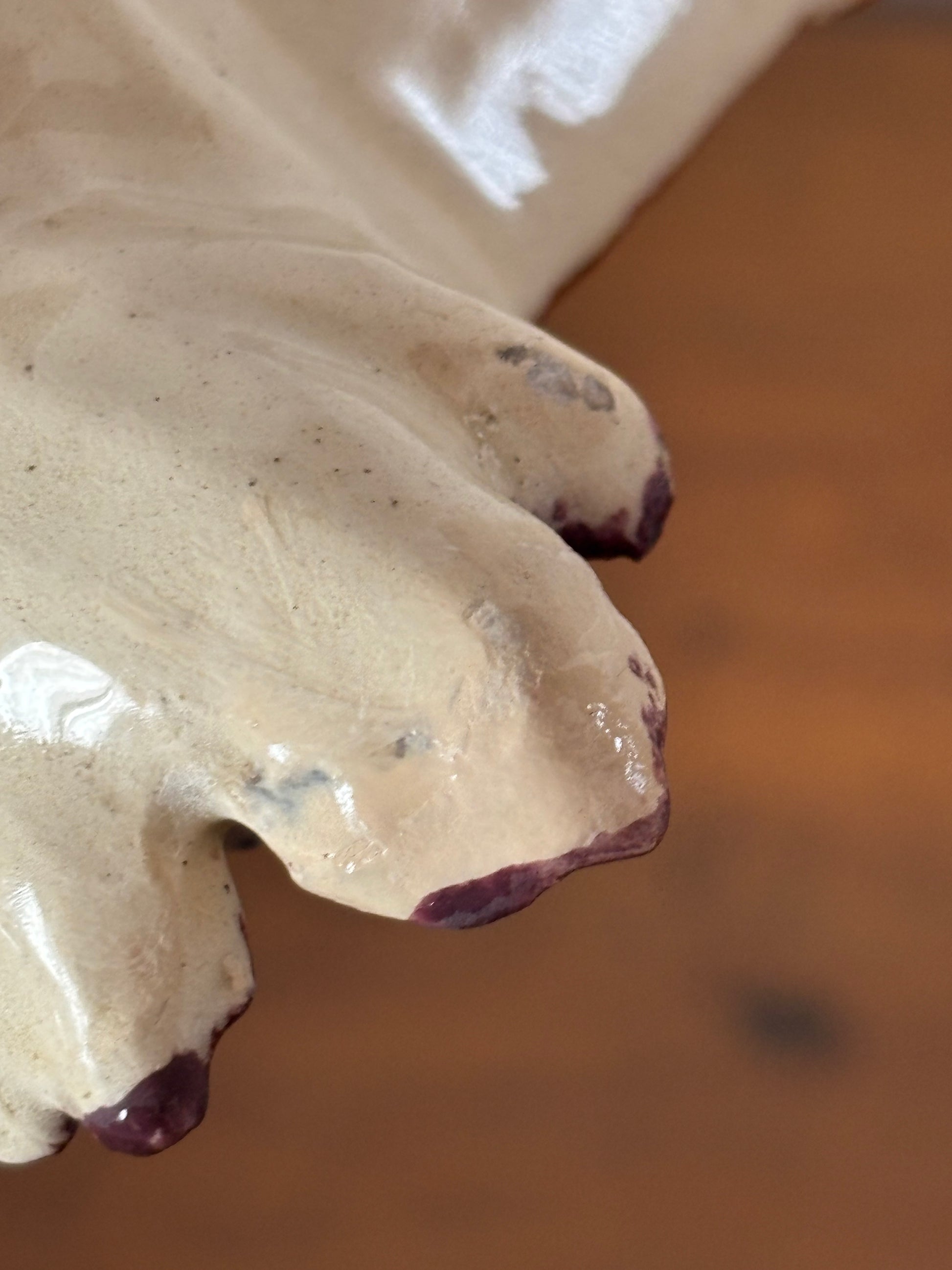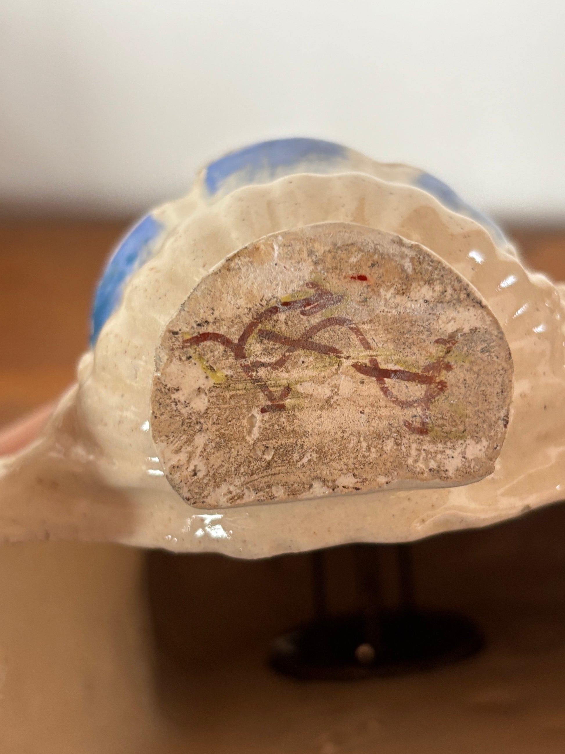 Il corpo in ceramica smaltata, dai toni crema con accenti viola, blu, arancio e verde, ospita un quadrante dorato con numeri neri ben leggibili e lancette funzionanti. Il meccanismo è funzionante, ma da revisionare, mentre il marchio visibile in foto ne attesta la provenienza e la qualità. Alcune punte decorative e bordi sono stati restaurati con cura, mantenendo l’integrità estetica dell’oggetto e valorizzandone la bellezza originale, come si può vedere dalle foto.