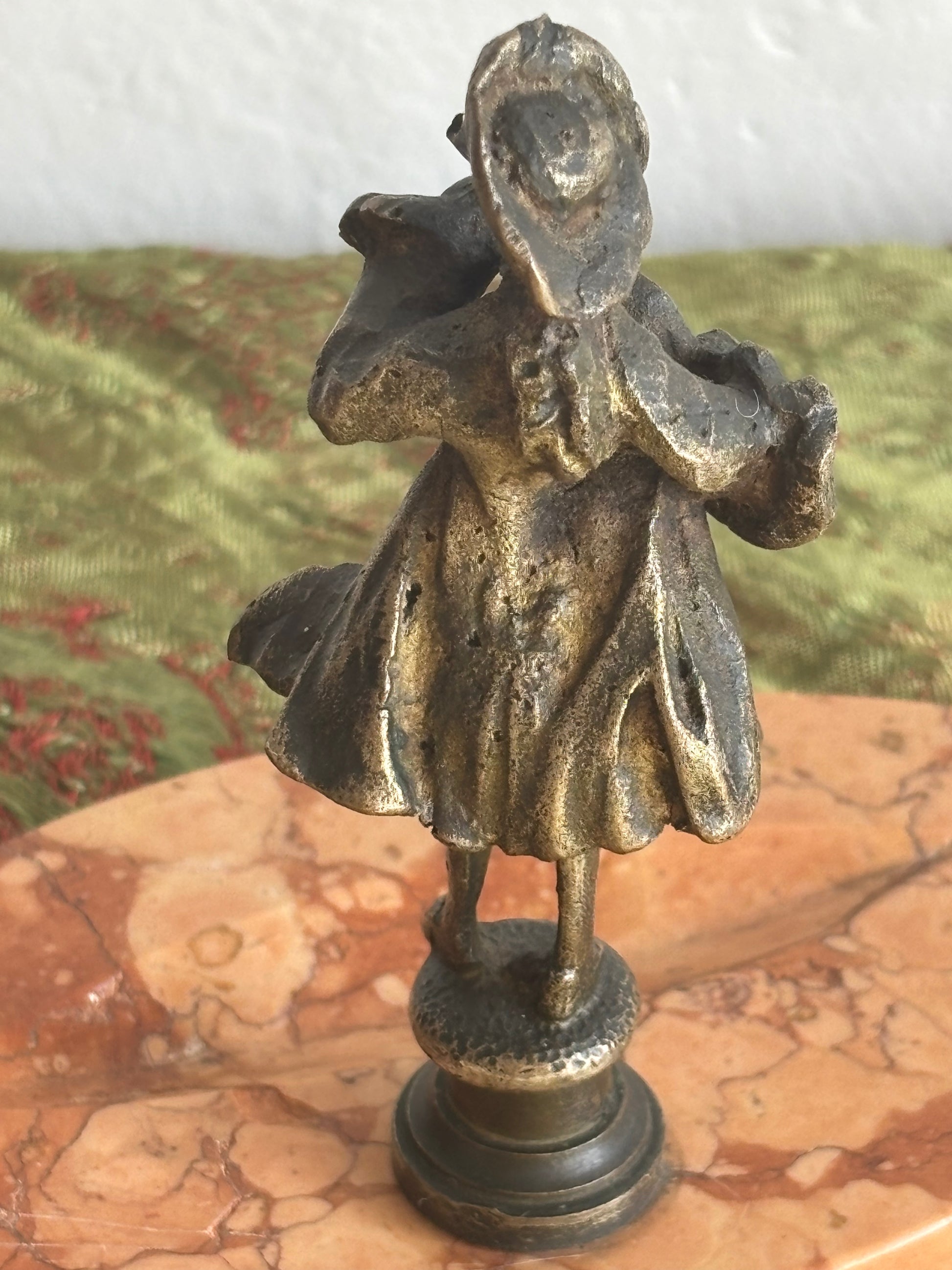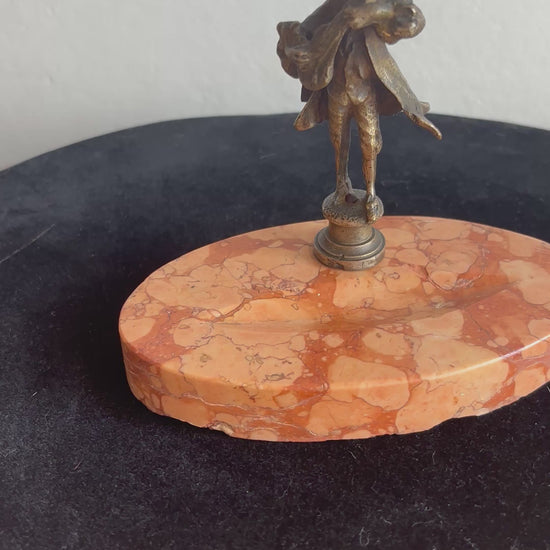 Il porta penne è in buone condizioni generali, con normali segni di usura dovuti al tempo e alcune sbeccature sulla base in marmo, ben visibili nelle fotografie, che ne testimoniano autenticità e vissuto. Si tratta di un oggetto originale e d’arredo artistico che offre carattere e storia a qualsiasi scrivania, perfetto per appassionati di oggetti vintage, antichi accessori da scrittura o collezionisti di statuette storiche.