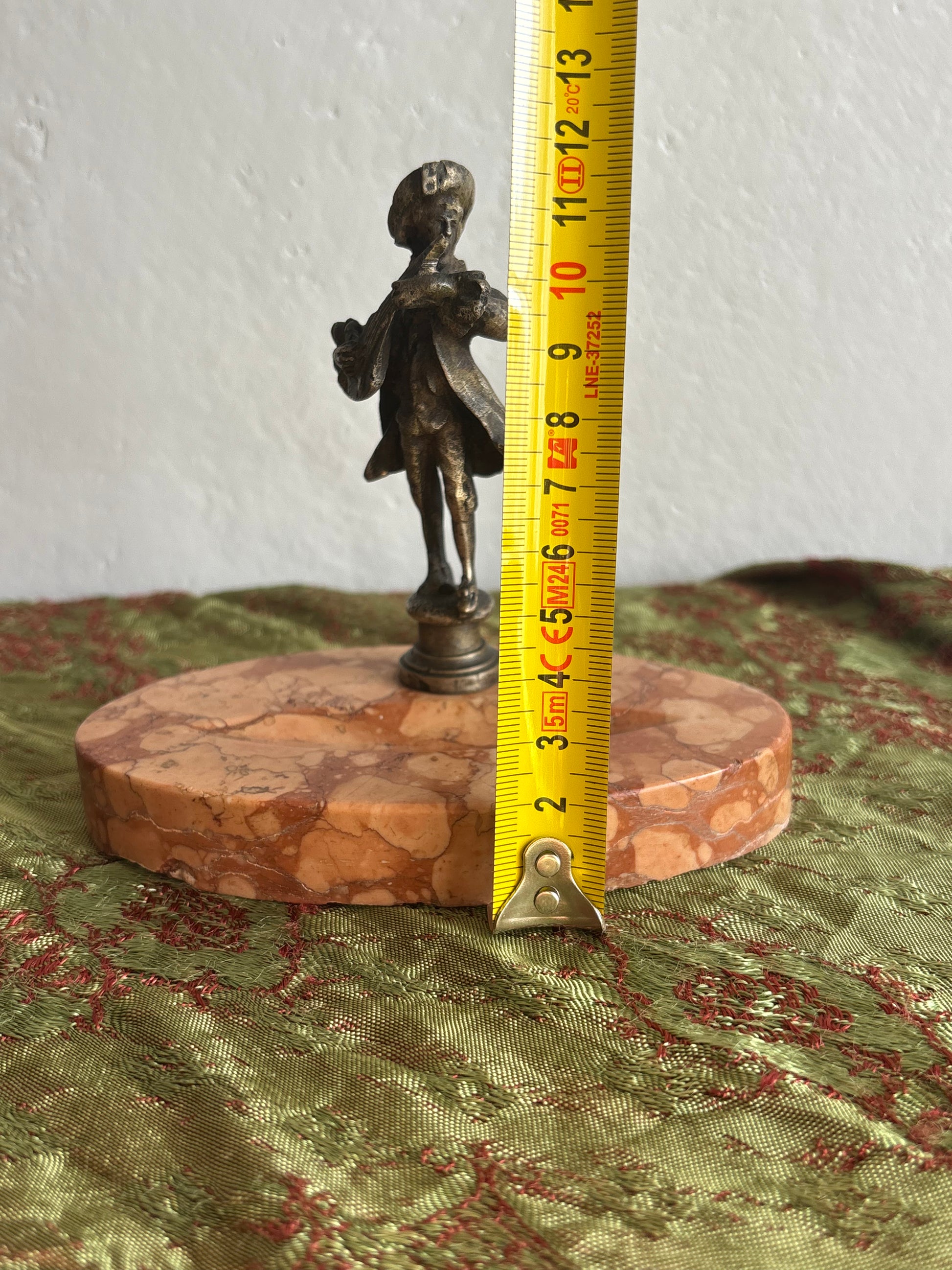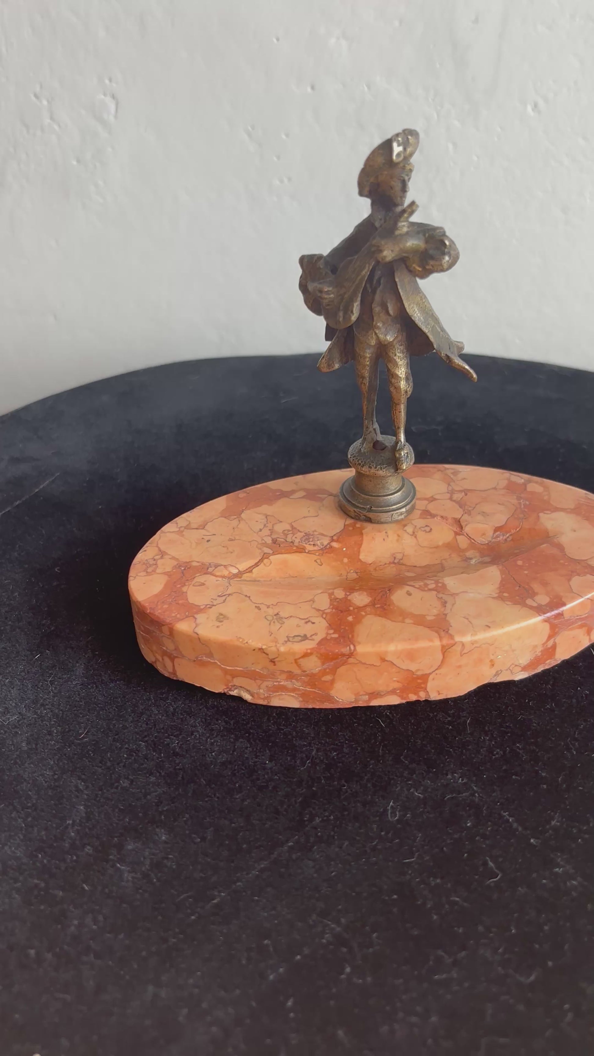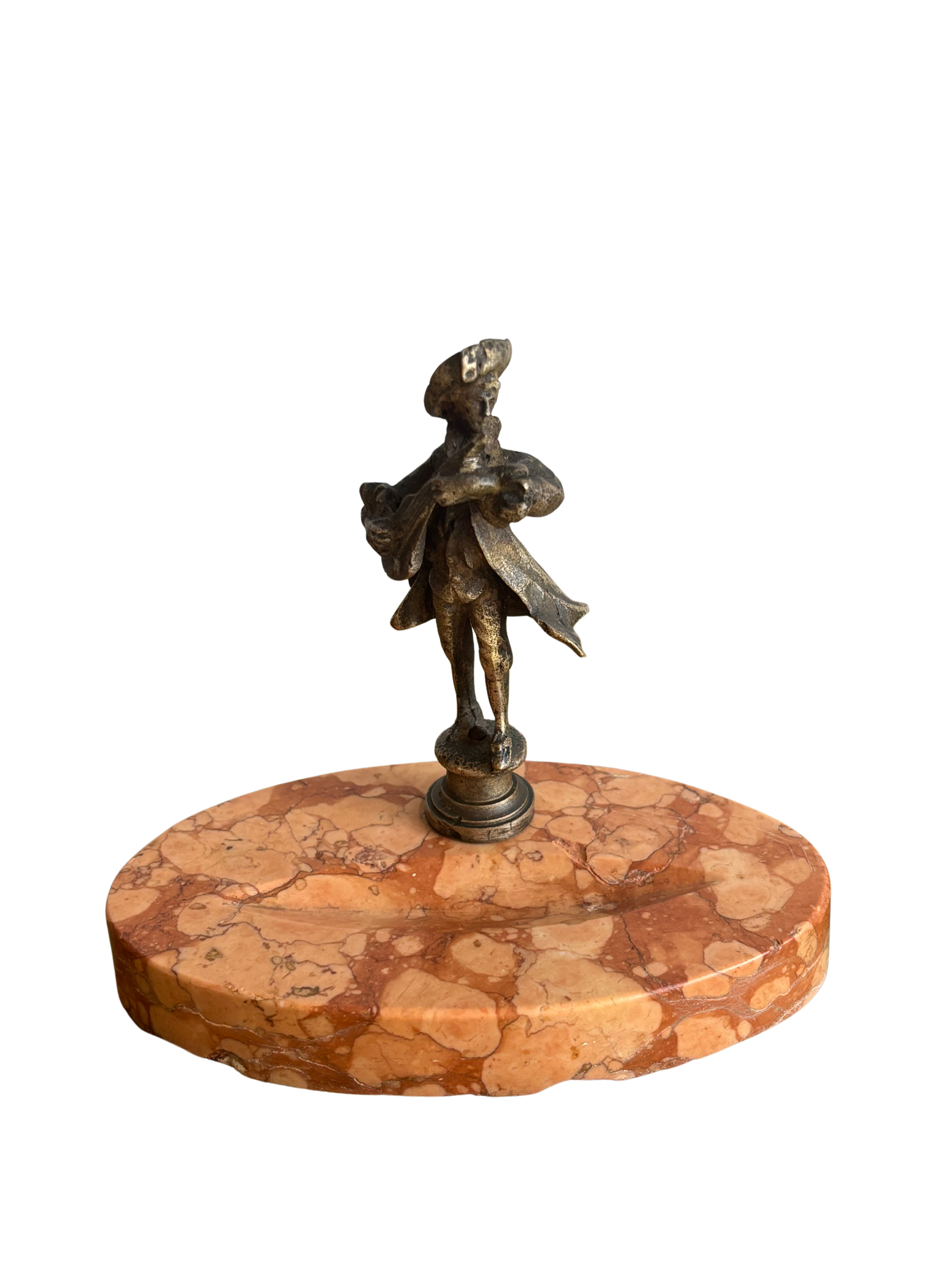 Elegante porta penne vintage in marmo con statuetta in metallo raffigurante un musicista in abiti d’epoca, ideale come oggetto d’arredo da scrivania o complemento per studi, librerie e ambienti classici. Il basamento è realizzato in marmo dalle calde sfumature rosate, con venature ben visibili che conferiscono unicità e valore decorativo al pezzo. La statuetta in metallo rappresenta un musicista settecentesco, con abbigliamento storico riccamente modellato, dal forte fascino estetico e collezionistico.