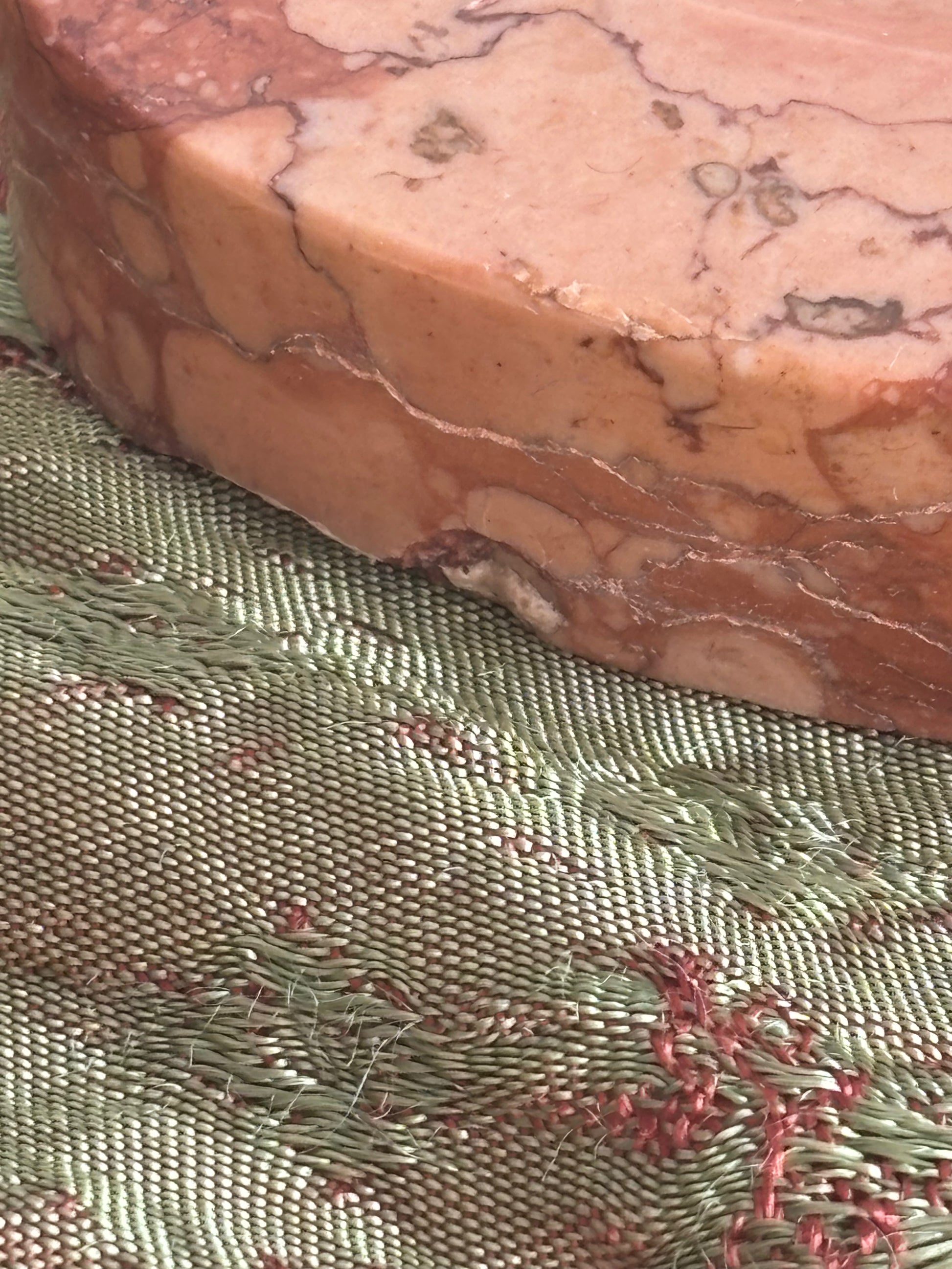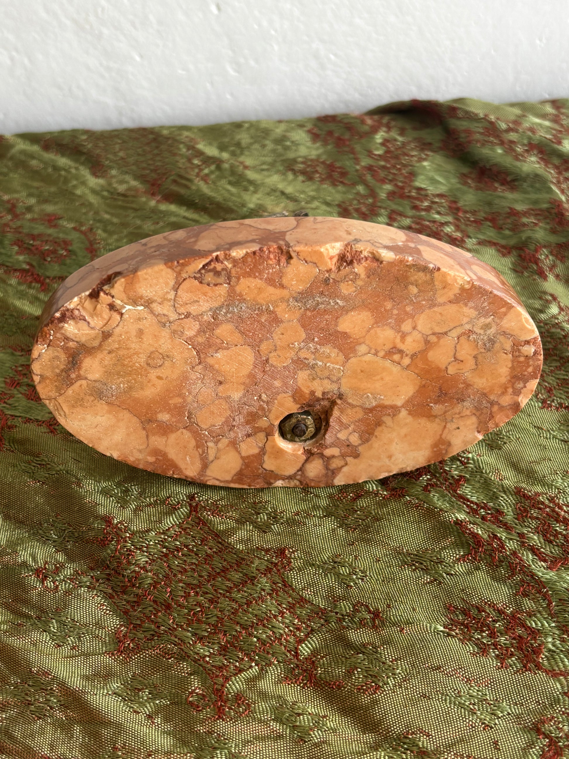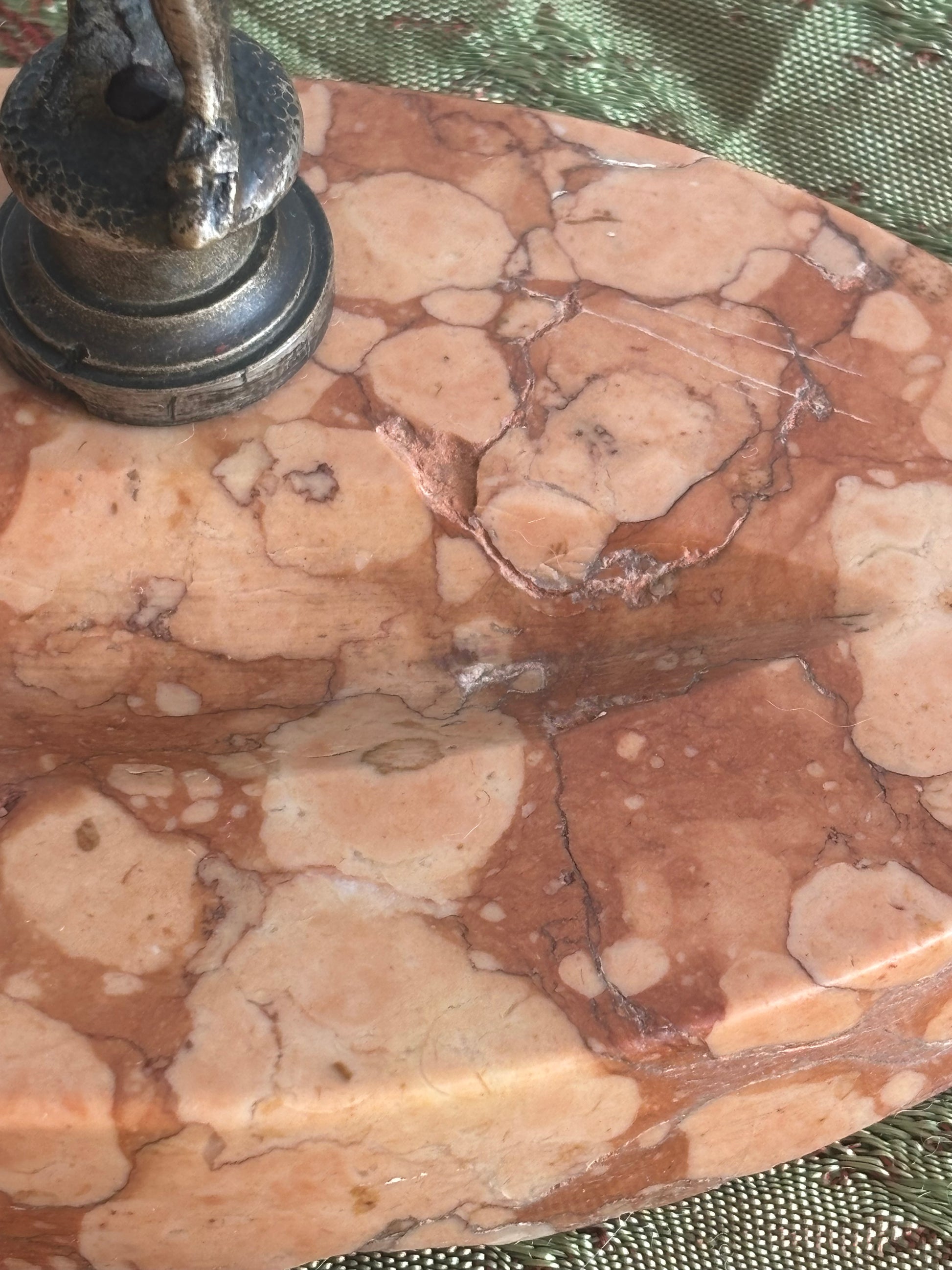 Elegante porta penne vintage in marmo con statuetta in metallo raffigurante un musicista in abiti d’epoca, ideale come oggetto d’arredo da scrivania o complemento per studi, librerie e ambienti classici. Il basamento è realizzato in marmo dalle calde sfumature rosate, con venature ben visibili che conferiscono unicità e valore decorativo al pezzo. La statuetta in metallo rappresenta un musicista settecentesco, con abbigliamento storico riccamente modellato, dal forte fascino estetico e collezionistico.