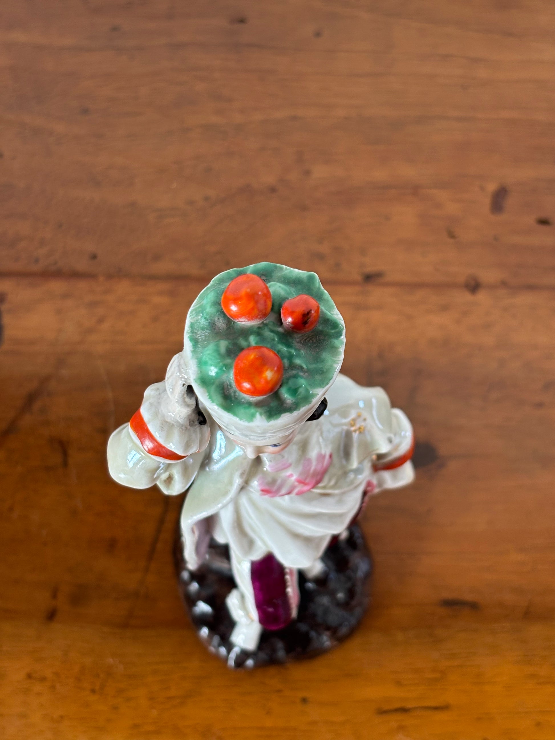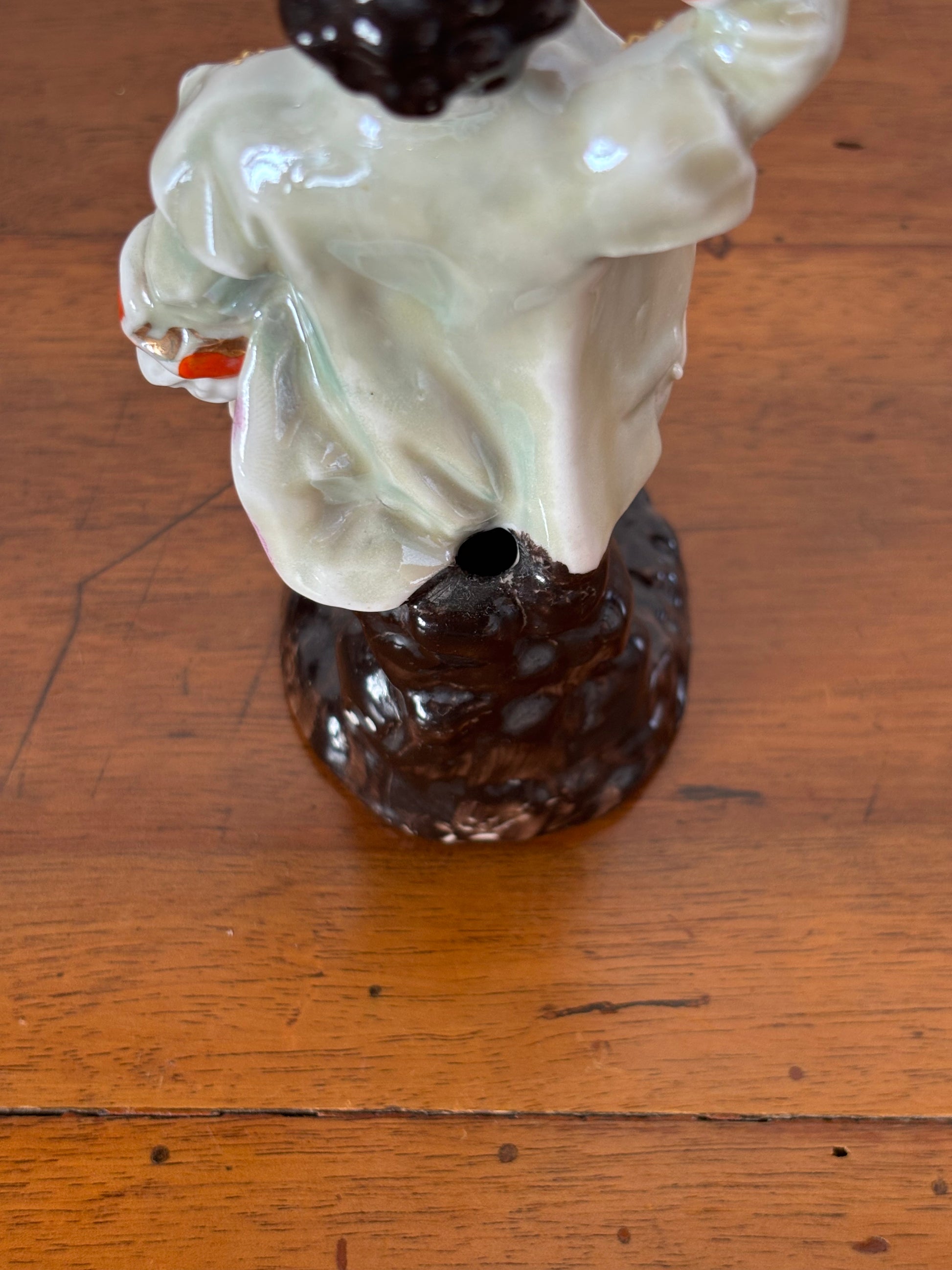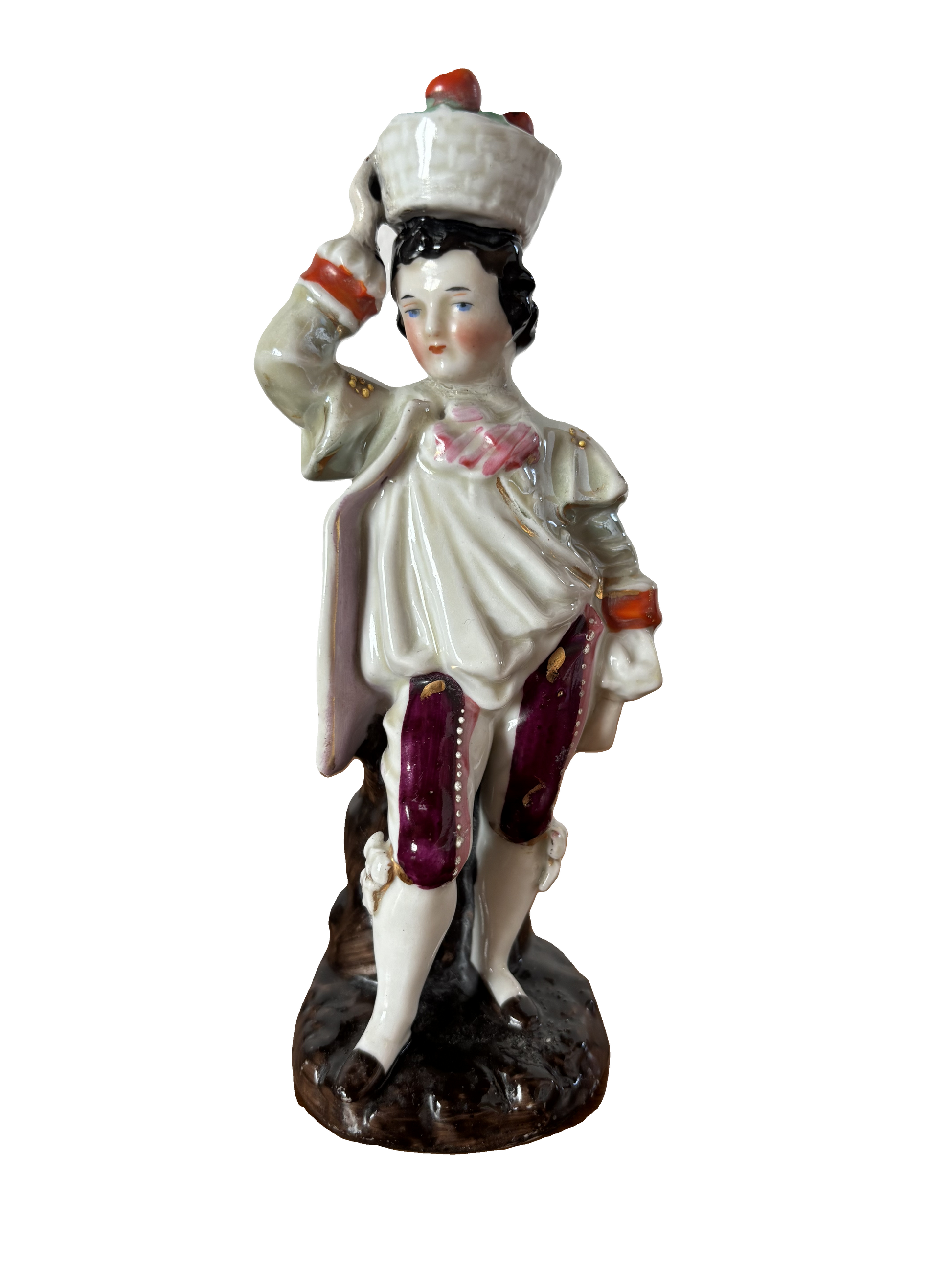 Raro porta piuma in ceramica della tradizione Staffordshire, raffigurante un giovane in abiti settecenteschi, con un cesto intrecciato posato sulla testa. Il soggetto è modellato con cura e dipinto con colori vivaci e dettagli dorati che impreziosiscono la composizione. La base marrone, irregolare e lucida, richiama una superficie rocciosa, conferendo stabilità e carattere alla figura.