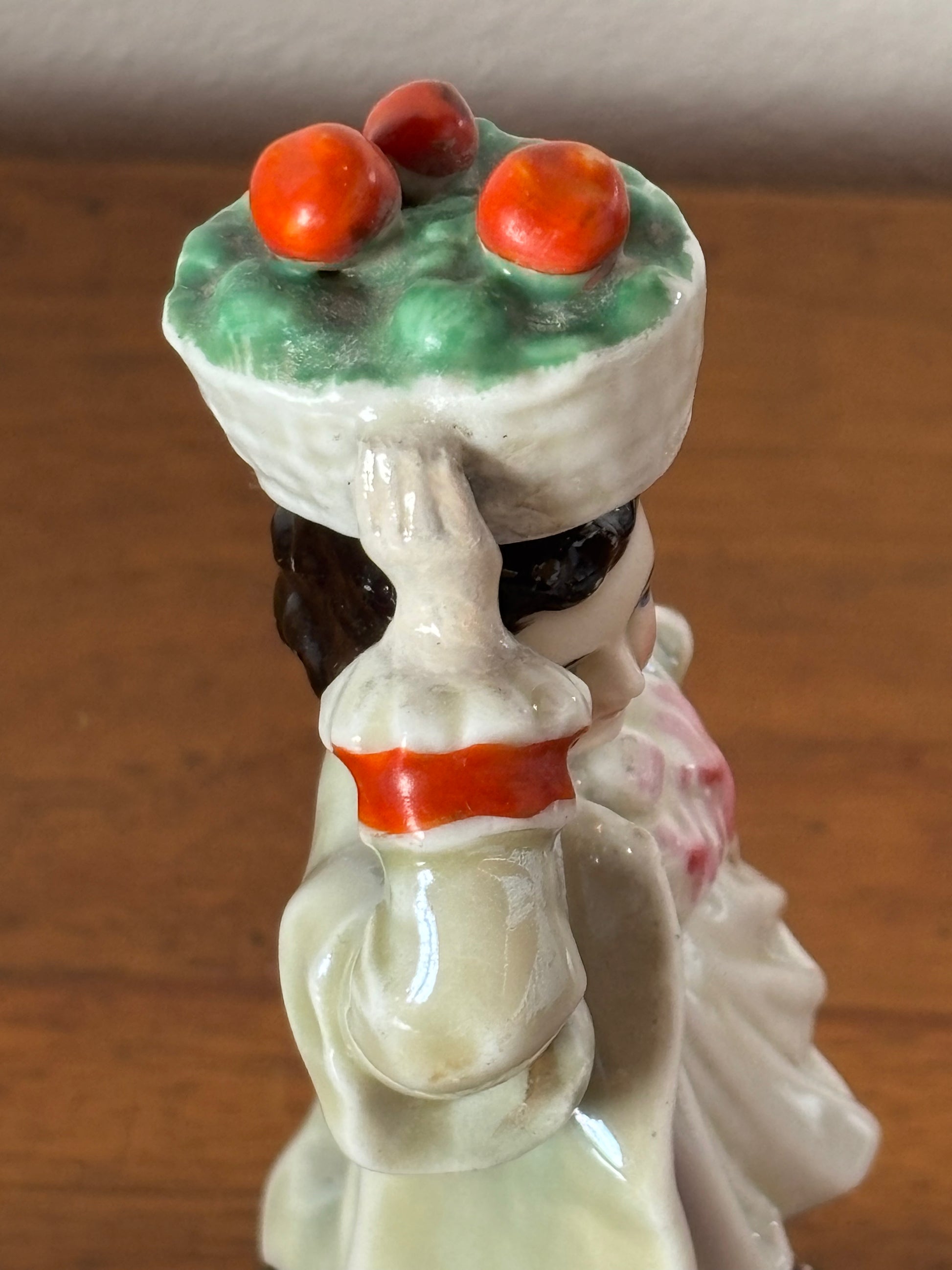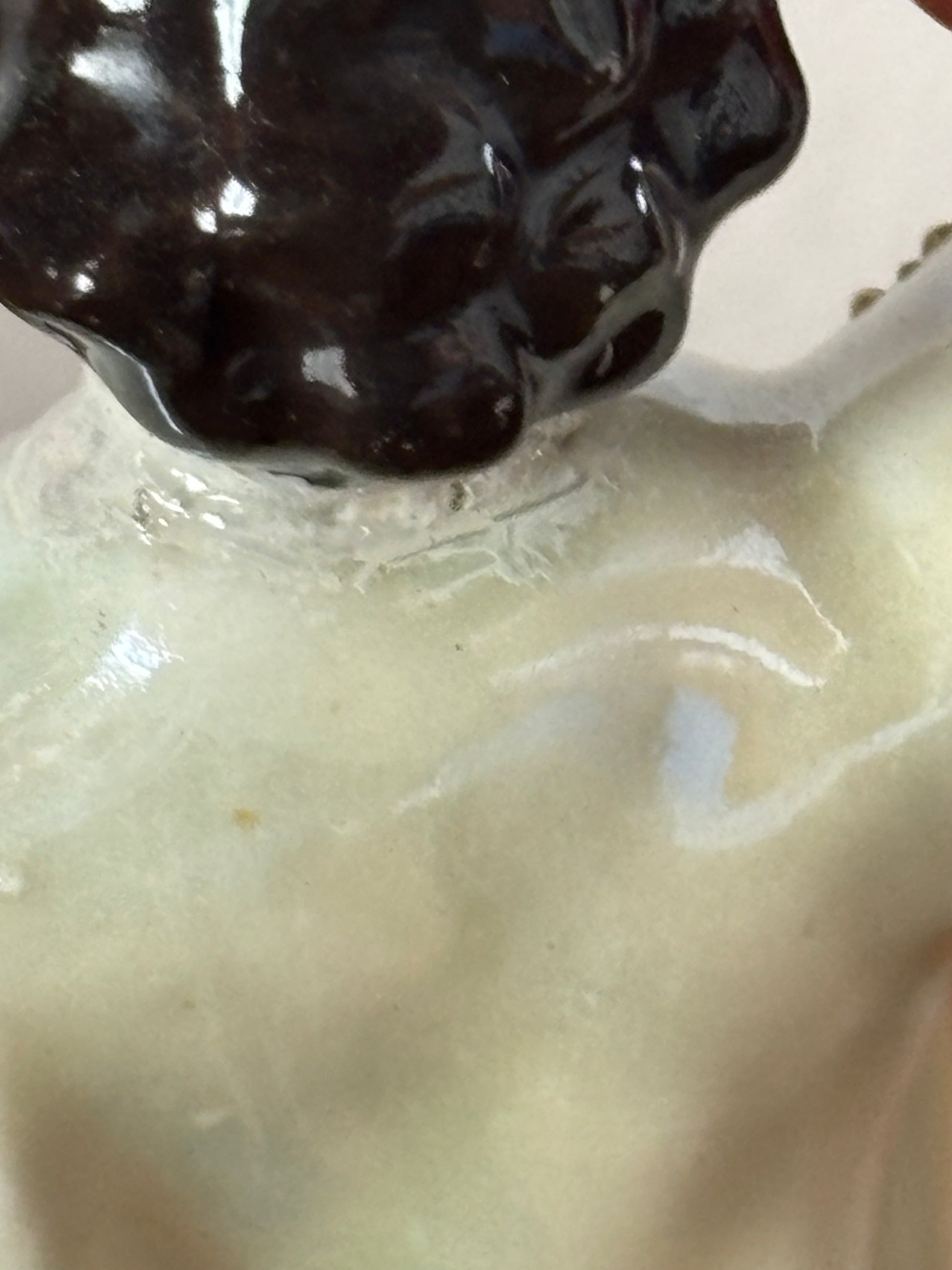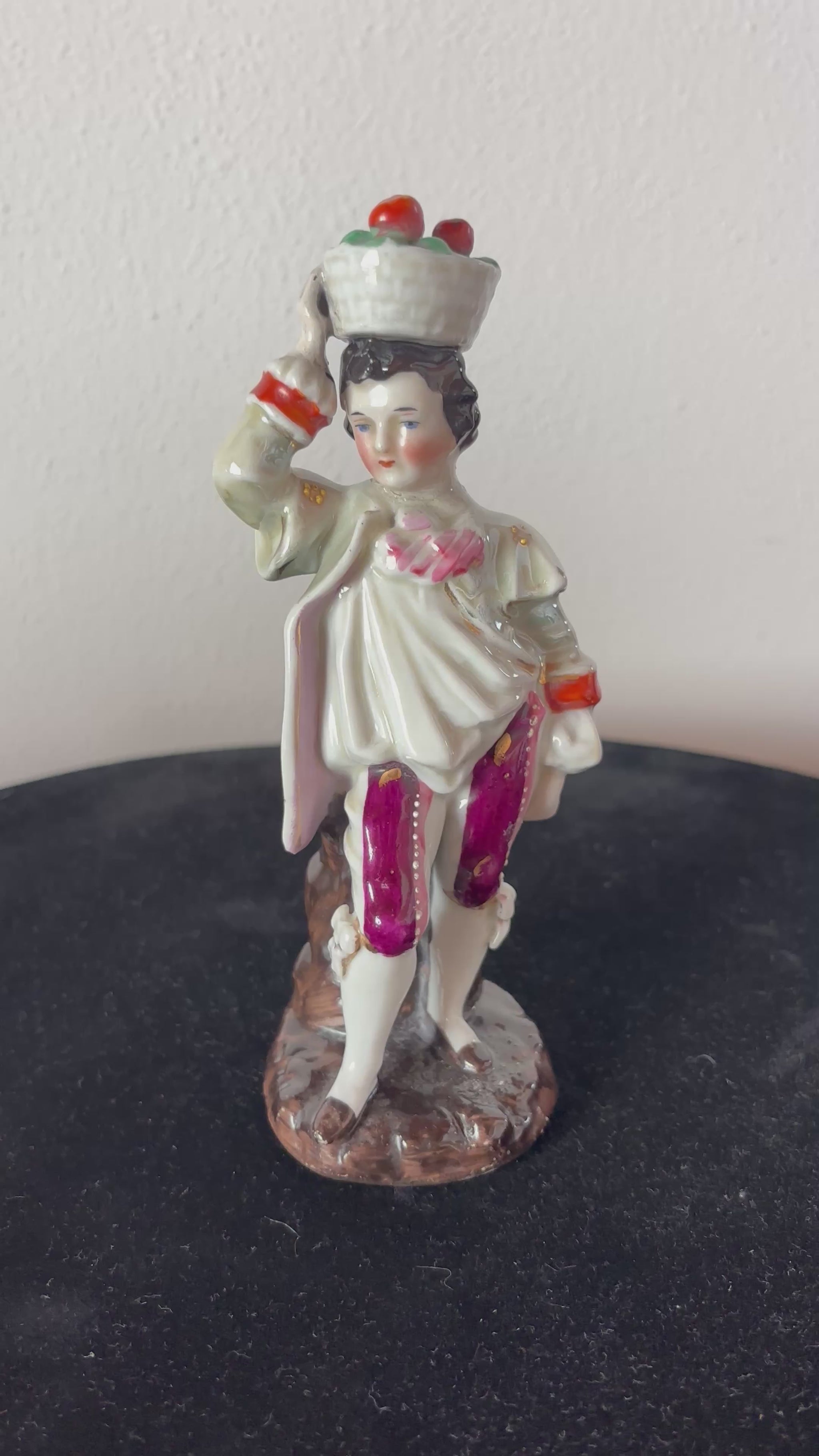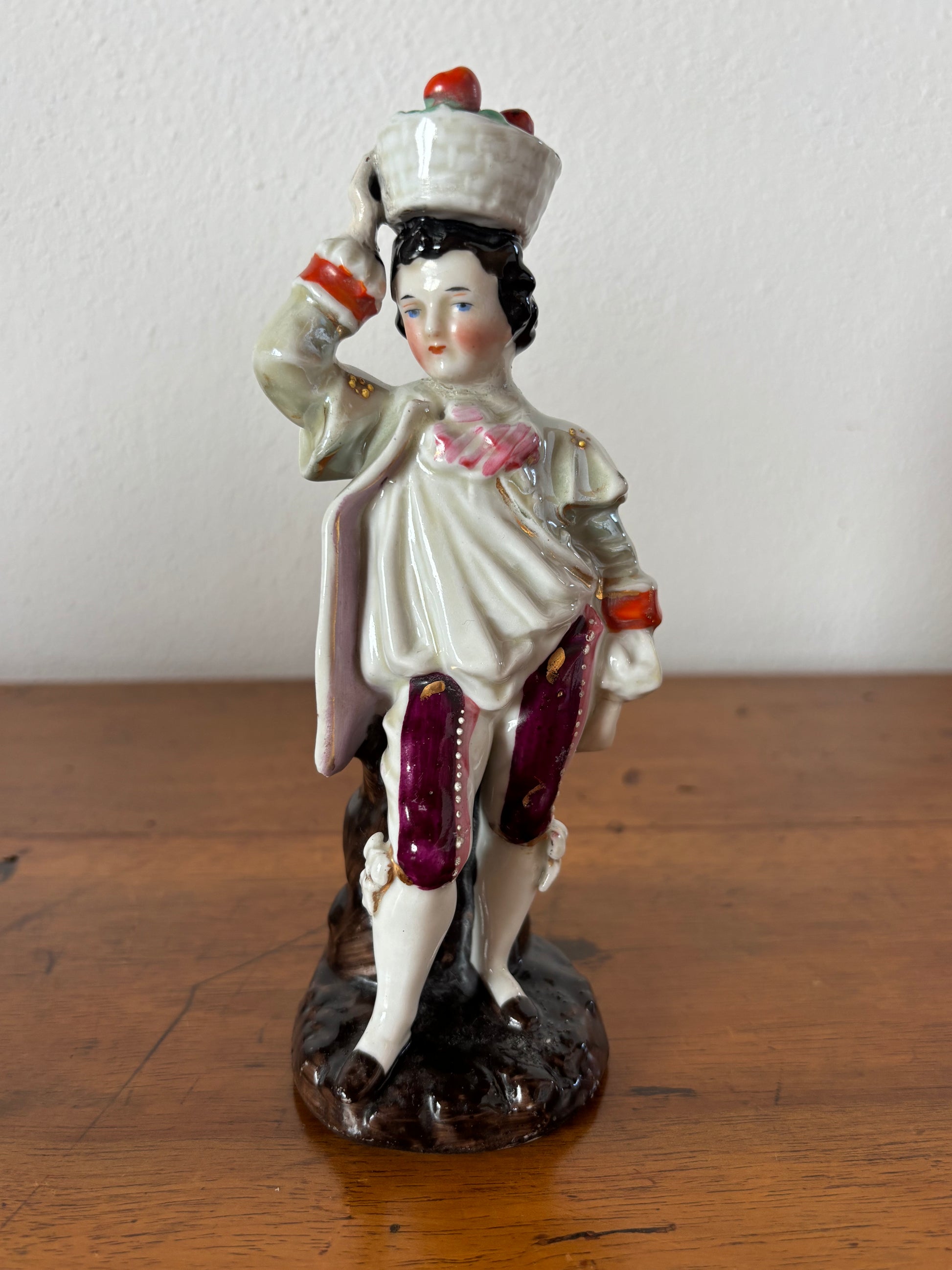 La testa è stata riattaccata con attenzione e la mano che regge il cesto è stata rifatta, interventi che non compromettono l’estetica generale. L’espressione del volto, i capelli neri ondulati e la postura leggermente inclinata conferiscono al pezzo un fascino teatrale e decorativo, tipico delle figurine Staffordshire di epoca vittoriana.