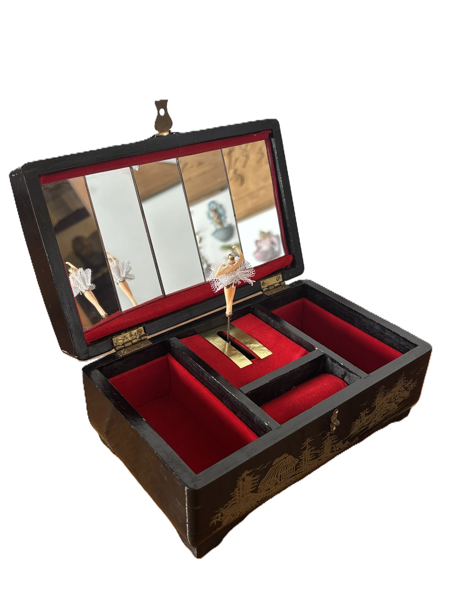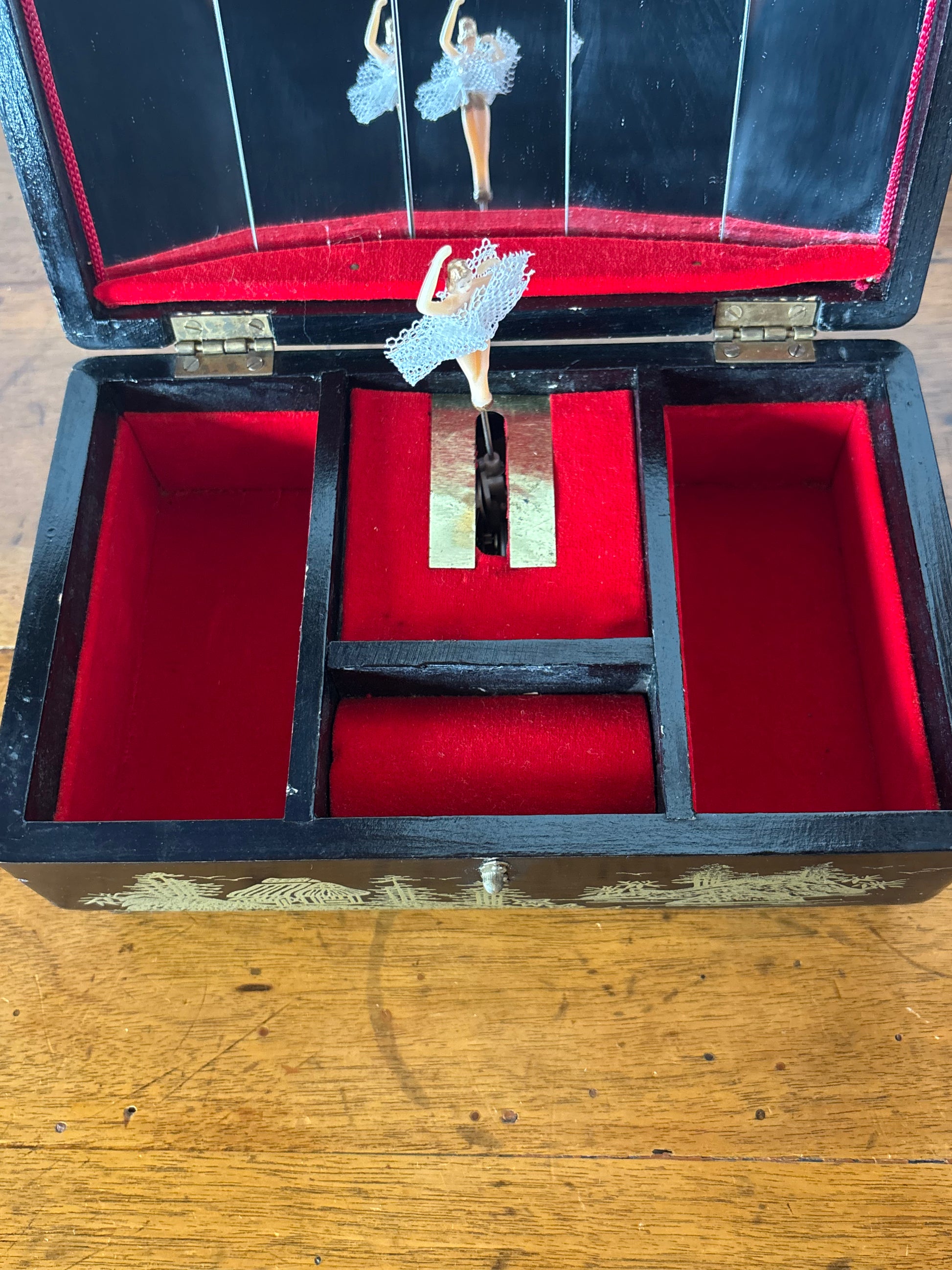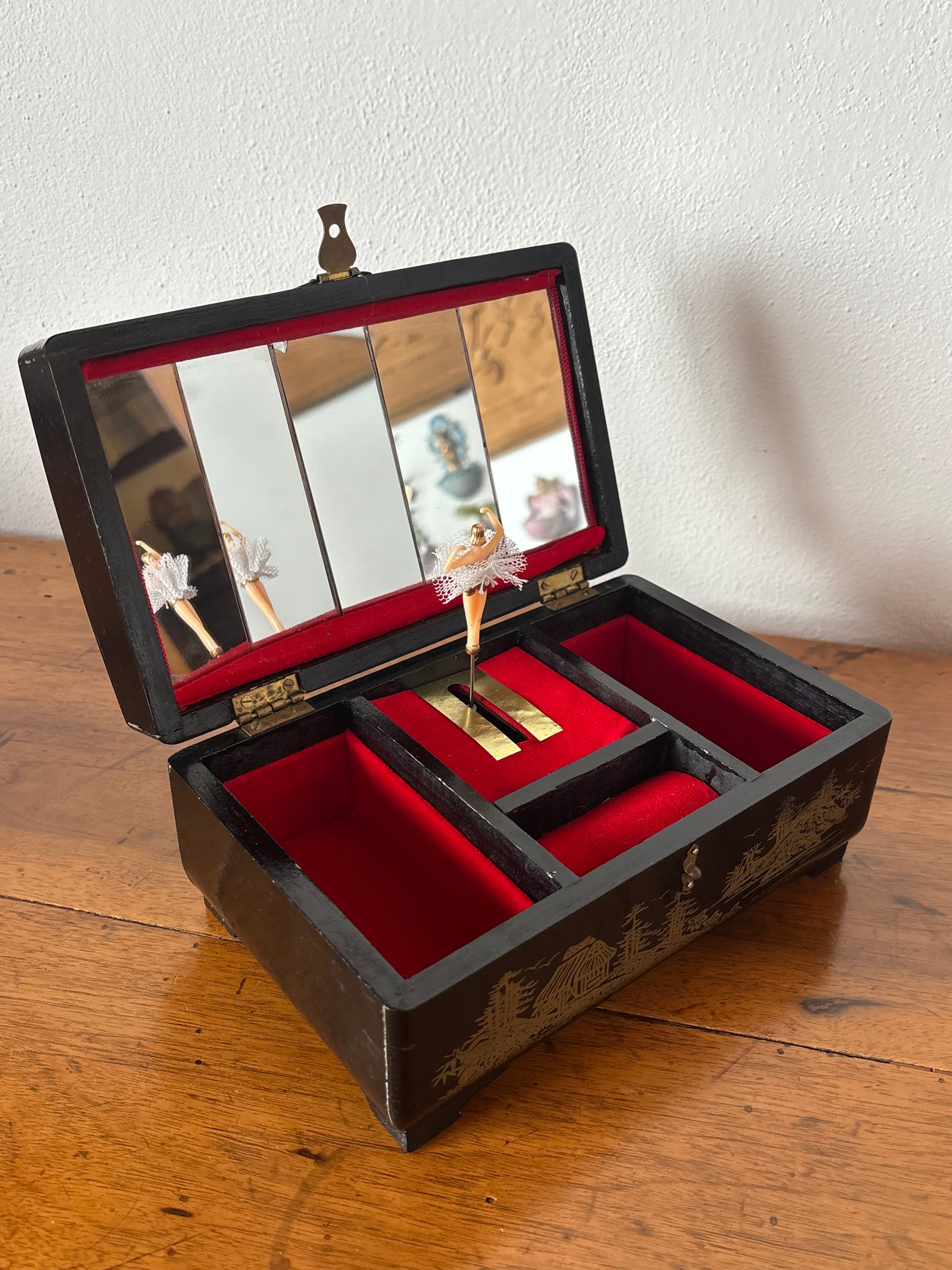 Il carillon integrato è perfettamente funzionante e si attiva sollevando il coperchio. L’interno è suddiviso in scomparti rivestiti in velluto rosso, ideali per custodire gioielli, piccoli accessori o ricordi personali.