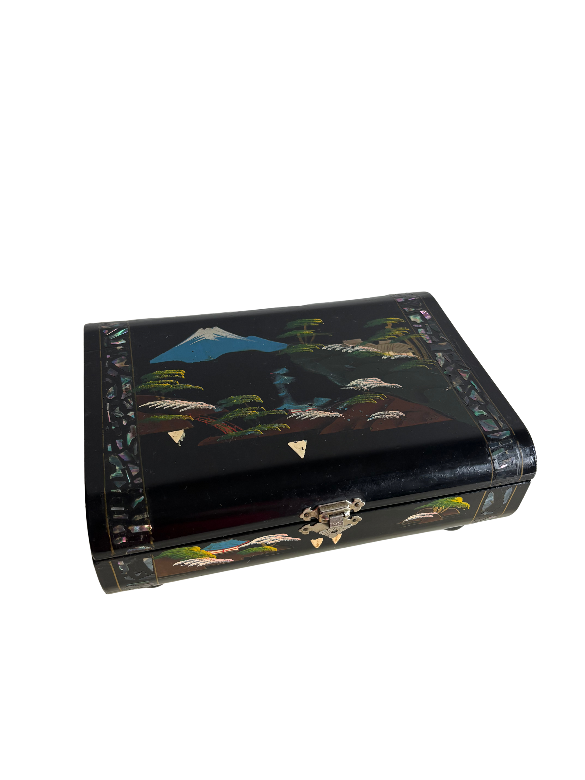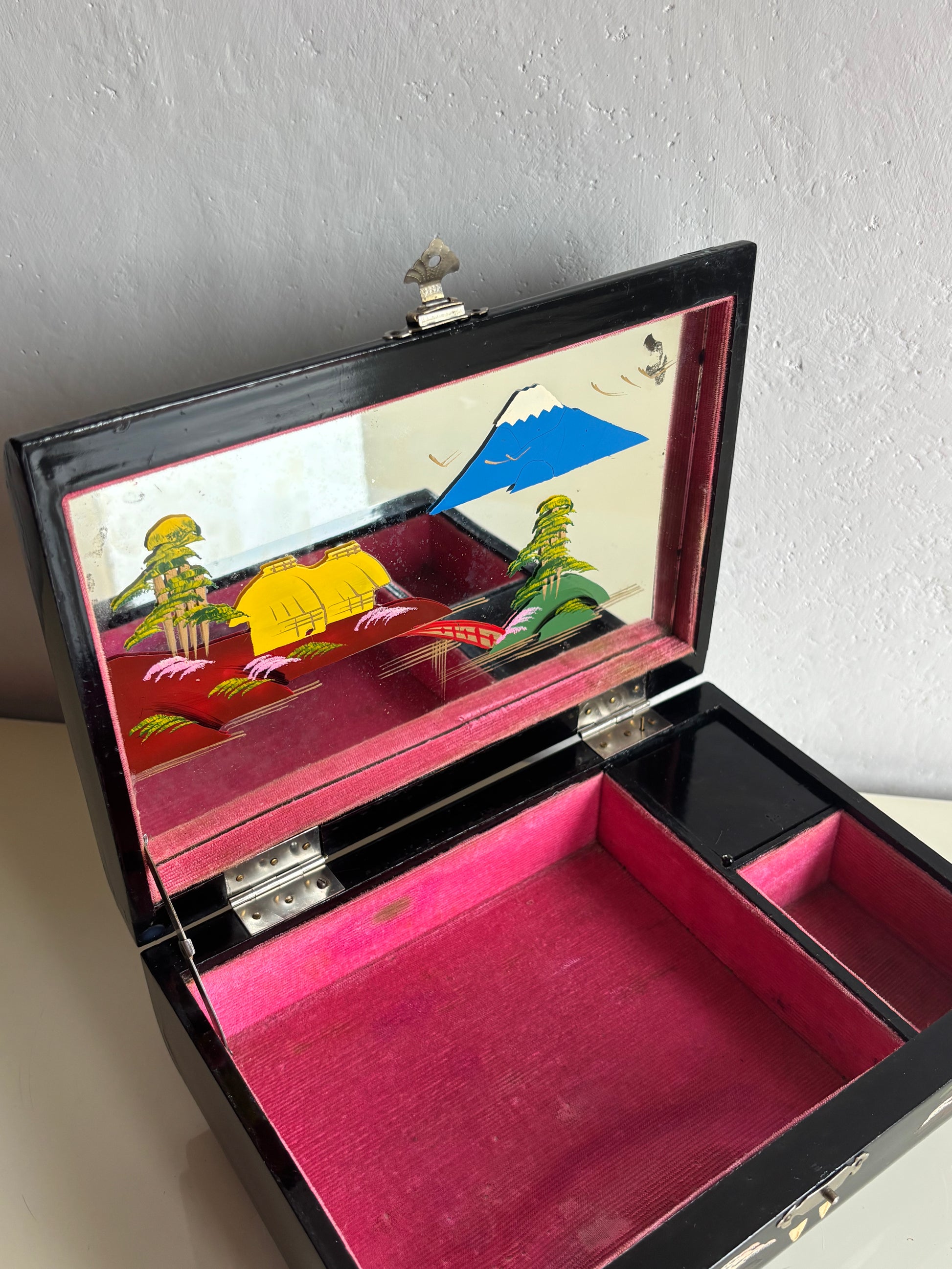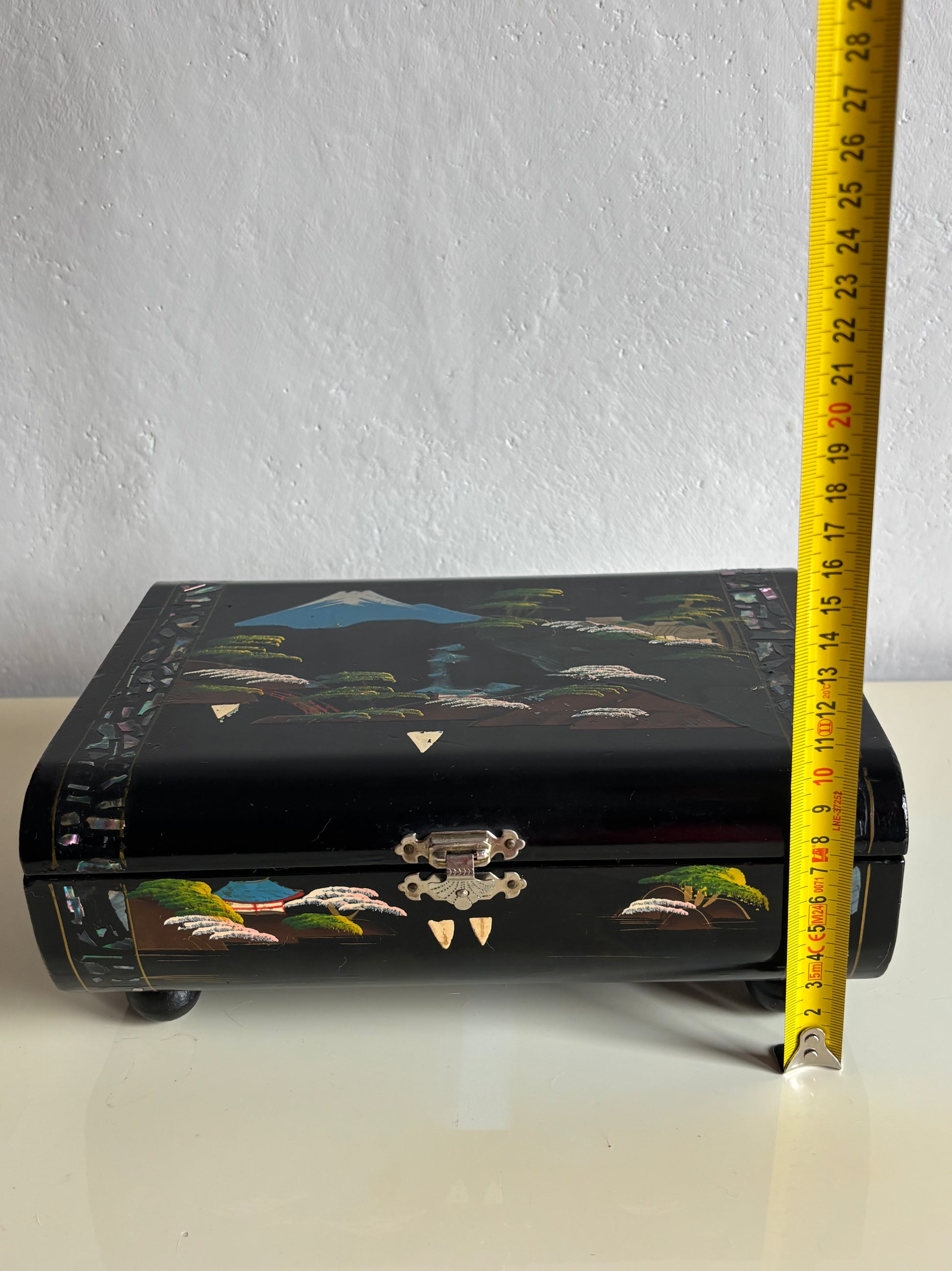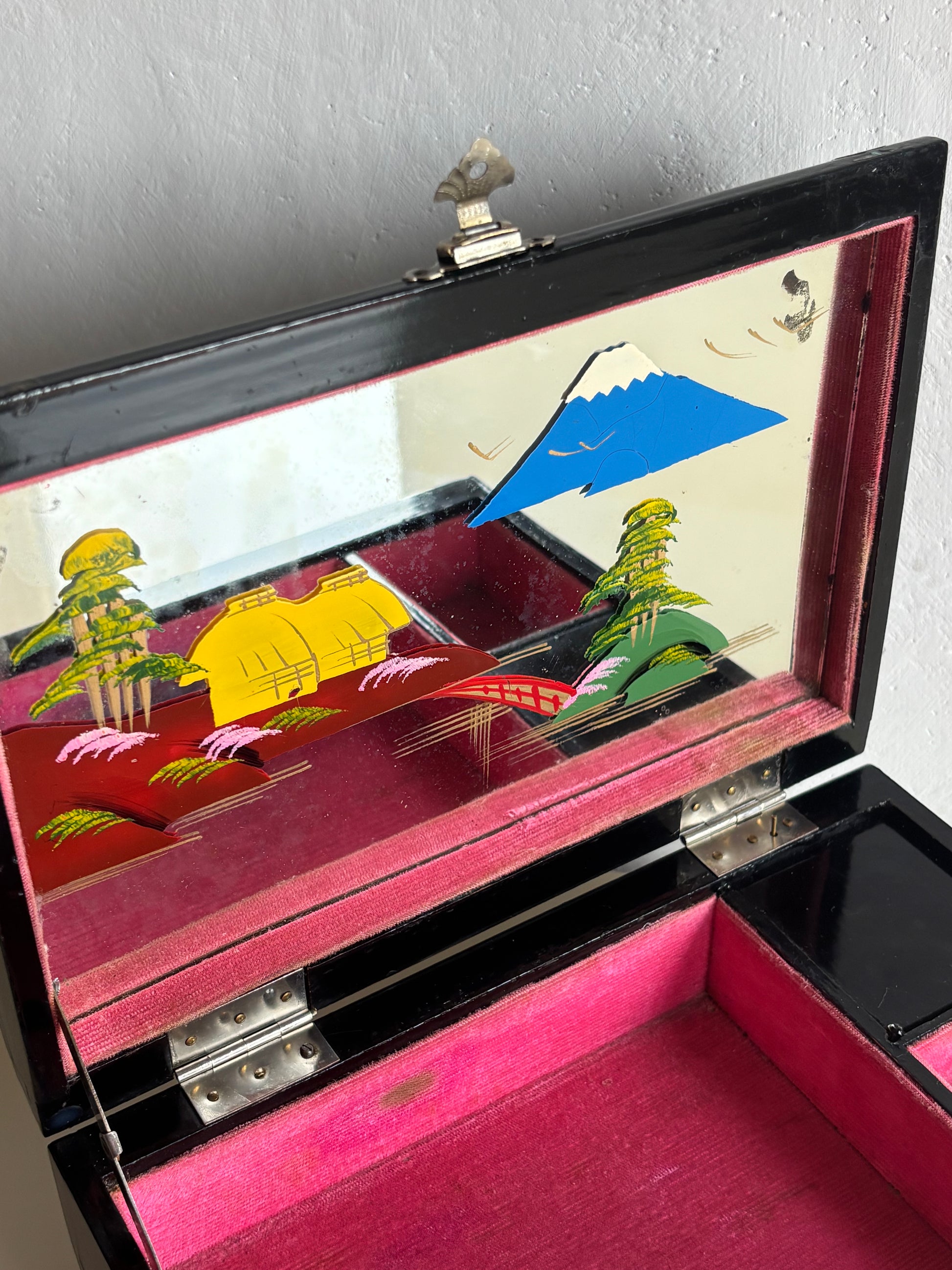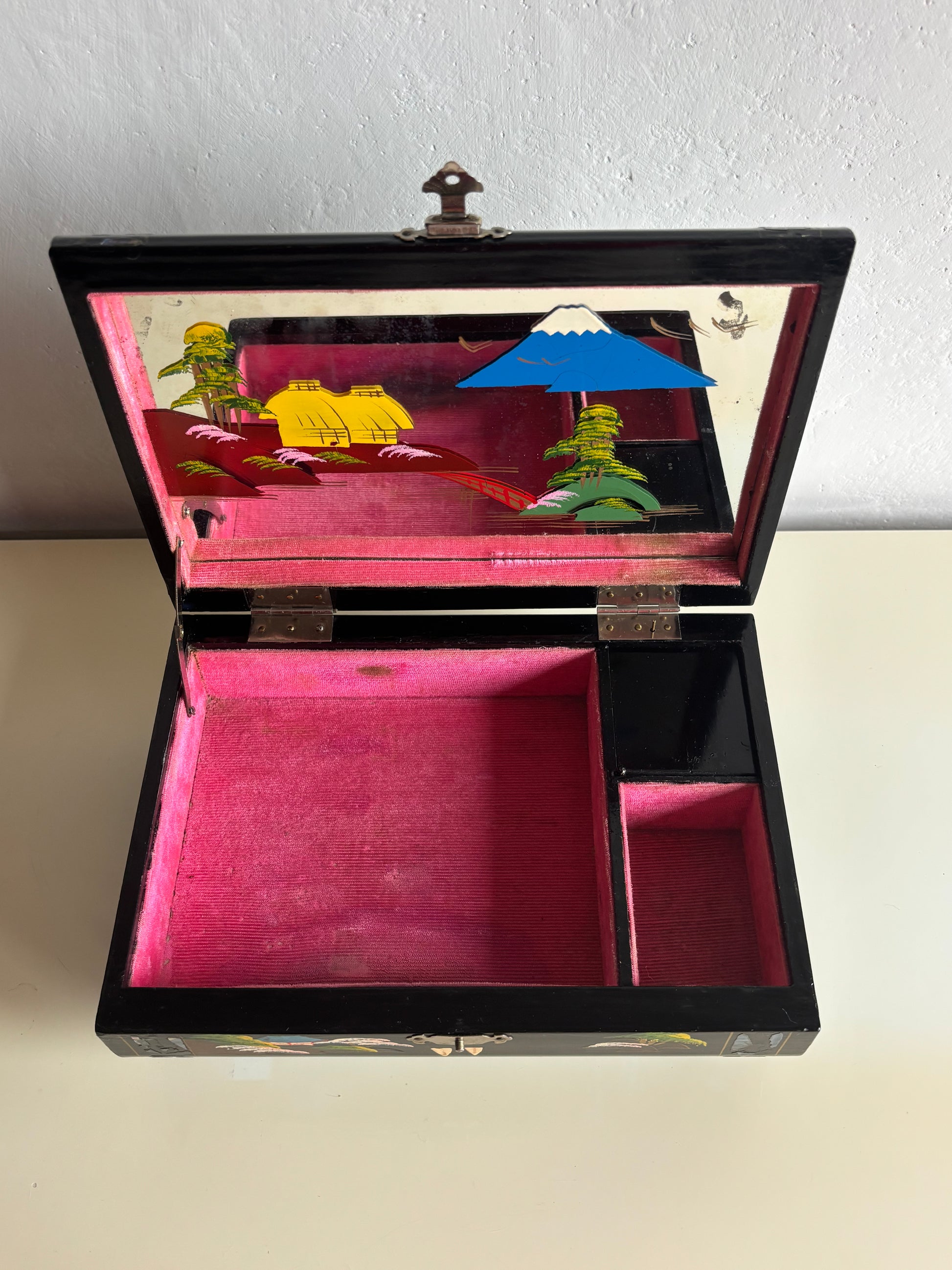 Elegante portagioie giapponese risalente agli anni ’50/’60, realizzato in legno laccato nero con raffinati inserti e decorazioni dipinte. Il coperchio esterno presenta una scena paesaggistica con il Monte Fuji, edifici tradizionali e dettagli naturalistici, mentre l’interno è foderato in velluto rosa e arricchito da uno specchio decorato con una vivace illustrazione dello stesso paesaggio.Il carillon è funzionante e riproduce la celebre melodia El puente sobre el río Kwai, aggiungendo un tocco nostalgico e cinematografico all’esperienza.