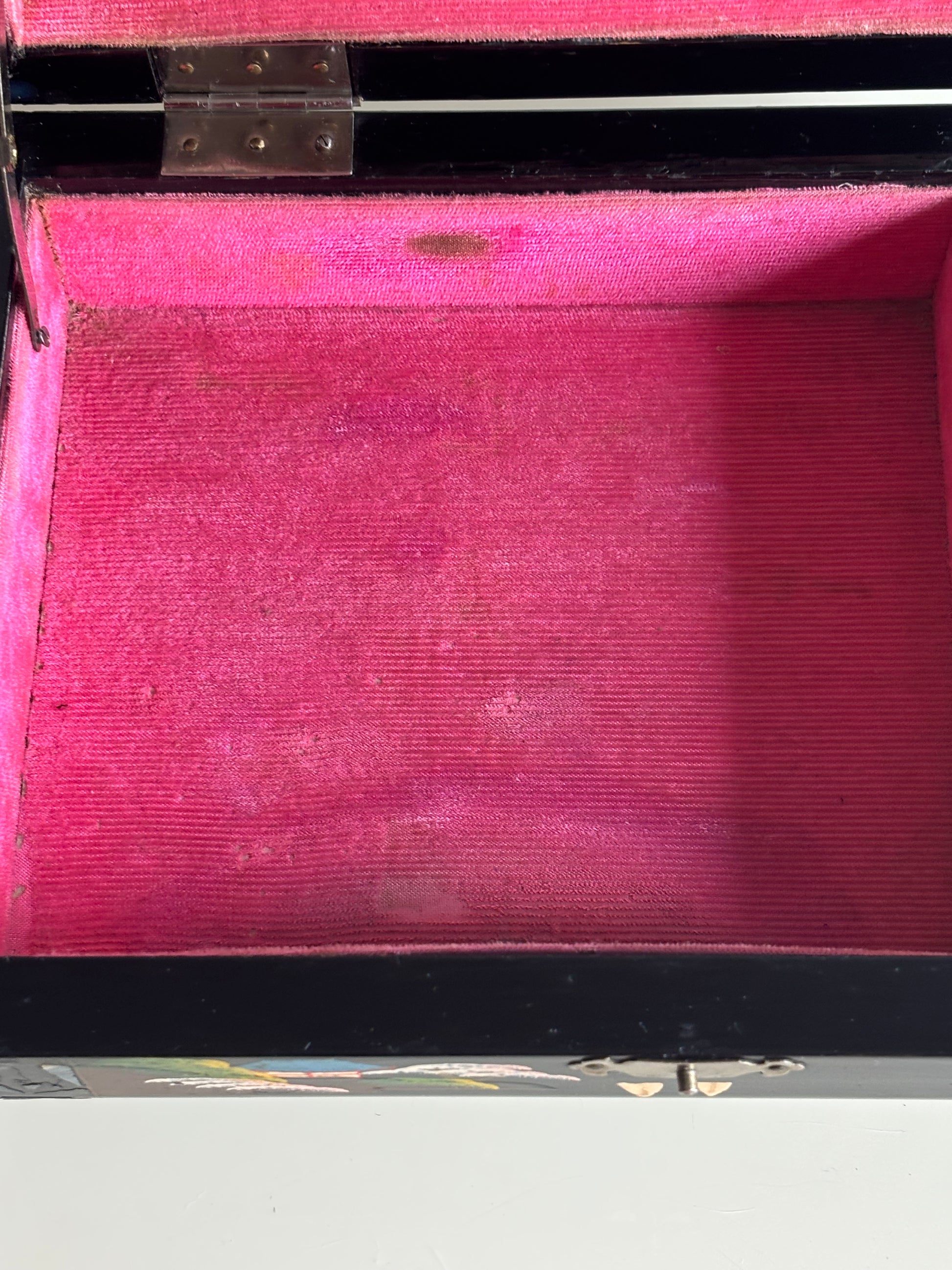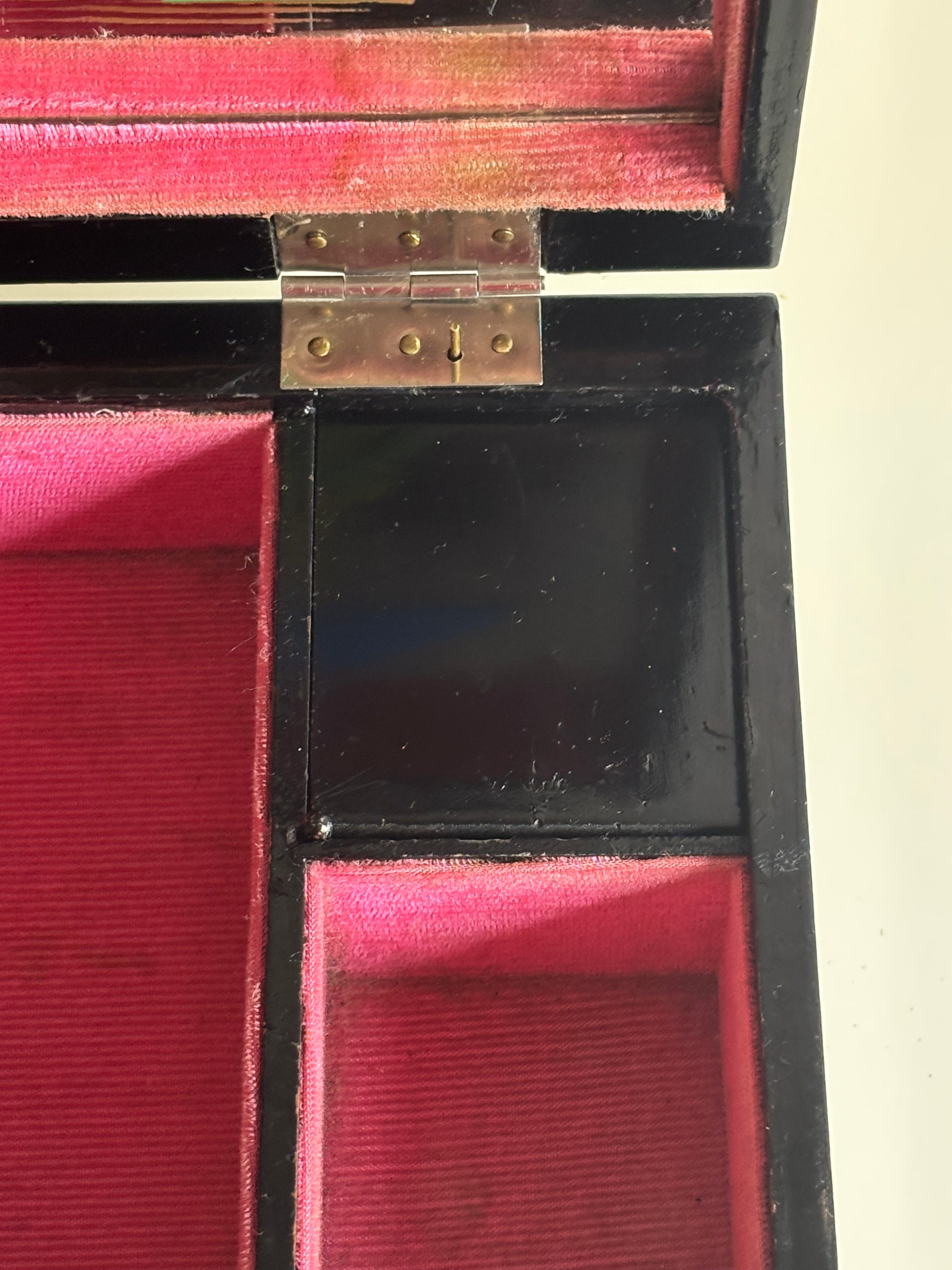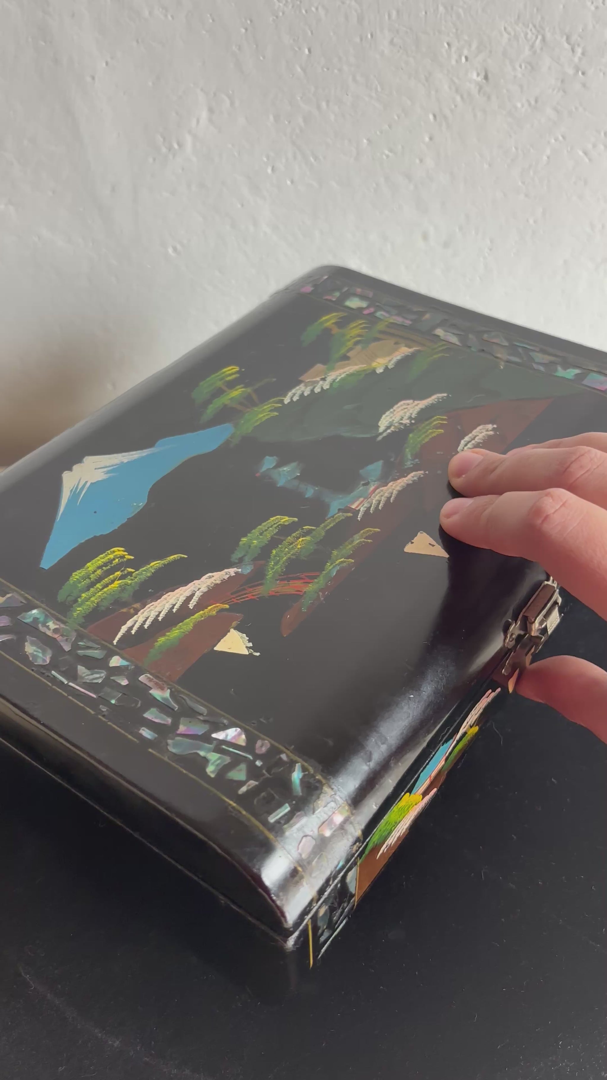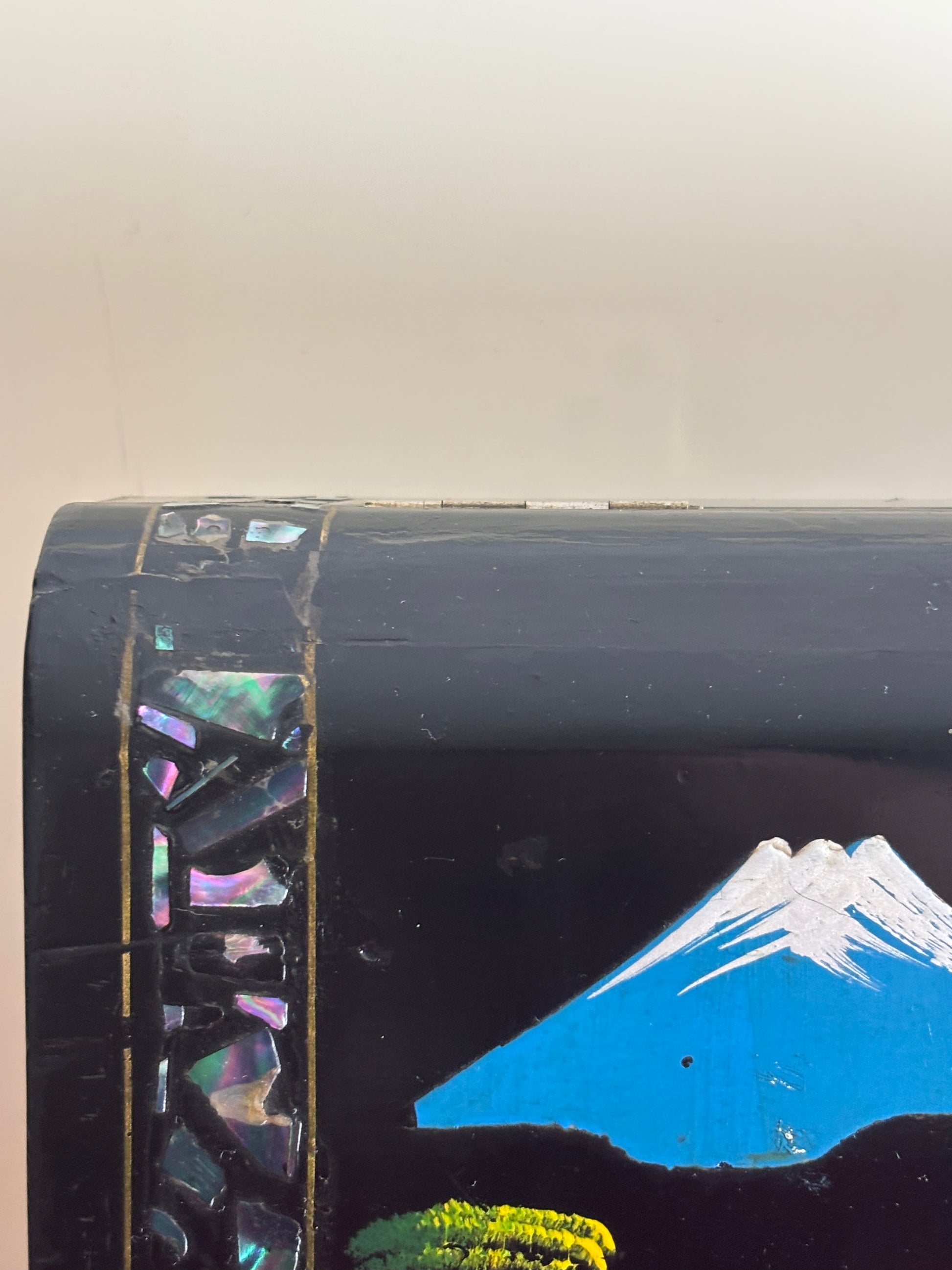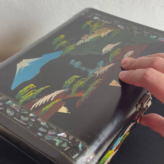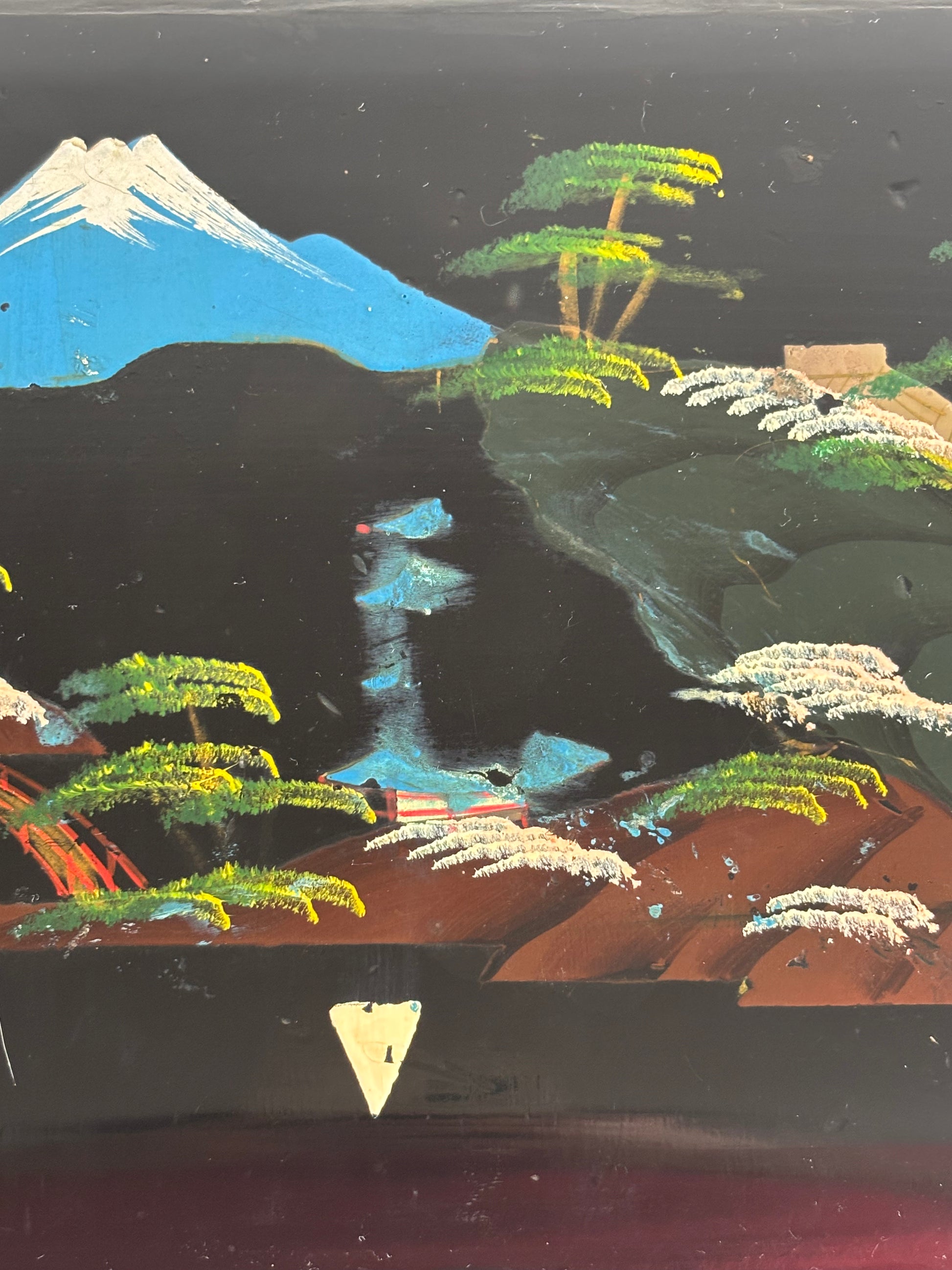 Elegante portagioie giapponese risalente agli anni ’50/’60, realizzato in legno laccato nero con raffinati inserti e decorazioni dipinte. Il coperchio esterno presenta una scena paesaggistica con il Monte Fuji, edifici tradizionali e dettagli naturalistici, mentre l’interno è foderato in velluto rosa e arricchito da uno specchio decorato con una vivace illustrazione dello stesso paesaggio.Il carillon è funzionante e riproduce la celebre melodia El puente sobre el río Kwai, aggiungendo un tocco nostalgico e cinematografico all’esperienza.