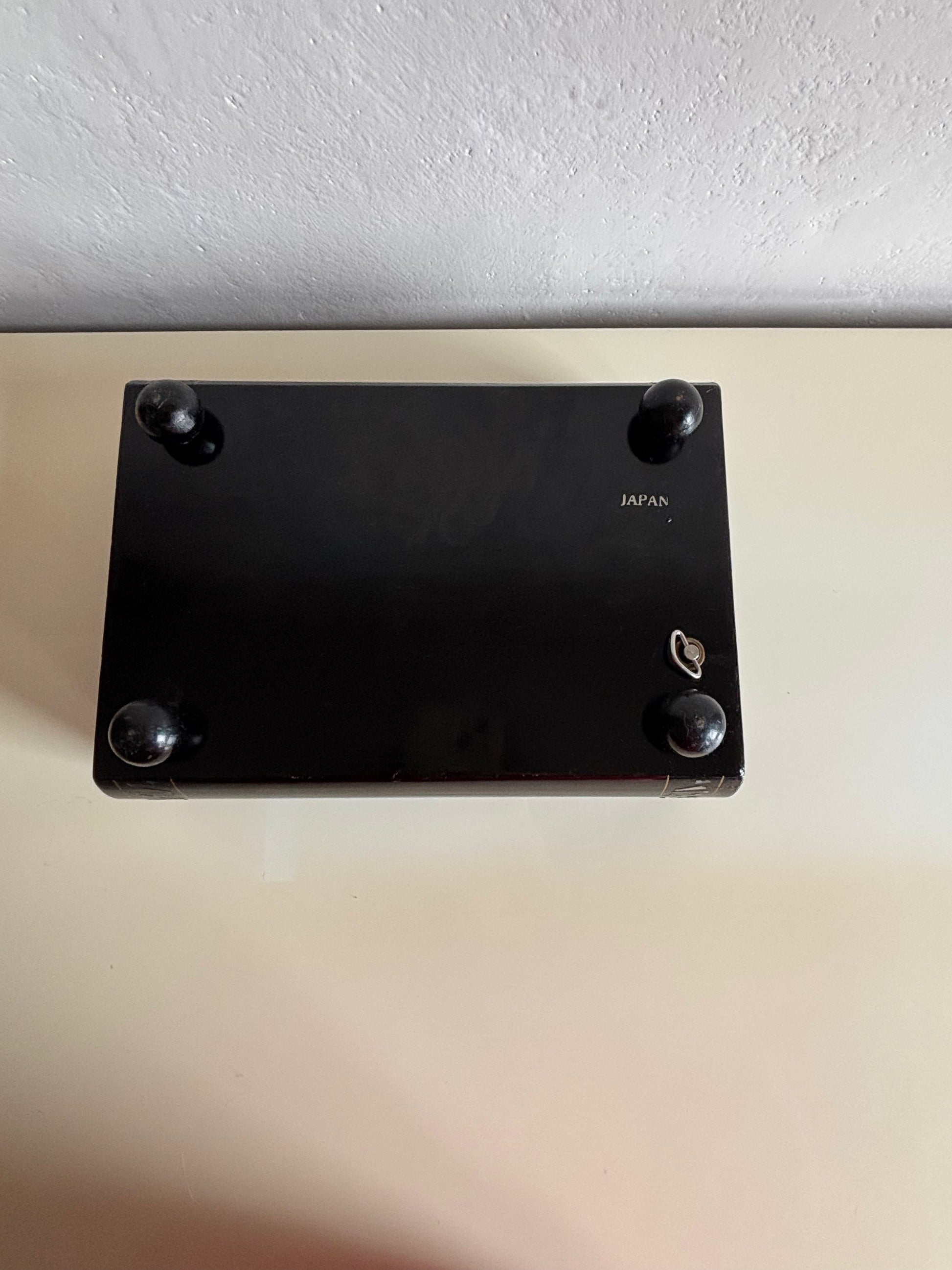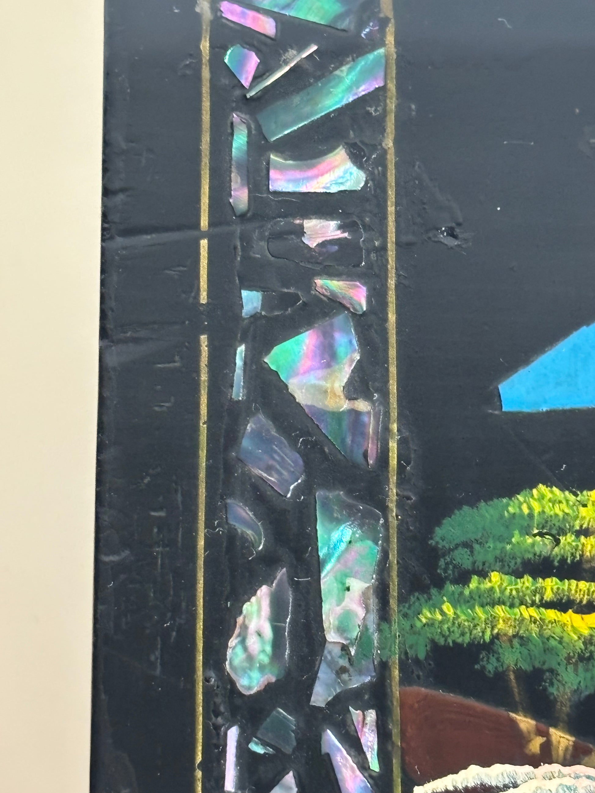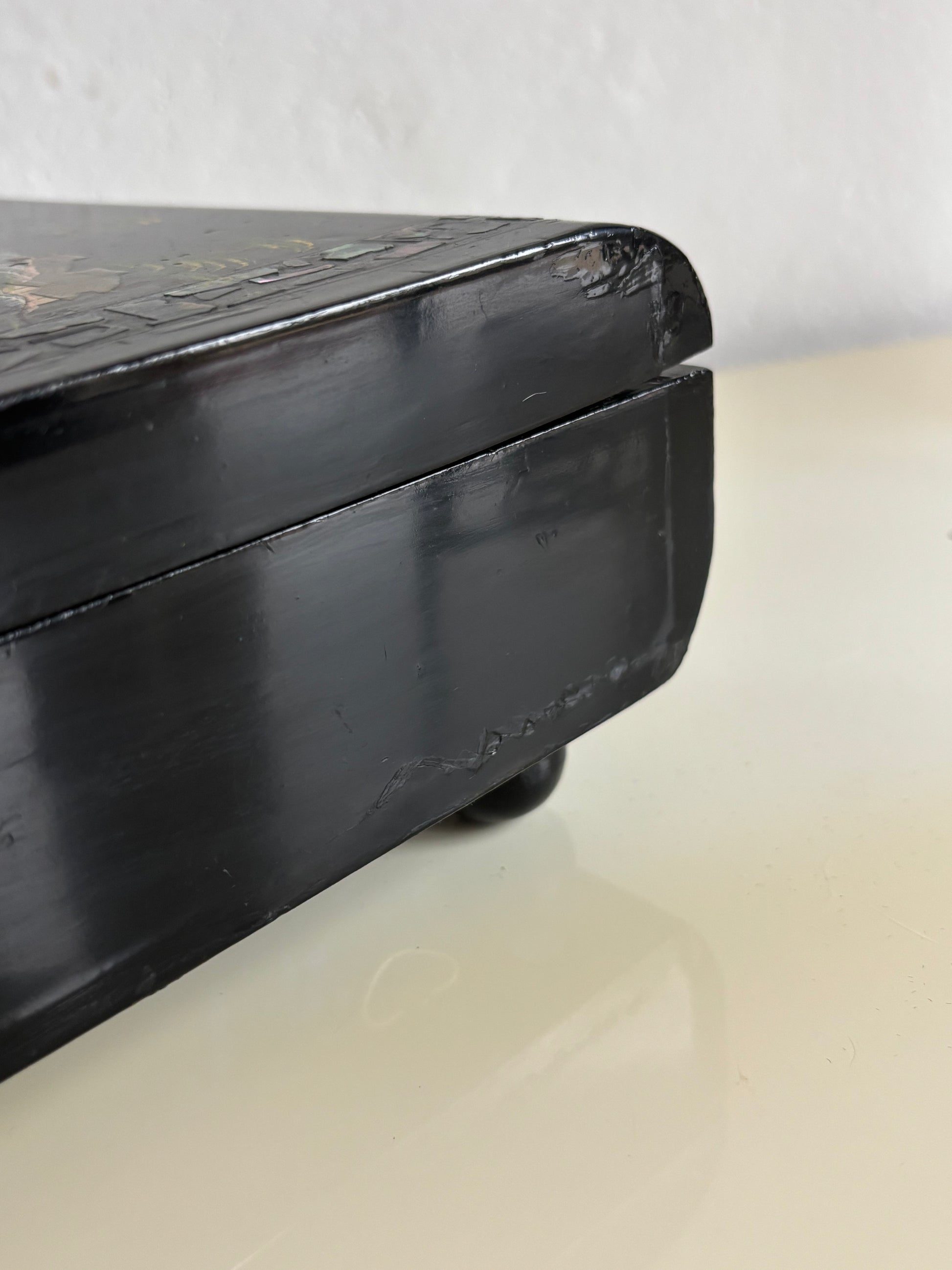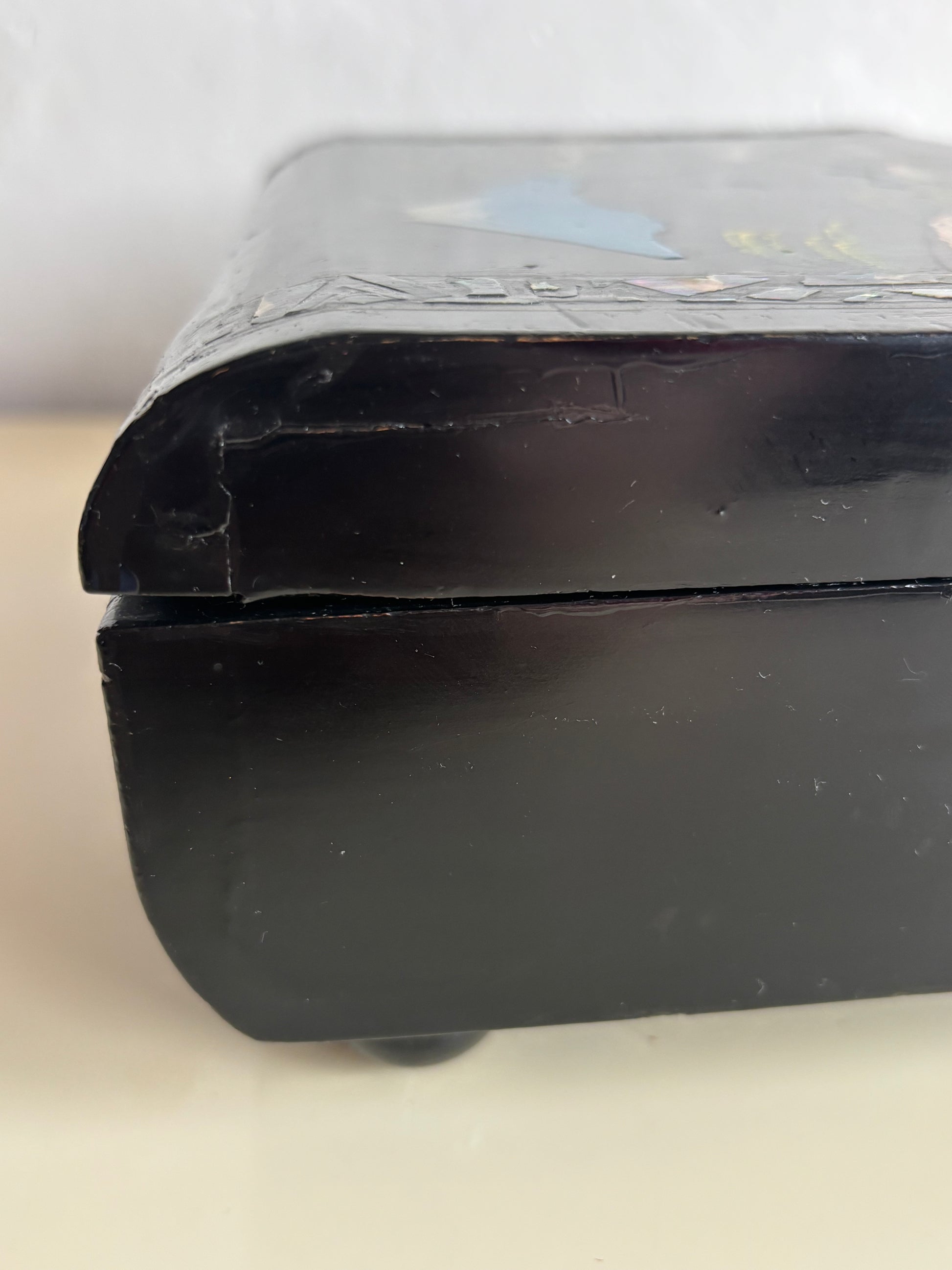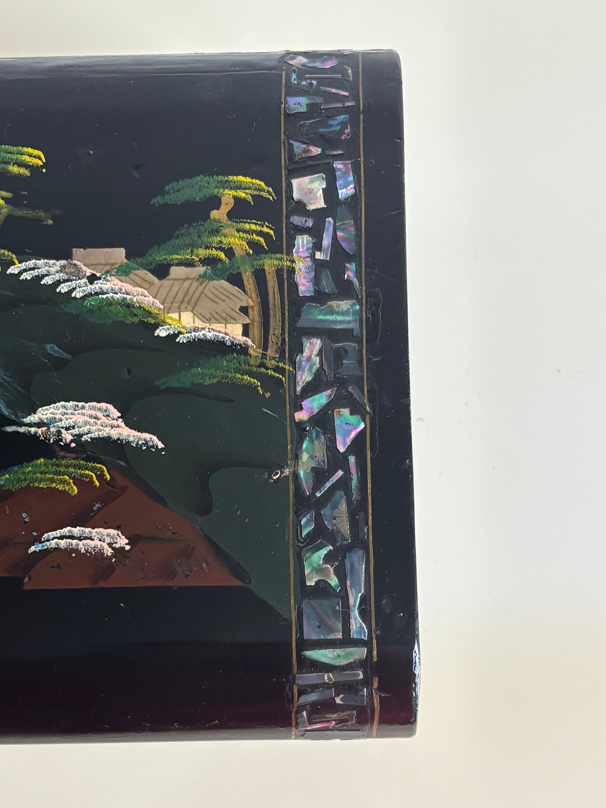 Elegante portagioie giapponese risalente agli anni ’50/’60, realizzato in legno laccato nero con raffinati inserti e decorazioni dipinte. Il coperchio esterno presenta una scena paesaggistica con il Monte Fuji, edifici tradizionali e dettagli naturalistici, mentre l’interno è foderato in velluto rosa e arricchito da uno specchio decorato con una vivace illustrazione dello stesso paesaggio.Il carillon è funzionante e riproduce la celebre melodia El puente sobre el río Kwai, aggiungendo un tocco nostalgico e cinematografico all’esperienza.