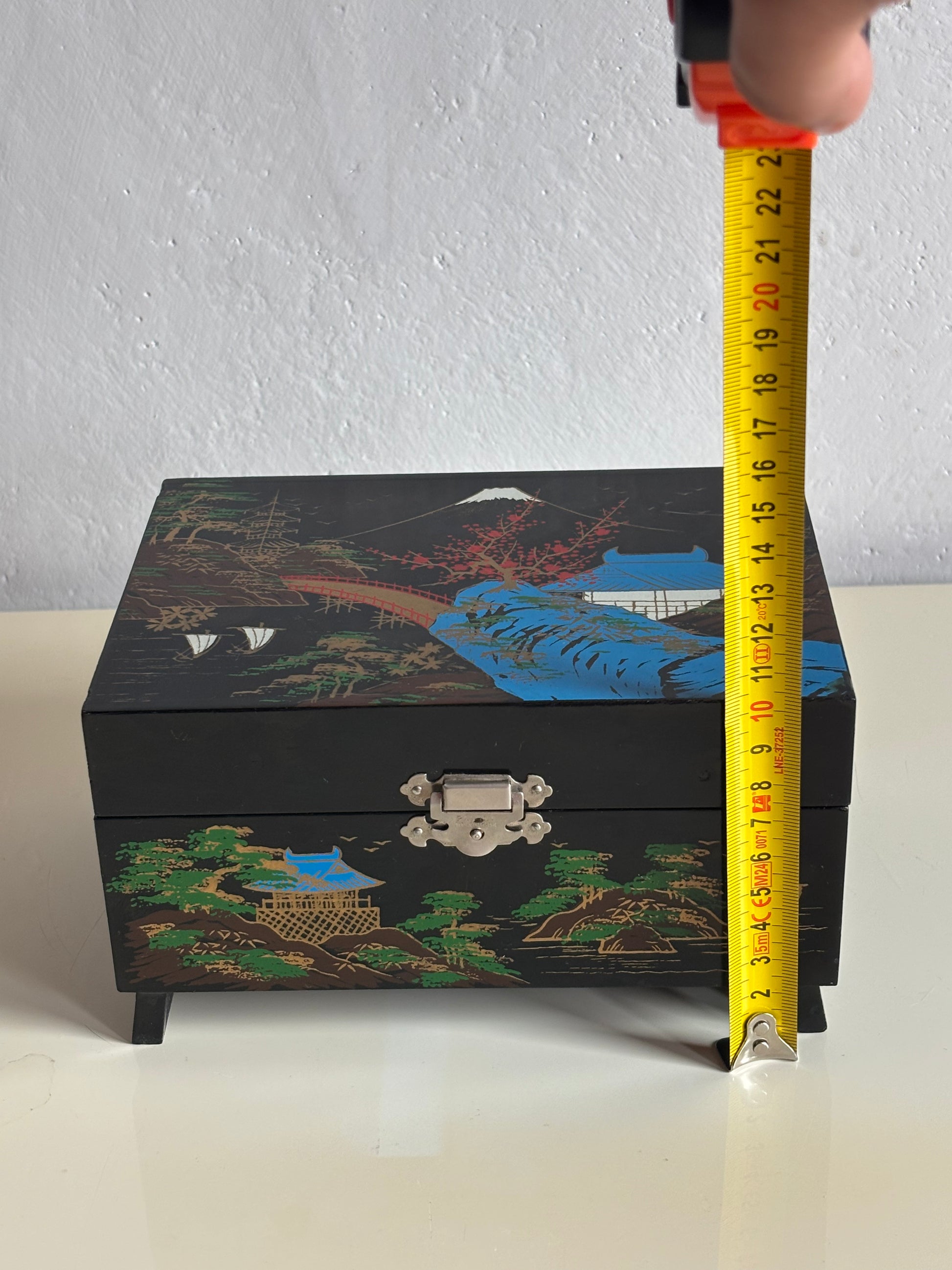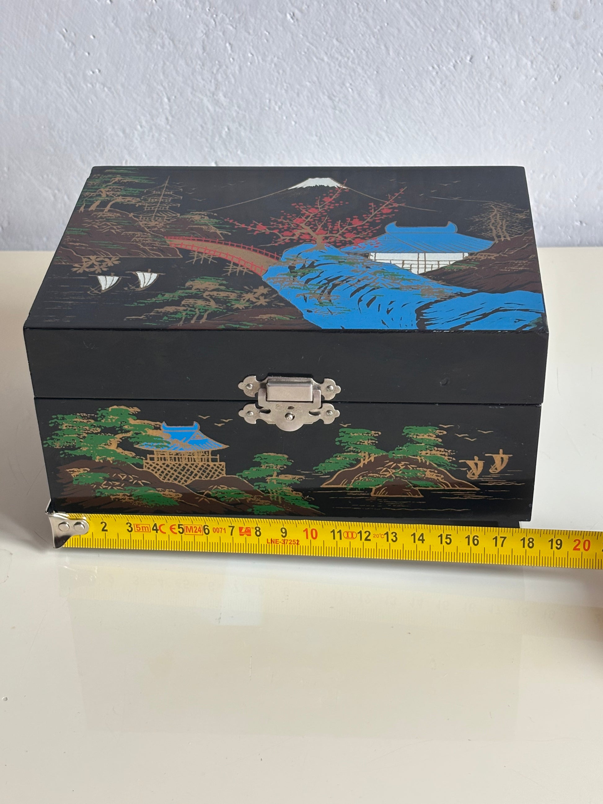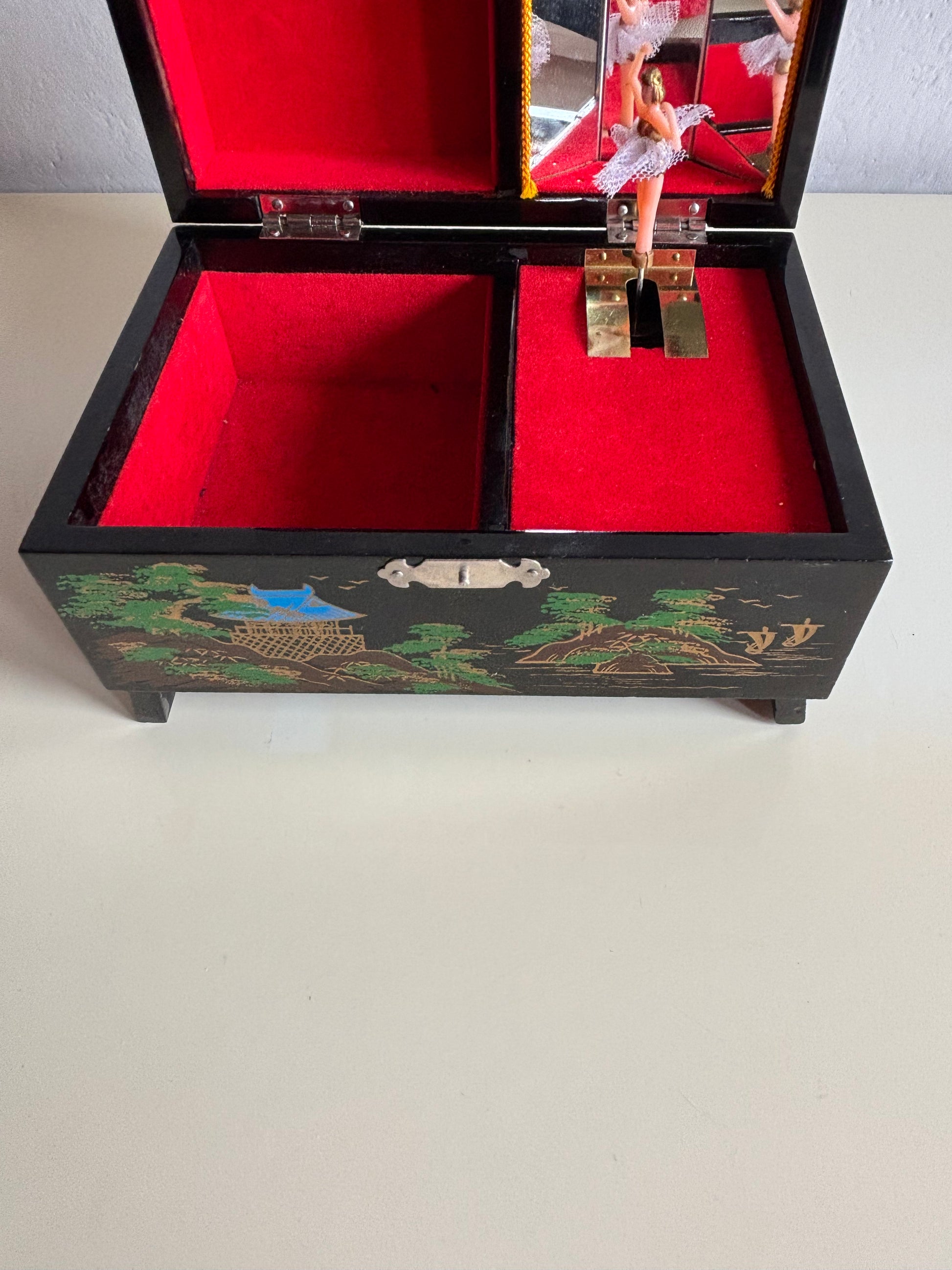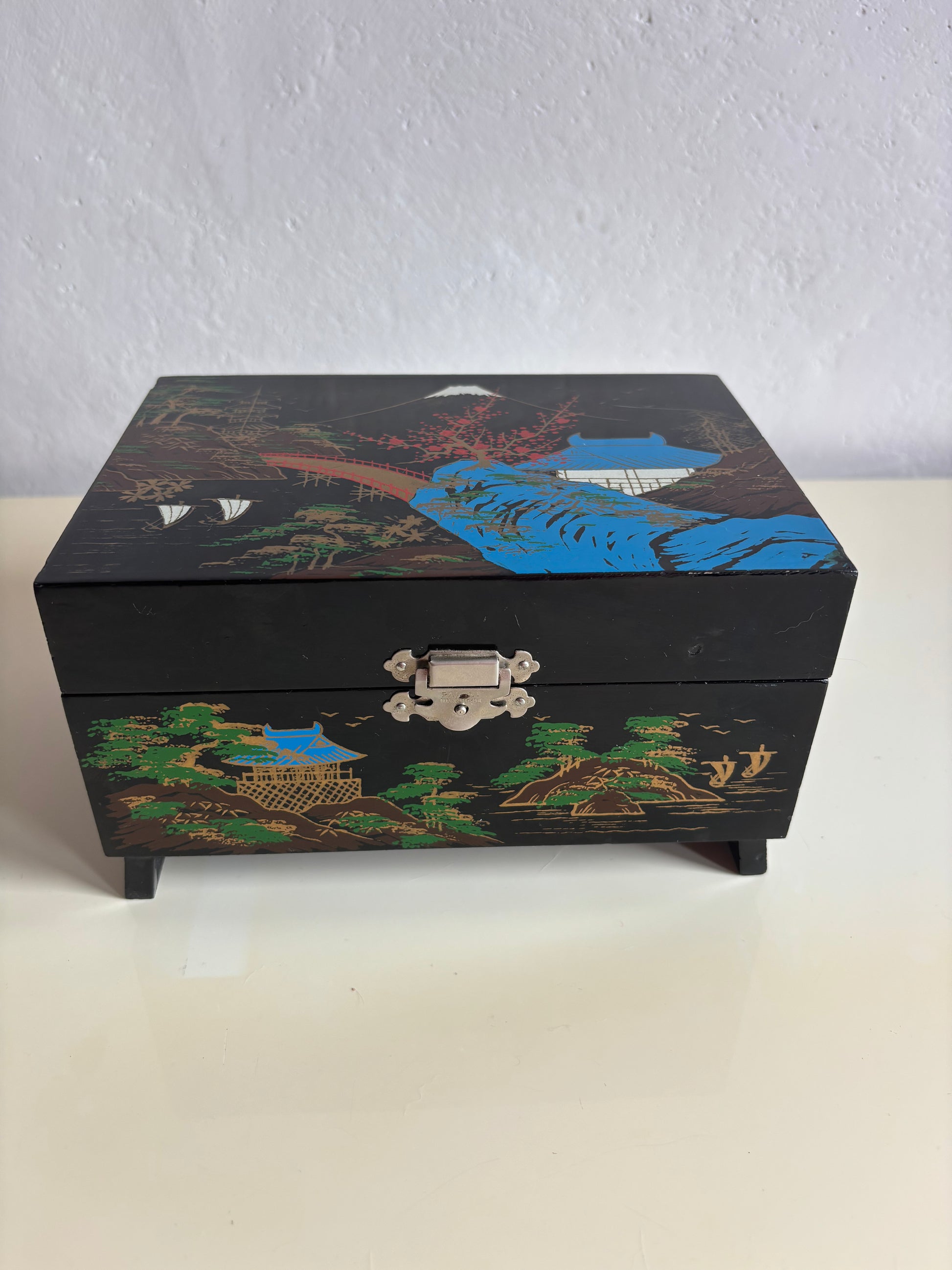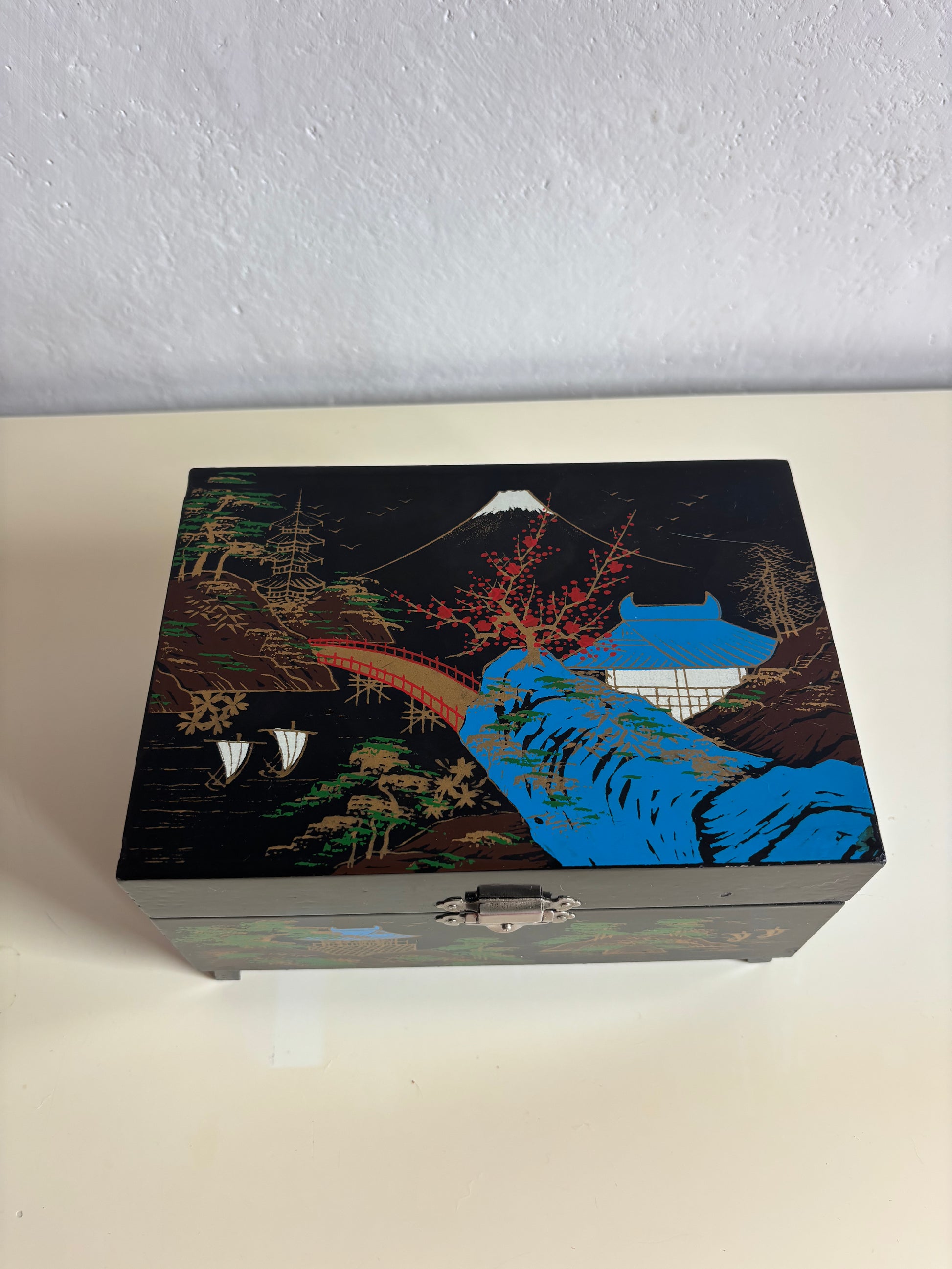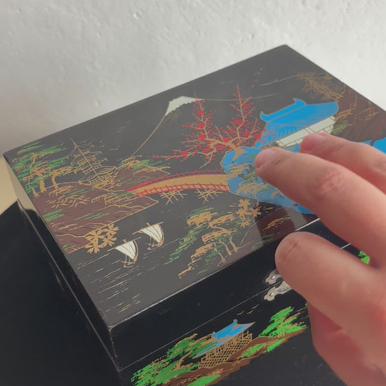 Portagioie giapponese degli anni ’80, realizzato in legno laccato nero con decorazioni che raffigurano un paesaggio tradizionale: pagoda, alberi stilizzati, ponte arcuato e il Monte Fuji innevato sullo sfondo. L’interno è rivestito in velluto rosso e suddiviso in scomparti, con uno specchio incastonato nel coperchio e una ballerina in tutù bianco che ruota dolcemente al suono del carillon, perfettamente funzionante.