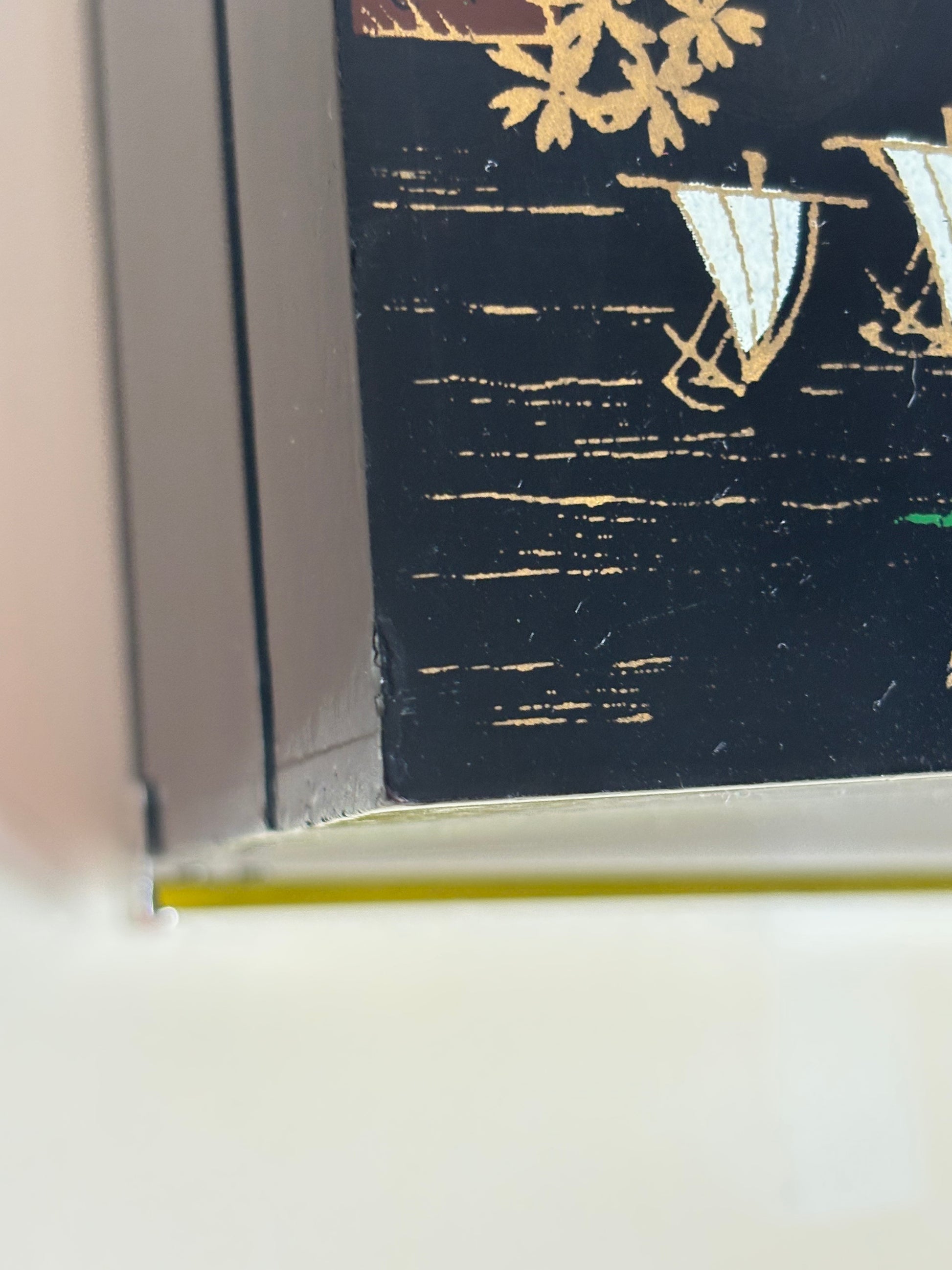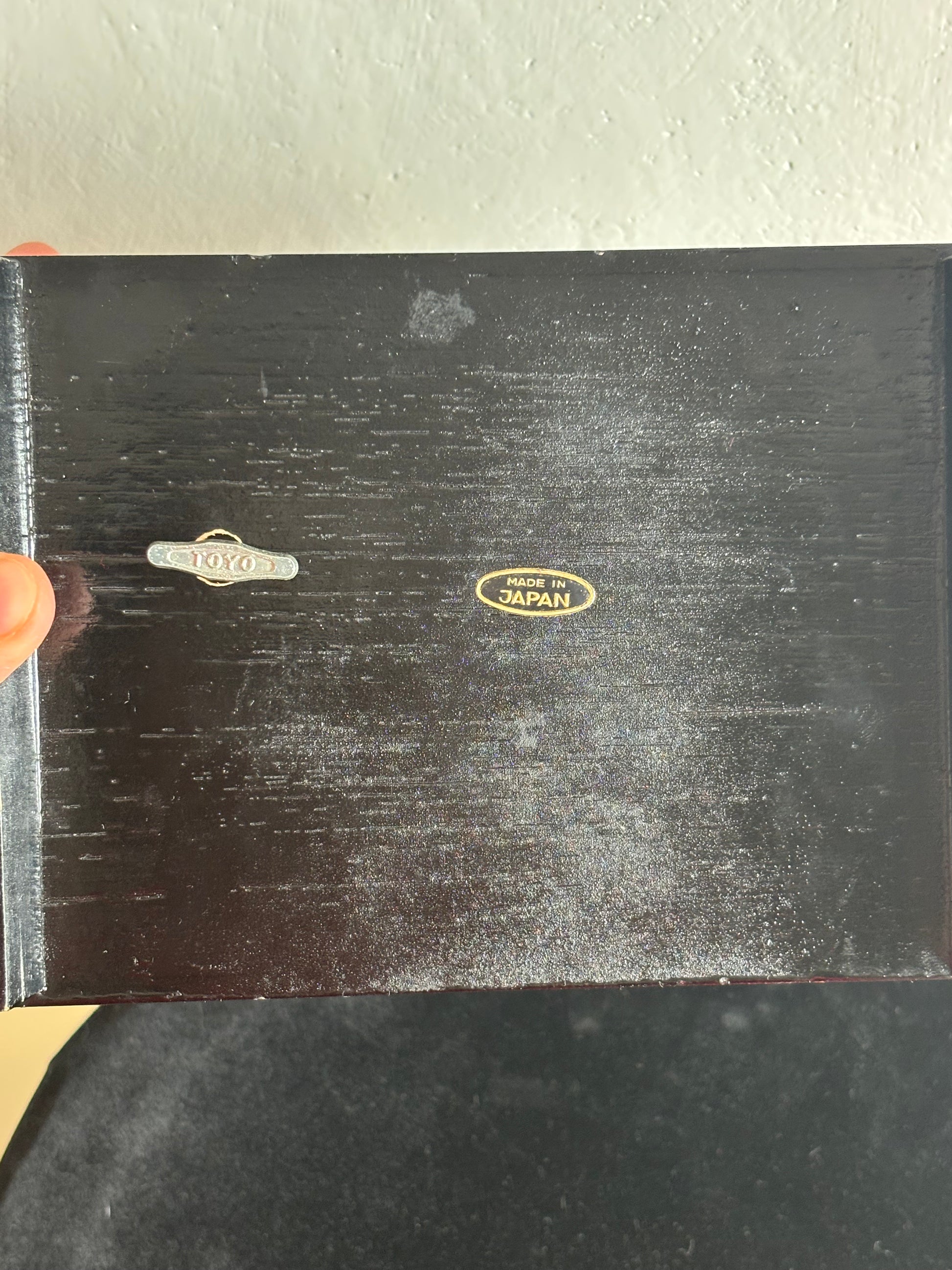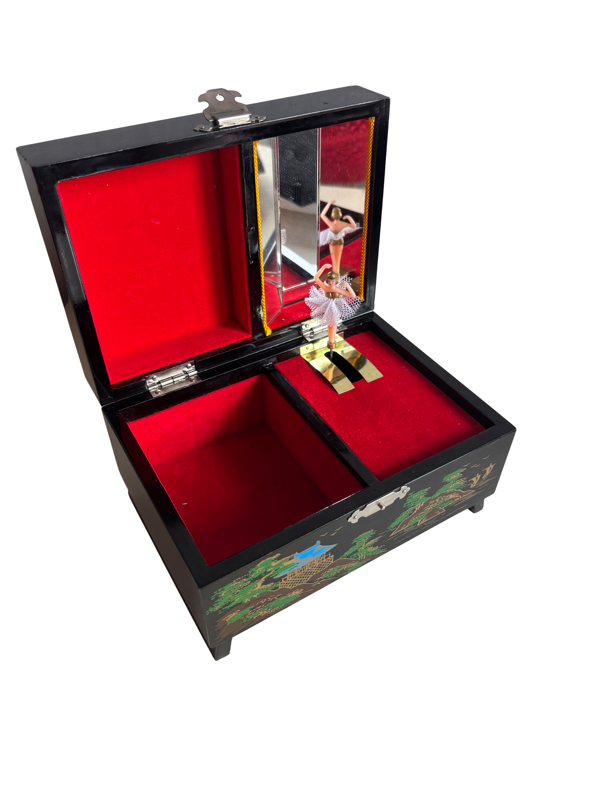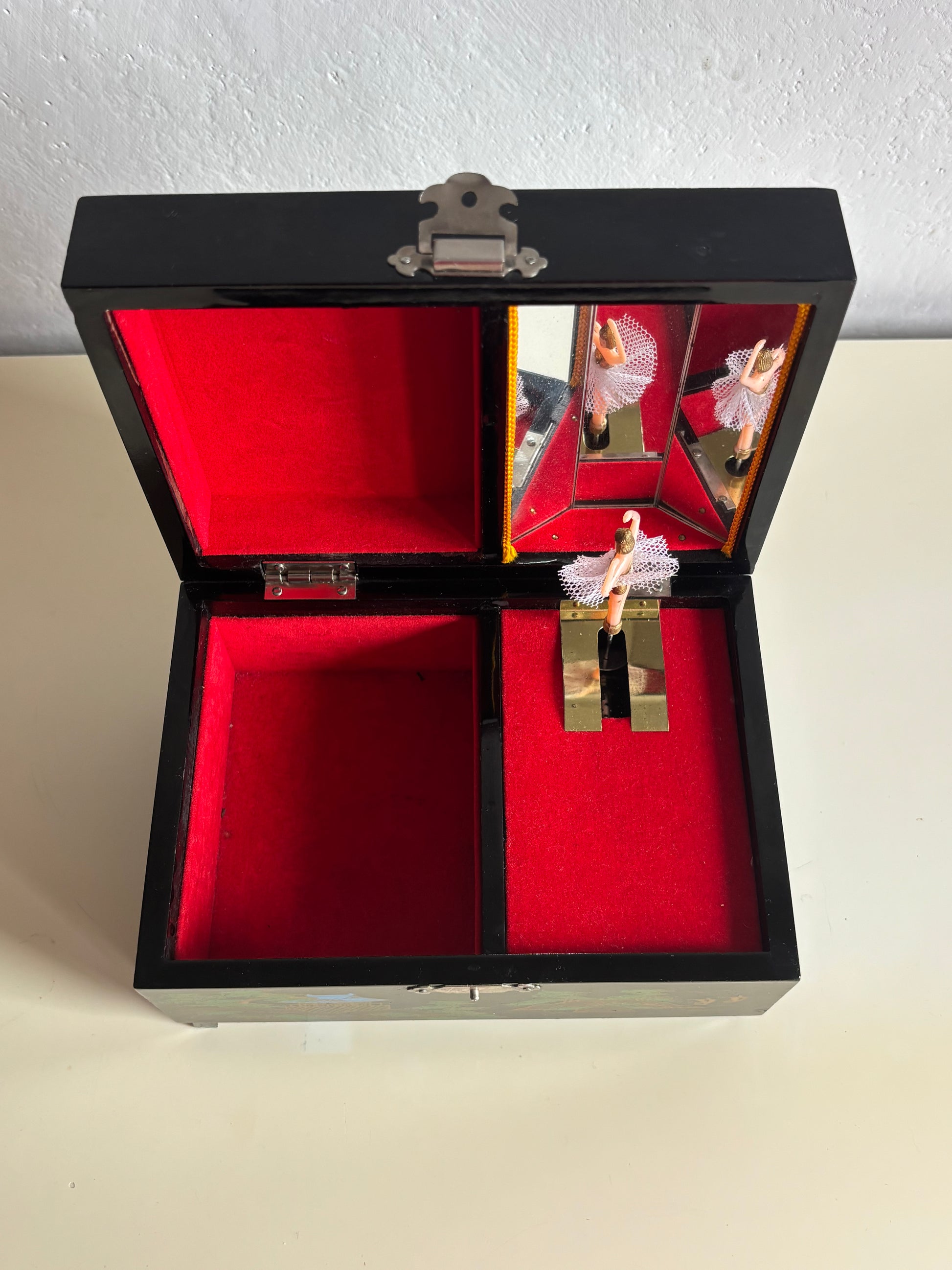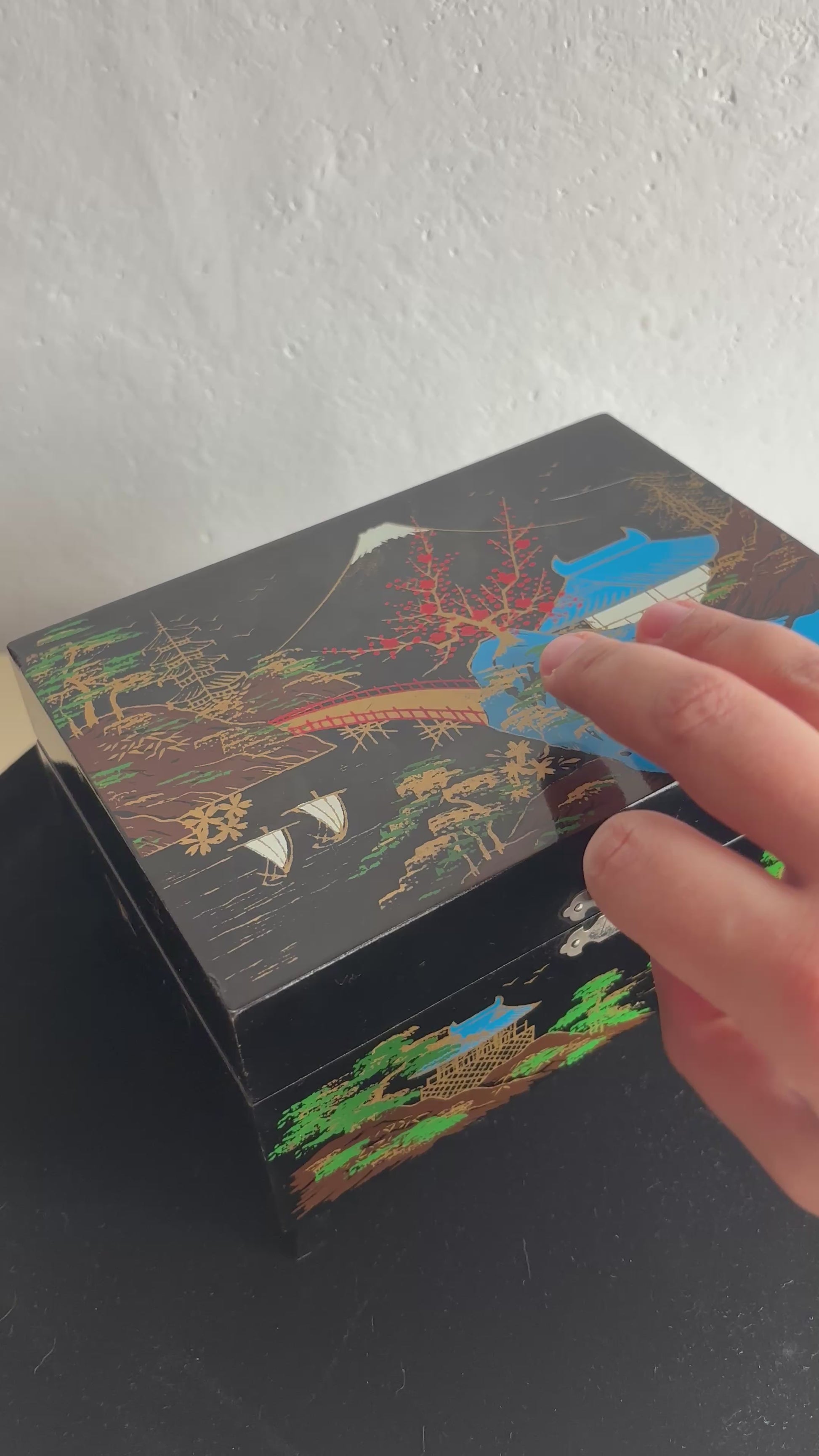 Portagioie giapponese degli anni ’80, realizzato in legno laccato nero con decorazioni che raffigurano un paesaggio tradizionale: pagoda, alberi stilizzati, ponte arcuato e il Monte Fuji innevato sullo sfondo. L’interno è rivestito in velluto rosso e suddiviso in scomparti, con uno specchio incastonato nel coperchio e una ballerina in tutù bianco che ruota dolcemente al suono del carillon, perfettamente funzionante.