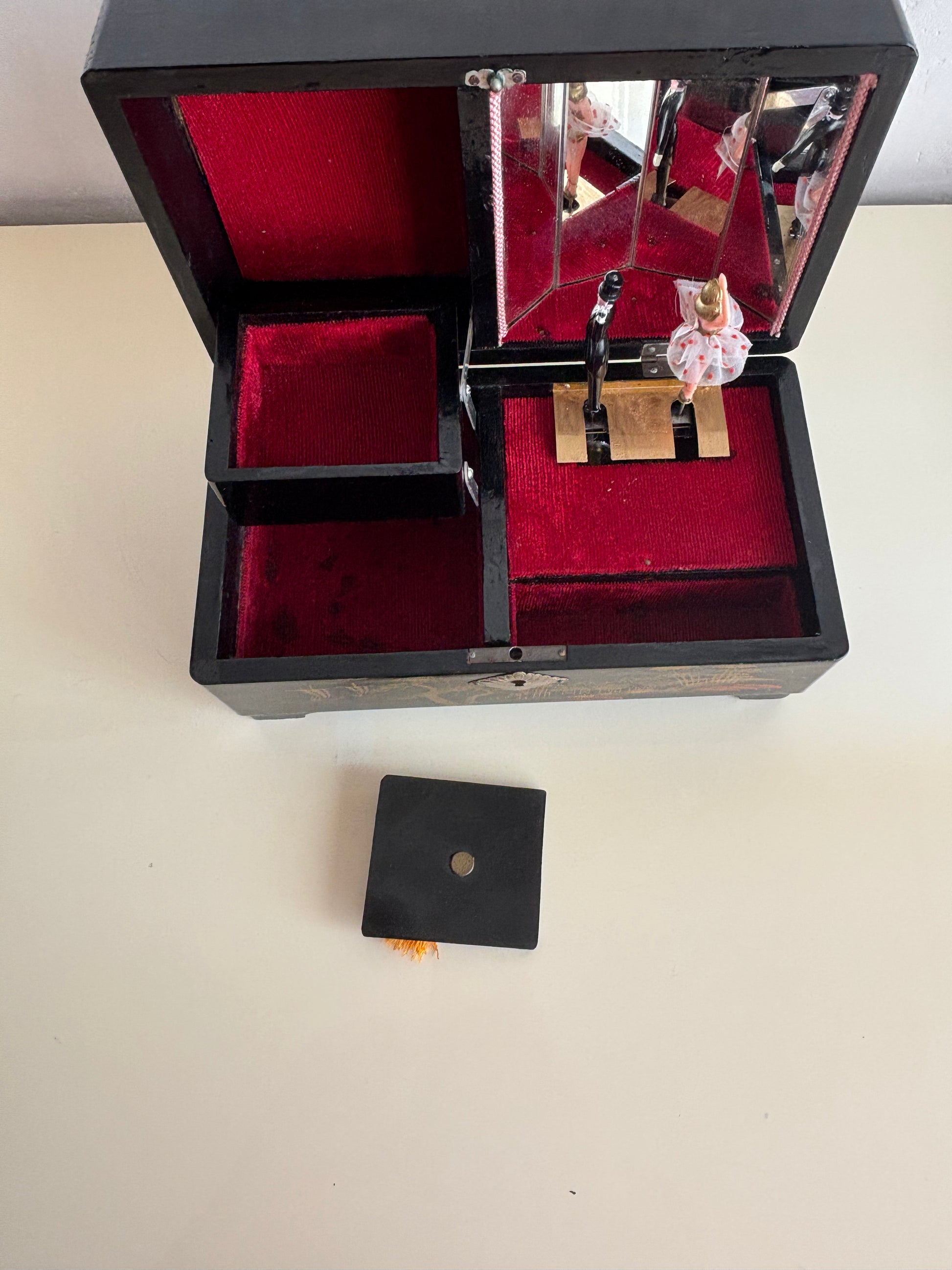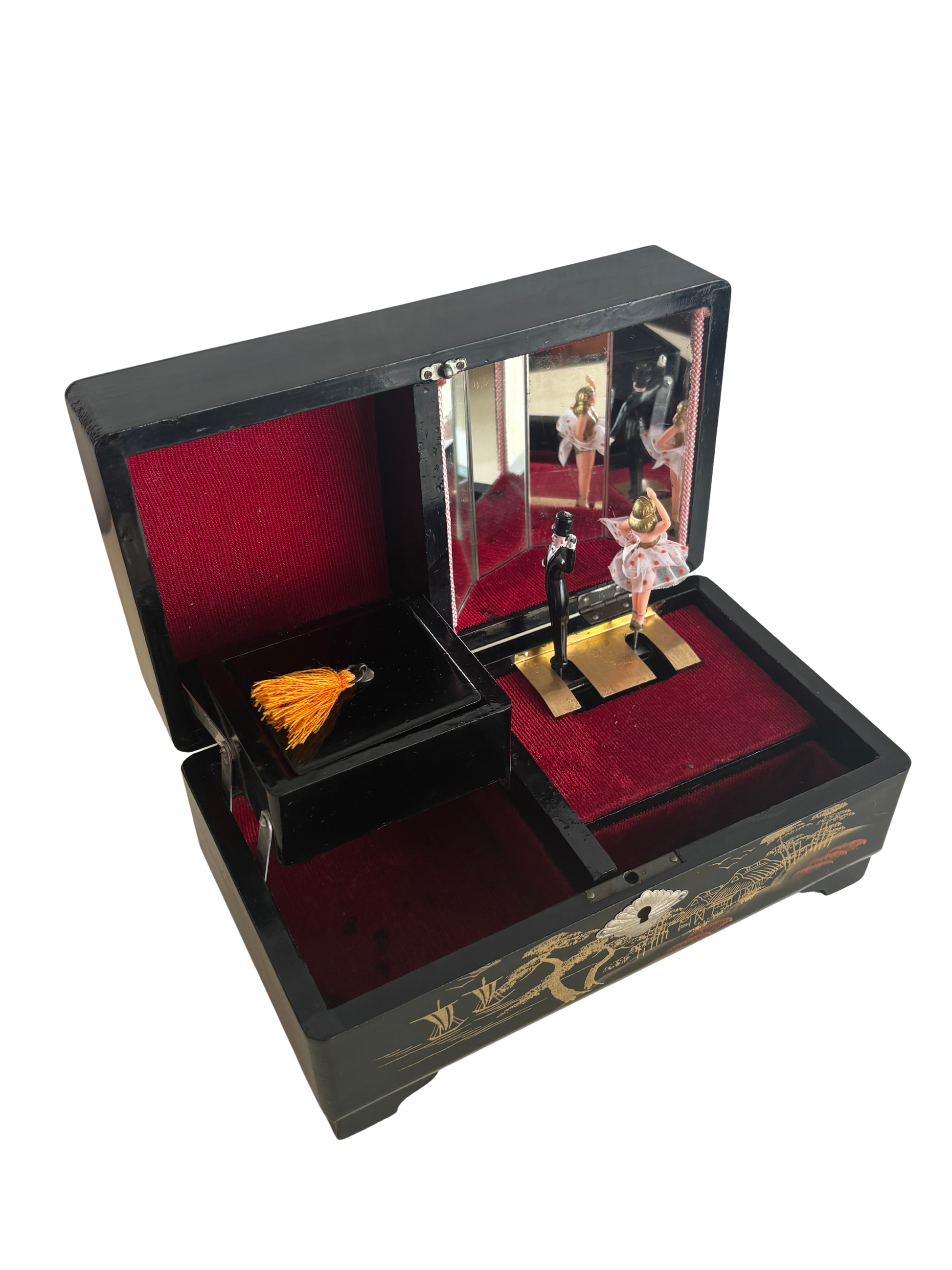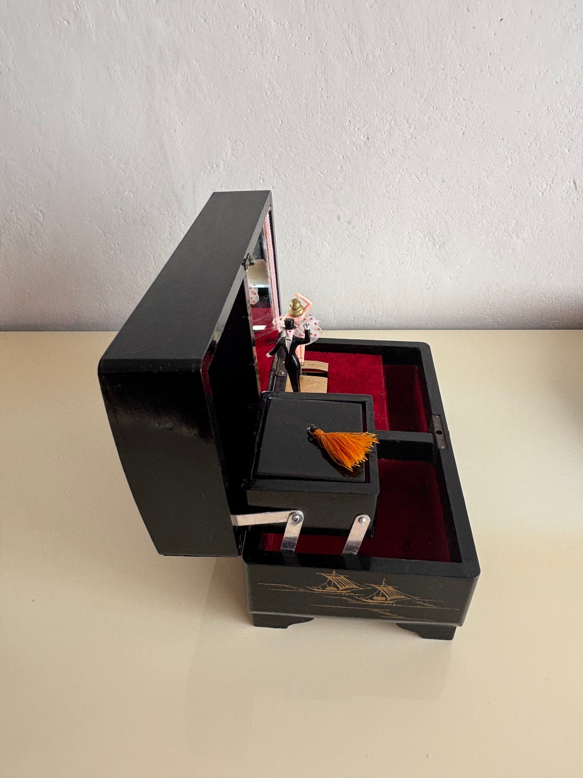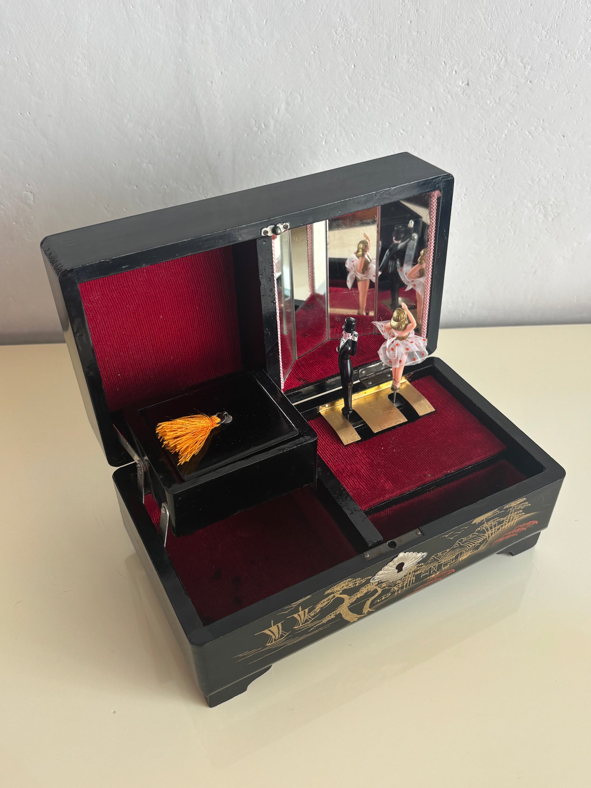 Affascinante portagioie giapponese vintage con carillon, impreziosito da una coppia di ballerini in miniatura che ruotano su una piattaforma dorata al suono della melodia, riflessi da uno specchio interno montato sul coperchio.