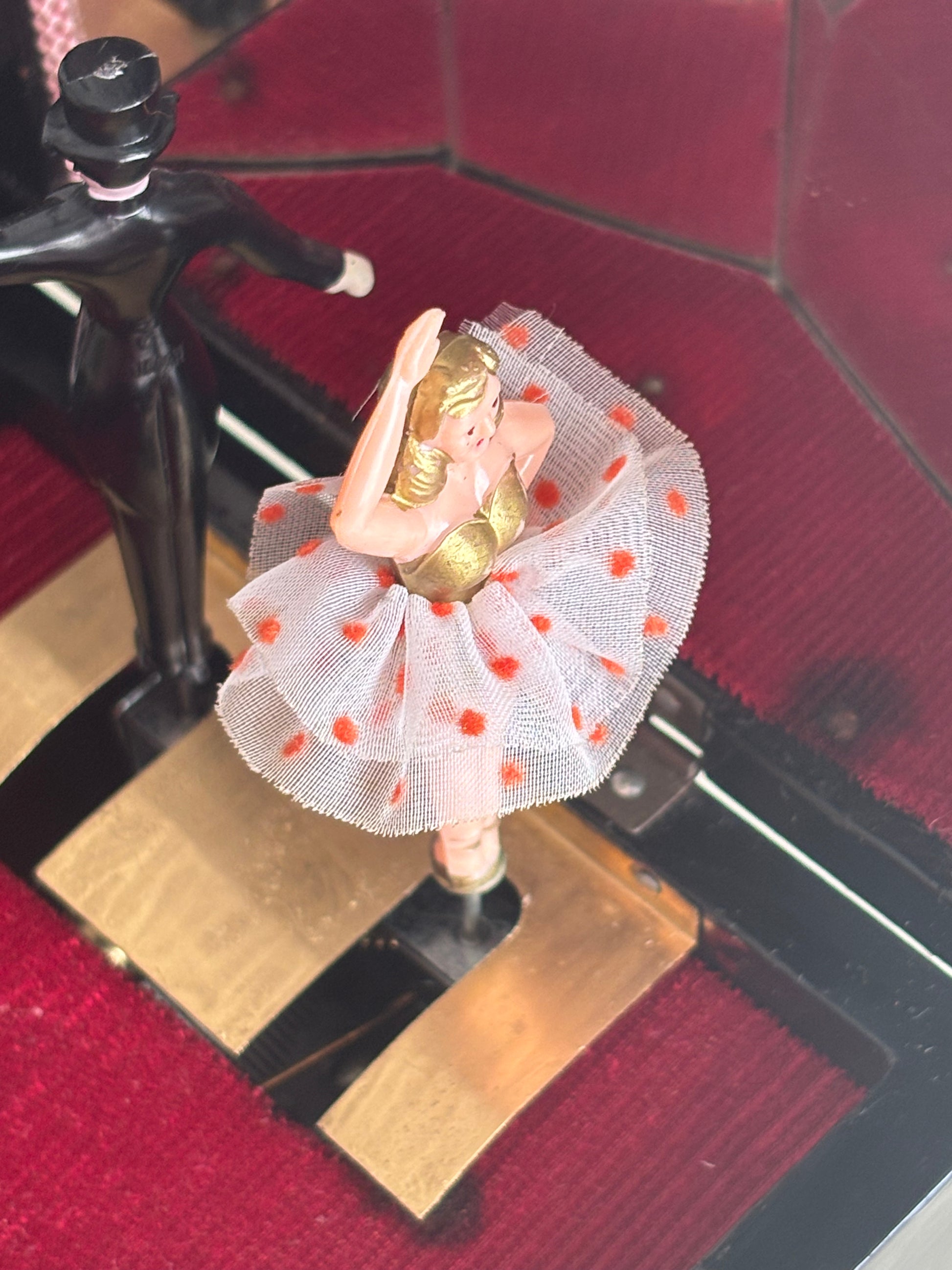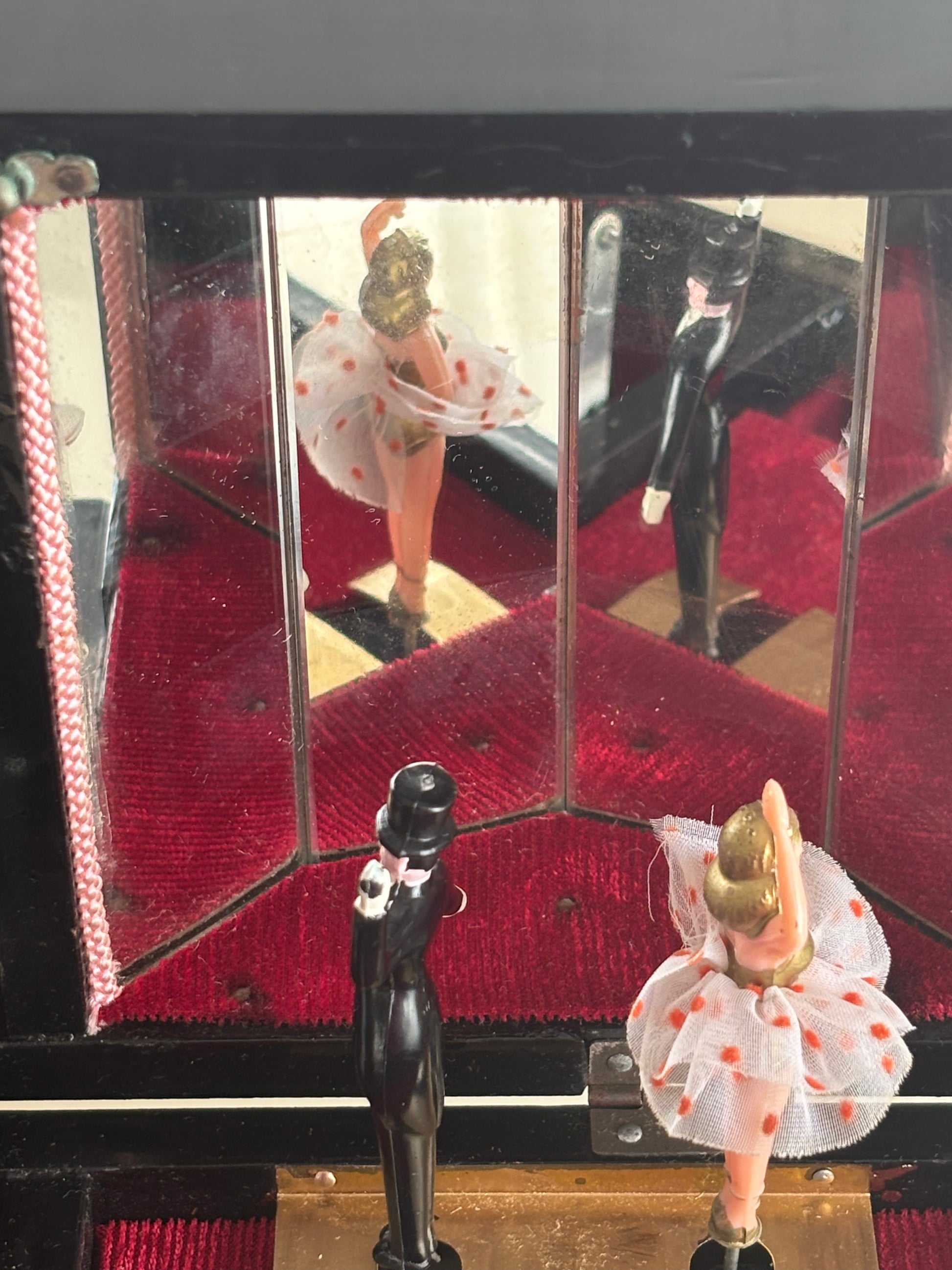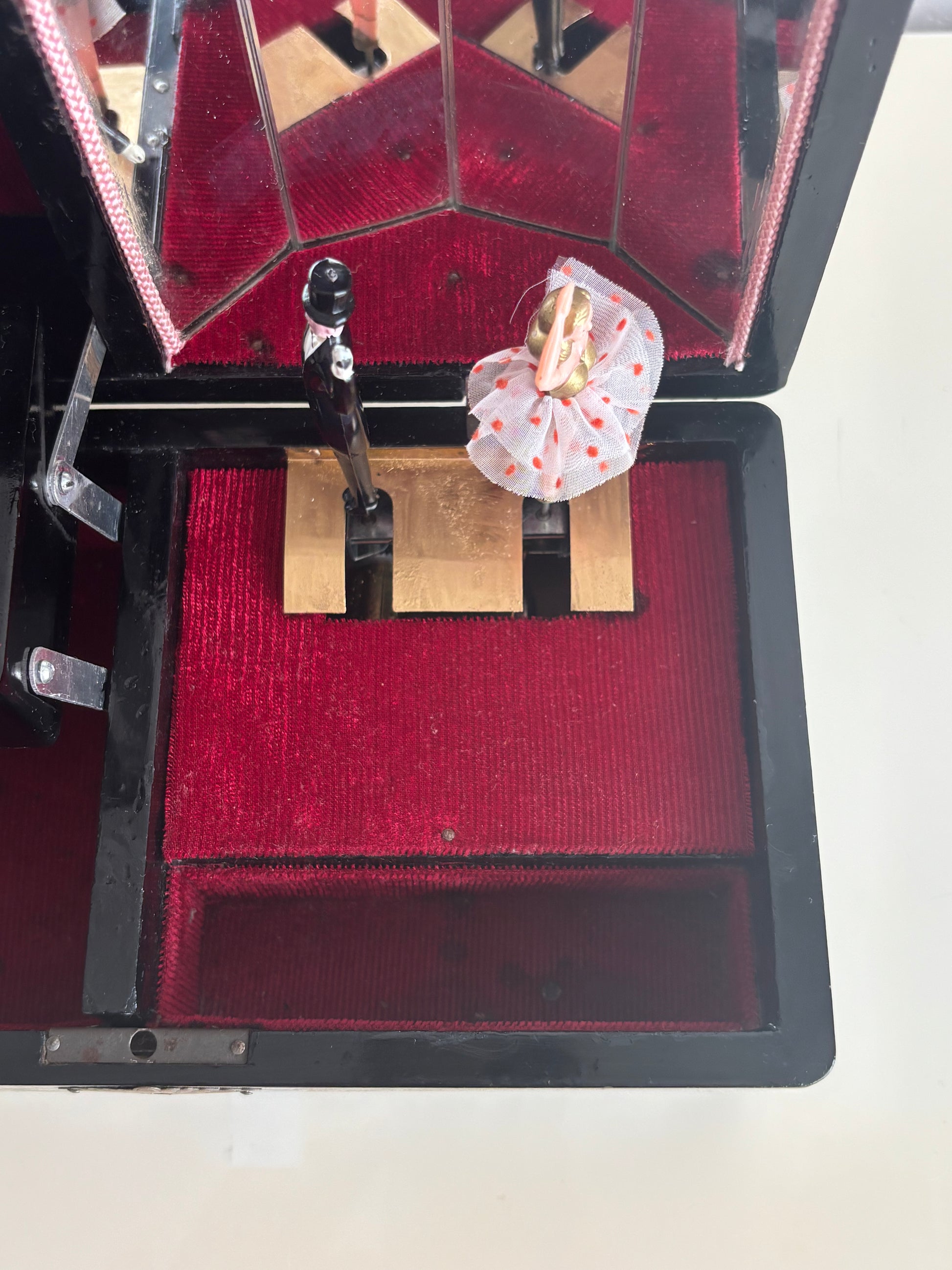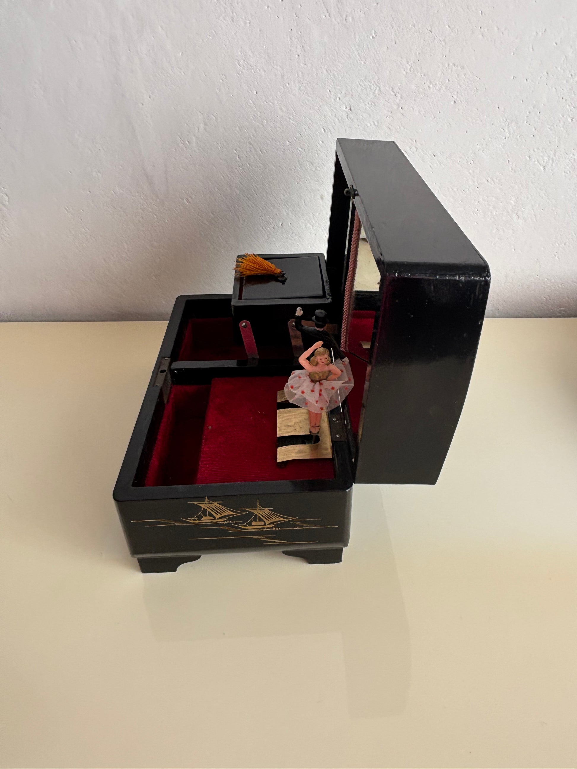 Affascinante portagioie giapponese vintage con carillon, impreziosito da una coppia di ballerini in miniatura che ruotano su una piattaforma dorata al suono della melodia, riflessi da uno specchio interno montato sul coperchio.