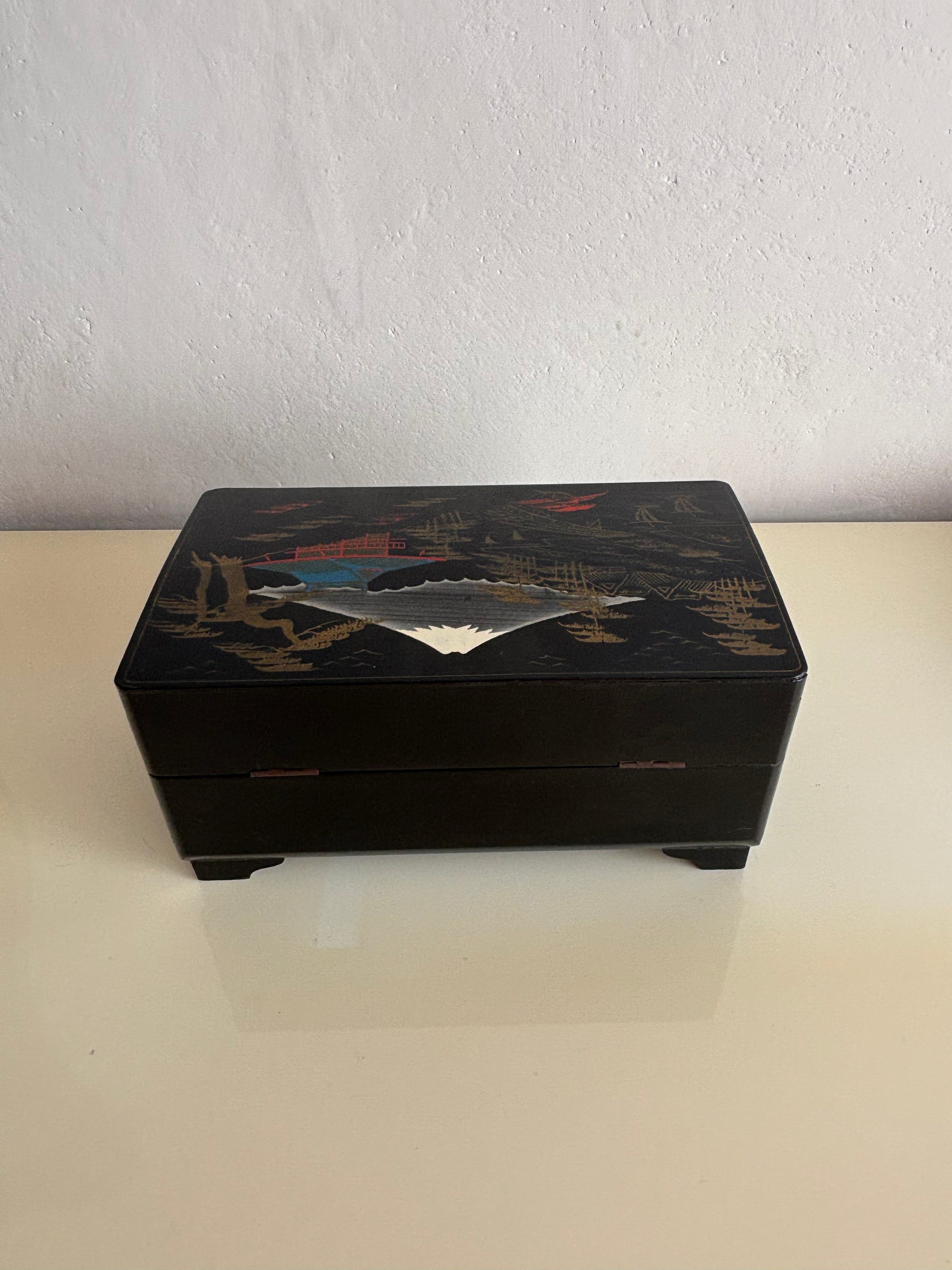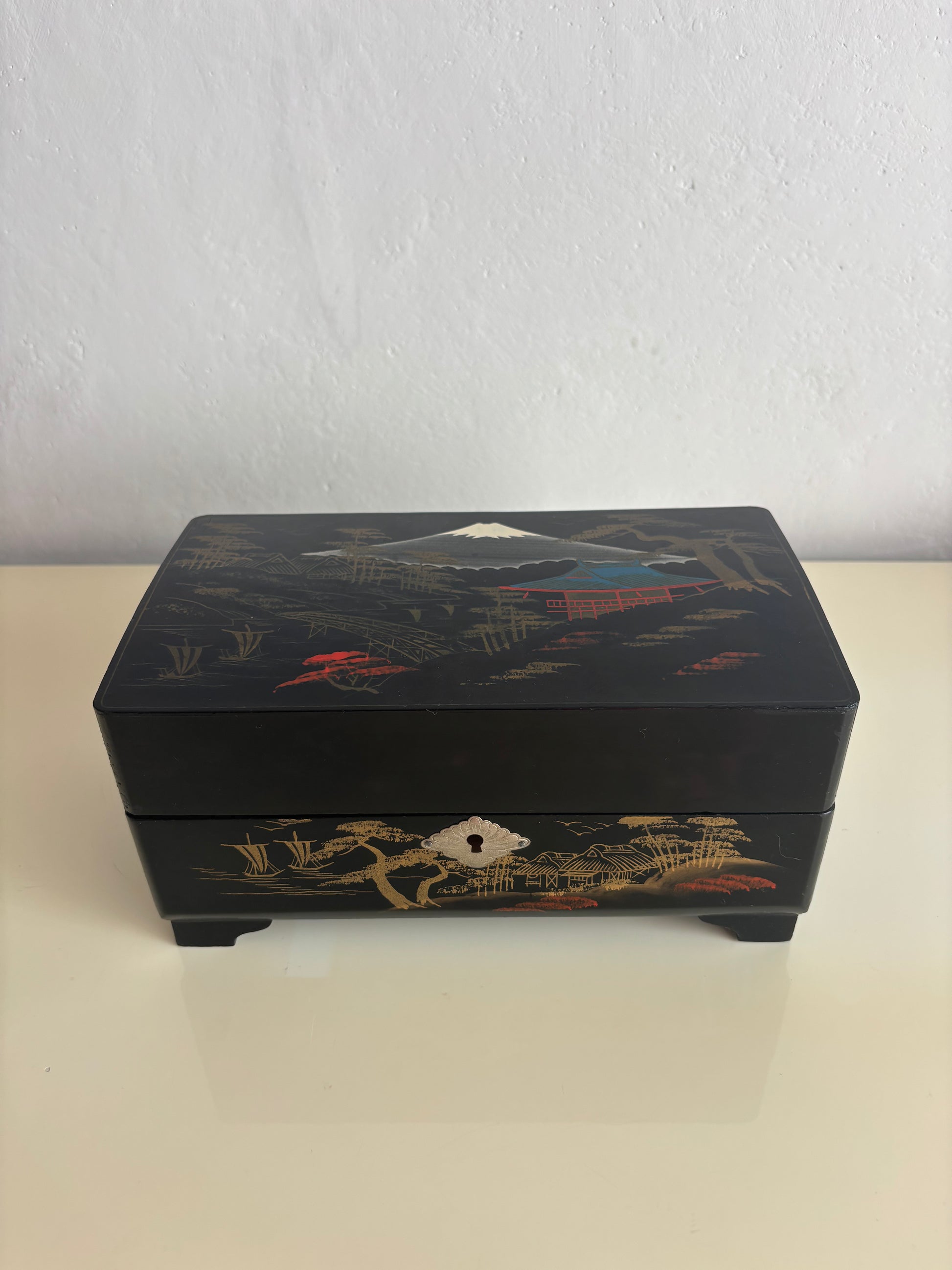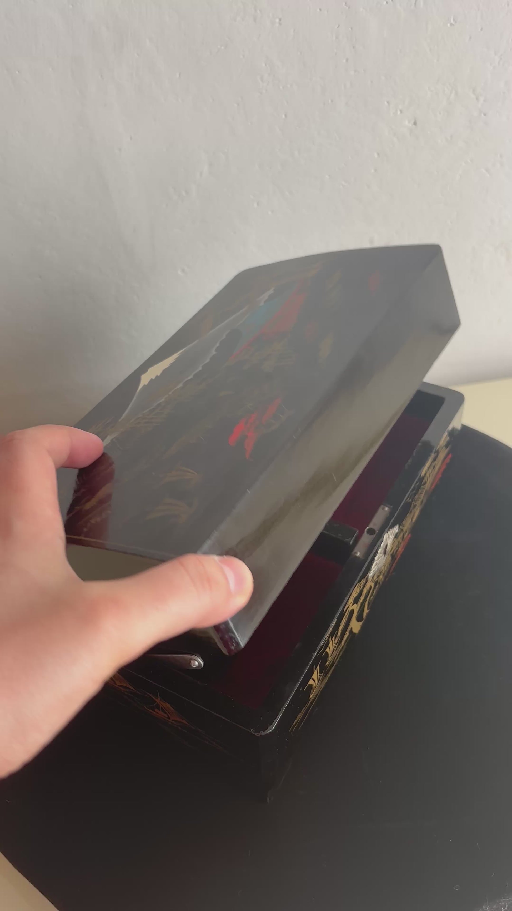 La struttura in legno laccato nero è decorata con paesaggi dorati e motivi tradizionali, mentre l’interno è rivestito in velluto rosso con scomparti per gioielli e una nappina gialla sul coperchio del vano centrale. Il carillon è perfettamente funzionante e si attiva all’apertura del cofanetto, regalando un’atmosfera nostalgica e delicata.